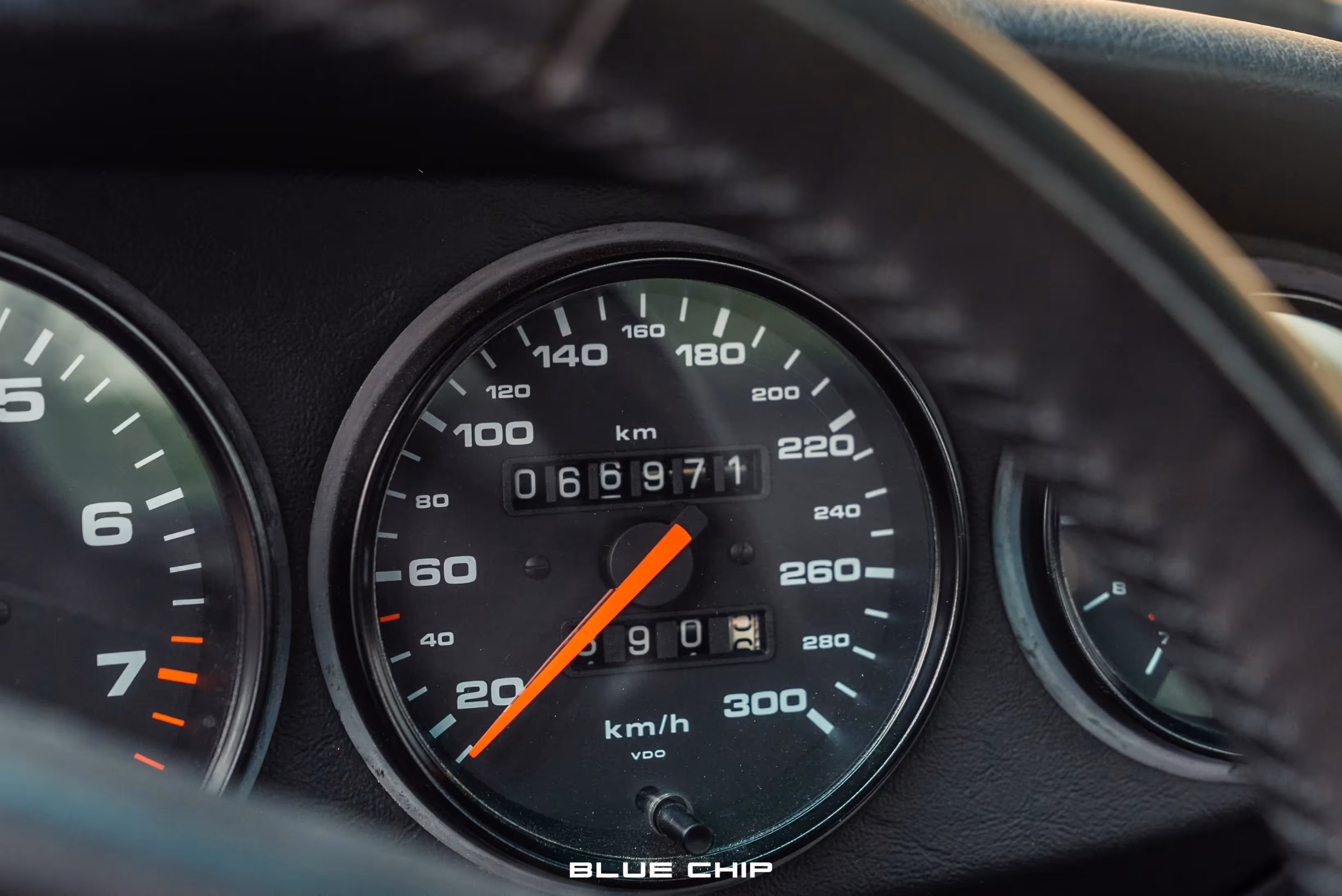 The cabin houses fiberglass Recaro full-bucket seats which have been trimmed in Black leather and feature quad-color purple seat inserts, as well as color-coordinated Amethyst seat belts. The RS moniker meant the deletion of the rear seats, which were replaced by black carpet trim with the Carrera RS insignia stitched in Amethyst on the rear carpeted section. Lightweight door panels are finished in Black leather and are punctuated by color-matching Amethyst door latch pulls straps, as well as the deletion of the standard armrests and cargo pockets. Black leather extends to the gear selector and the dashboard, which houses an optional Blaupunkt stereo unit. A four-spoke, Black leather wrapped steering wheel bears the RS logo and frames a 6,800-rpm tachometer alongside a 300 km/h speedometer.
