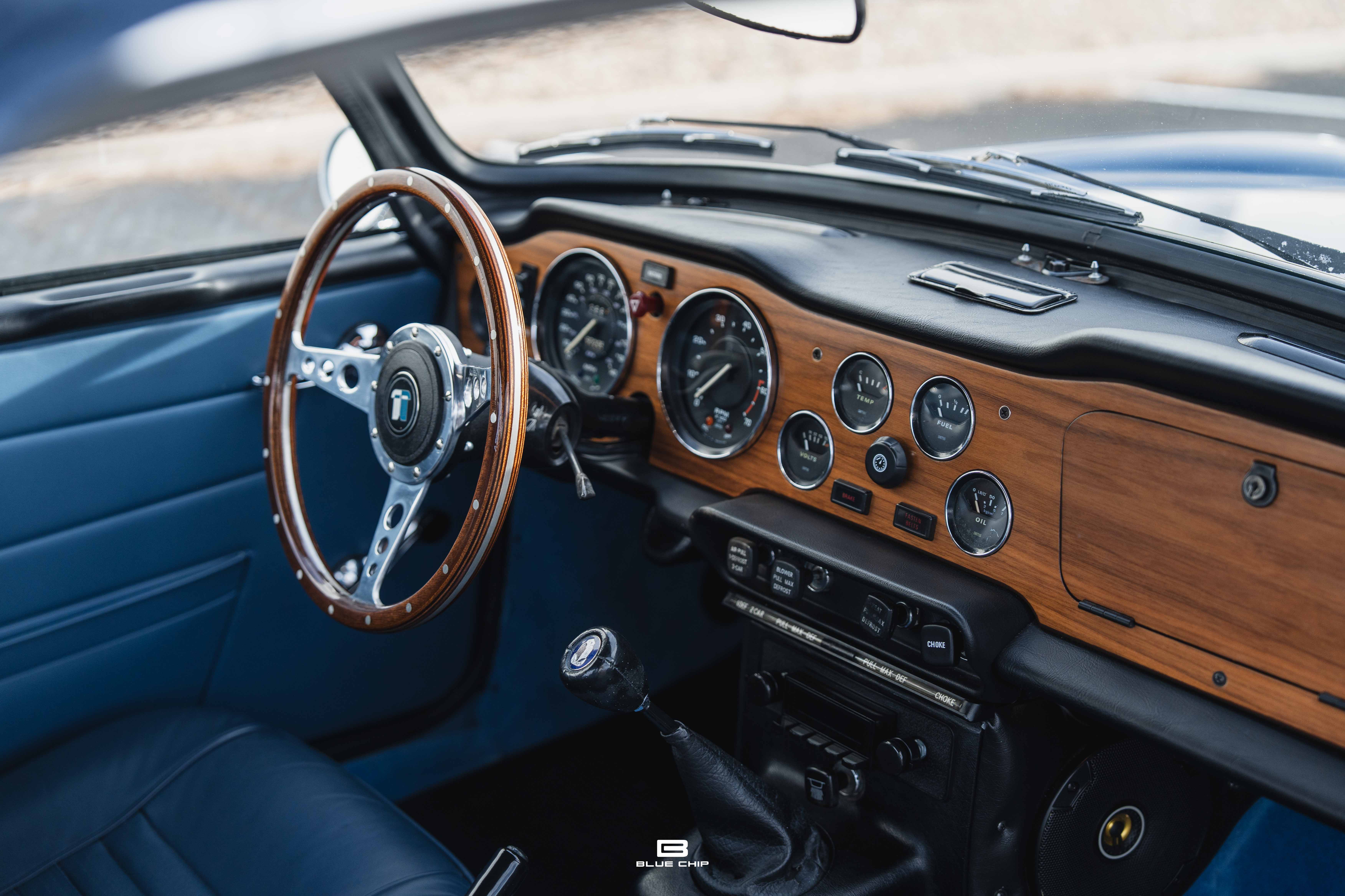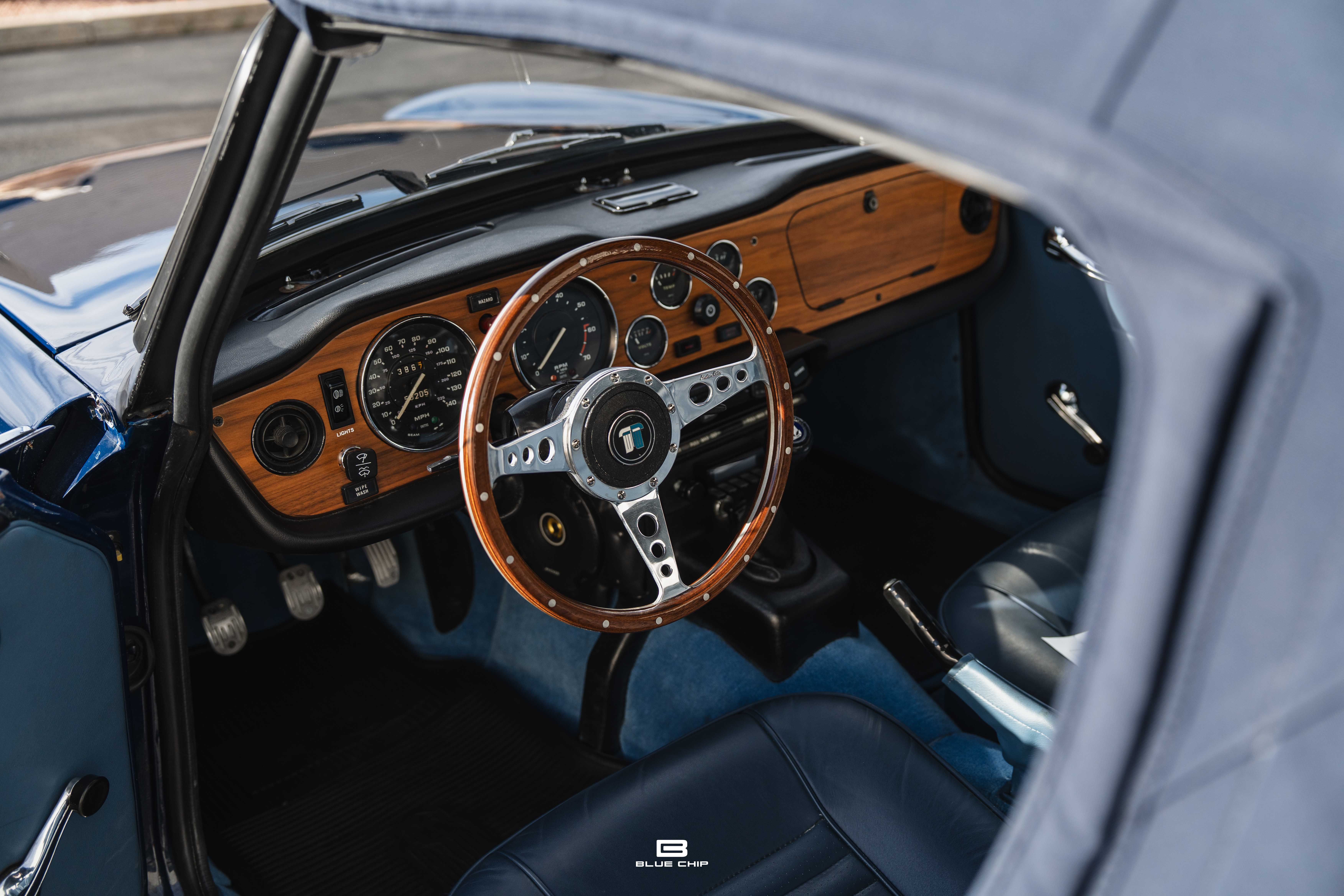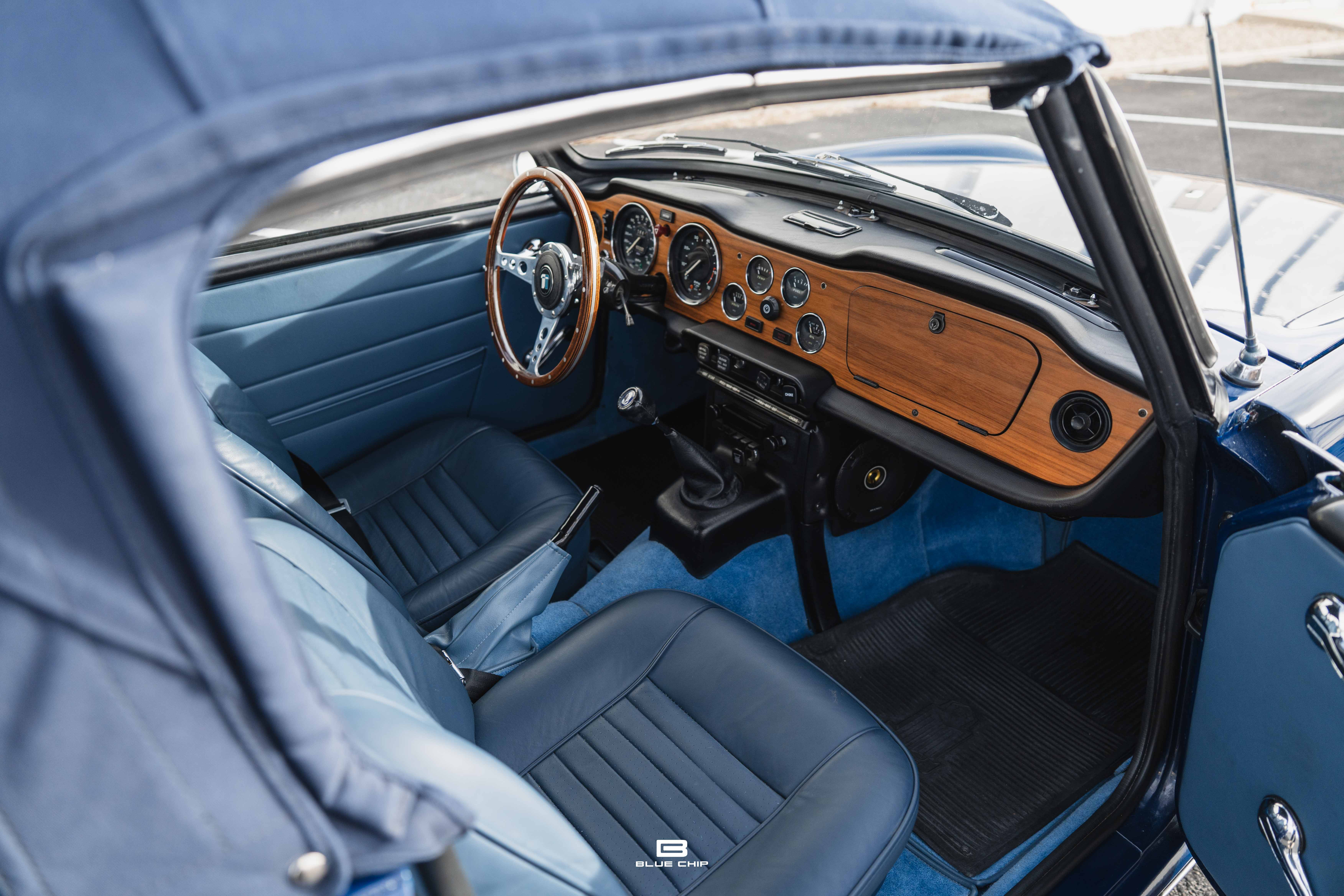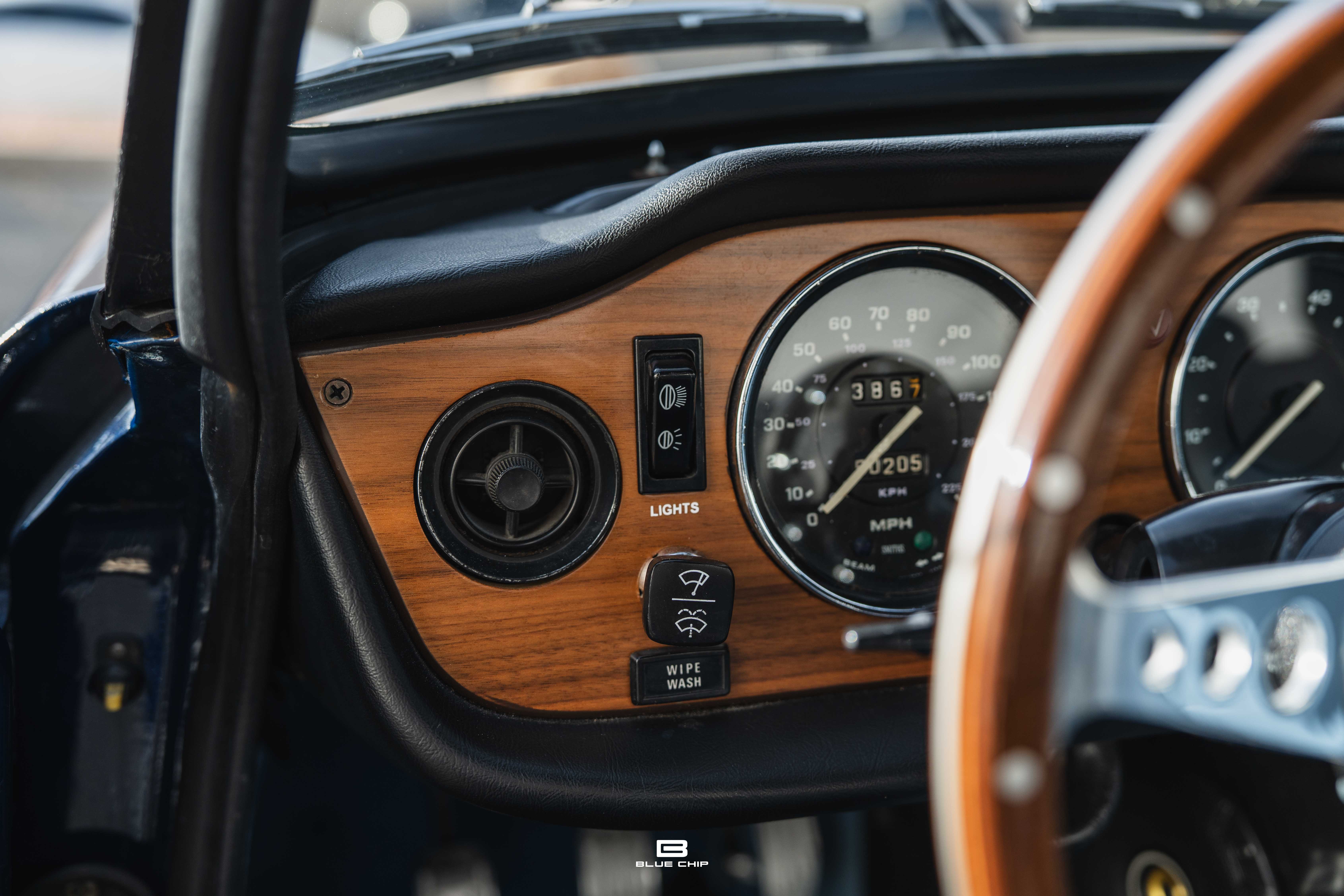 This 1973 Triumph TR6 shows approximately 50,205 miles on the odometer and is presented in an attractive blue-over-blue color combination that complements the car’s classic proportions and period styling. The interior features the traditional British sports car layout, with a wood-veneer dashboard, clear analog instrumentation, and a straightforward driver-focused cockpit that emphasizes the TR6’s purposeful simplicity.