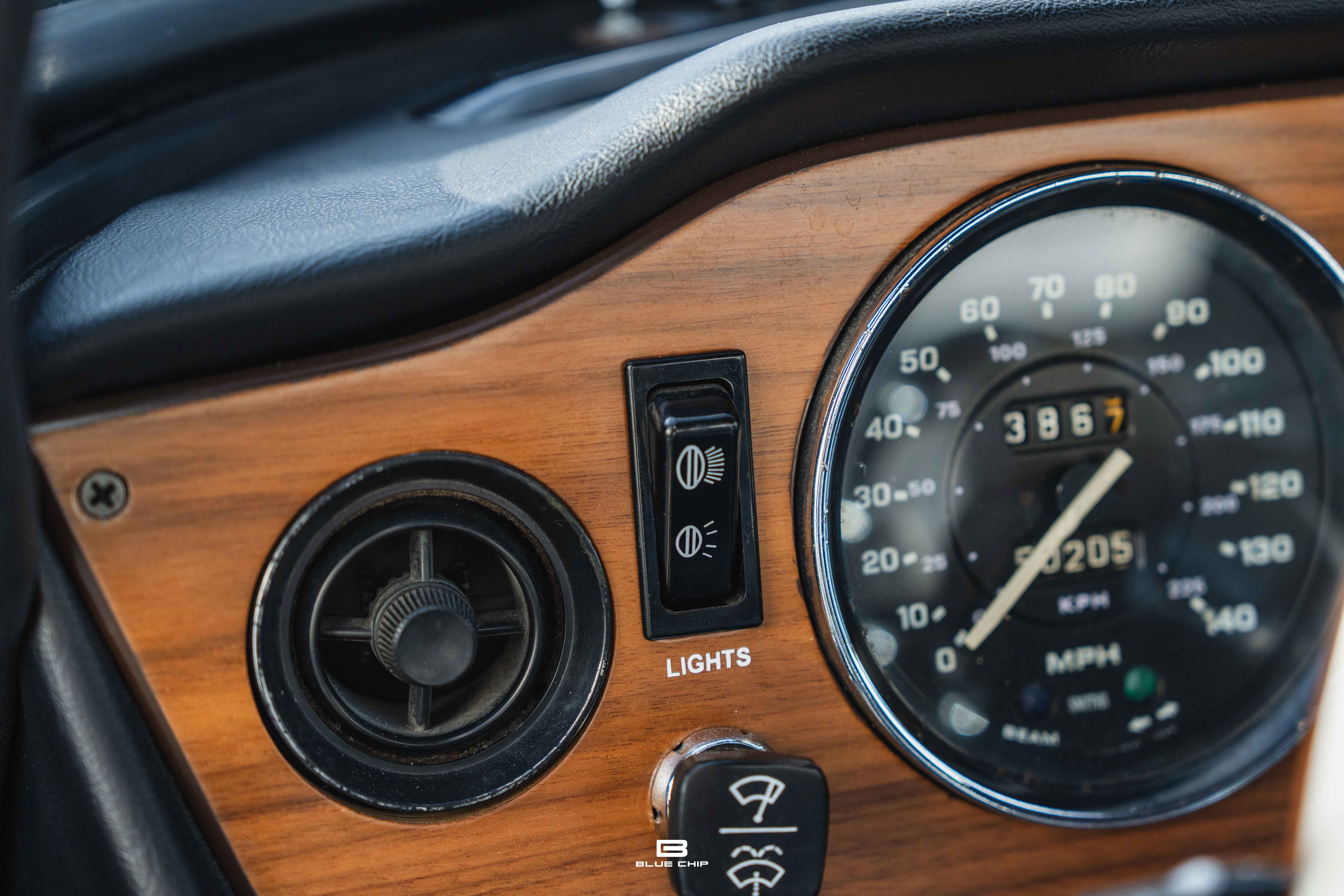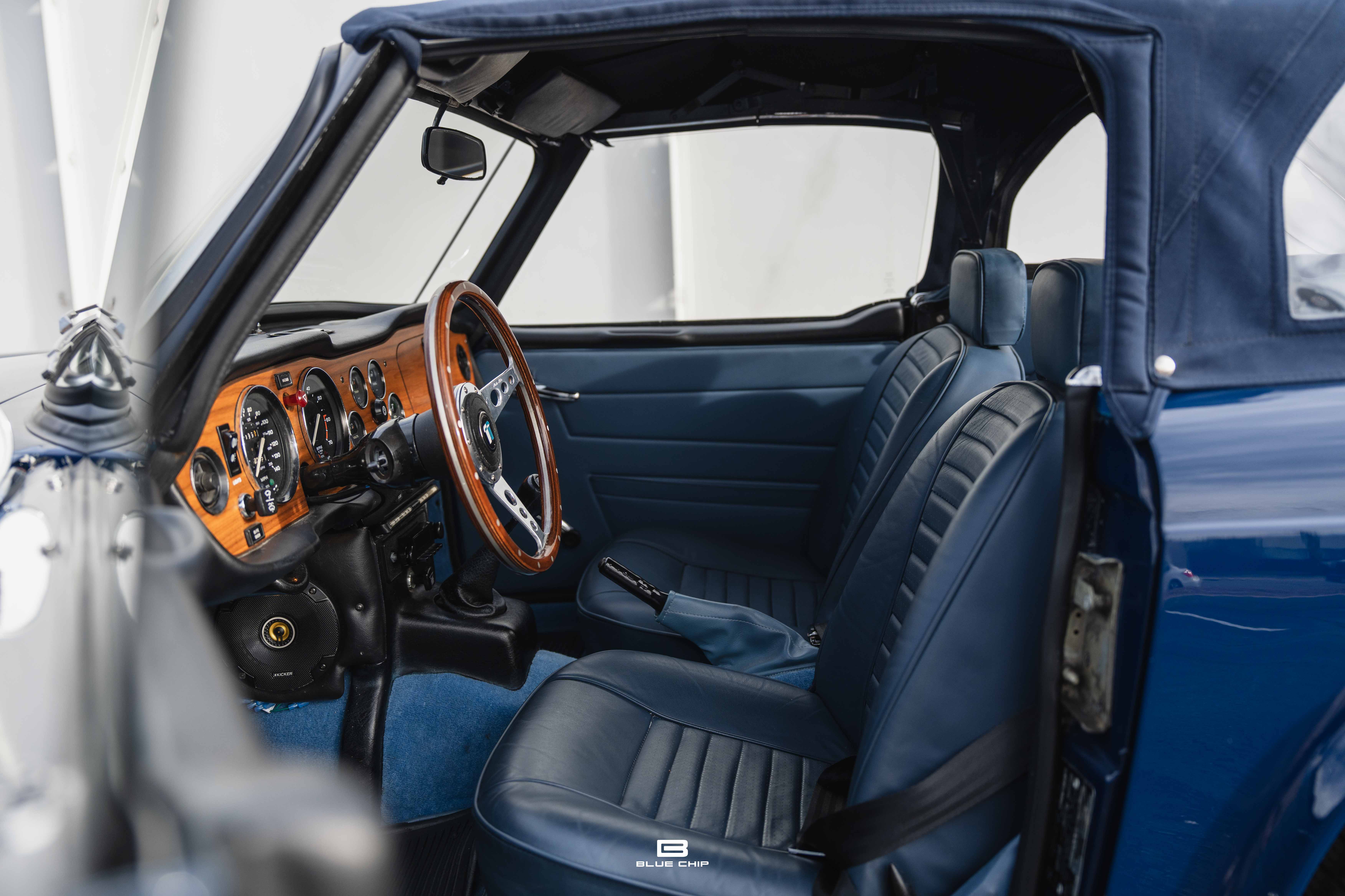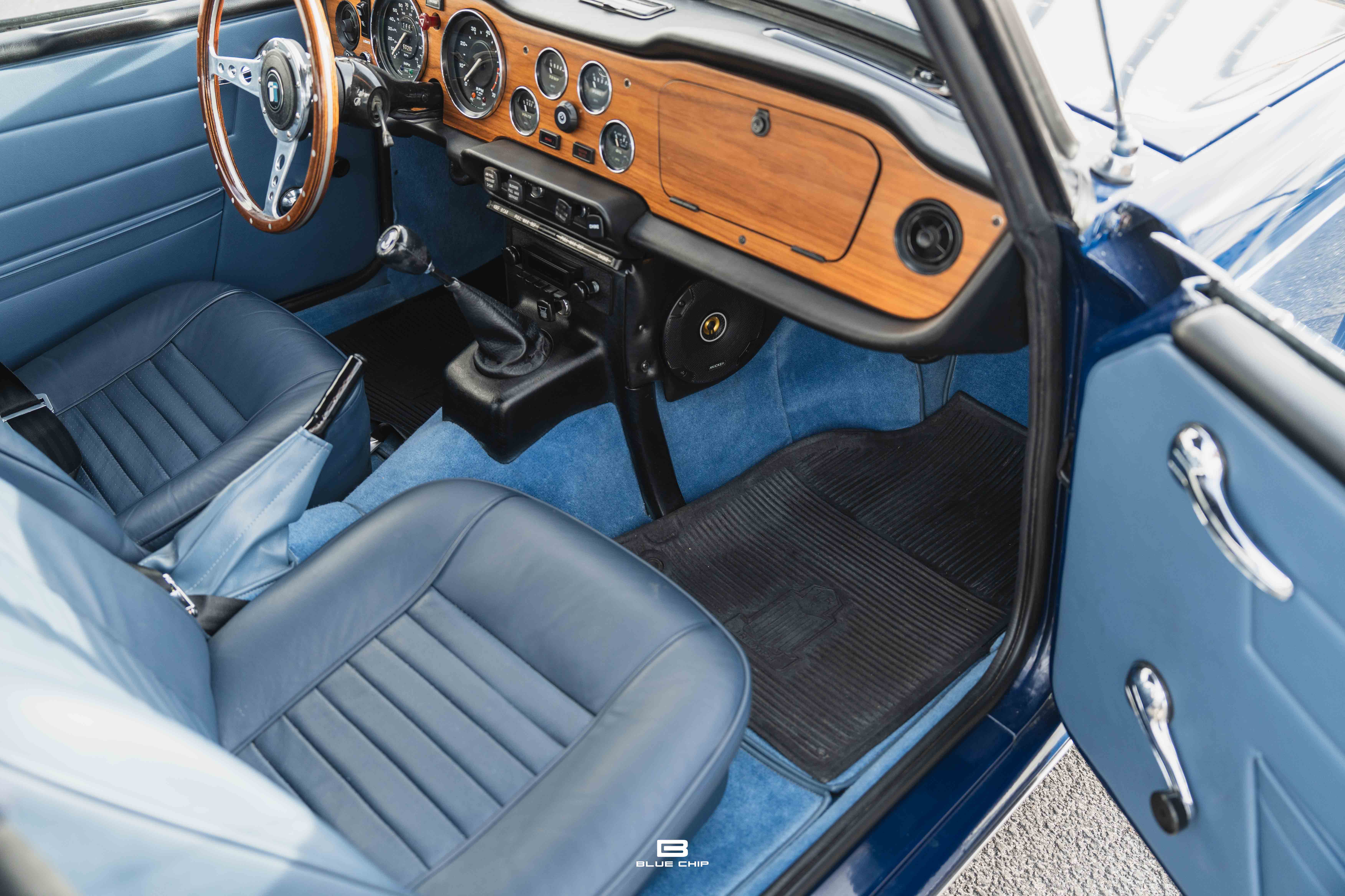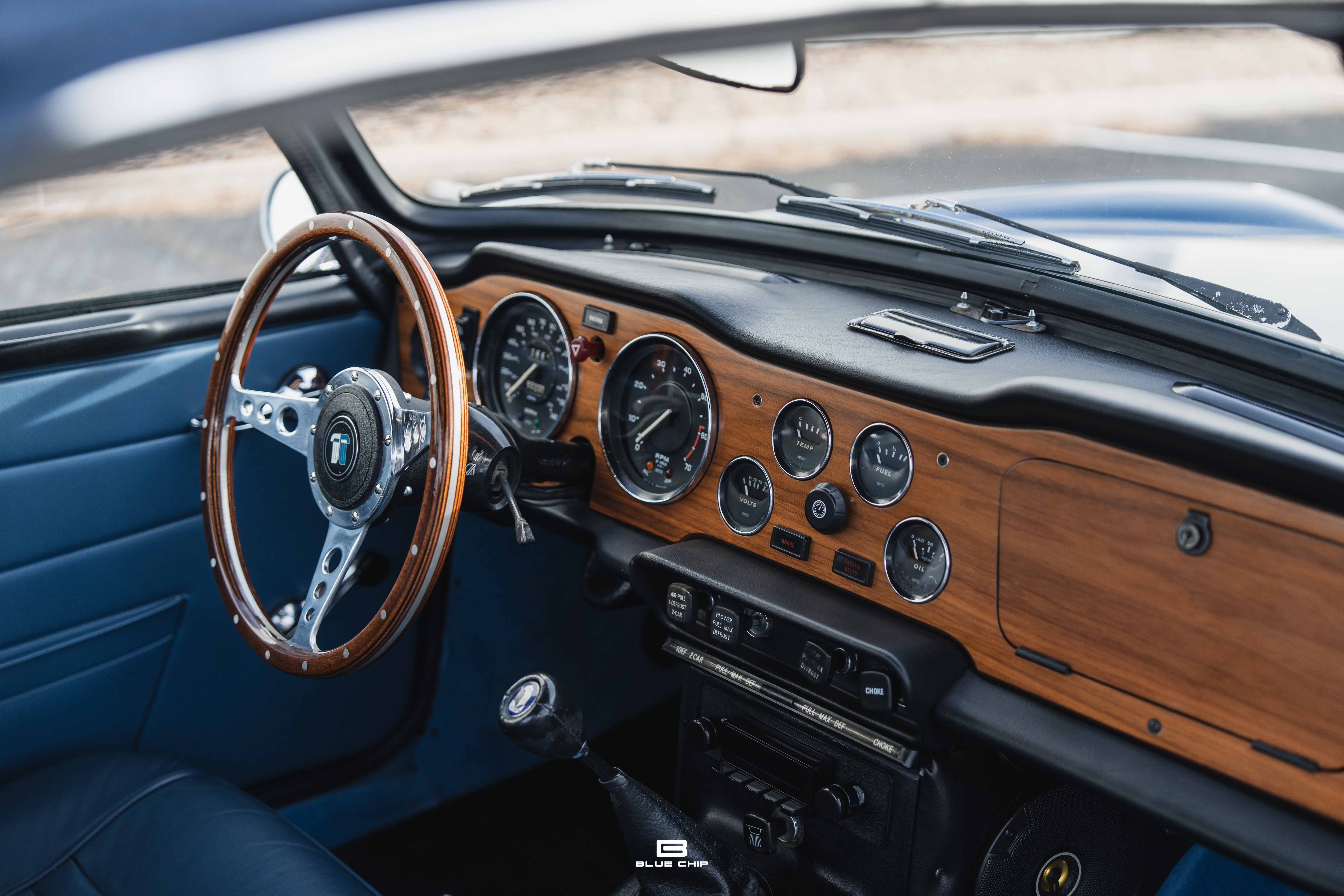 This 1973 Triumph TR6 shows approximately 50,205 miles on the odometer and is presented in an attractive blue-over-blue color combination that complements the car’s classic proportions and period styling. The interior features the traditional British sports car layout, with a wood-veneer dashboard, clear analog instrumentation, and a straightforward driver-focused cockpit that emphasizes the TR6’s purposeful simplicity.