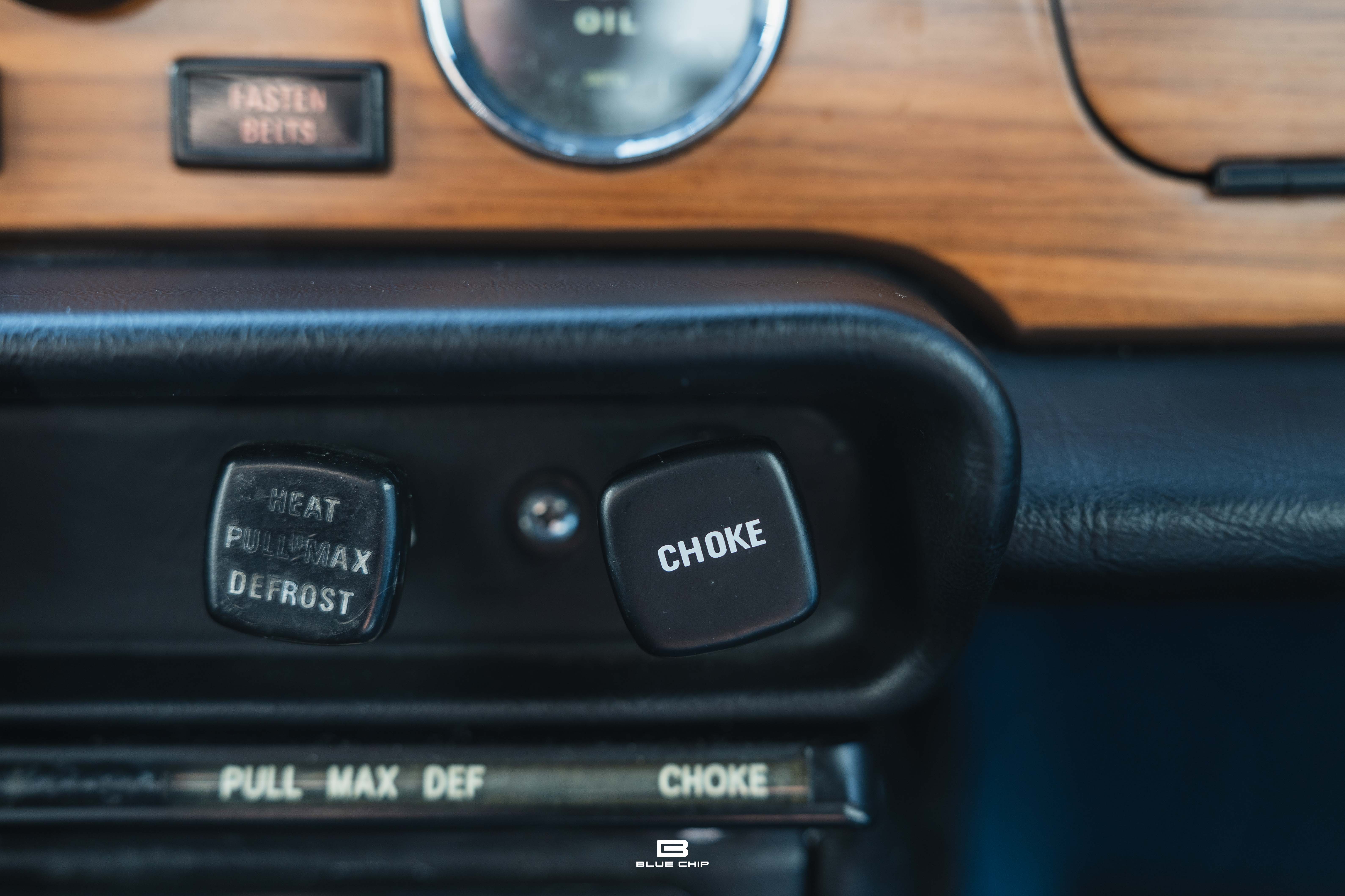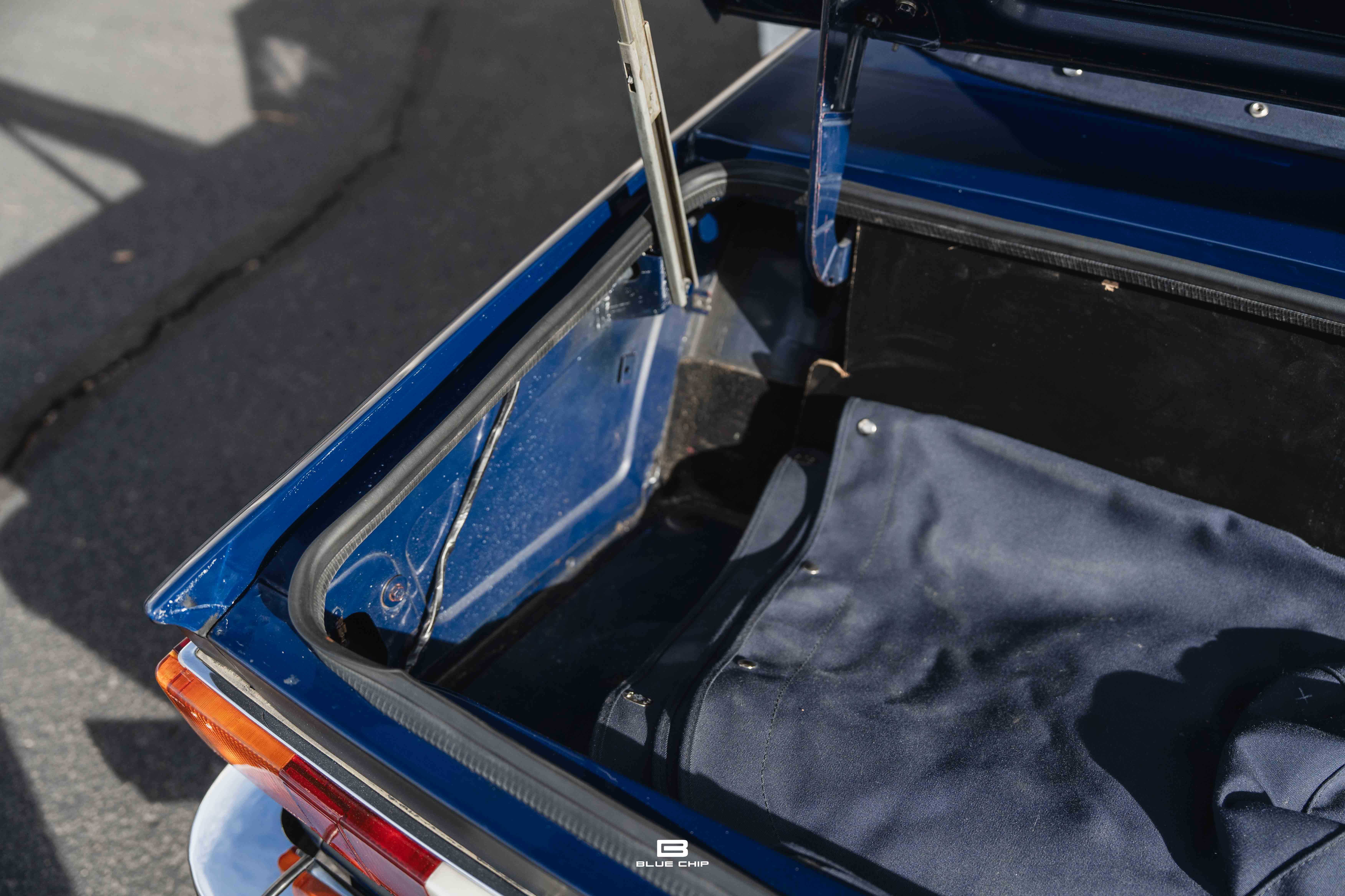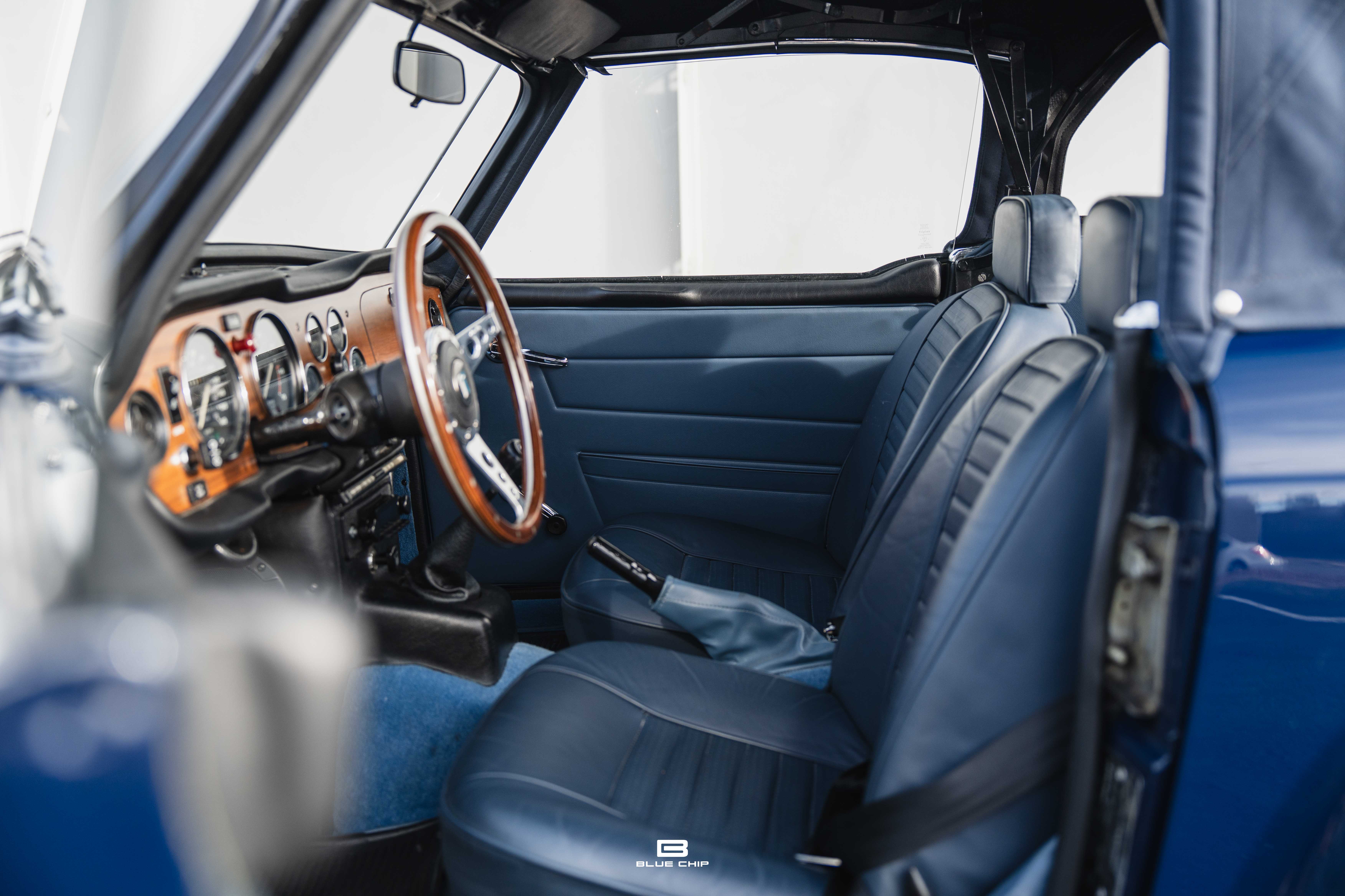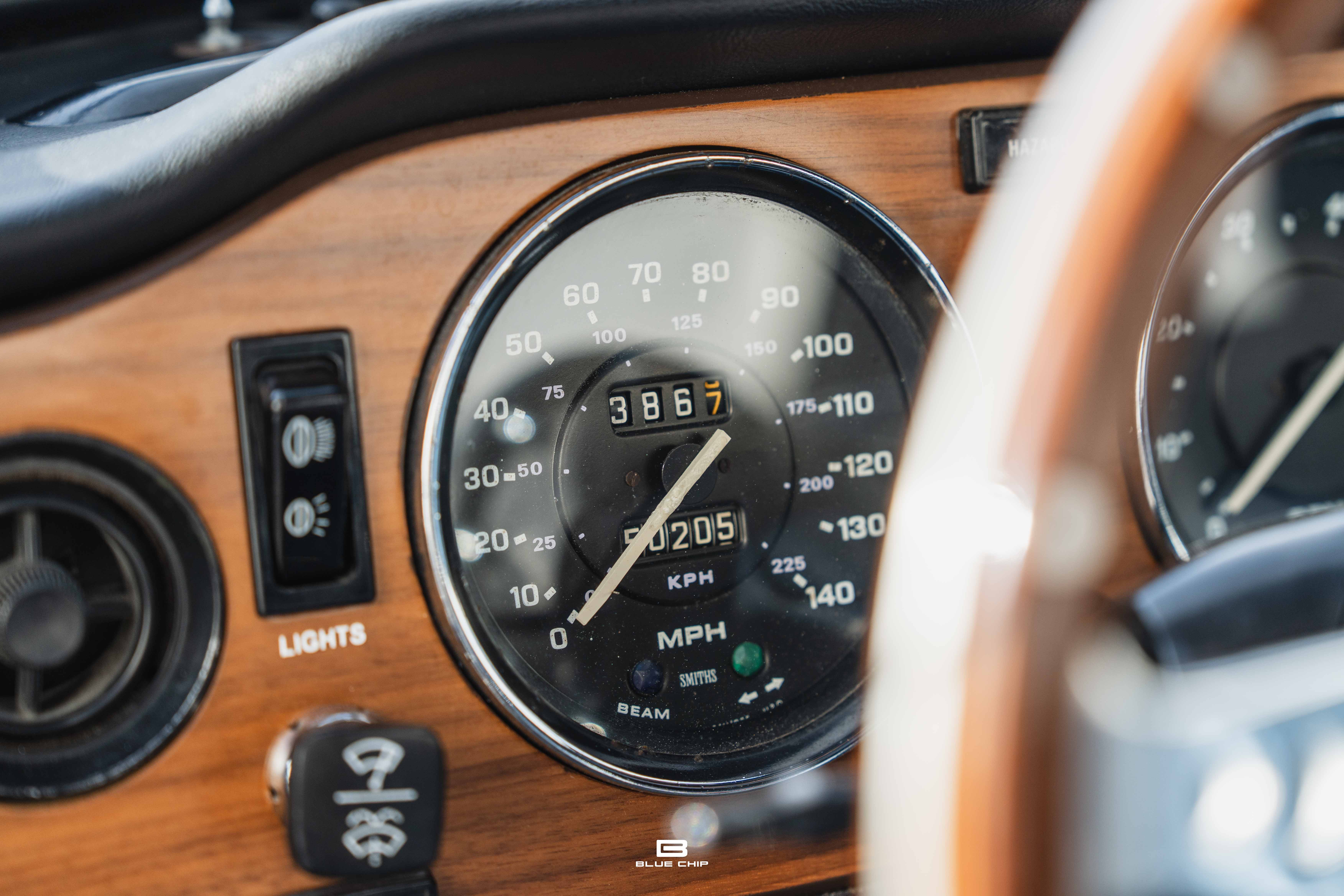 This 1973 Triumph TR6 shows approximately 50,205 miles on the odometer and is presented in an attractive blue-over-blue color combination that complements the car’s classic proportions and period styling. The interior features the traditional British sports car layout, with a wood-veneer dashboard, clear analog instrumentation, and a straightforward driver-focused cockpit that emphasizes the TR6’s purposeful simplicity.