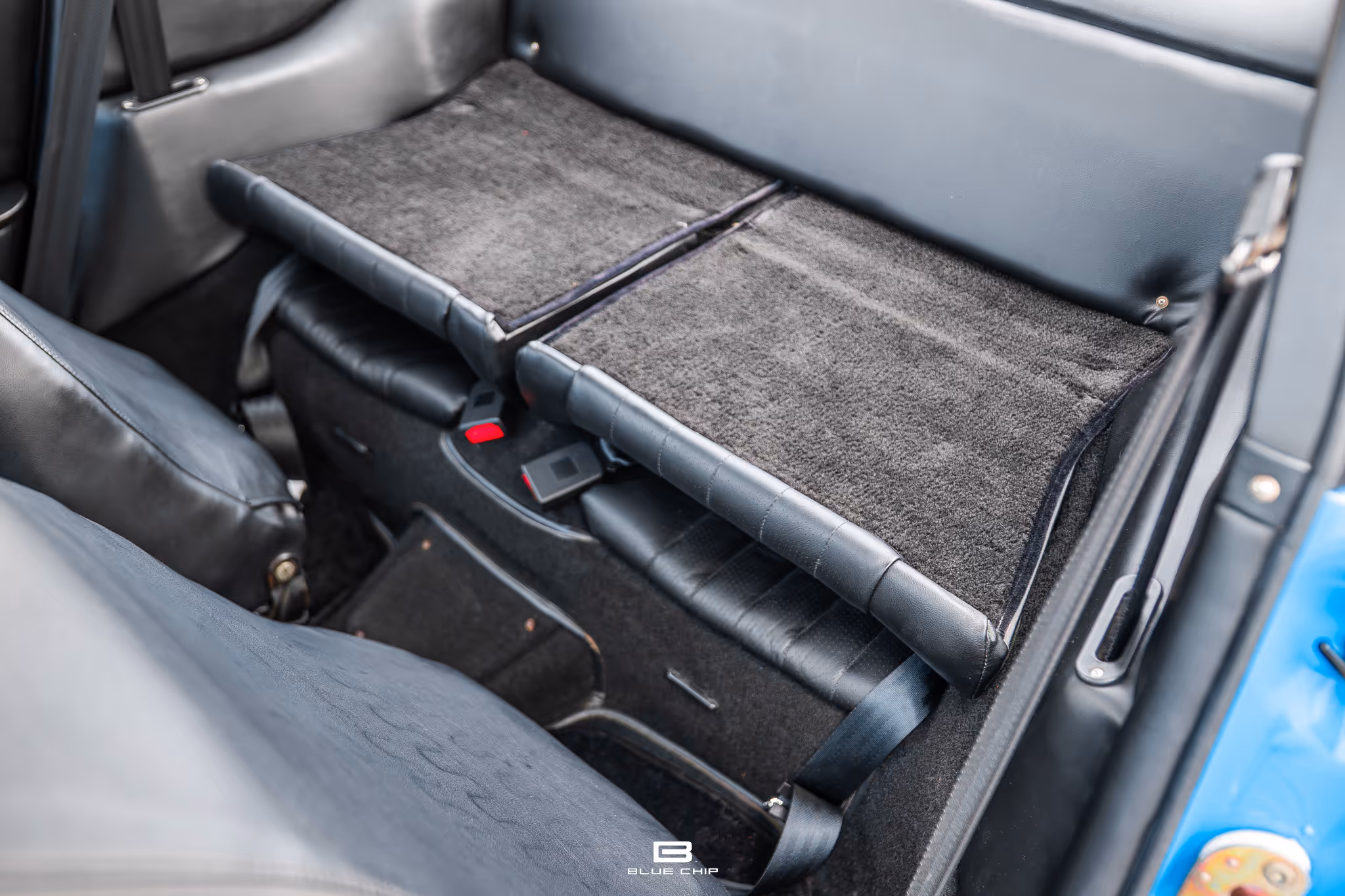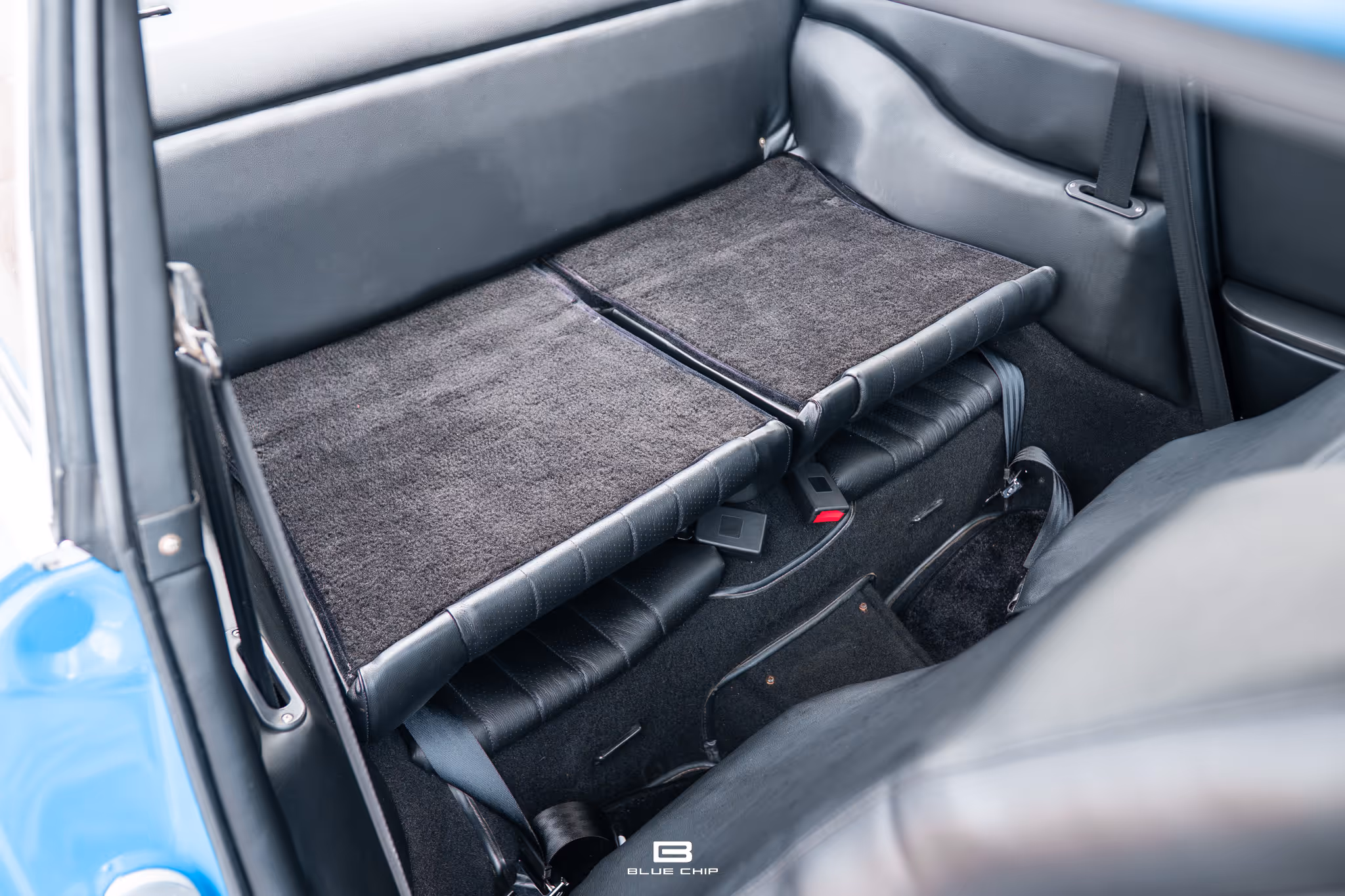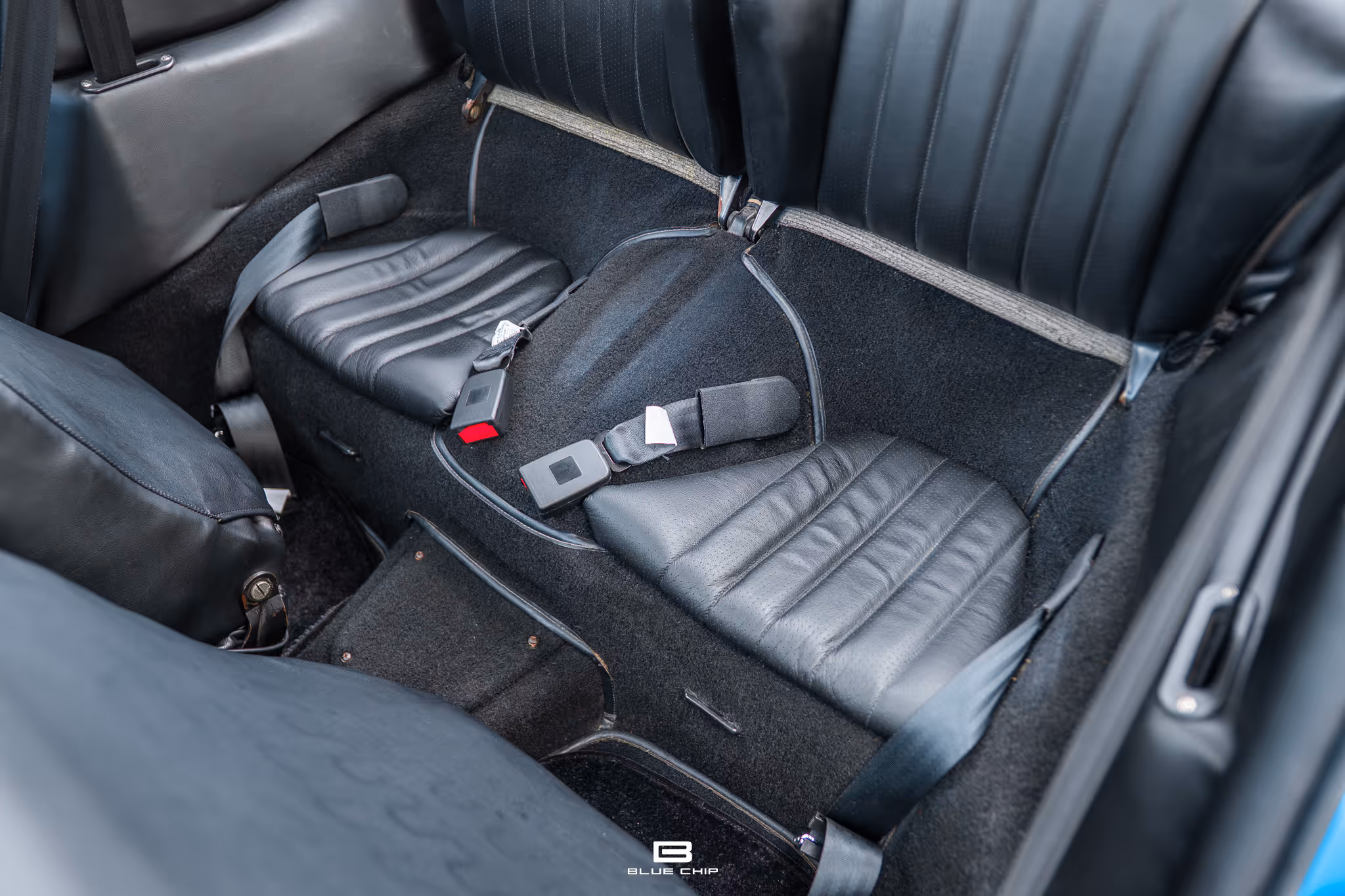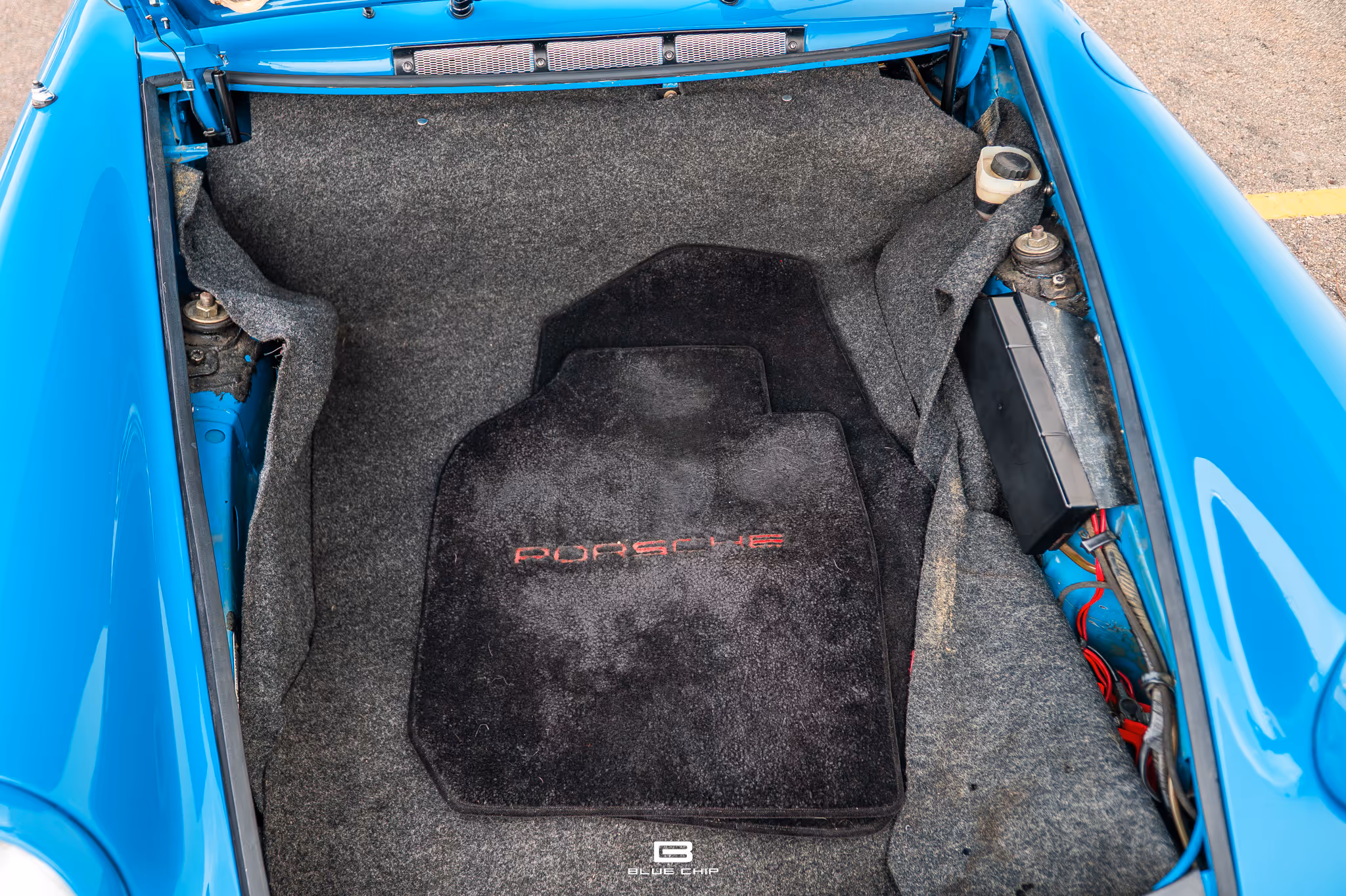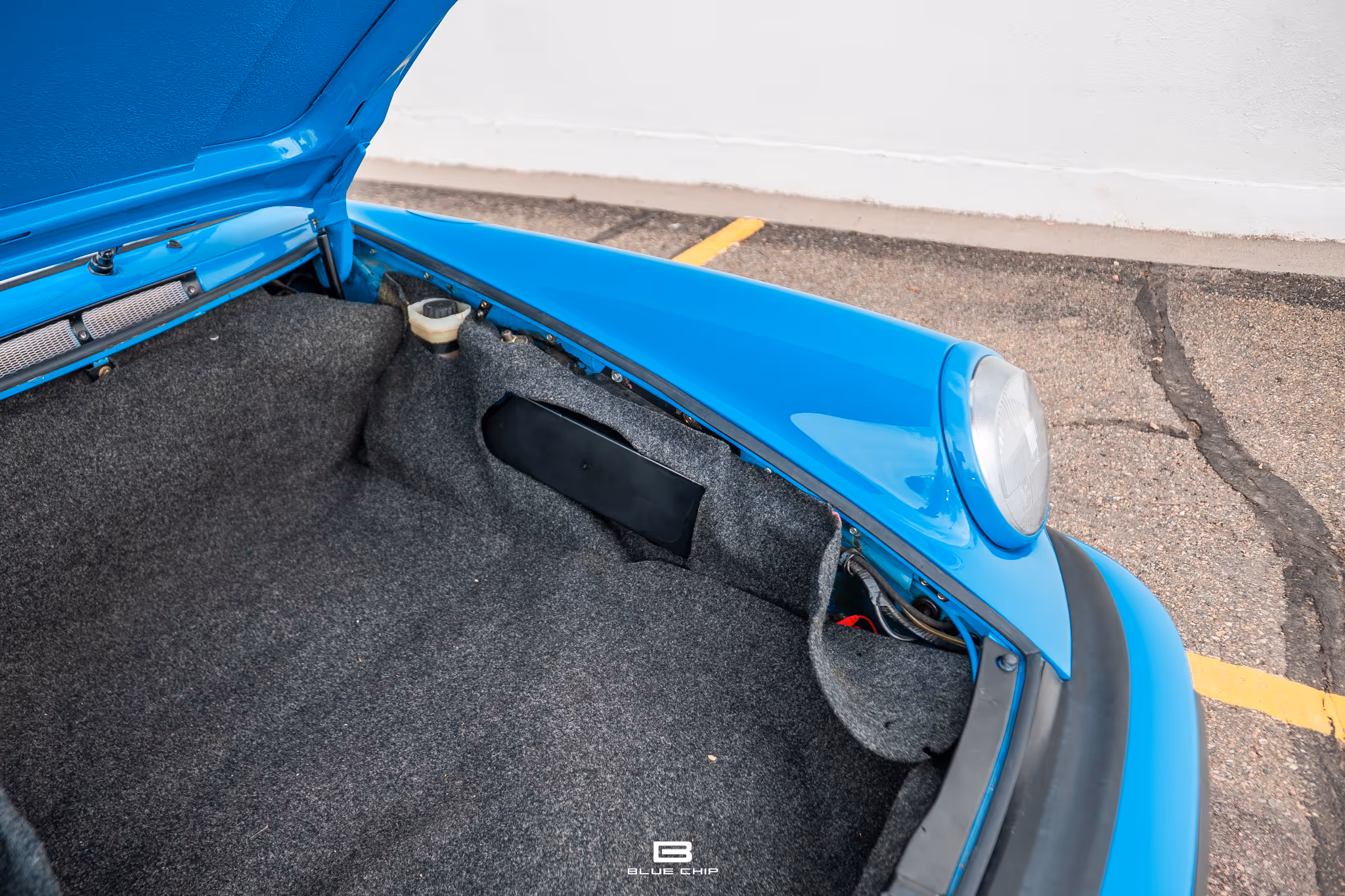 The 911 retains its factory-specified Mexico Blue finish, with a professional repaint under prior ownership maintaining its vivid presentation. Enhancing the classic silhouette are body-color bumpers, H4 headlights with matching trim rings, and a "2.9" engine cover badge. In May 2022, paint protection film was applied to the bumper, hood, headlights, and fenders to preserve the car’s pristine condition. Rolling on 15-inch "cookie cutter" wheels wrapped in Continental ProContact TX tires with 2021 date codes, the car benefits from four-wheel ventilated disc brakes. A suspension refresh in July 2022 included the installation of an ERP bump steer kit and a lowered ride height for improved handling dynamics. Replacement rear CV boots were installed in June 2023.