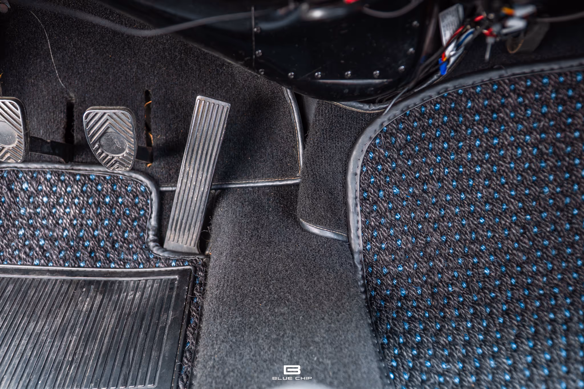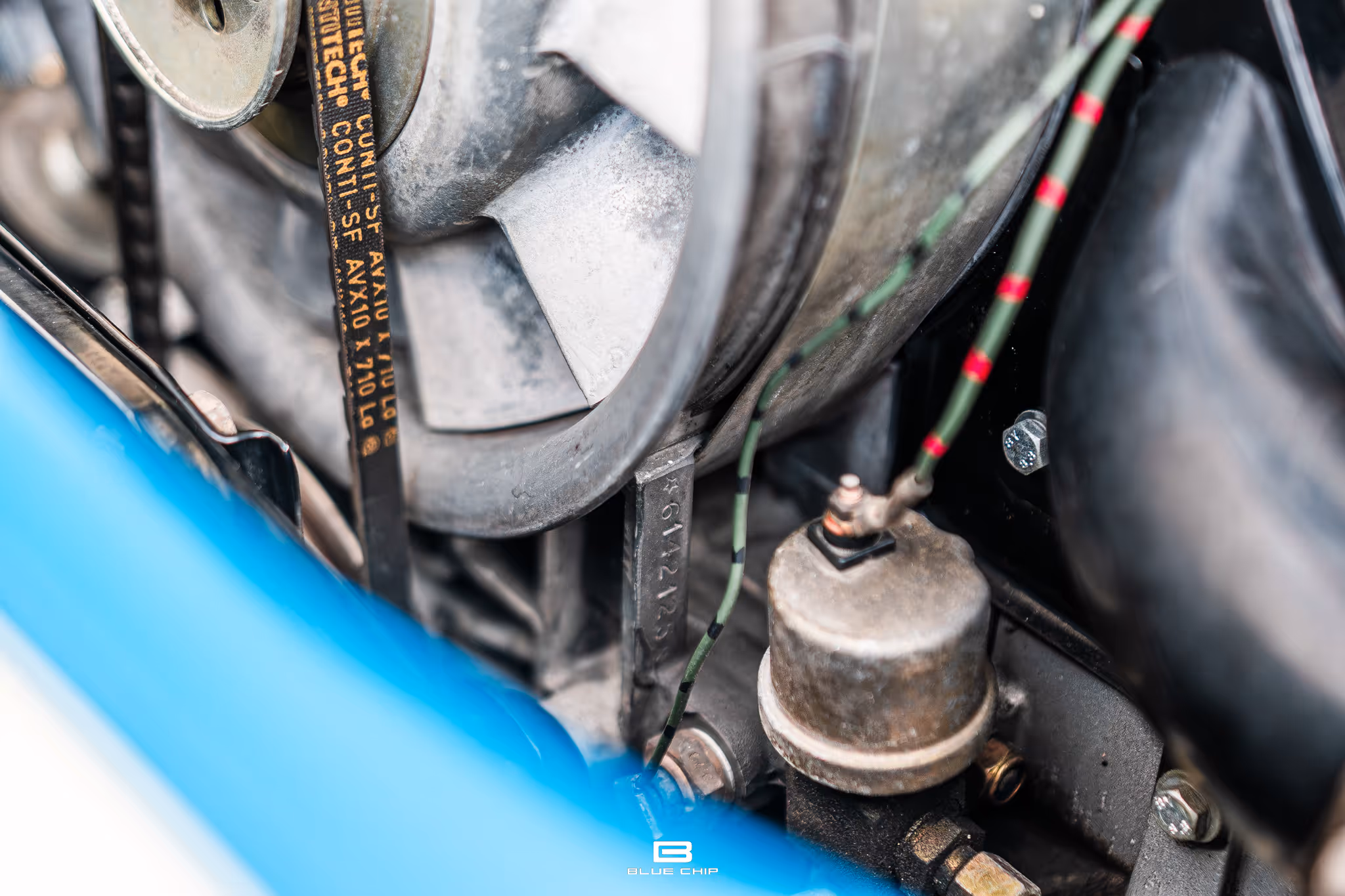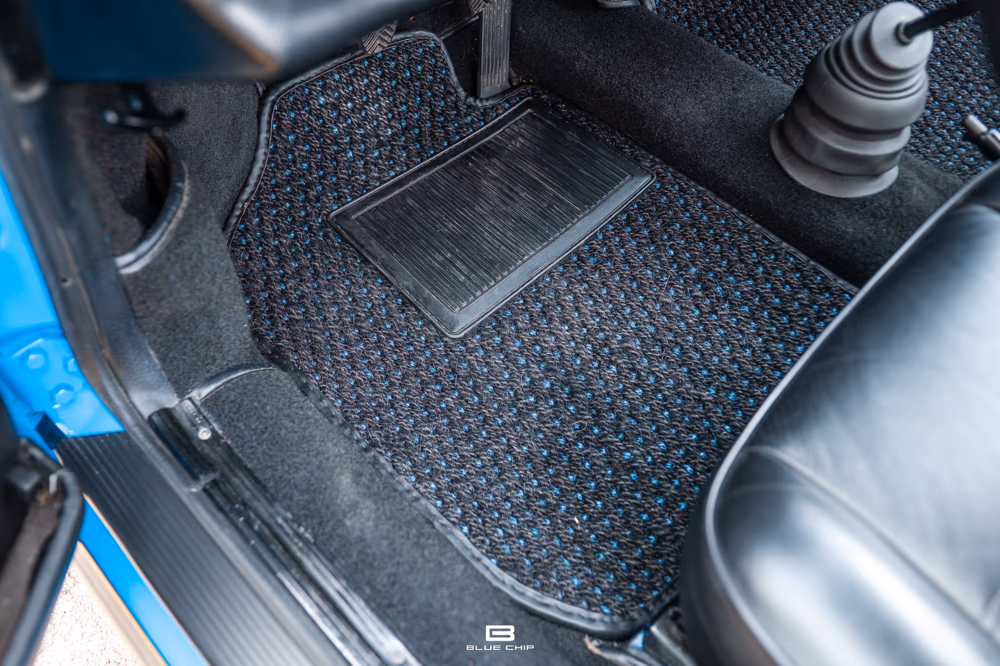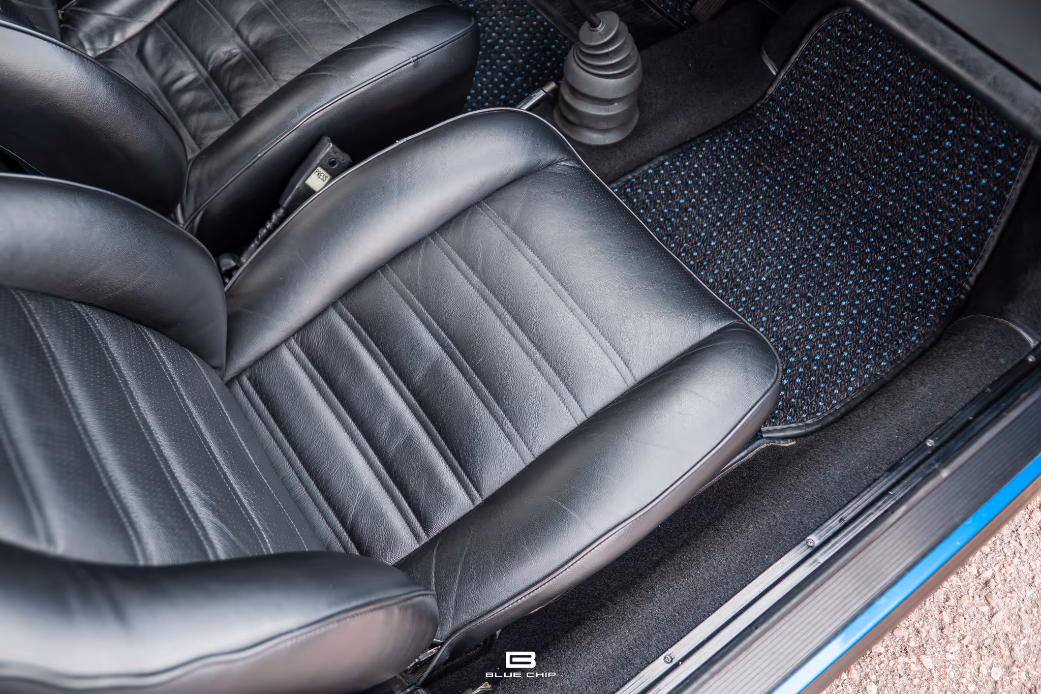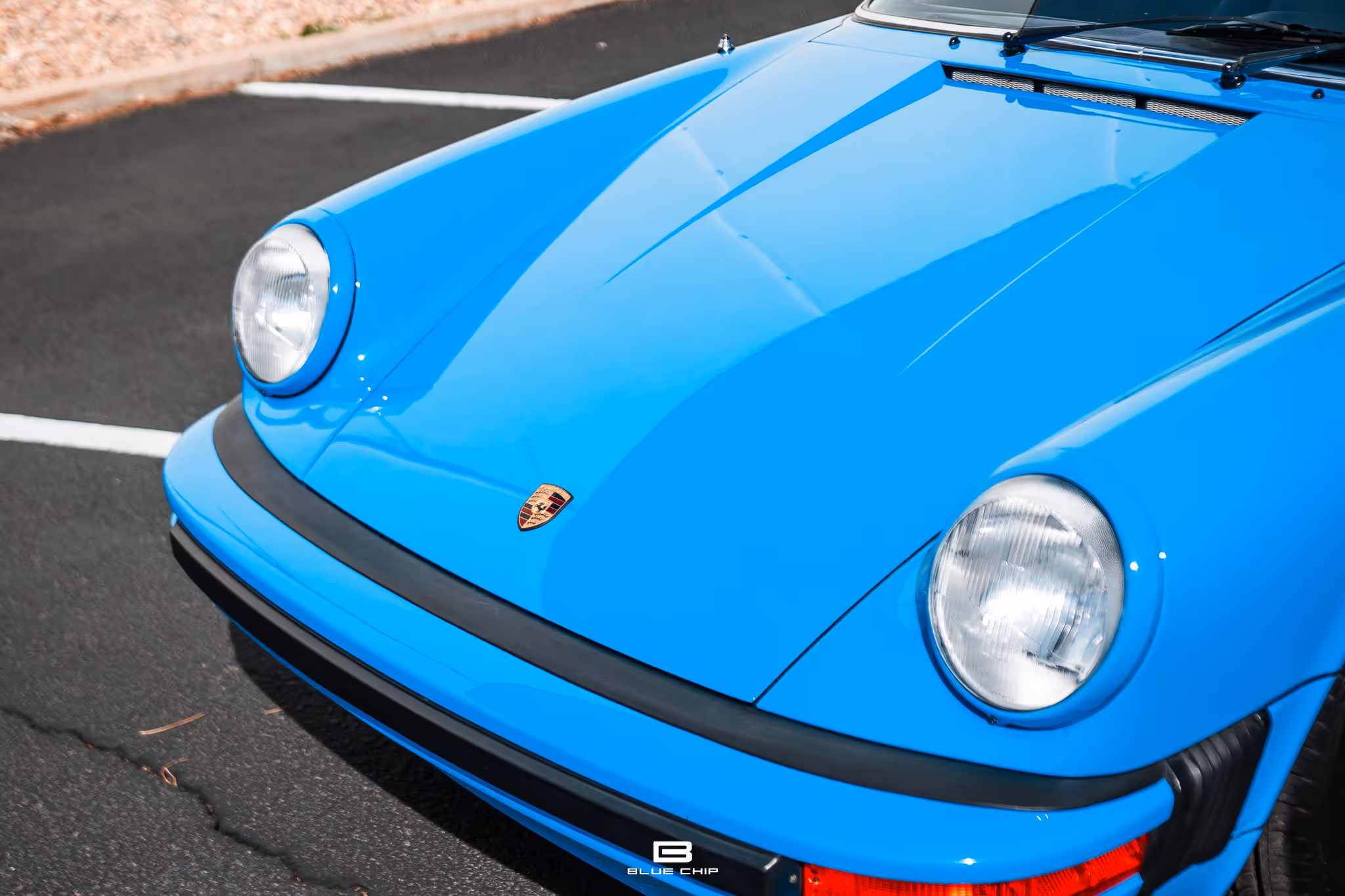 The 911 retains its factory-specified Mexico Blue finish, with a professional repaint under prior ownership maintaining its vivid presentation. Enhancing the classic silhouette are body-color bumpers, H4 headlights with matching trim rings, and a "2.9" engine cover badge. In May 2022, paint protection film was applied to the bumper, hood, headlights, and fenders to preserve the car’s pristine condition. Rolling on 15-inch "cookie cutter" wheels wrapped in Continental ProContact TX tires with 2021 date codes, the car benefits from four-wheel ventilated disc brakes. A suspension refresh in July 2022 included the installation of an ERP bump steer kit and a lowered ride height for improved handling dynamics. Replacement rear CV boots were installed in June 2023.