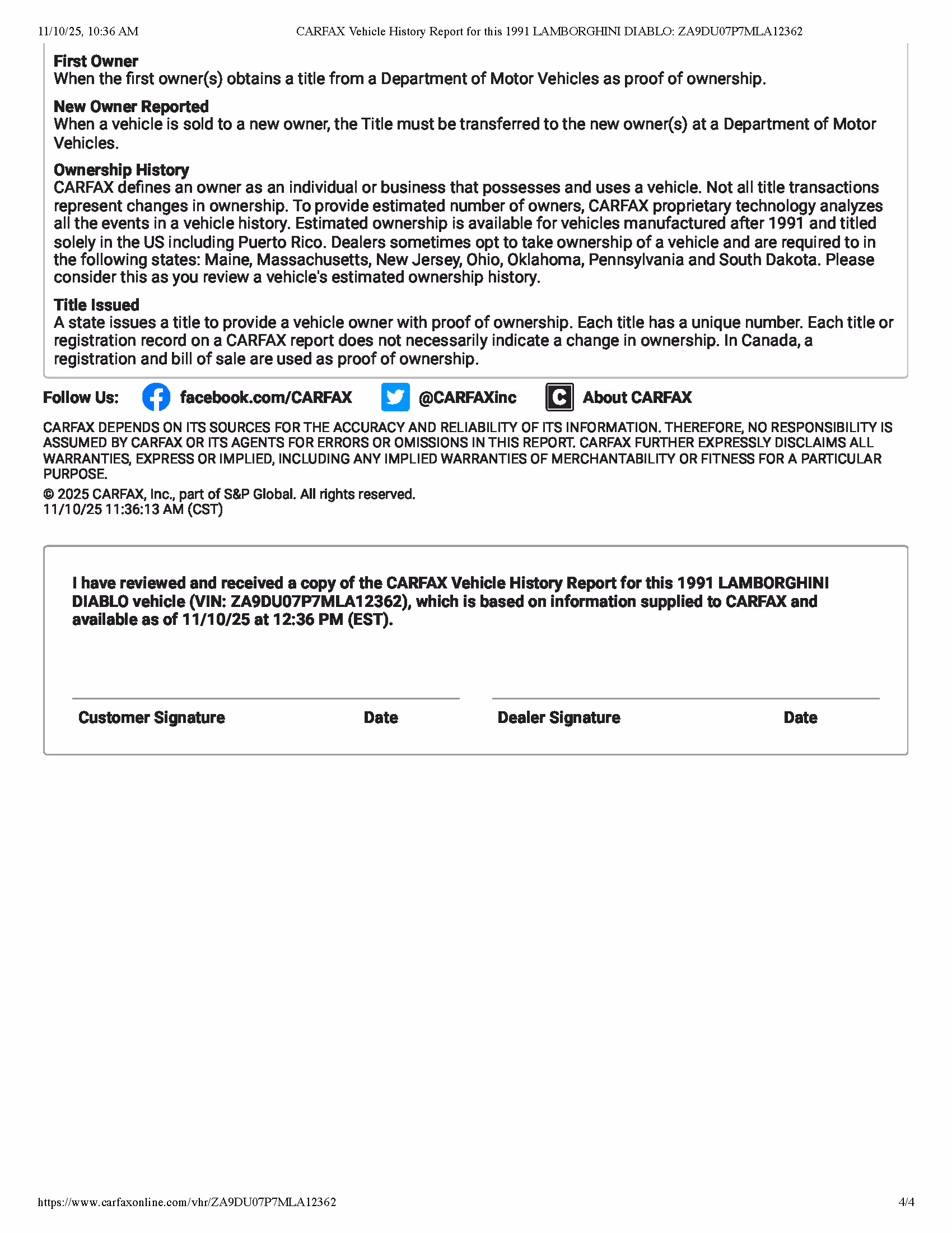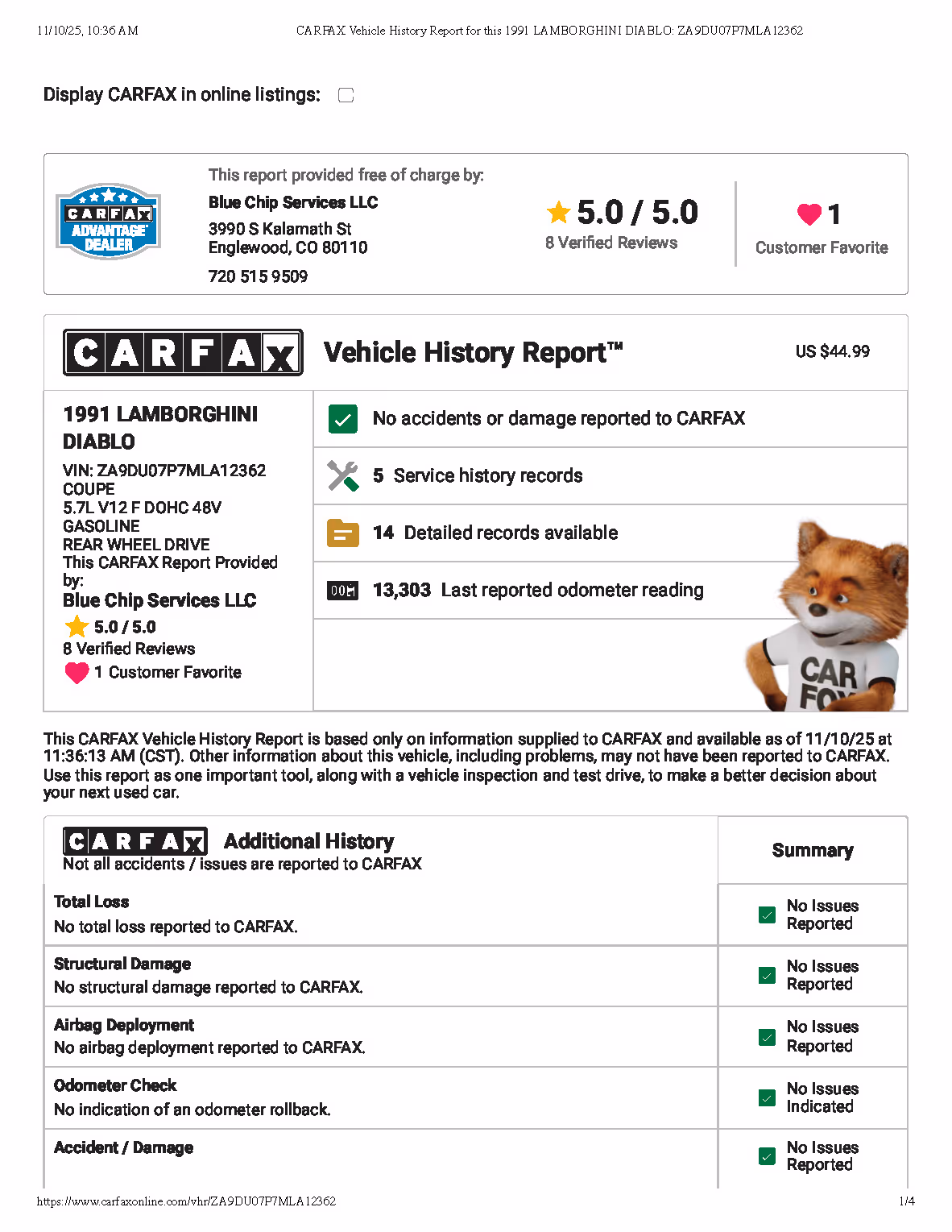 Now more than three decades on, the original Diablo stands as the last of the purely analog, pre-Audi Lamborghinis—a raw, unfiltered expression of speed and style that bridges the gap between the classic Countach and the modern Murciélago. Opportunities to acquire an early, ultra-low-mileage example—especially in such an iconic and celebratory color—are exceedingly rare. This 1991 example presents a compelling chance to secure one of the most legendary supercars of its era, preserved in near-original condition.