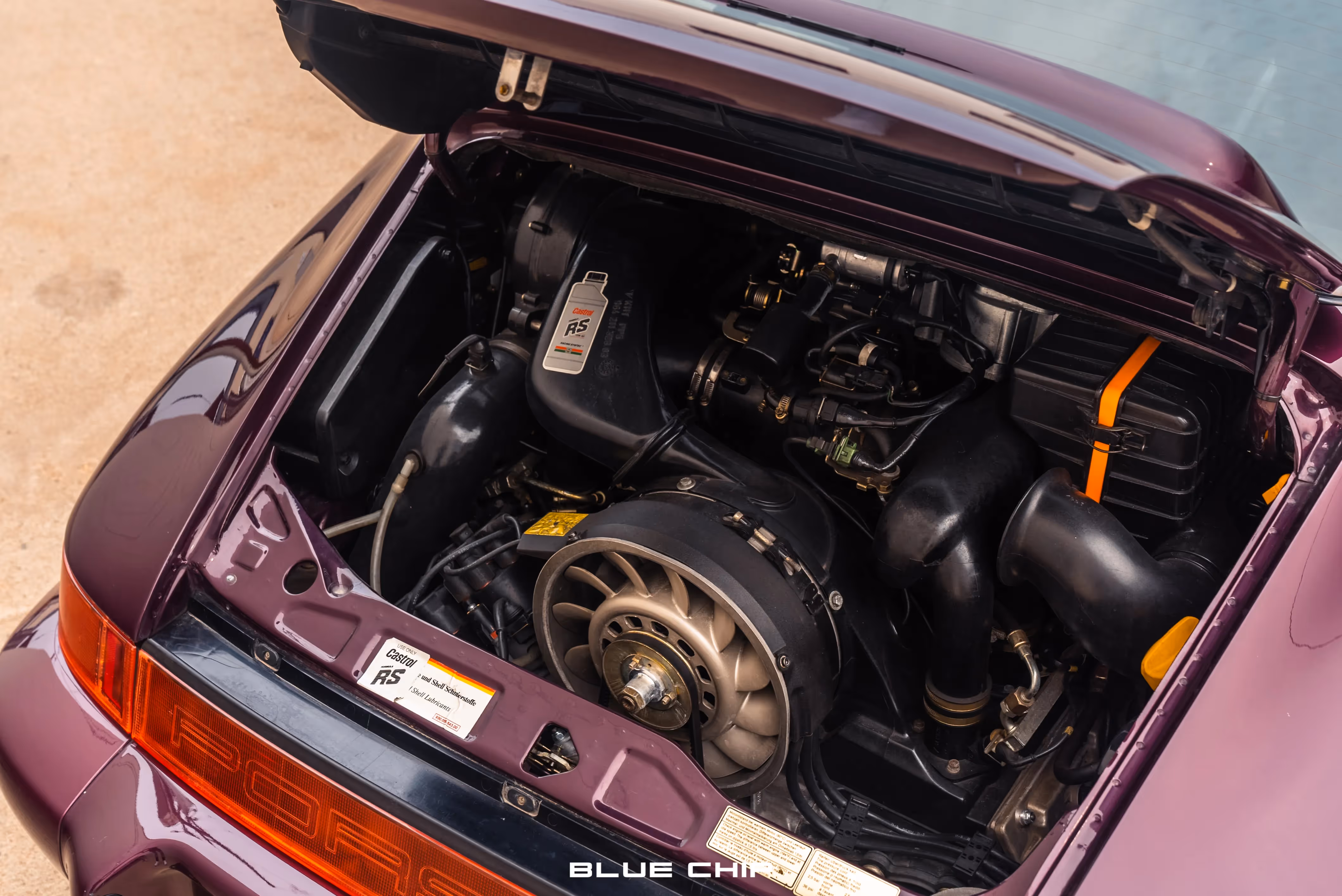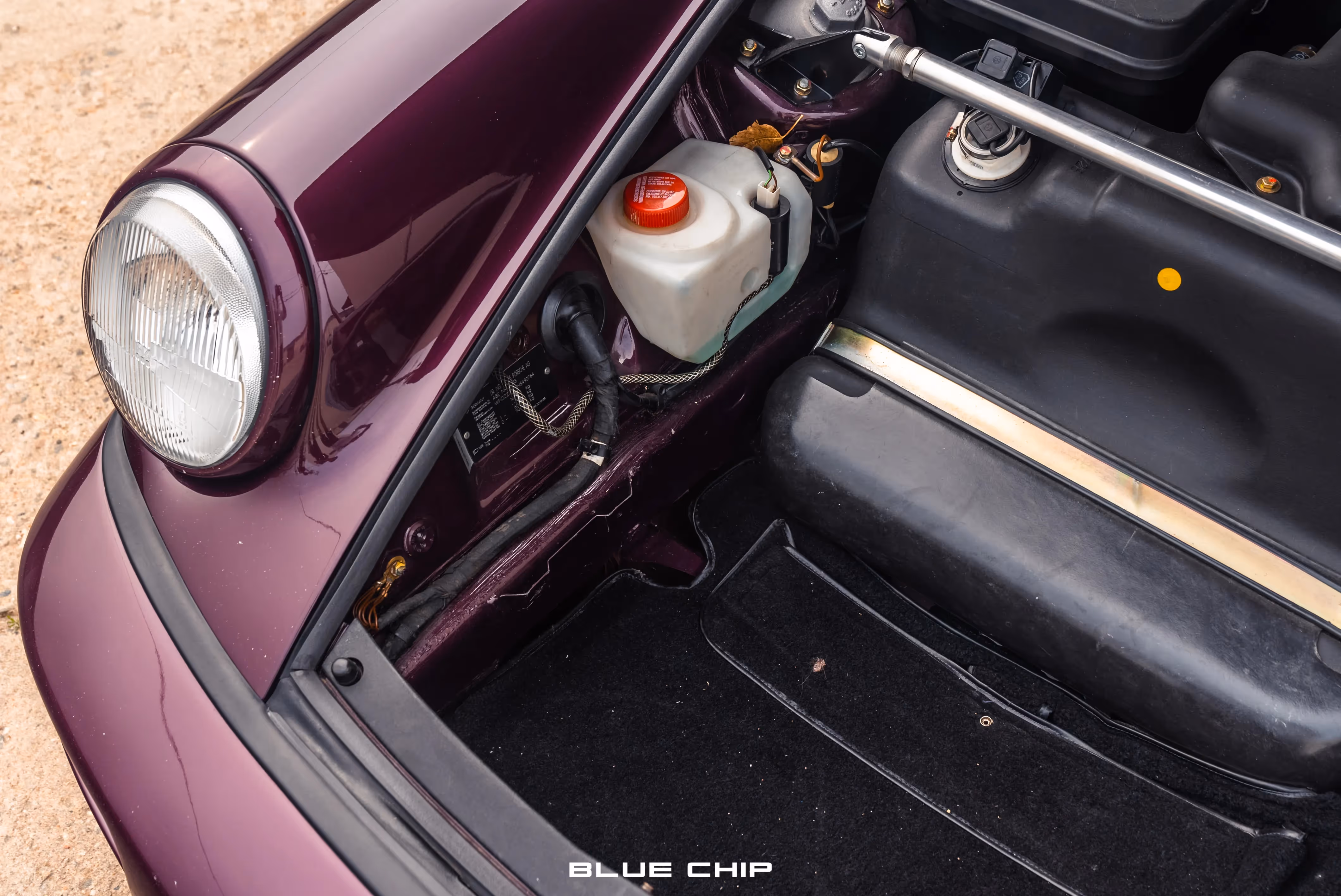 This RS is finished in striking Amethyst Metallic over a Black leather interior and features a retractable rear spoiler, a lightweight aluminum front trunk lid, and a single-exit exhaust. RS-specific exterior details include flared wheel arches to accommodate 17” magnesium Cup Design wheels, finished in Silver, as well as a lower ride height, manual side mirrors, and a Carrera RS model badge in Black.