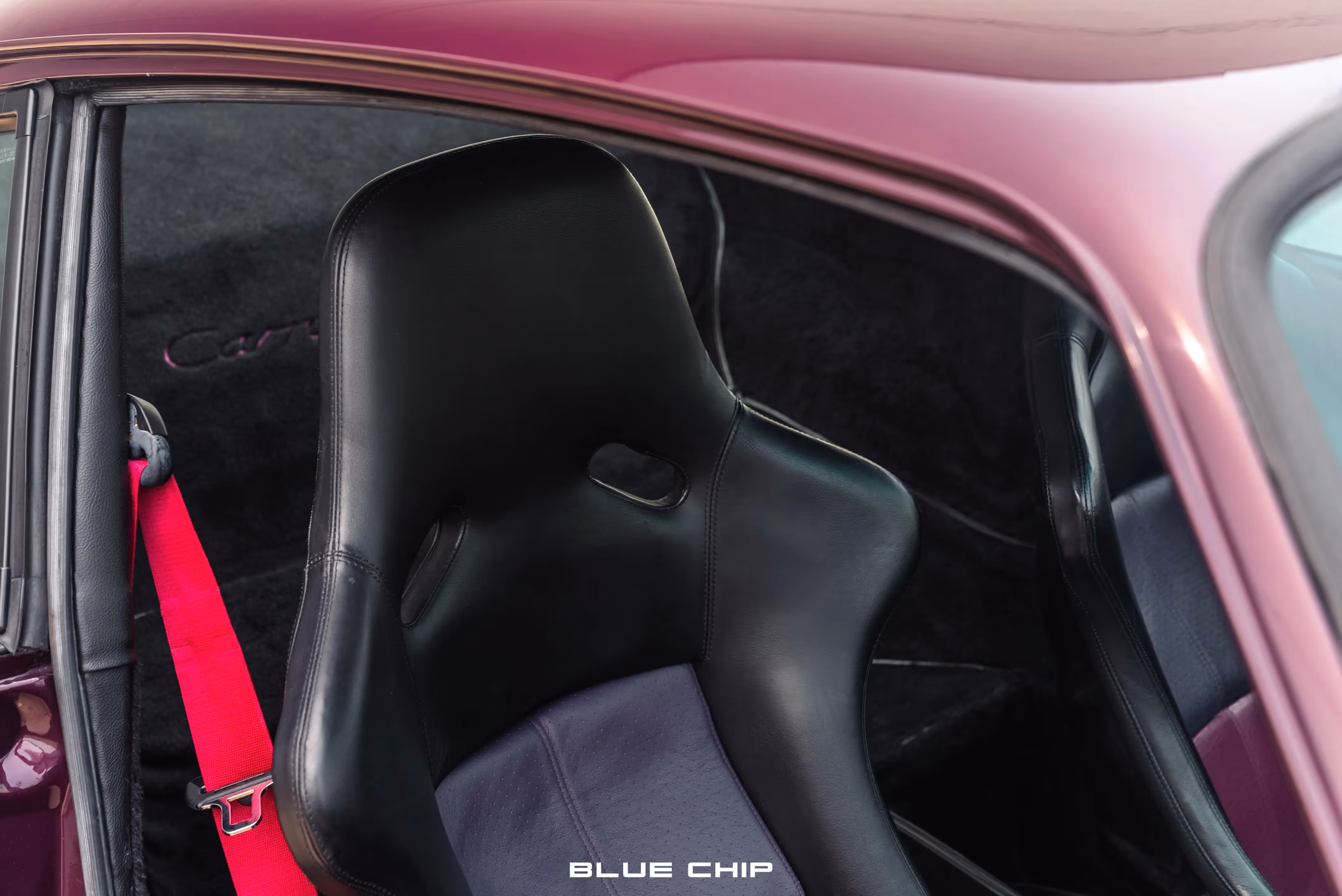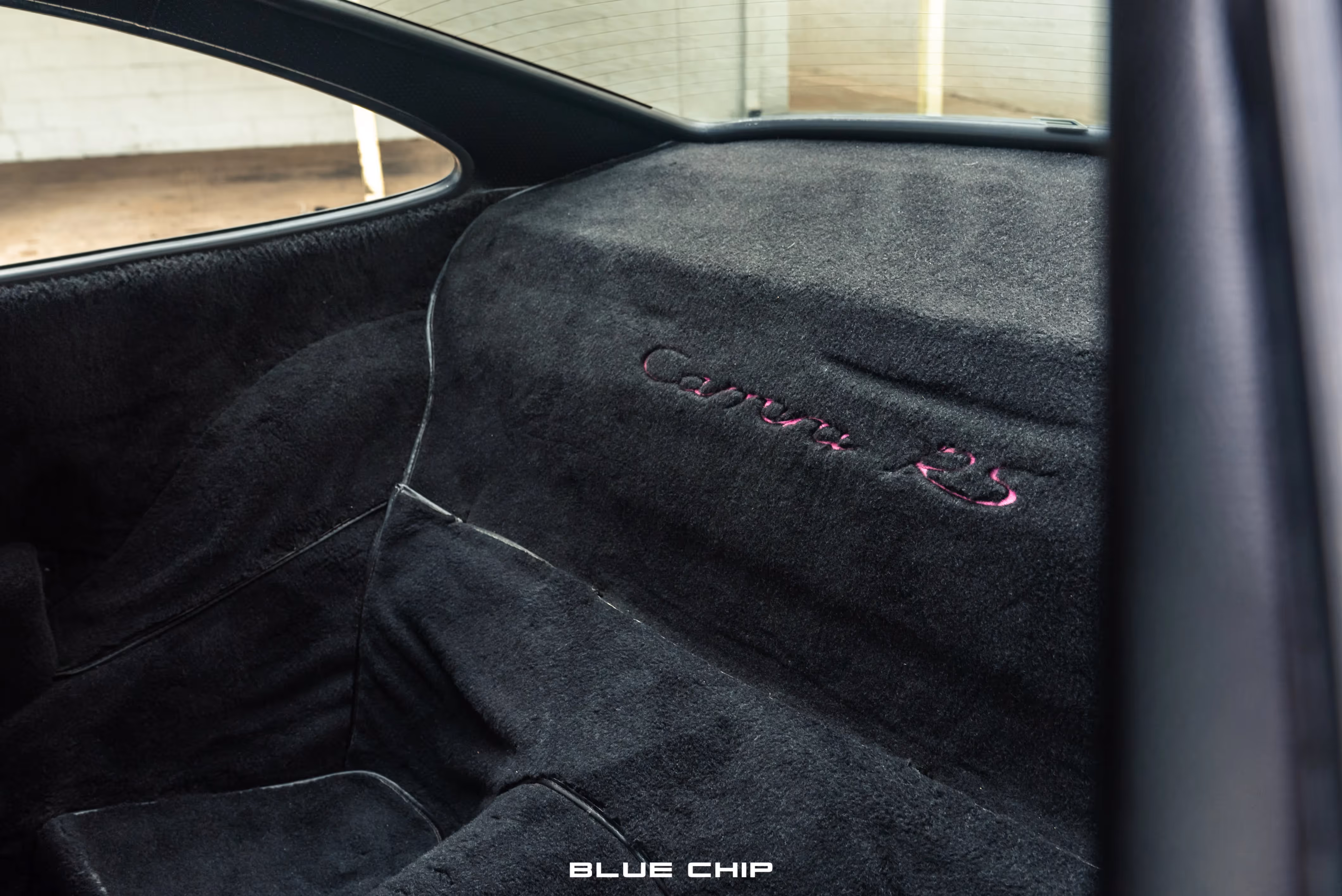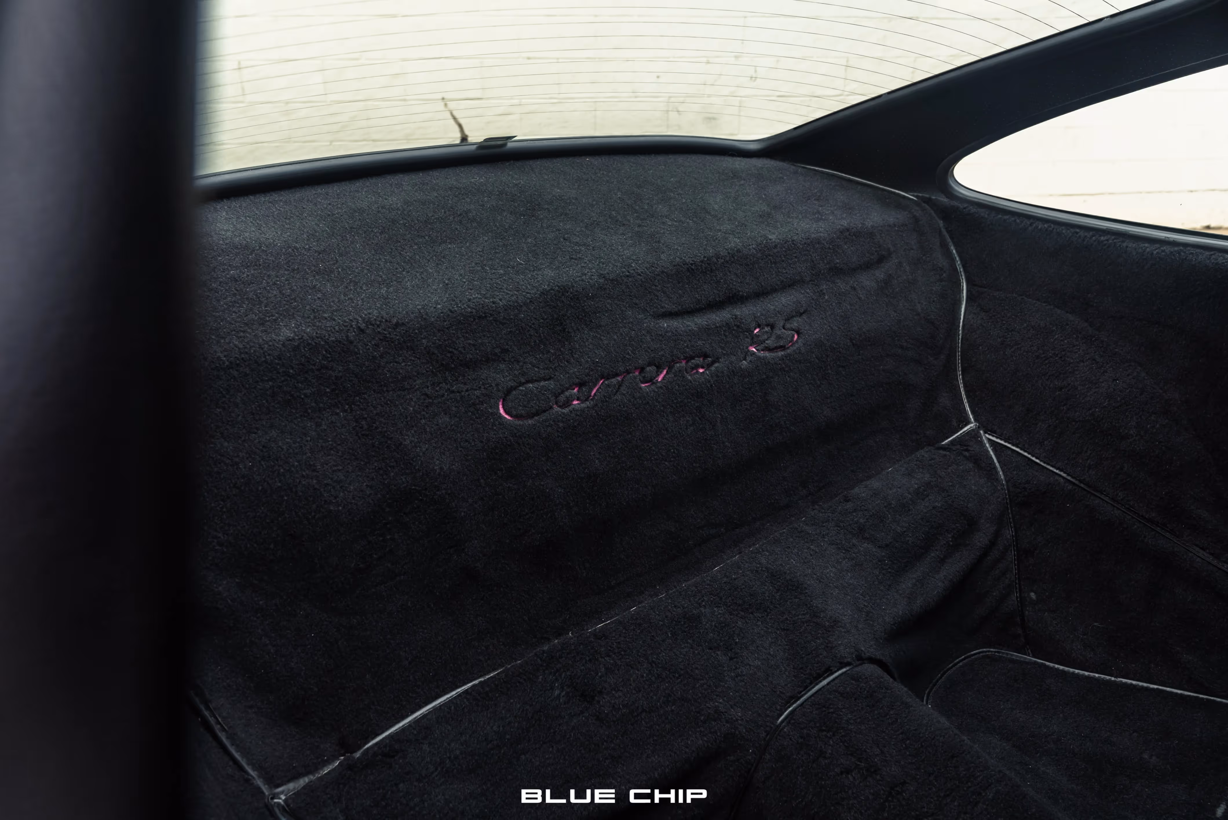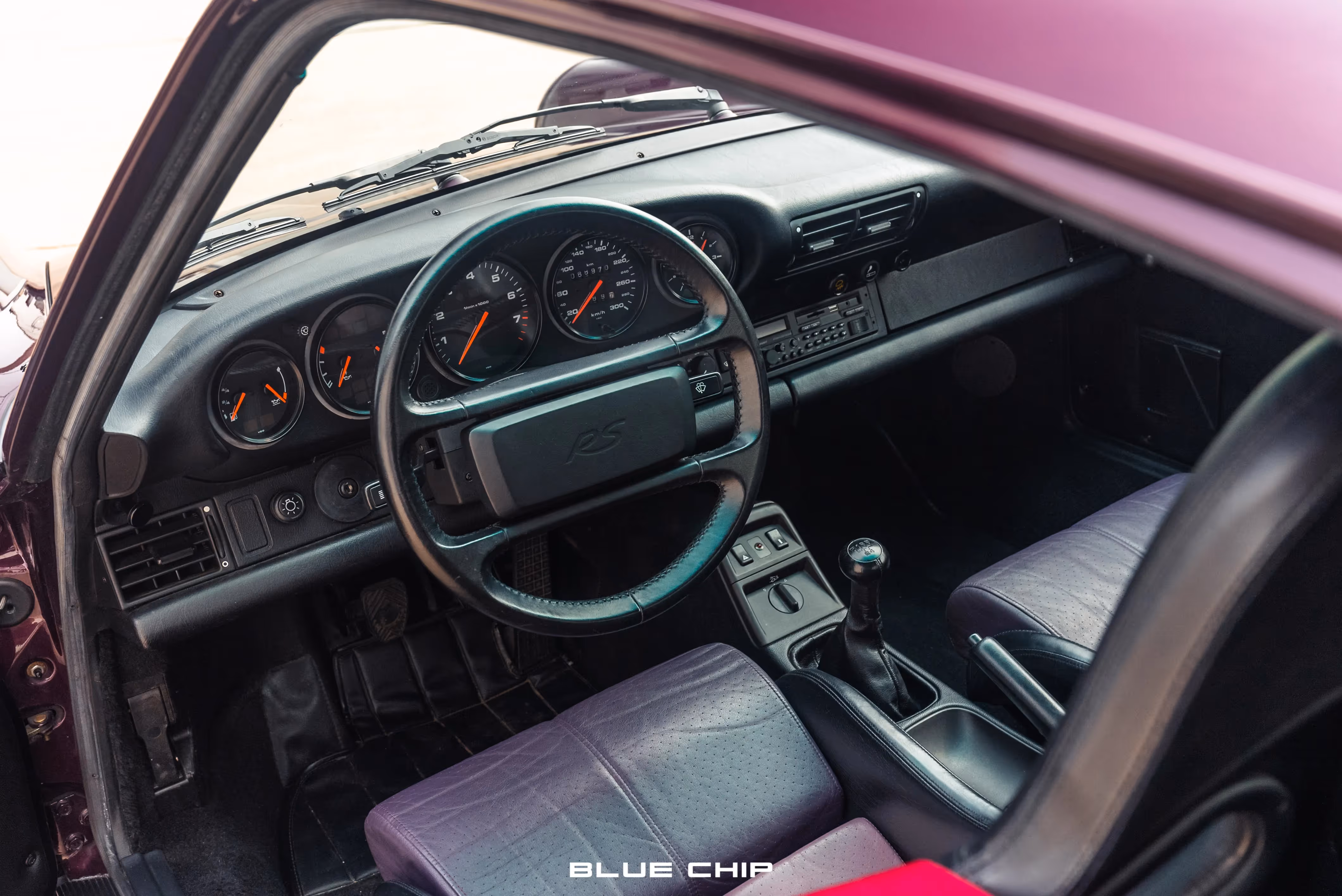 The cabin houses fiberglass Recaro full-bucket seats which have been trimmed in Black leather and feature quad-color purple seat inserts, as well as color-coordinated Amethyst seat belts. The RS moniker meant the deletion of the rear seats, which were replaced by black carpet trim with the Carrera RS insignia stitched in Amethyst on the rear carpeted section. Lightweight door panels are finished in Black leather and are punctuated by color-matching Amethyst door latch pulls straps, as well as the deletion of the standard armrests and cargo pockets. Black leather extends to the gear selector and the dashboard, which houses an optional Blaupunkt stereo unit. A four-spoke, Black leather wrapped steering wheel bears the RS logo and frames a 6,800-rpm tachometer alongside a 300 km/h speedometer.