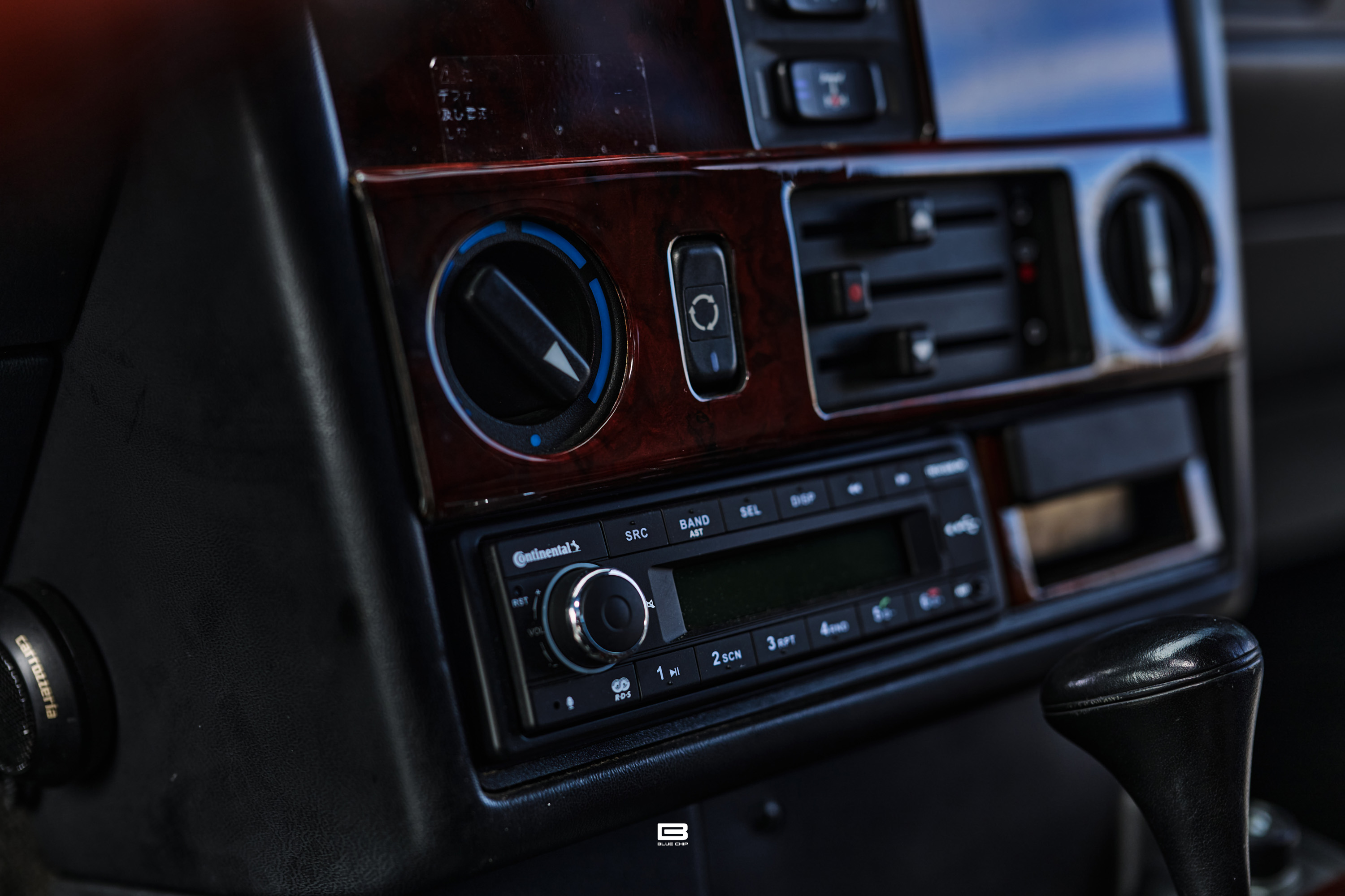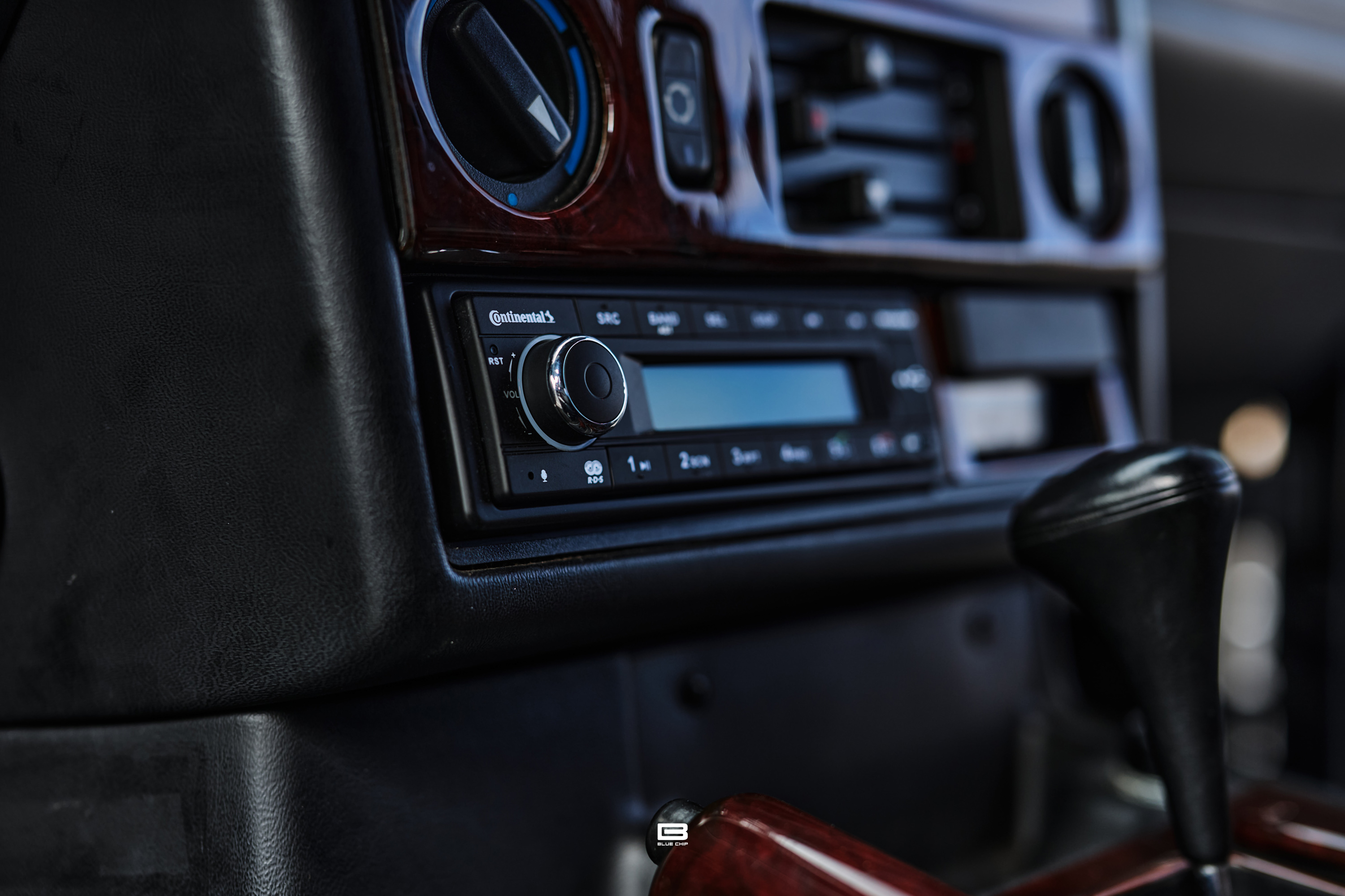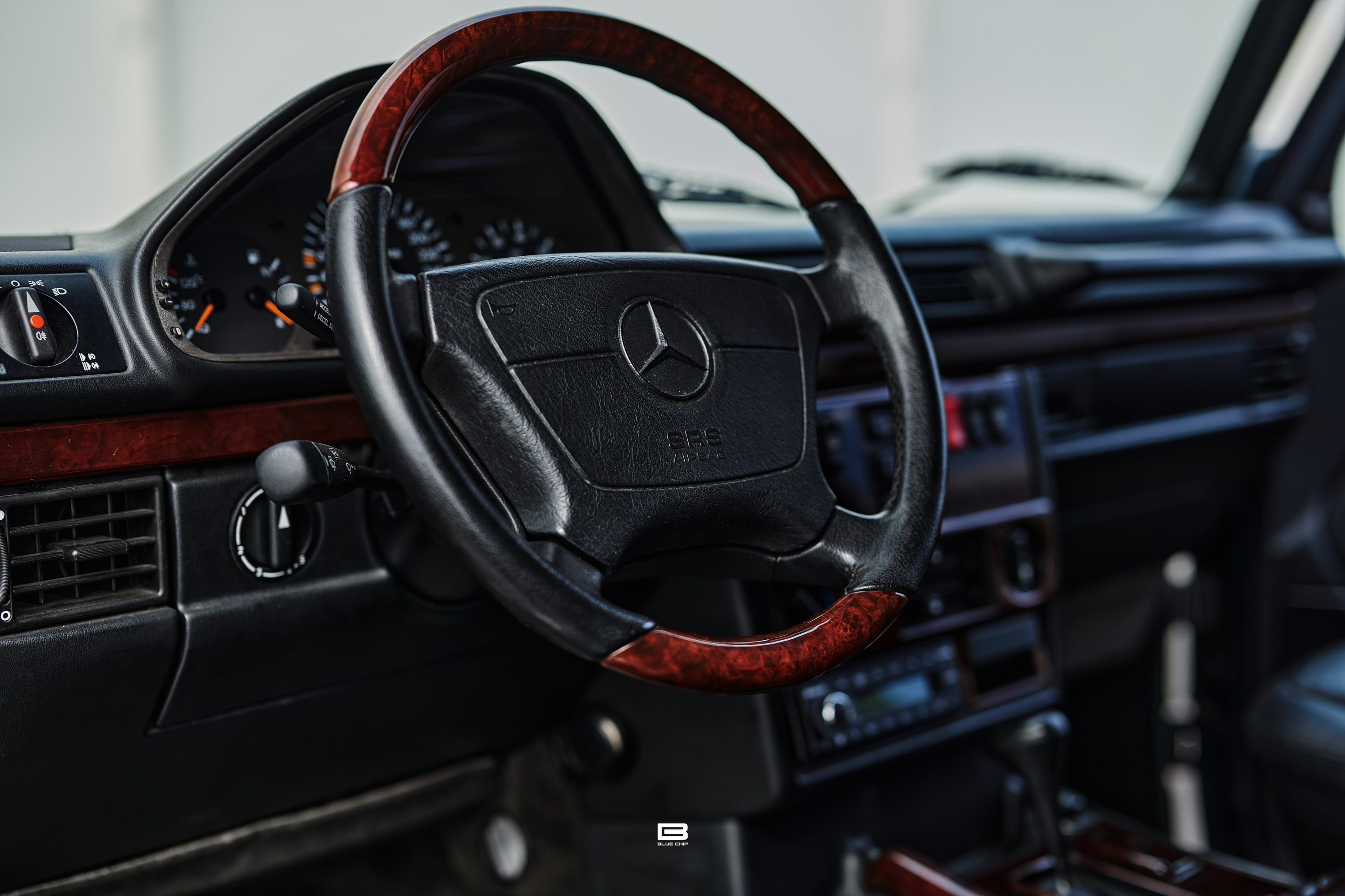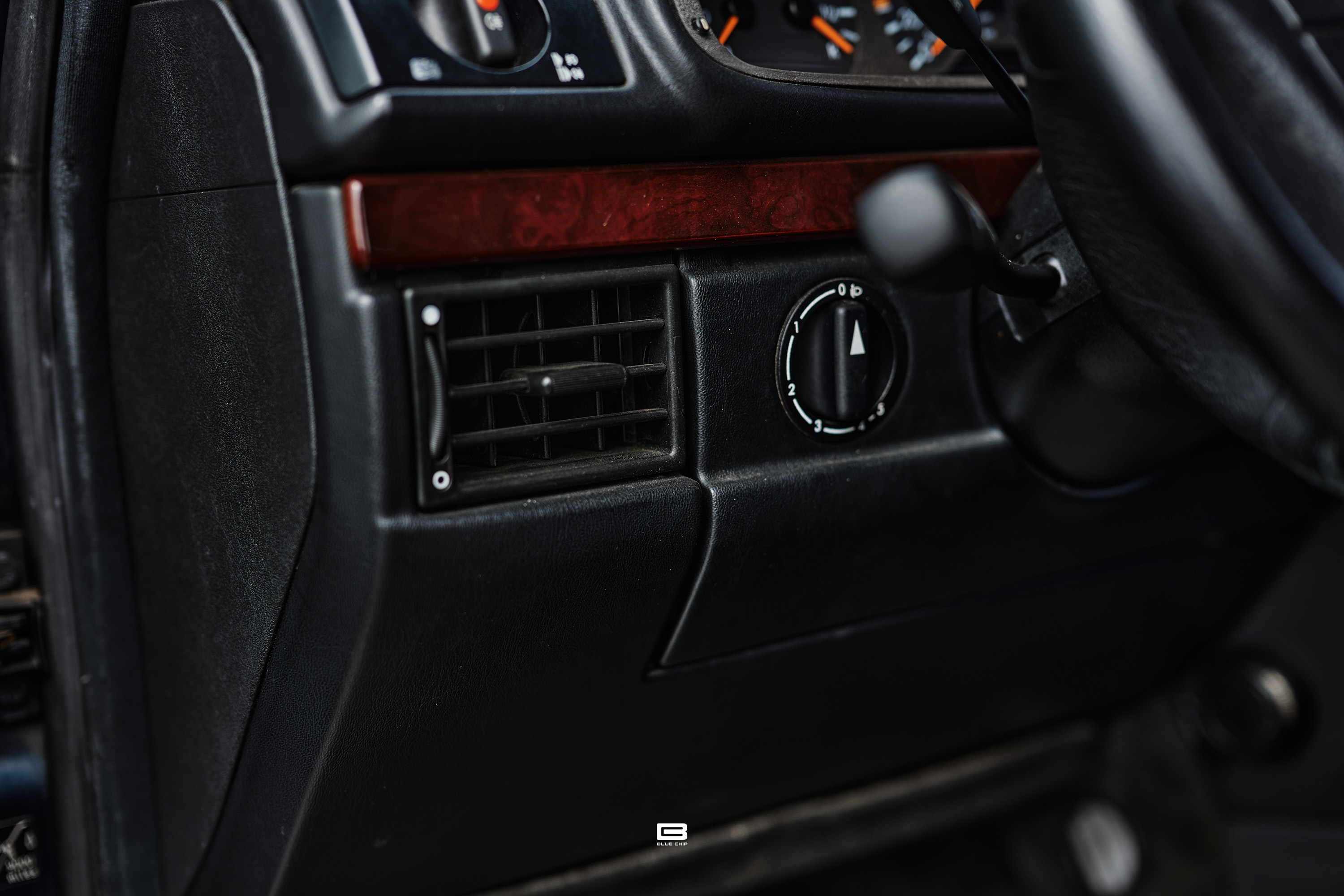 The interior is trimmed in Black leather with wood trim extending across the dashboard, door cappings, and center console — an appointments package that communicates the E36 AMG Wagon's dual identity as both a performance machine and a refined grand touring estate. The combination of sport-tuned AMG dynamics and a wood-trimmed, leather-lined cabin speaks directly to the breadth of the vehicle's character — a car equally at home on a demanding back road and a long motorway crossing.