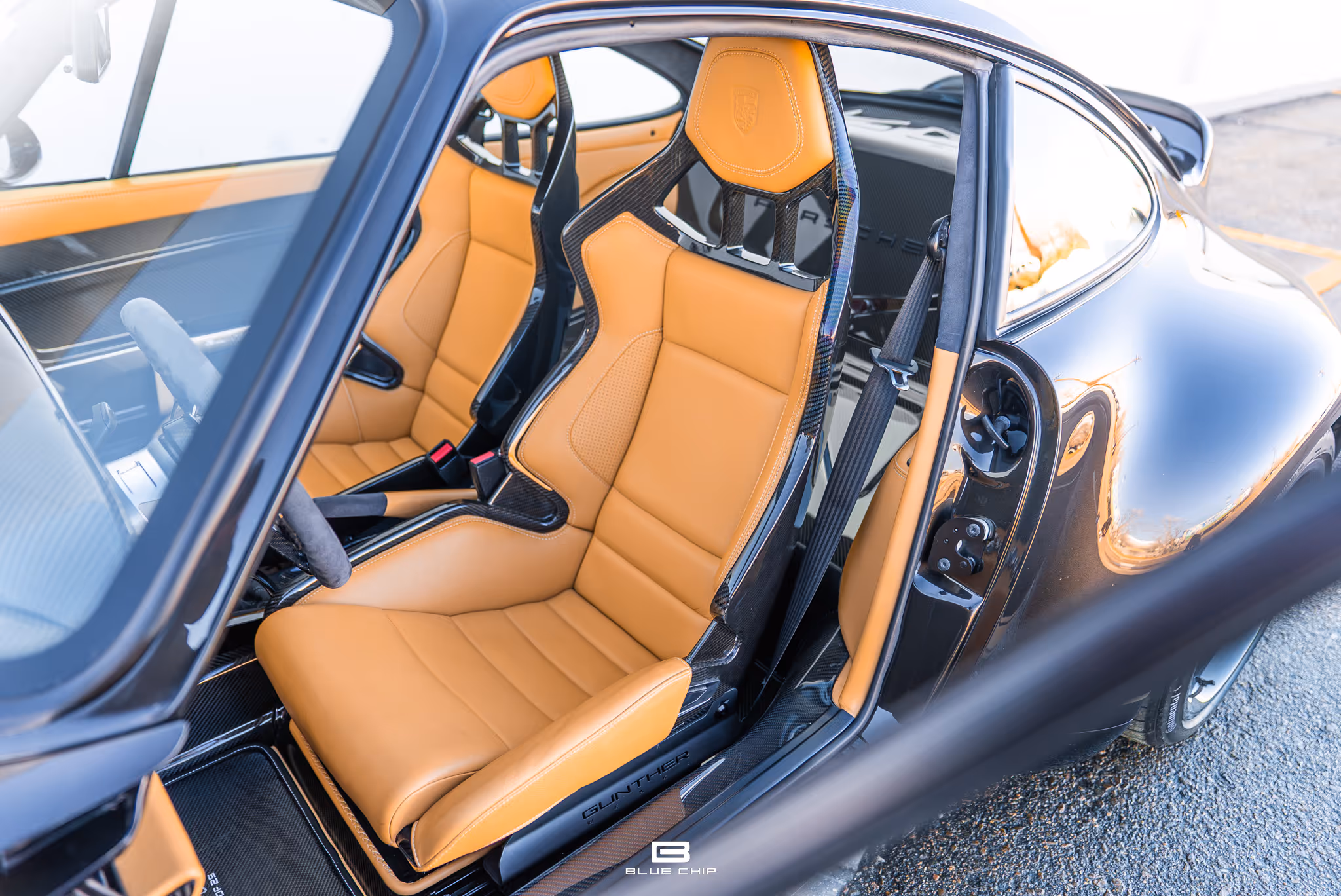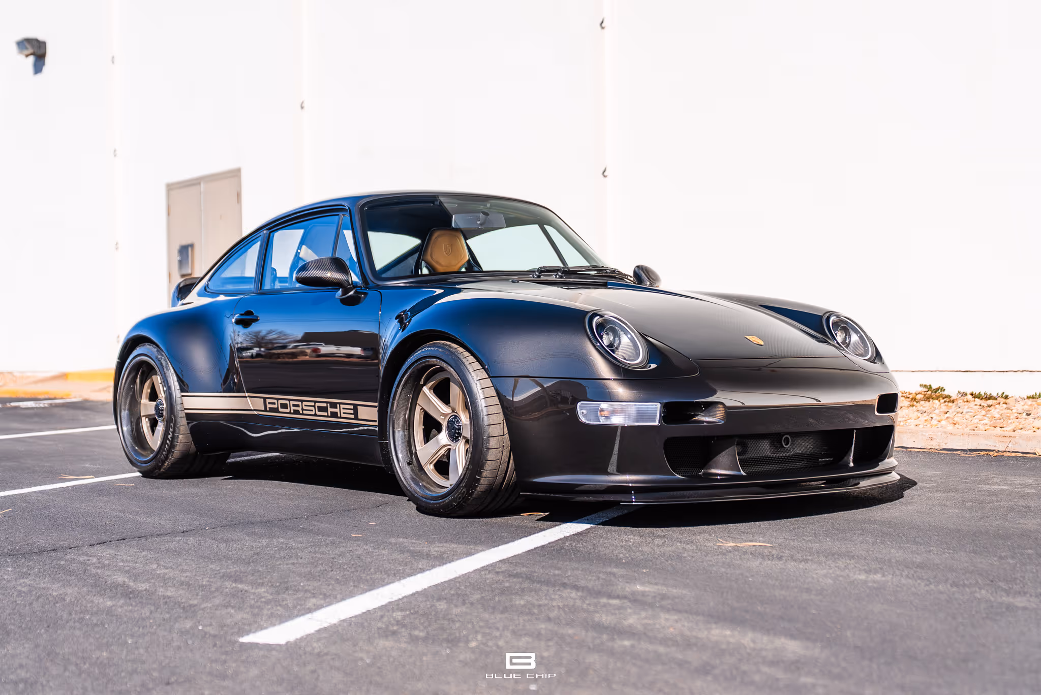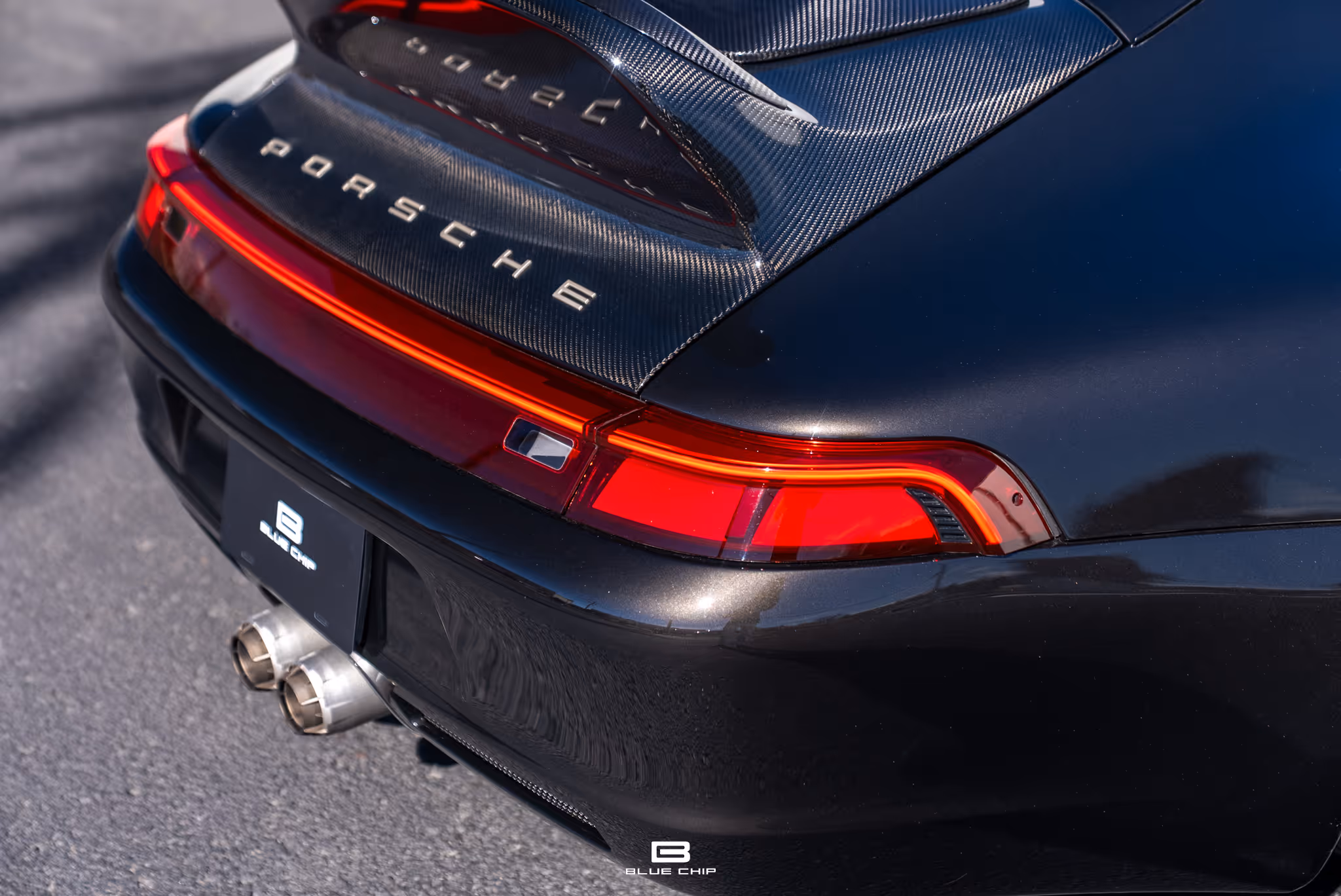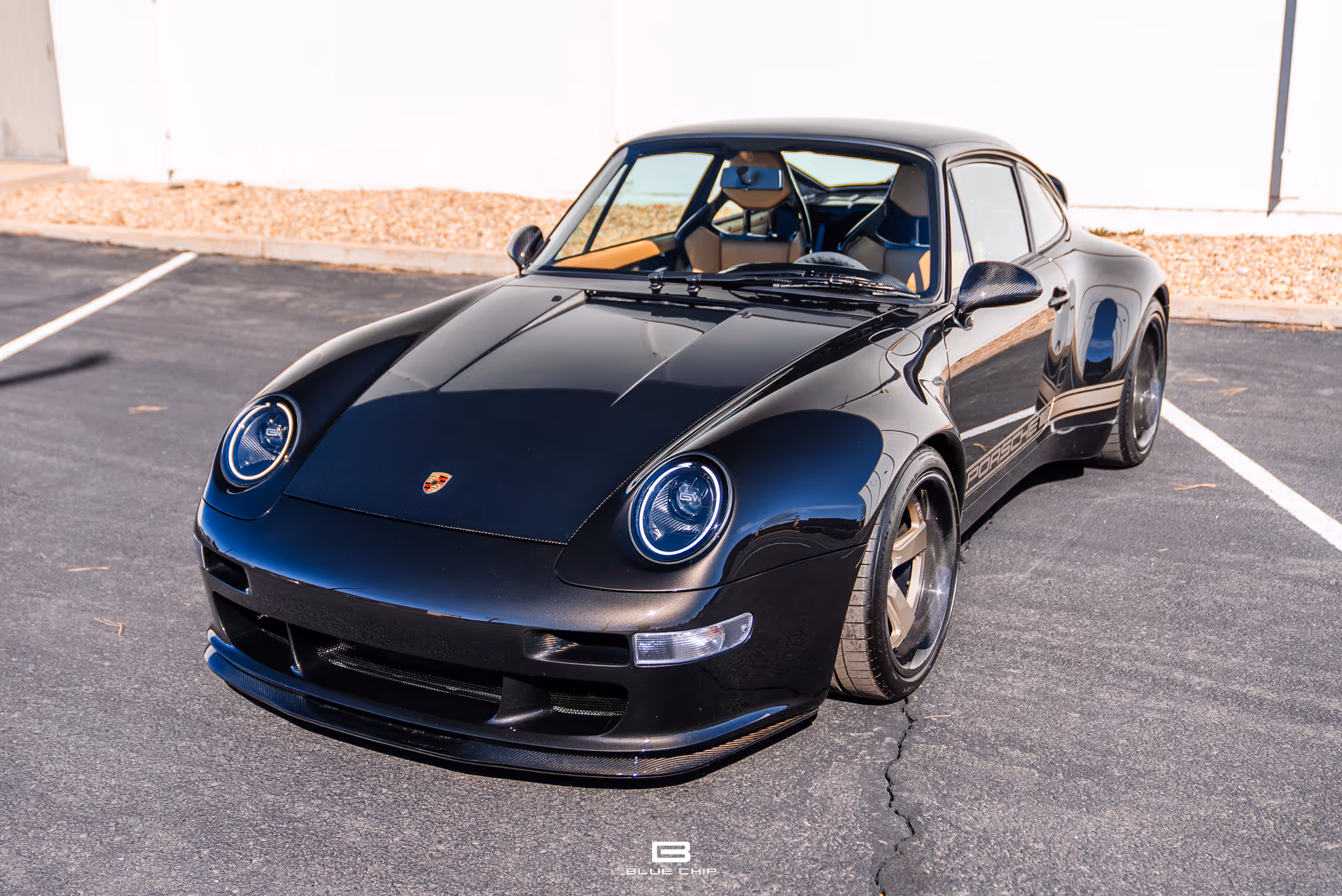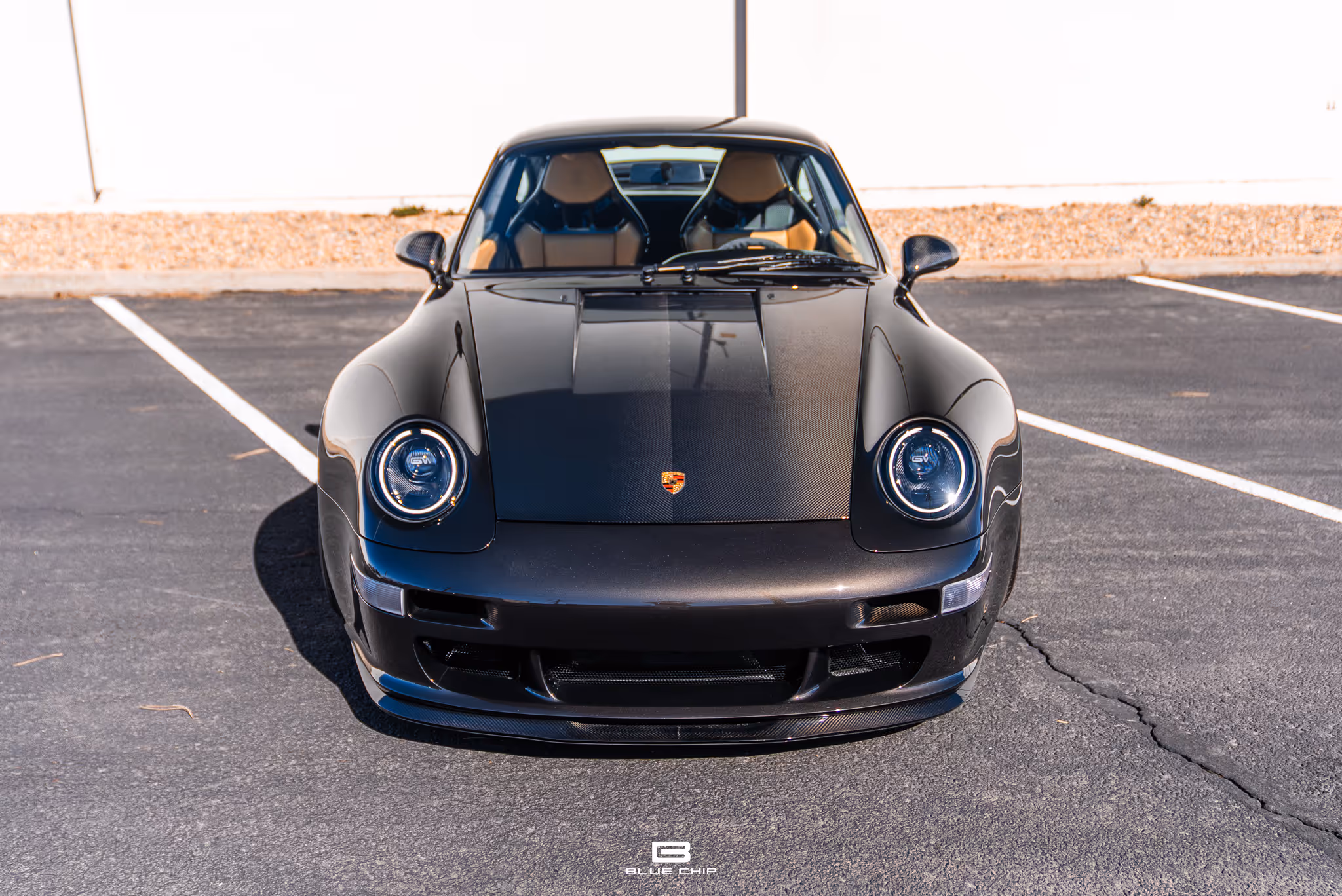 This 1997 Porsche 911 993 has been remastered by Gunther Werks in Huntington Beach, California. 80% of the vehicle is now completely bespoke, while the remaining 20% has been replaced with brand new Porsche equipment. The exterior body panels along with many of the internals have been replaced with copious amounts of carbon fiber, and Gunther Werks has flawlessly woven carbon fiber into the chassis. The originally 3.6-liter flat-six was completely stripped down and rebuilt as a 4.0 liter by Rothsport Road and Race in Sherwood, Oregon, now producing over 400 horsepower and more than 300 pound-feet of torque. The Remastered engine features an extensive list of forged internals and race-spec equipment including a two-stage MoTec engine management system, individual throttle bodies, and custom intake design based on the intake plenum of a 996-series Porsche 911 GT3. The Getrag G50 six-speed has been extensively enhanced with stronger internals, a lightweight flywheel, and 997.2 GT3RS clutch. The engineering masterpiece presented for sale here is the one off "Carbon Noire Commission." It's exterior is finished in a blend of exposed carbon fiber and bespoke gold flake black metallic paint. Inside, cognac aeronautical leather is mixed with exposed carbon fiber throughout. Gunther Werks designed LED headlights and LED rear light bridge were fitted, and rear seats have also been deleted. The Carbon Noire commission has also received over $200,000 in upgrades since it's last sale, including new brakes, rear wing, and lightweight wheels. It now displays only 492 miles from new. One of just 25 examples built, this presents a unique opportunity to acquire one of the finest bespoke 993s in existence.