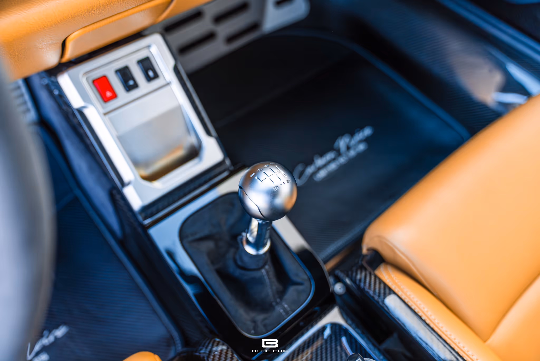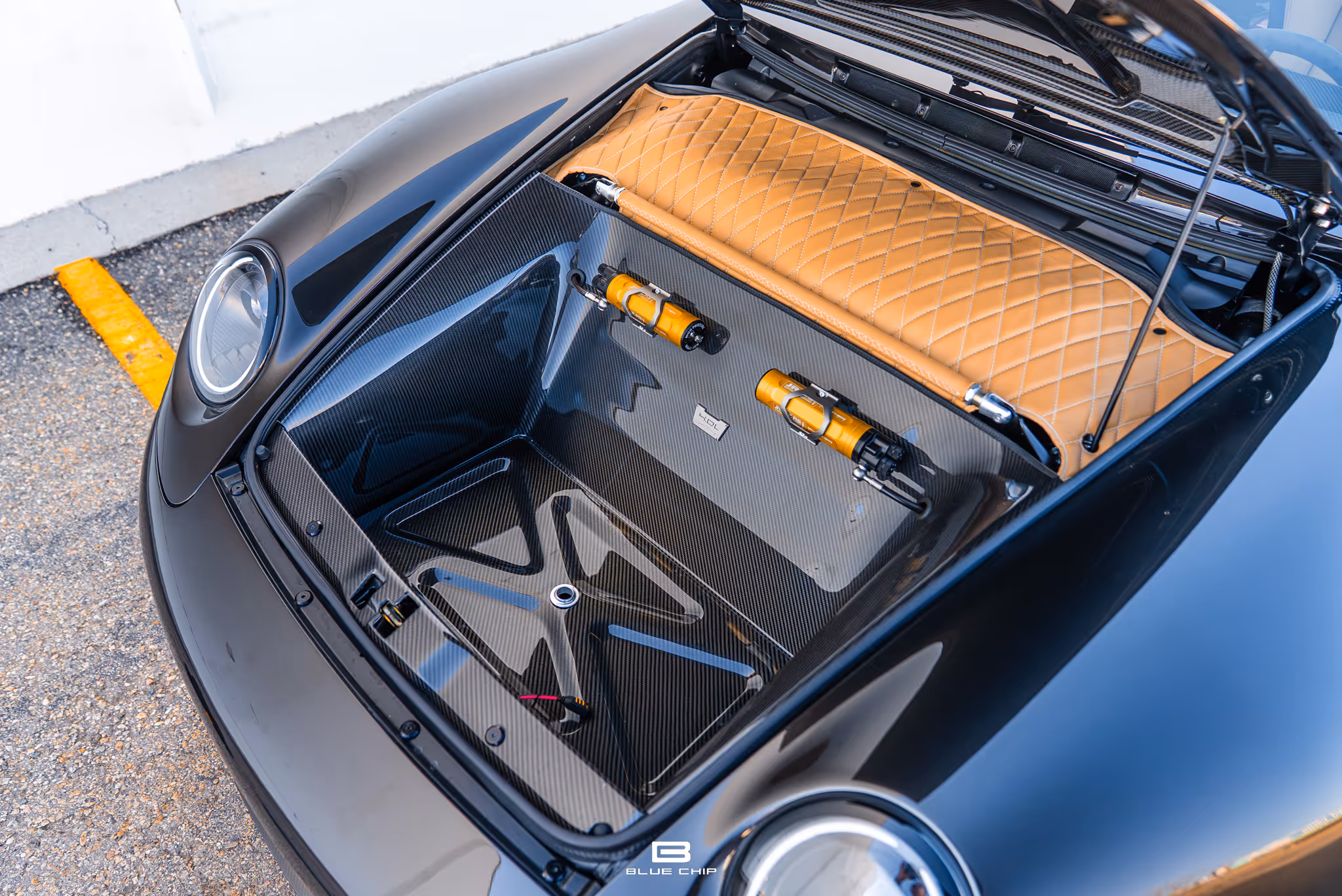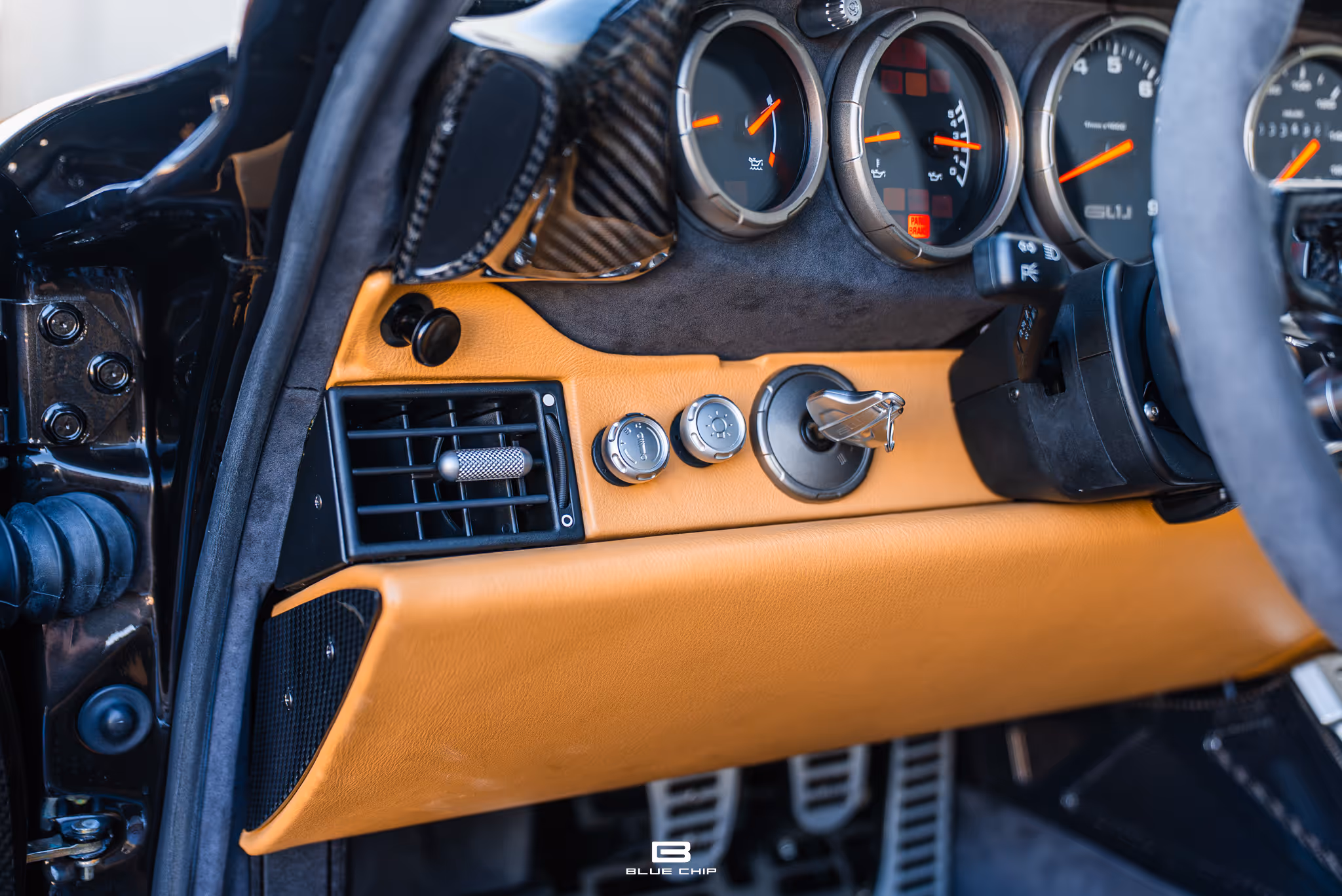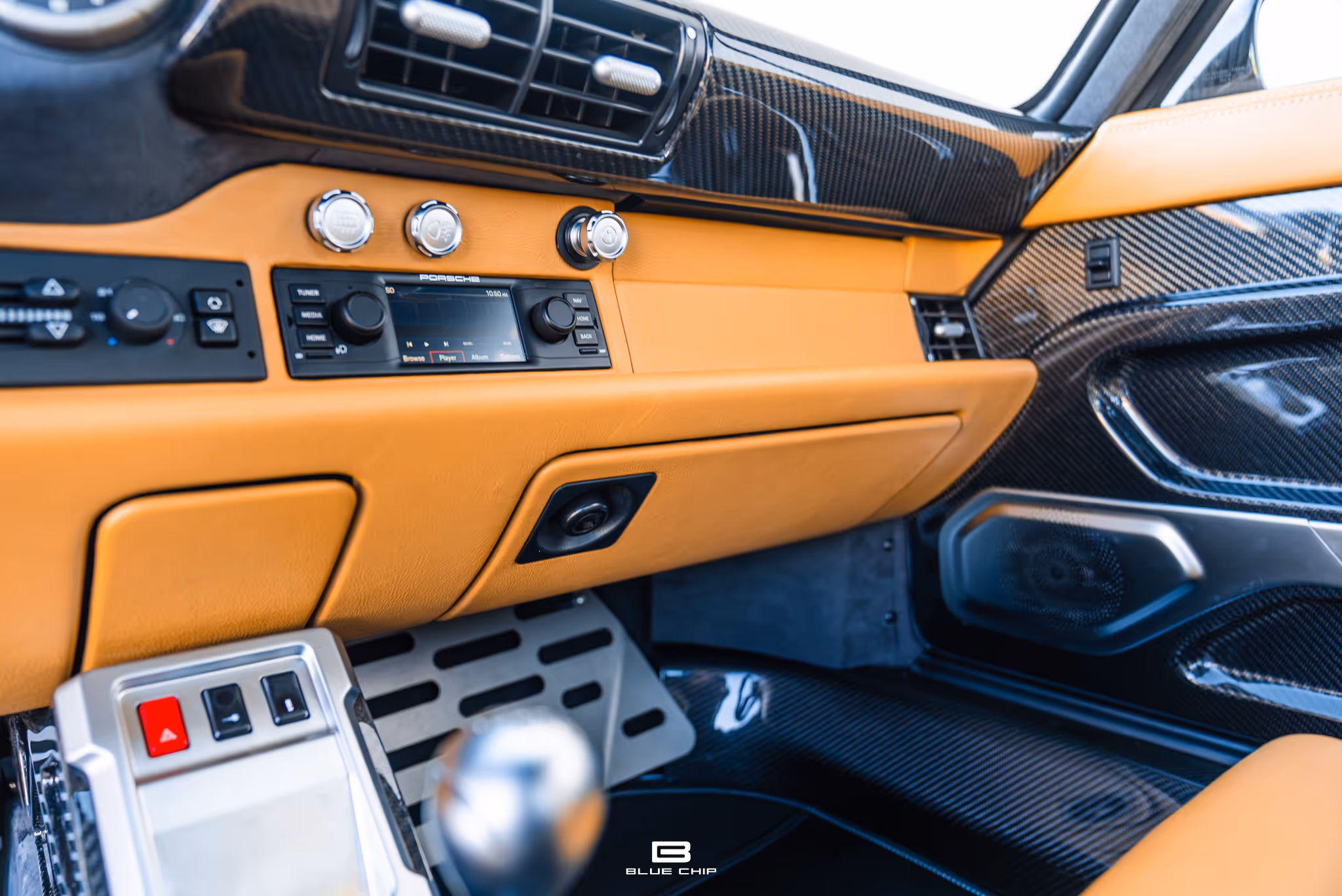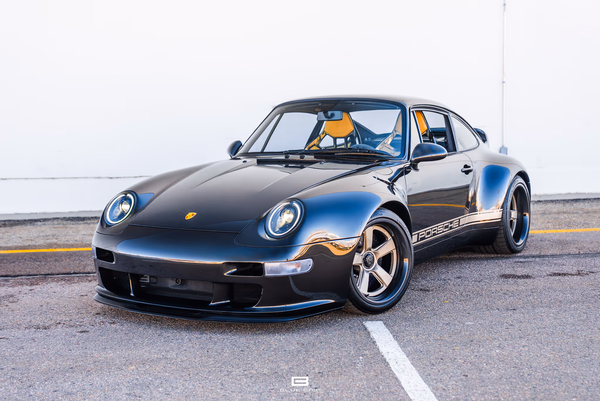This 1997 Porsche 911 993 has been remastered by Gunther Werks in Huntington Beach, California. 80% of the vehicle is now completely bespoke, while the remaining 20% has been replaced with brand new Porsche equipment. The exterior body panels along with many of the internals have been replaced with copious amounts of carbon fiber, and Gunther Werks has flawlessly woven carbon fiber into the chassis. The originally 3.6-liter flat-six was completely stripped down and rebuilt as a 4.0 liter by Rothsport Road and Race in Sherwood, Oregon, now producing over 400 horsepower and more than 300 pound-feet of torque. The Remastered engine features an extensive list of forged internals and race-spec equipment including a two-stage MoTec engine management system, individual throttle bodies, and custom intake design based on the intake plenum of a 996-series Porsche 911 GT3. The Getrag G50 six-speed has been extensively enhanced with stronger internals, a lightweight flywheel, and 997.2 GT3RS clutch. The engineering masterpiece presented for sale here is the one off "Carbon Noire Commission." It's exterior is finished in a blend of exposed carbon fiber and bespoke gold flake black metallic paint. Inside, cognac aeronautical leather is mixed with exposed carbon fiber throughout. Gunther Werks designed LED headlights and LED rear light bridge were fitted, and rear seats have also been deleted. The Carbon Noire commission has also received over $200,000 in upgrades since it's last sale, including new brakes, rear wing, and lightweight wheels. It now displays only 492 miles from new. One of just 25 examples built, this presents a unique opportunity to acquire one of the finest bespoke 993s in existence.
