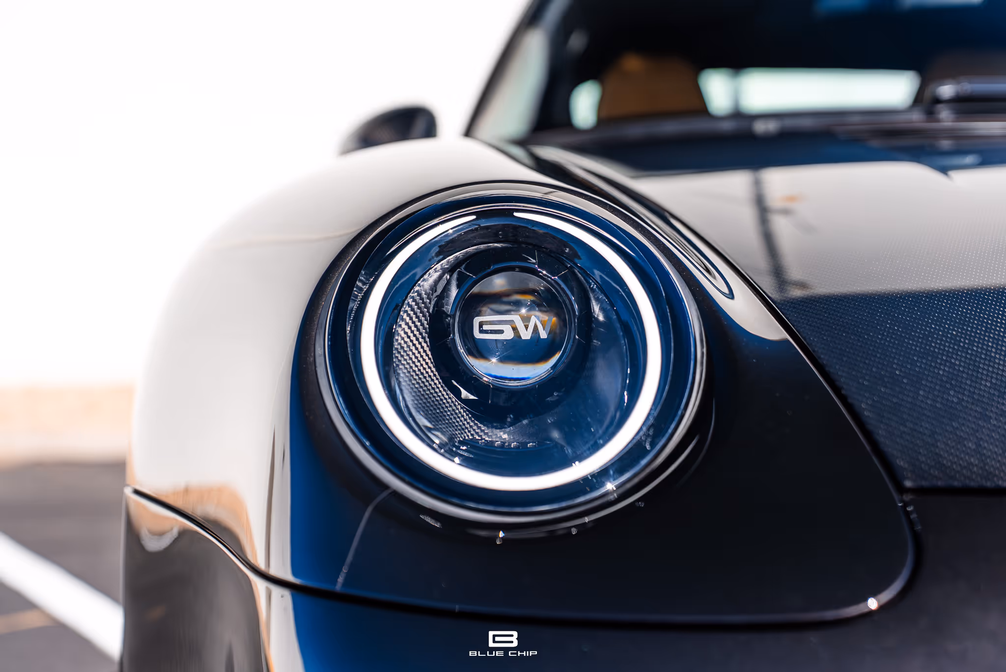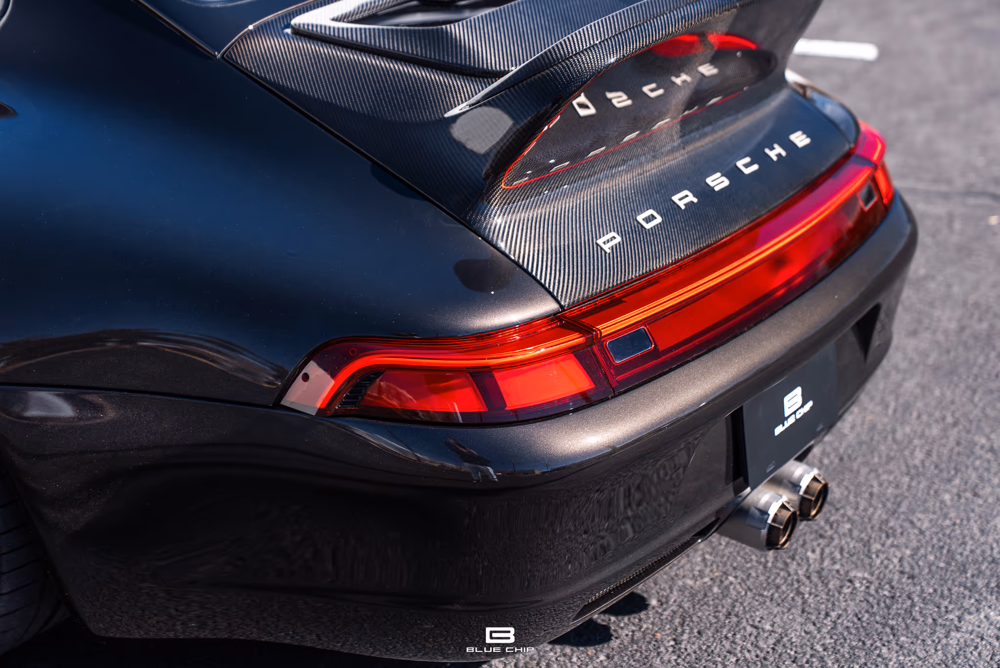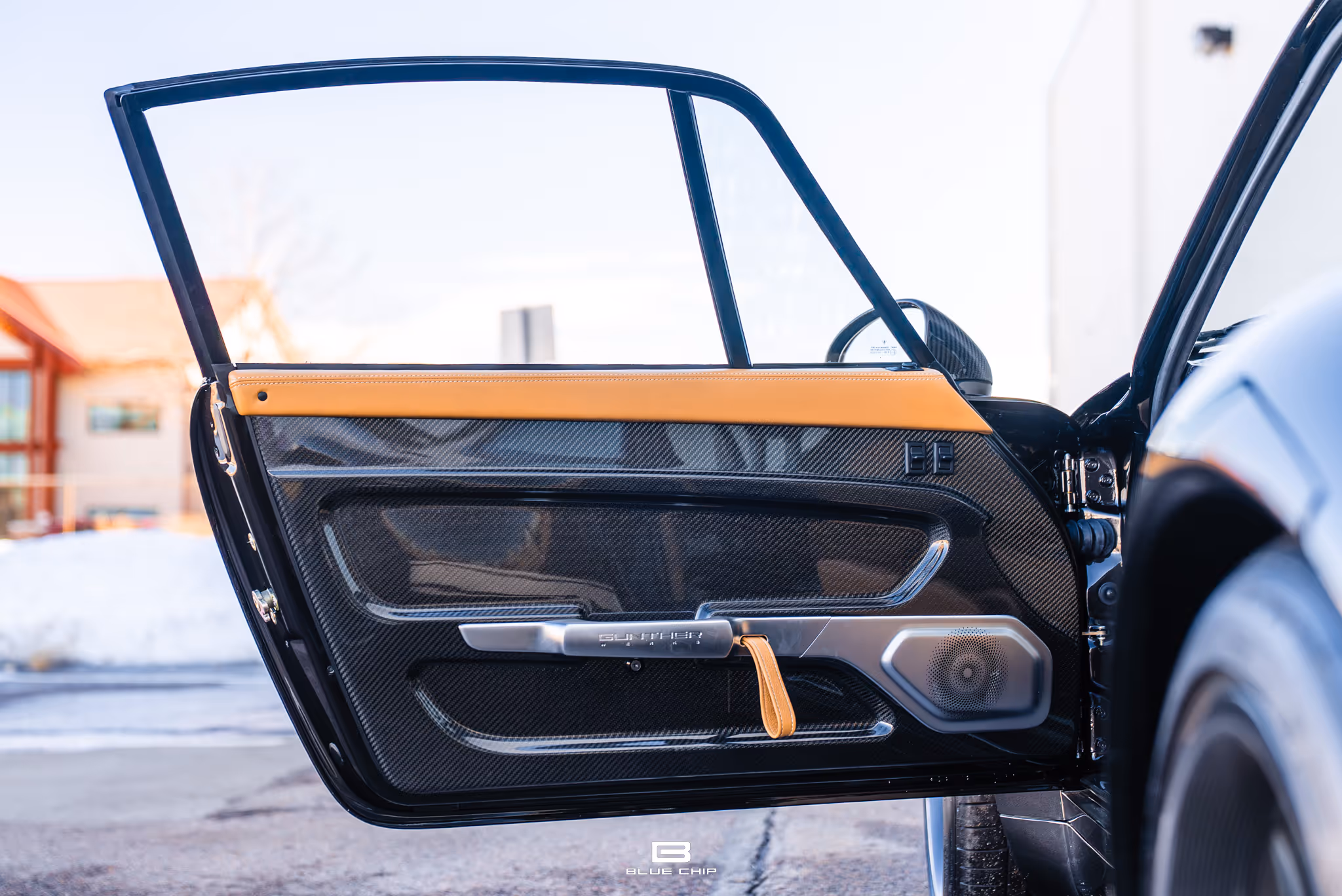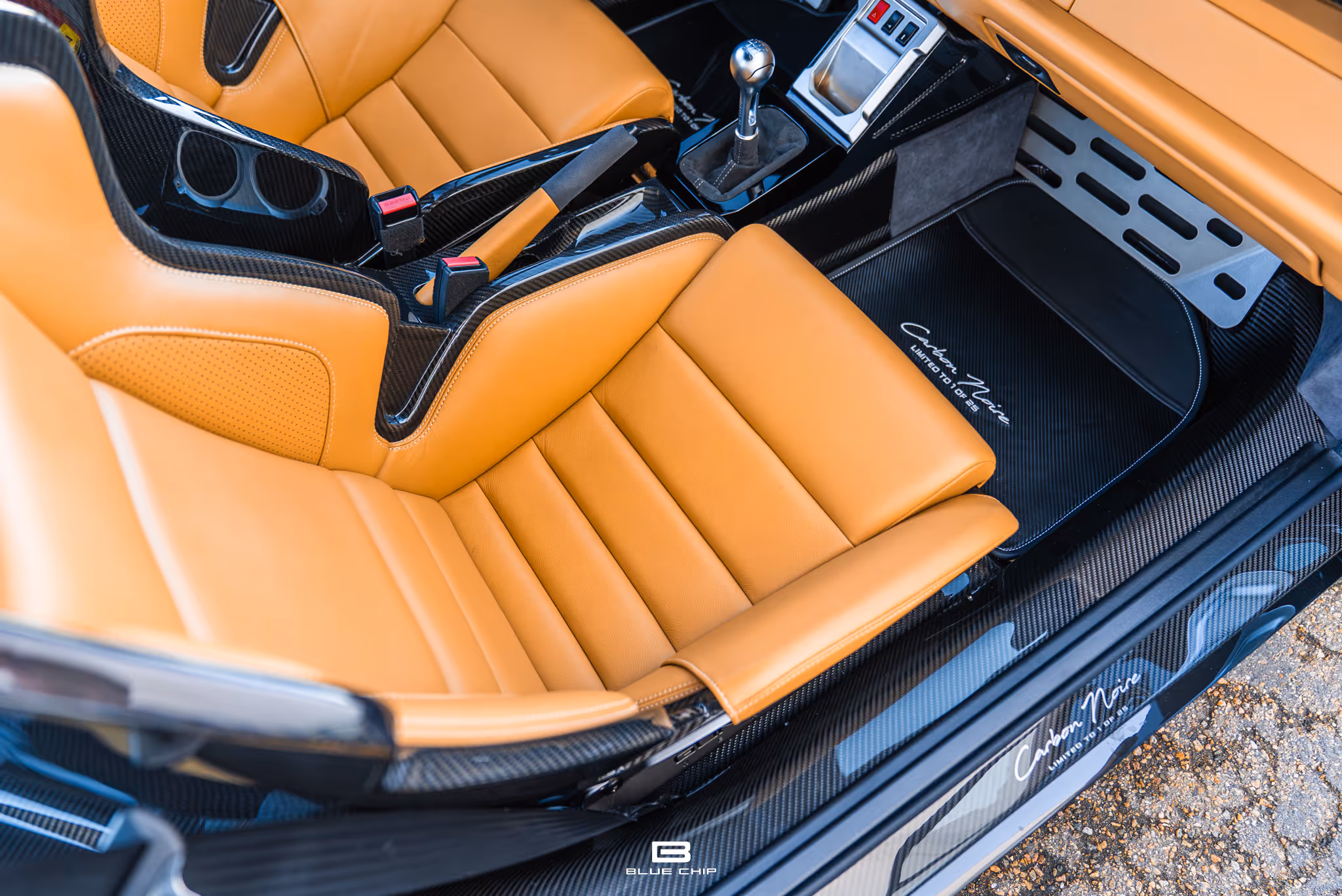 This 1997 Porsche 911 993 has been remastered by Gunther Werks in Huntington Beach, California. 80% of the vehicle is now completely bespoke, while the remaining 20% has been replaced with brand new Porsche equipment. The exterior body panels along with many of the internals have been replaced with copious amounts of carbon fiber, and Gunther Werks has flawlessly woven carbon fiber into the chassis. The originally 3.6-liter flat-six was completely stripped down and rebuilt as a 4.0 liter by Rothsport Road and Race in Sherwood, Oregon, now producing over 400 horsepower and more than 300 pound-feet of torque. The Remastered engine features an extensive list of forged internals and race-spec equipment including a two-stage MoTec engine management system, individual throttle bodies, and custom intake design based on the intake plenum of a 996-series Porsche 911 GT3. The Getrag G50 six-speed has been extensively enhanced with stronger internals, a lightweight flywheel, and 997.2 GT3RS clutch. The engineering masterpiece presented for sale here is the one off "Carbon Noire Commission." It's exterior is finished in a blend of exposed carbon fiber and bespoke gold flake black metallic paint. Inside, cognac aeronautical leather is mixed with exposed carbon fiber throughout. Gunther Werks designed LED headlights and LED rear light bridge were fitted, and rear seats have also been deleted. The Carbon Noire commission has also received over $200,000 in upgrades since it's last sale, including new brakes, rear wing, and lightweight wheels. It now displays only 492 miles from new. One of just 25 examples built, this presents a unique opportunity to acquire one of the finest bespoke 993s in existence.