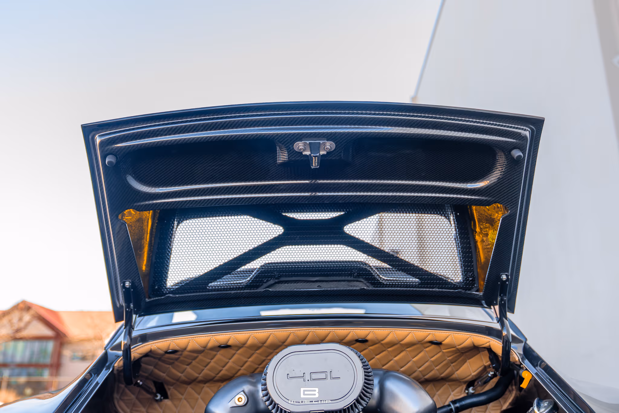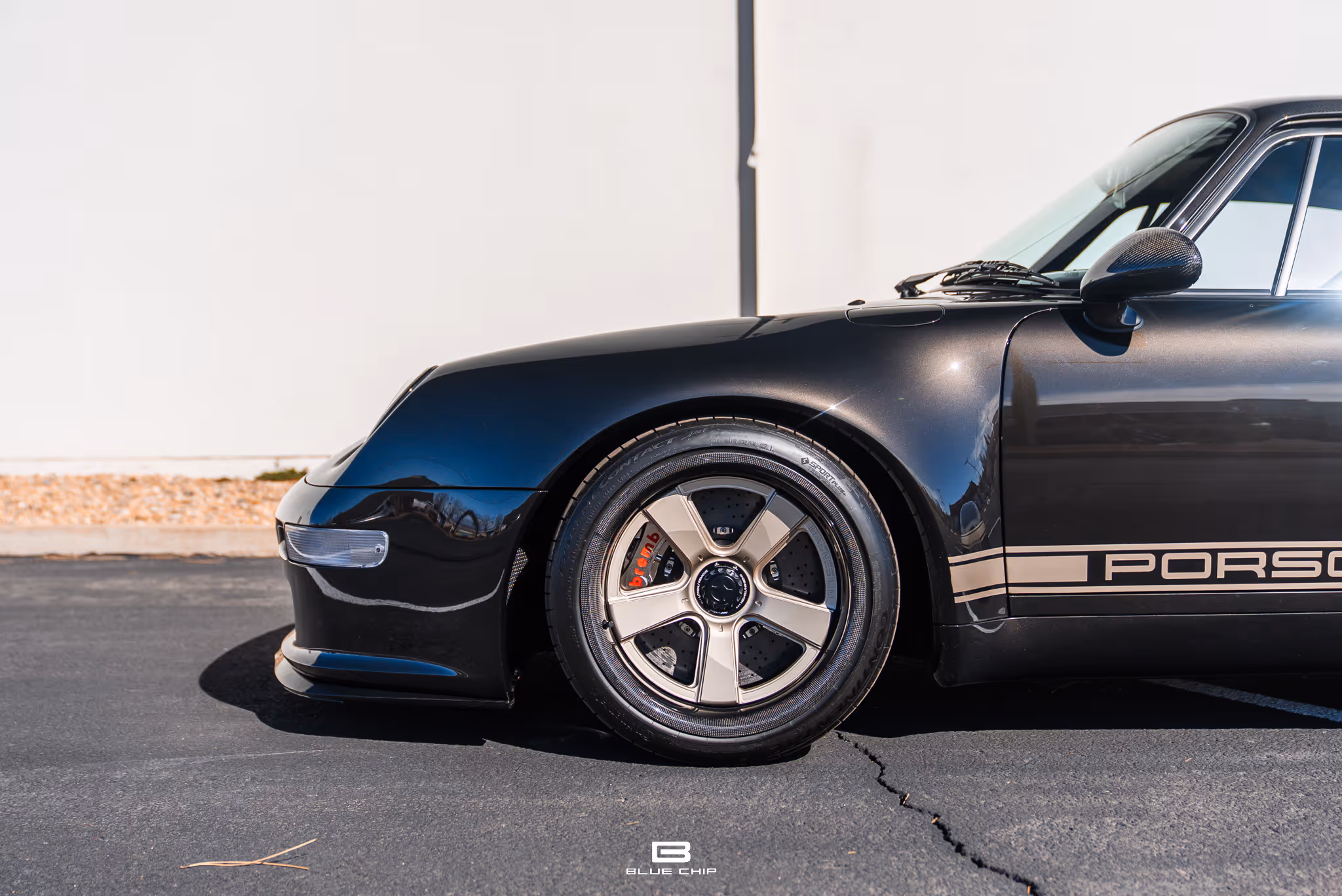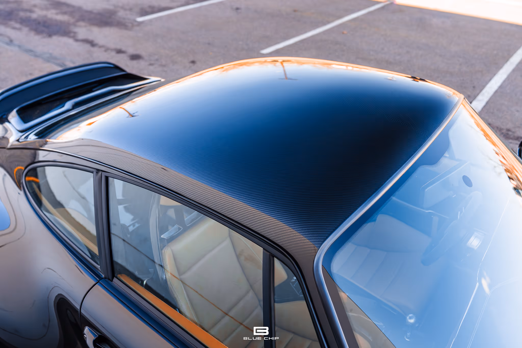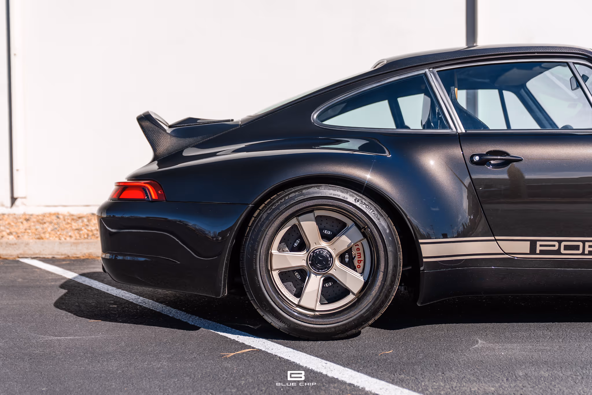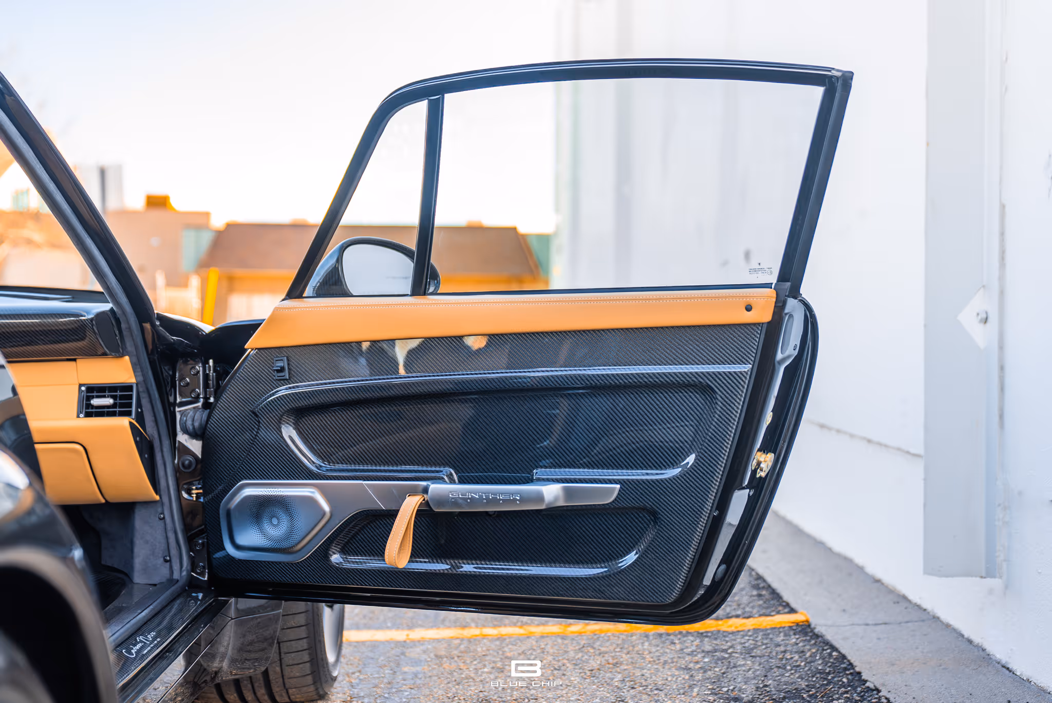 This 1997 Porsche 911 993 has been remastered by Gunther Werks in Huntington Beach, California. 80% of the vehicle is now completely bespoke, while the remaining 20% has been replaced with brand new Porsche equipment. The exterior body panels along with many of the internals have been replaced with copious amounts of carbon fiber, and Gunther Werks has flawlessly woven carbon fiber into the chassis. The originally 3.6-liter flat-six was completely stripped down and rebuilt as a 4.0 liter by Rothsport Road and Race in Sherwood, Oregon, now producing over 400 horsepower and more than 300 pound-feet of torque. The Remastered engine features an extensive list of forged internals and race-spec equipment including a two-stage MoTec engine management system, individual throttle bodies, and custom intake design based on the intake plenum of a 996-series Porsche 911 GT3. The Getrag G50 six-speed has been extensively enhanced with stronger internals, a lightweight flywheel, and 997.2 GT3RS clutch. The engineering masterpiece presented for sale here is the one off "Carbon Noire Commission." It's exterior is finished in a blend of exposed carbon fiber and bespoke gold flake black metallic paint. Inside, cognac aeronautical leather is mixed with exposed carbon fiber throughout. Gunther Werks designed LED headlights and LED rear light bridge were fitted, and rear seats have also been deleted. The Carbon Noire commission has also received over $200,000 in upgrades since it's last sale, including new brakes, rear wing, and lightweight wheels. It now displays only 492 miles from new. One of just 25 examples built, this presents a unique opportunity to acquire one of the finest bespoke 993s in existence.