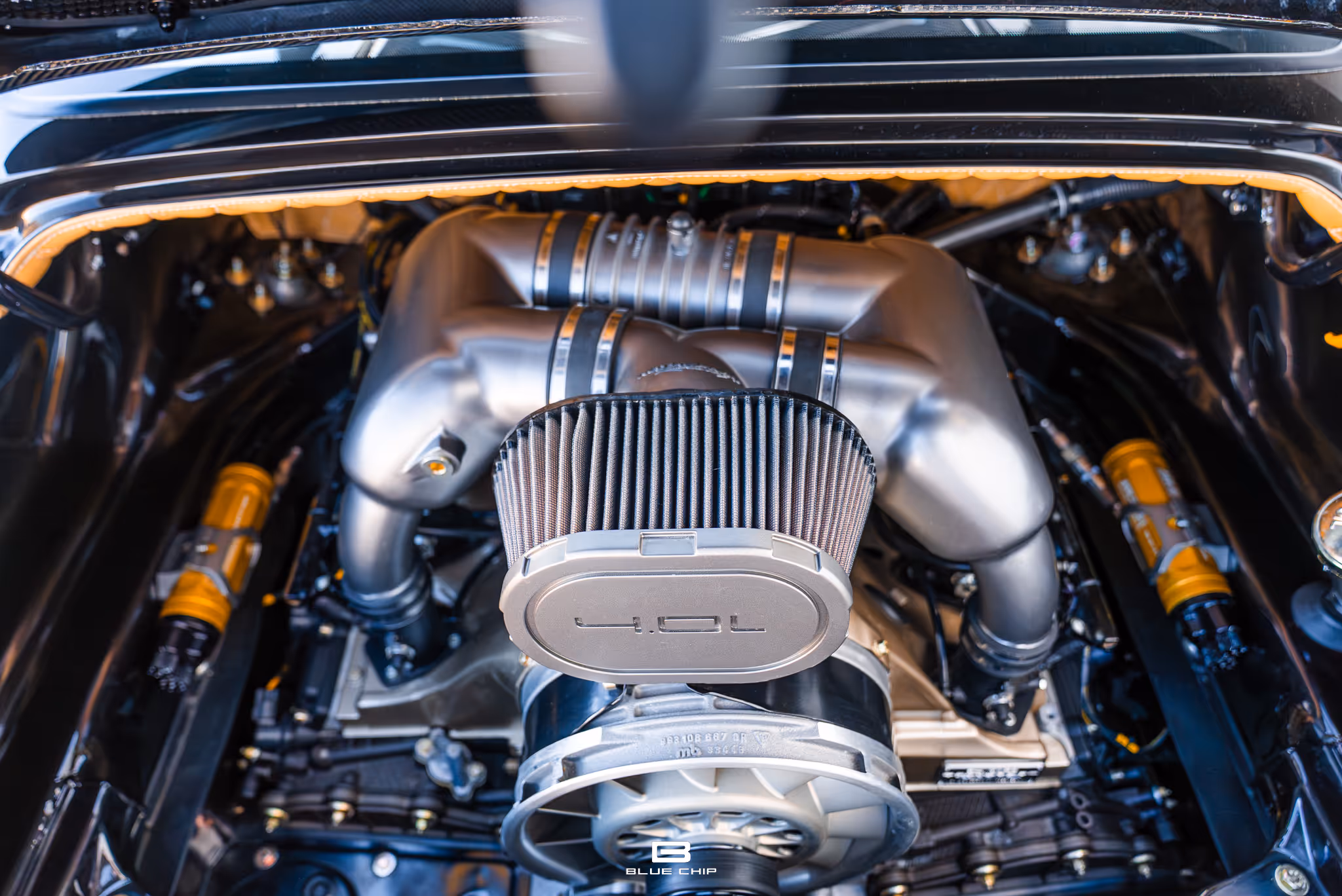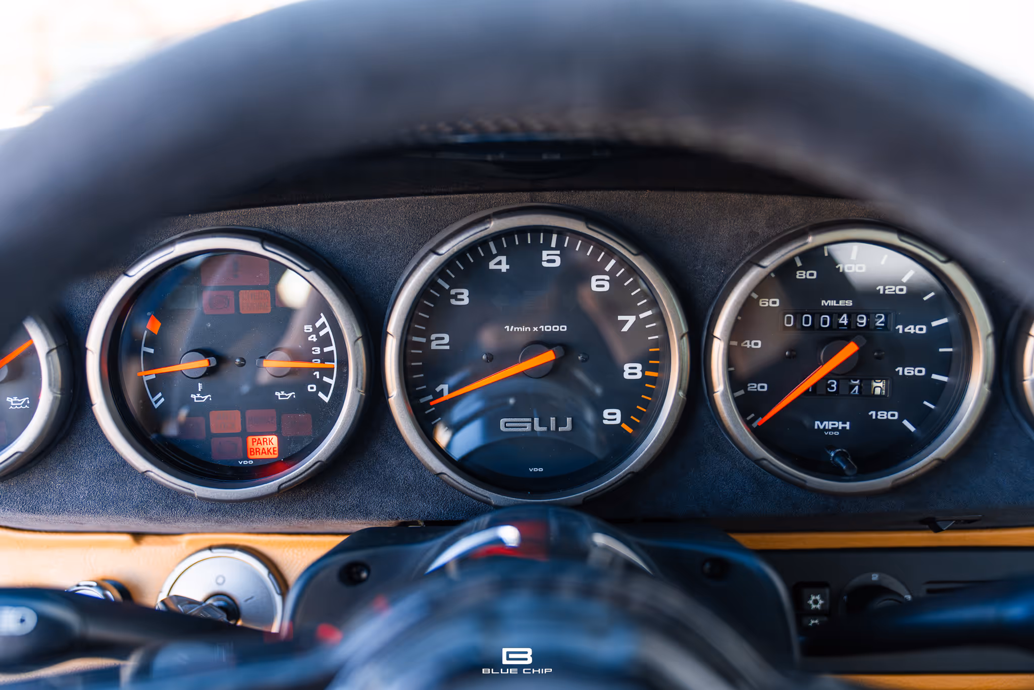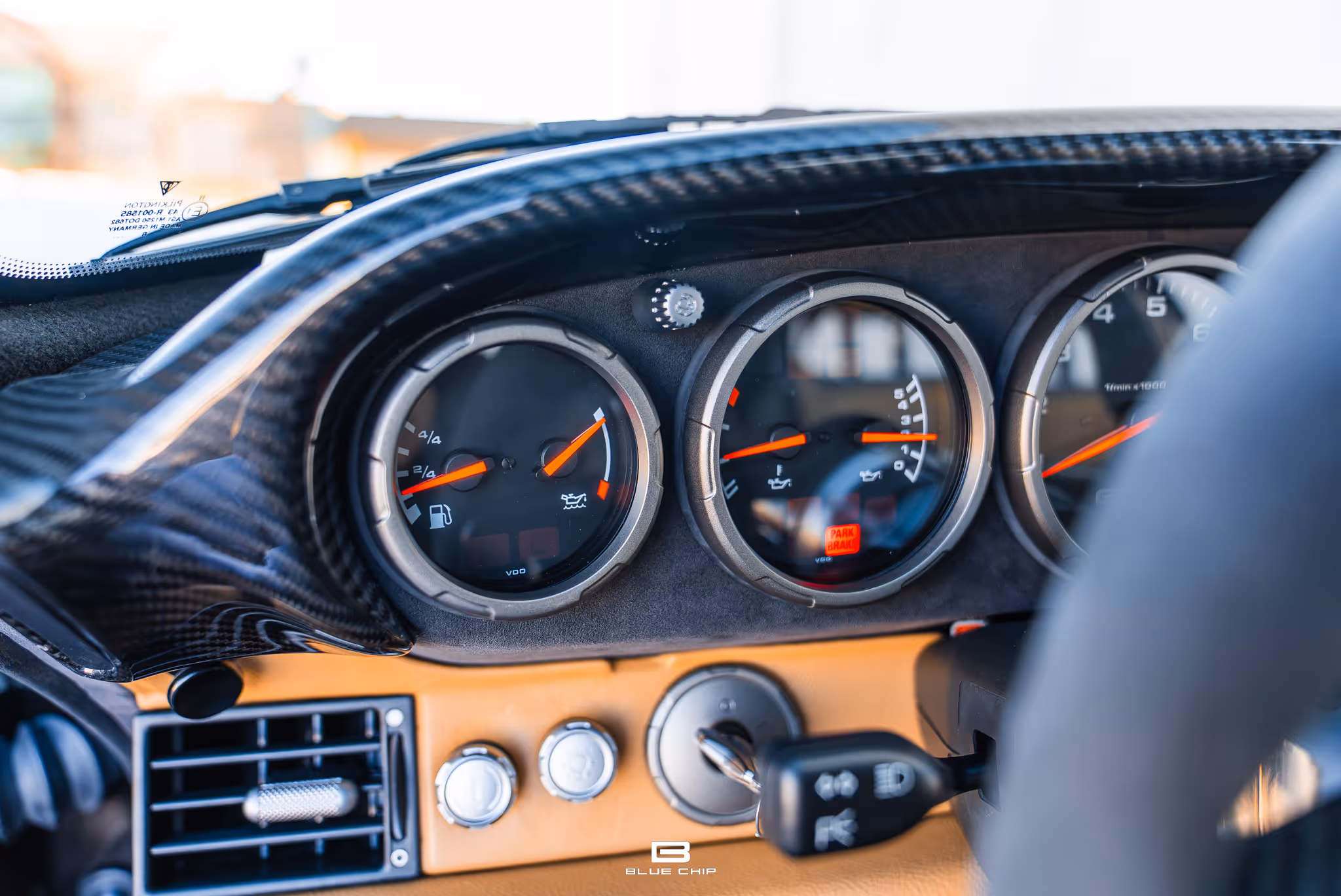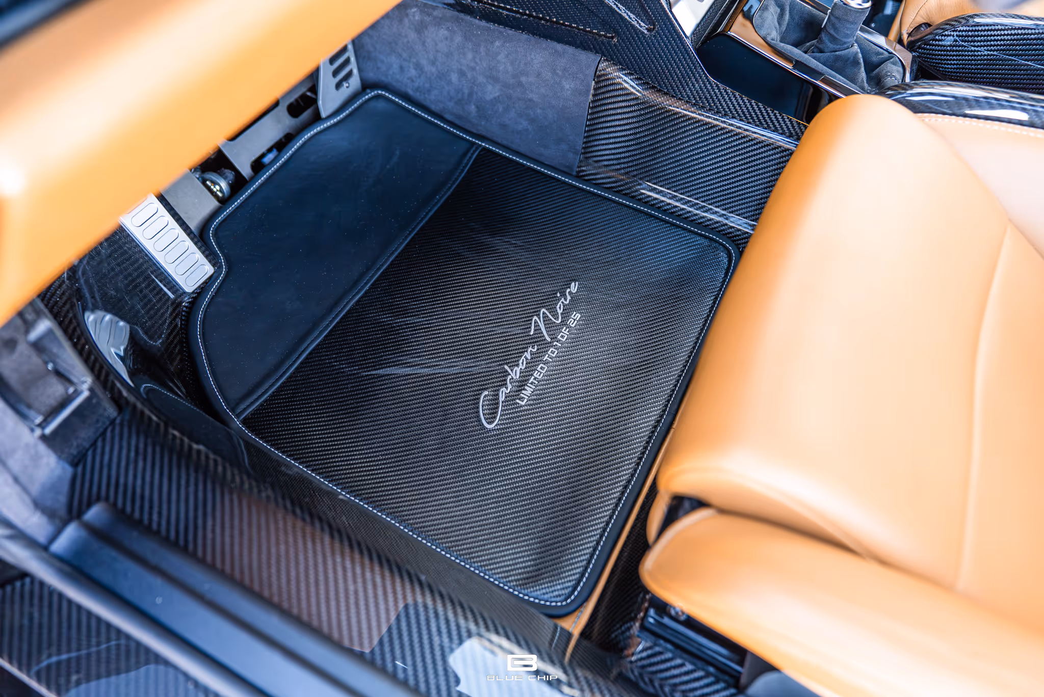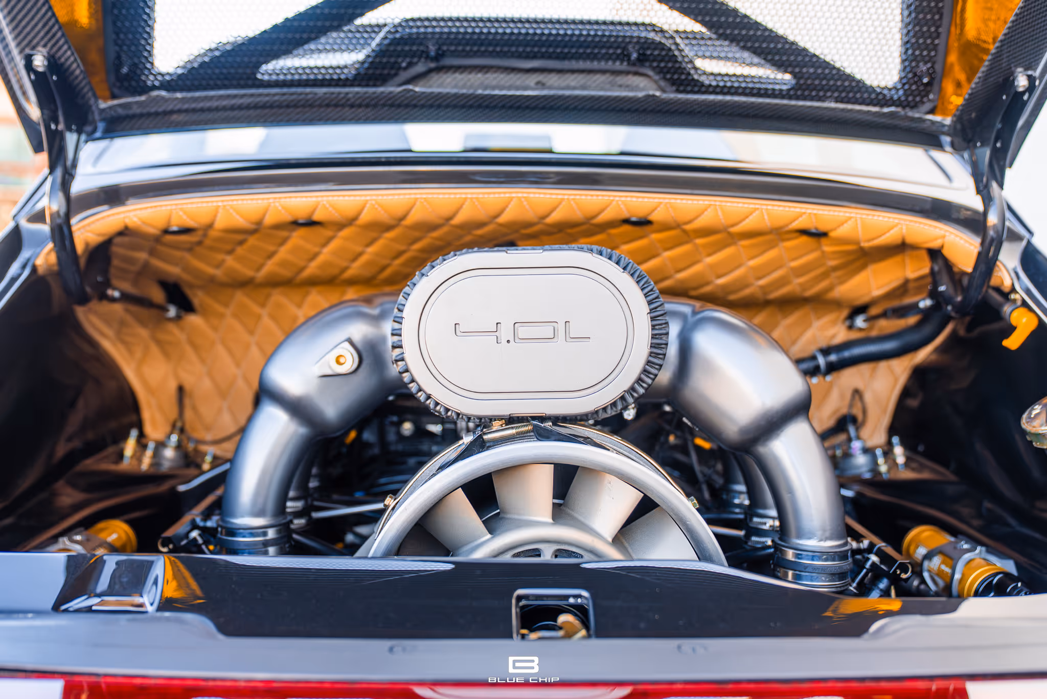 This 1997 Porsche 911 993 has been remastered by Gunther Werks in Huntington Beach, California. 80% of the vehicle is now completely bespoke, while the remaining 20% has been replaced with brand new Porsche equipment. The exterior body panels along with many of the internals have been replaced with copious amounts of carbon fiber, and Gunther Werks has flawlessly woven carbon fiber into the chassis. The originally 3.6-liter flat-six was completely stripped down and rebuilt as a 4.0 liter by Rothsport Road and Race in Sherwood, Oregon, now producing over 400 horsepower and more than 300 pound-feet of torque. The Remastered engine features an extensive list of forged internals and race-spec equipment including a two-stage MoTec engine management system, individual throttle bodies, and custom intake design based on the intake plenum of a 996-series Porsche 911 GT3. The Getrag G50 six-speed has been extensively enhanced with stronger internals, a lightweight flywheel, and 997.2 GT3RS clutch. The engineering masterpiece presented for sale here is the one off "Carbon Noire Commission." It's exterior is finished in a blend of exposed carbon fiber and bespoke gold flake black metallic paint. Inside, cognac aeronautical leather is mixed with exposed carbon fiber throughout. Gunther Werks designed LED headlights and LED rear light bridge were fitted, and rear seats have also been deleted. The Carbon Noire commission has also received over $200,000 in upgrades since it's last sale, including new brakes, rear wing, and lightweight wheels. It now displays only 492 miles from new. One of just 25 examples built, this presents a unique opportunity to acquire one of the finest bespoke 993s in existence.