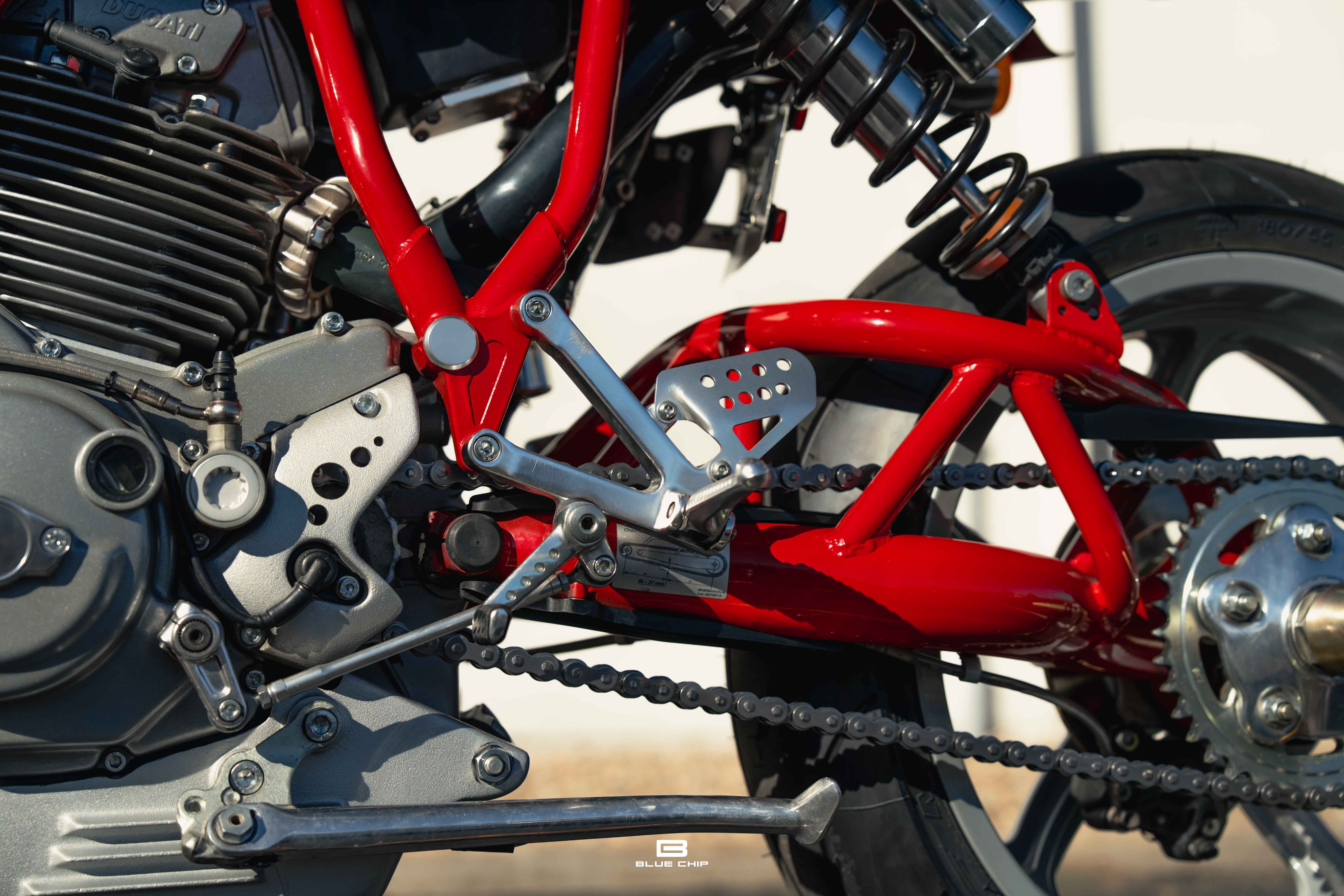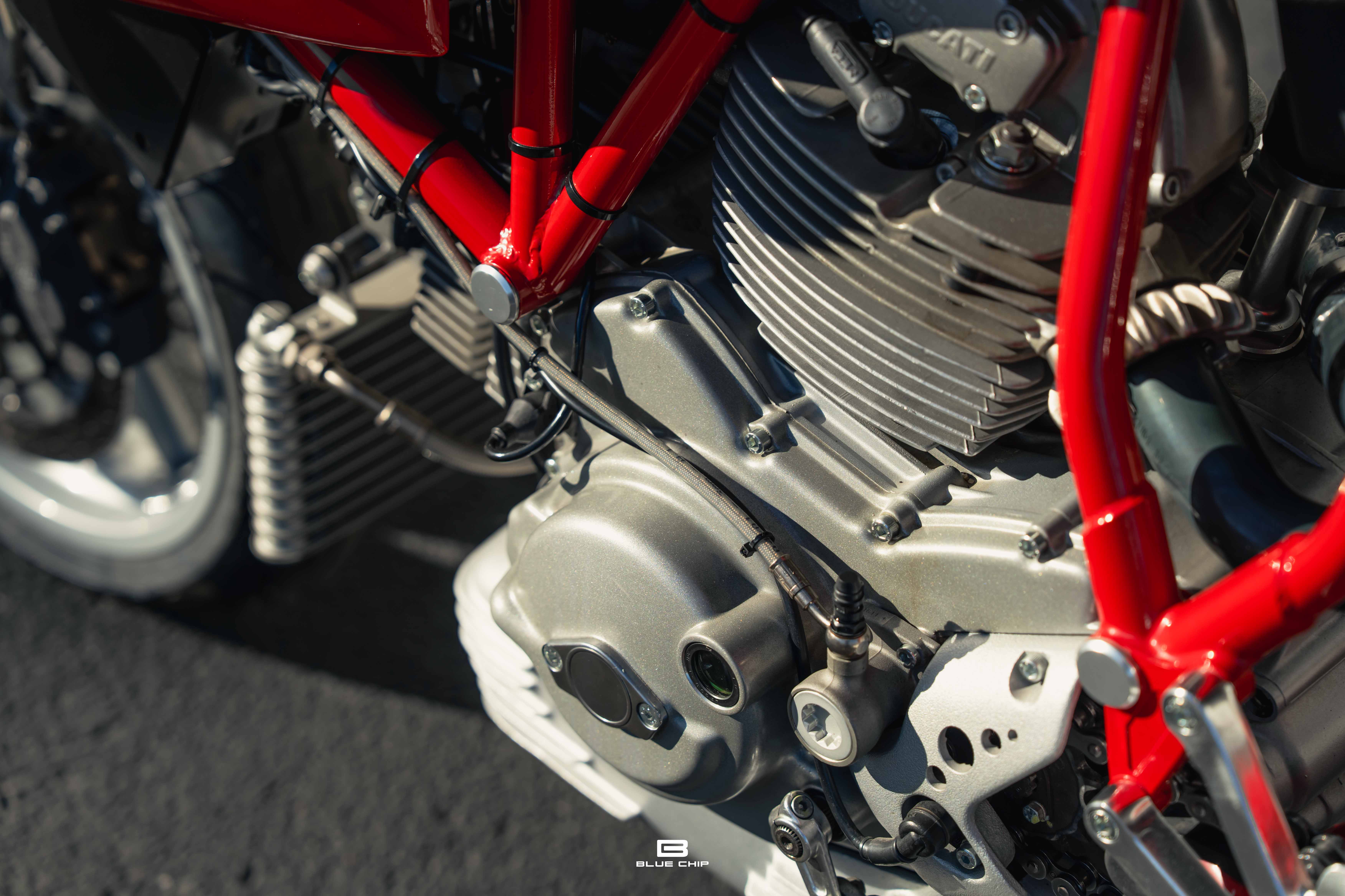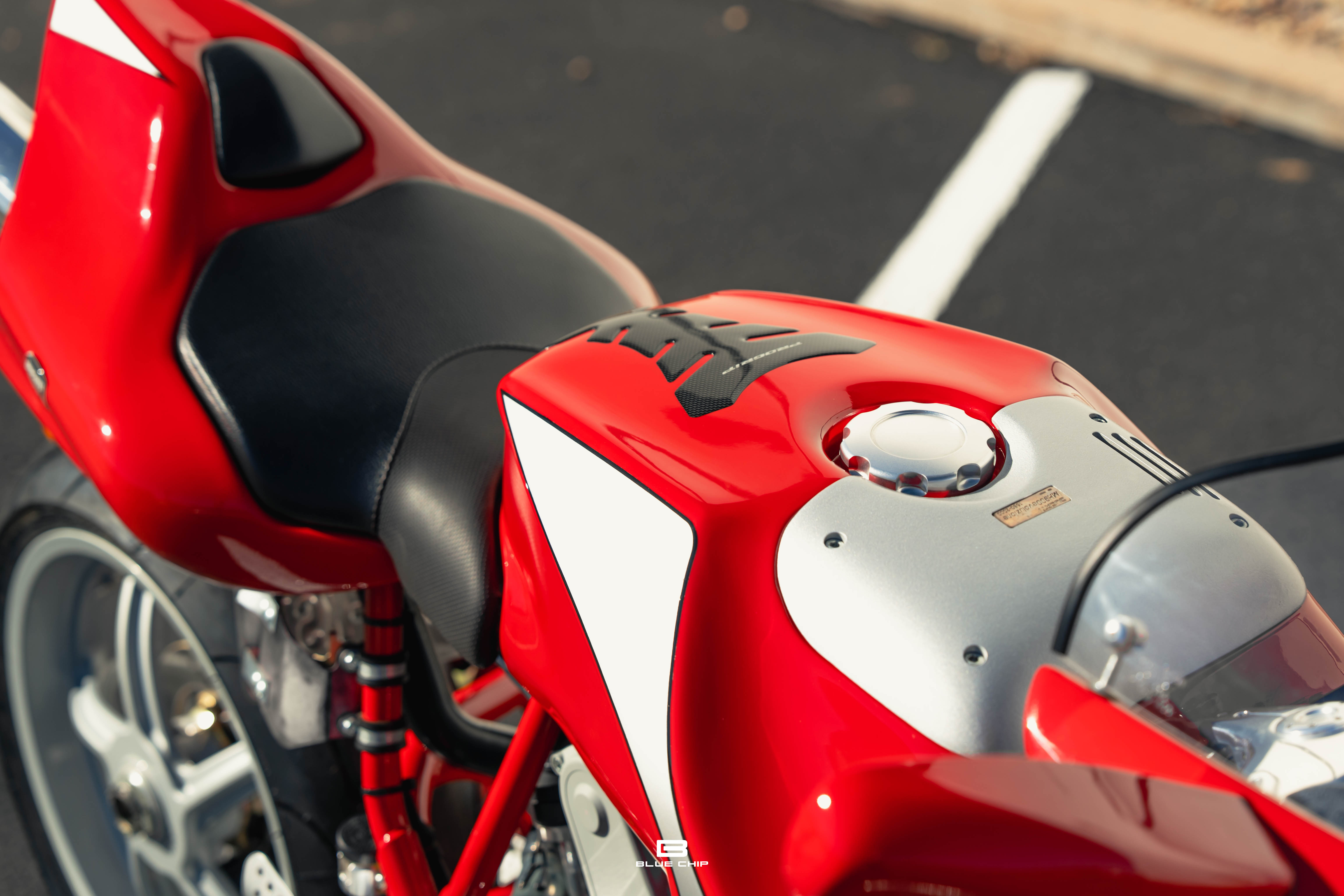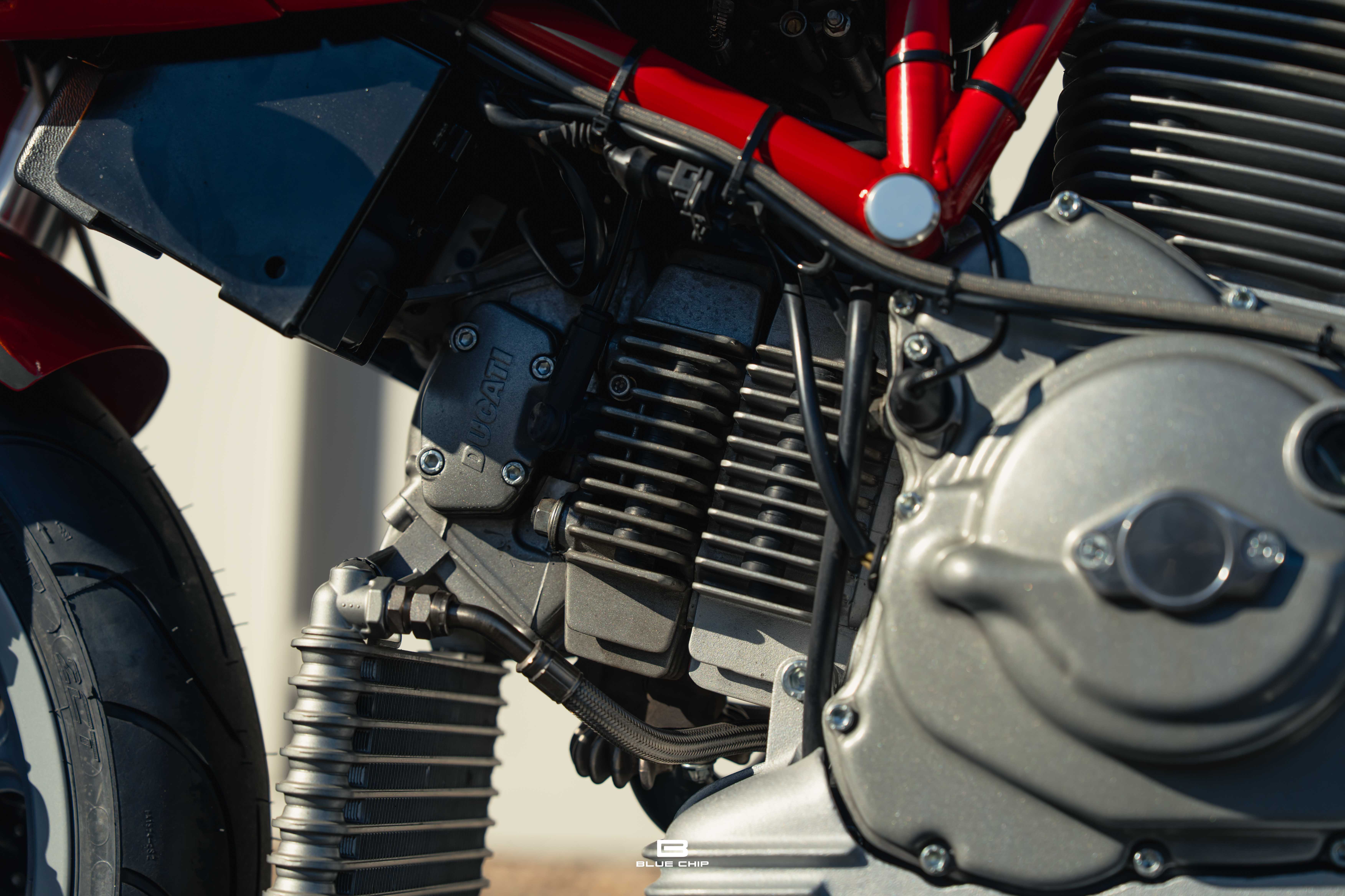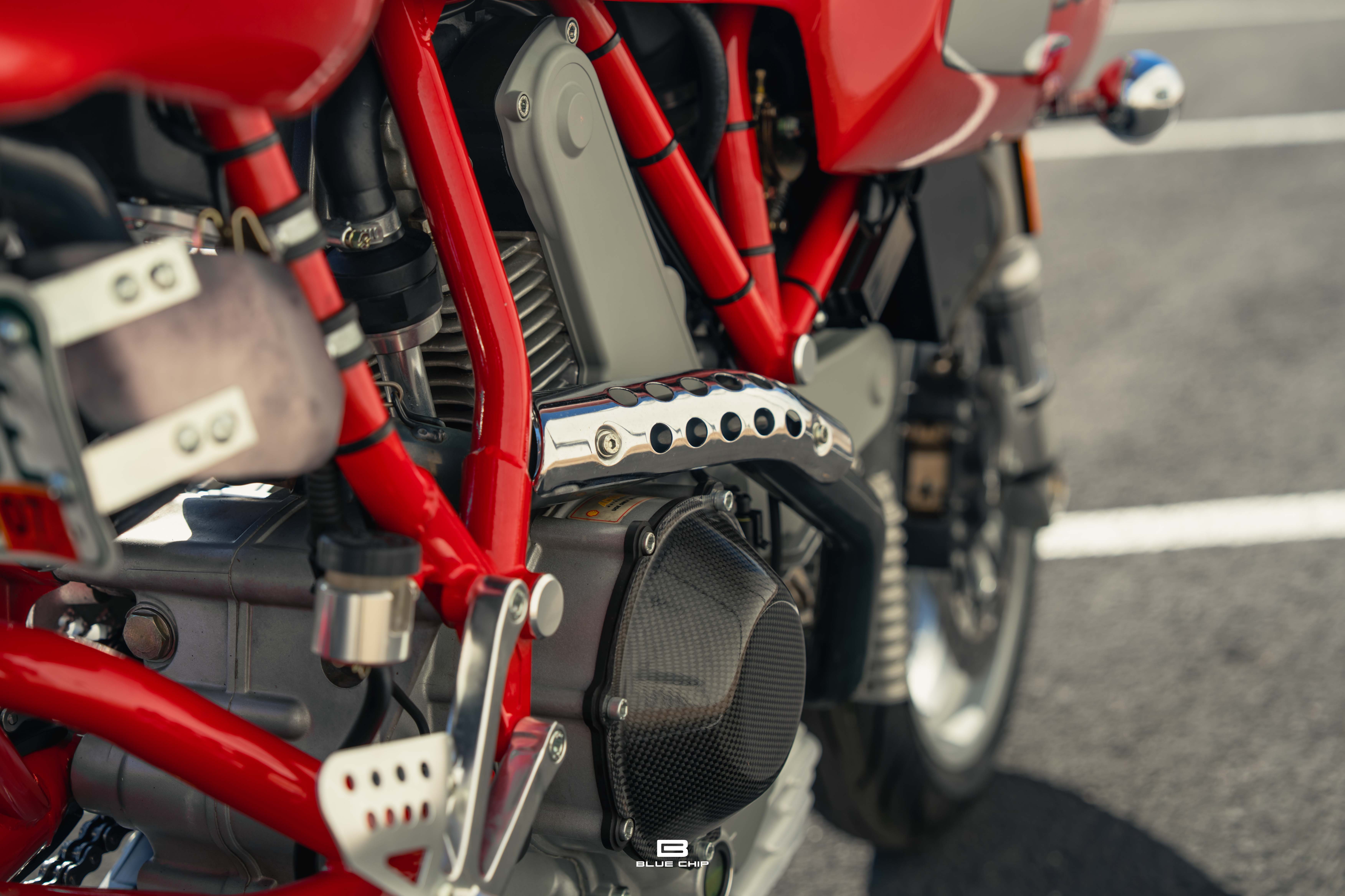 At its core, the 2001 Ducati MH900e had installed a 904cc air-cooled four-stroke V-twin engine that delivered 74 hp with a peak at 8,000 rpm and 76 Nm (56 lb-ft) of torque at 6,500 rpm. A six-speed manual gearbox and a final chain drive pushed the engine's power to the rear.