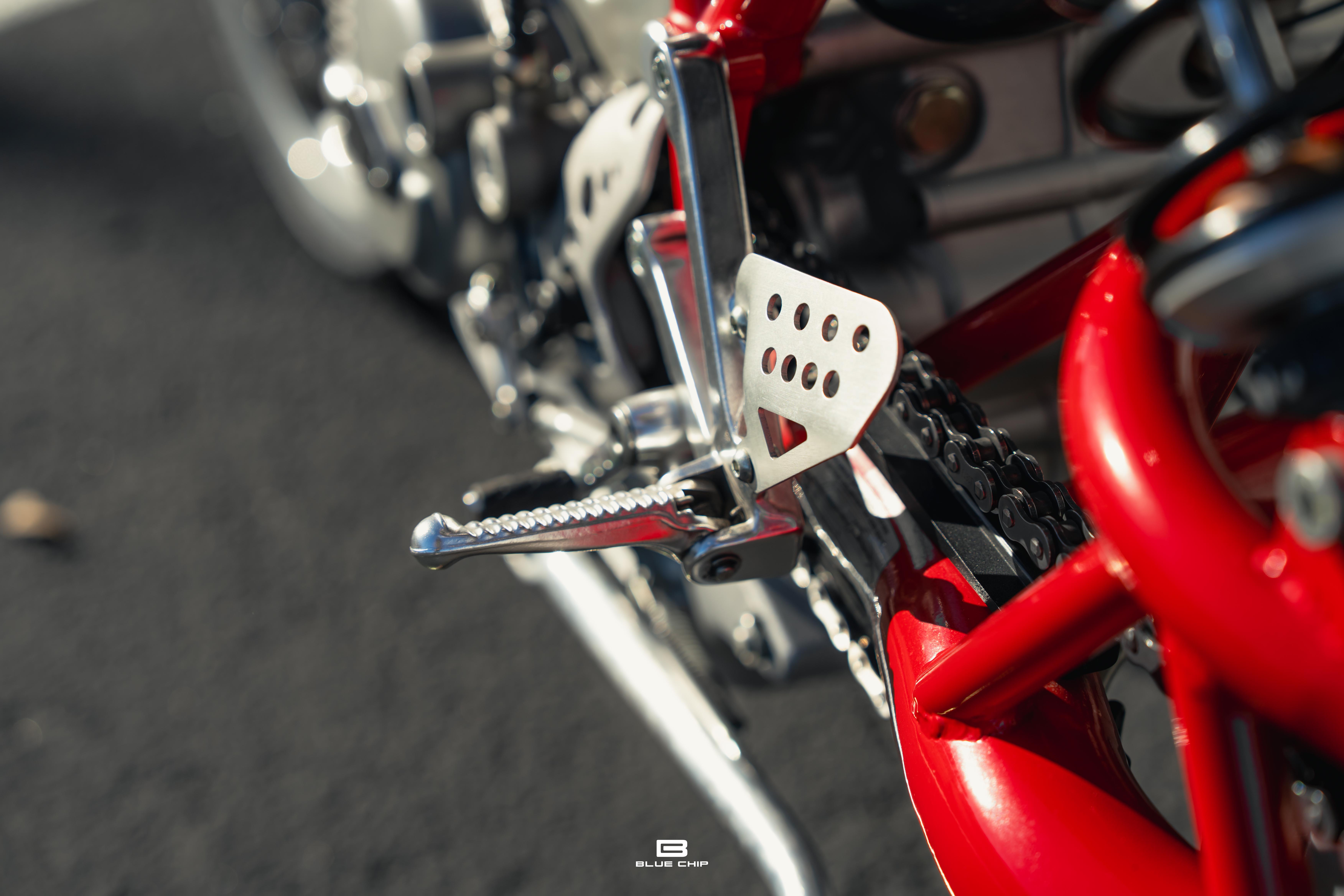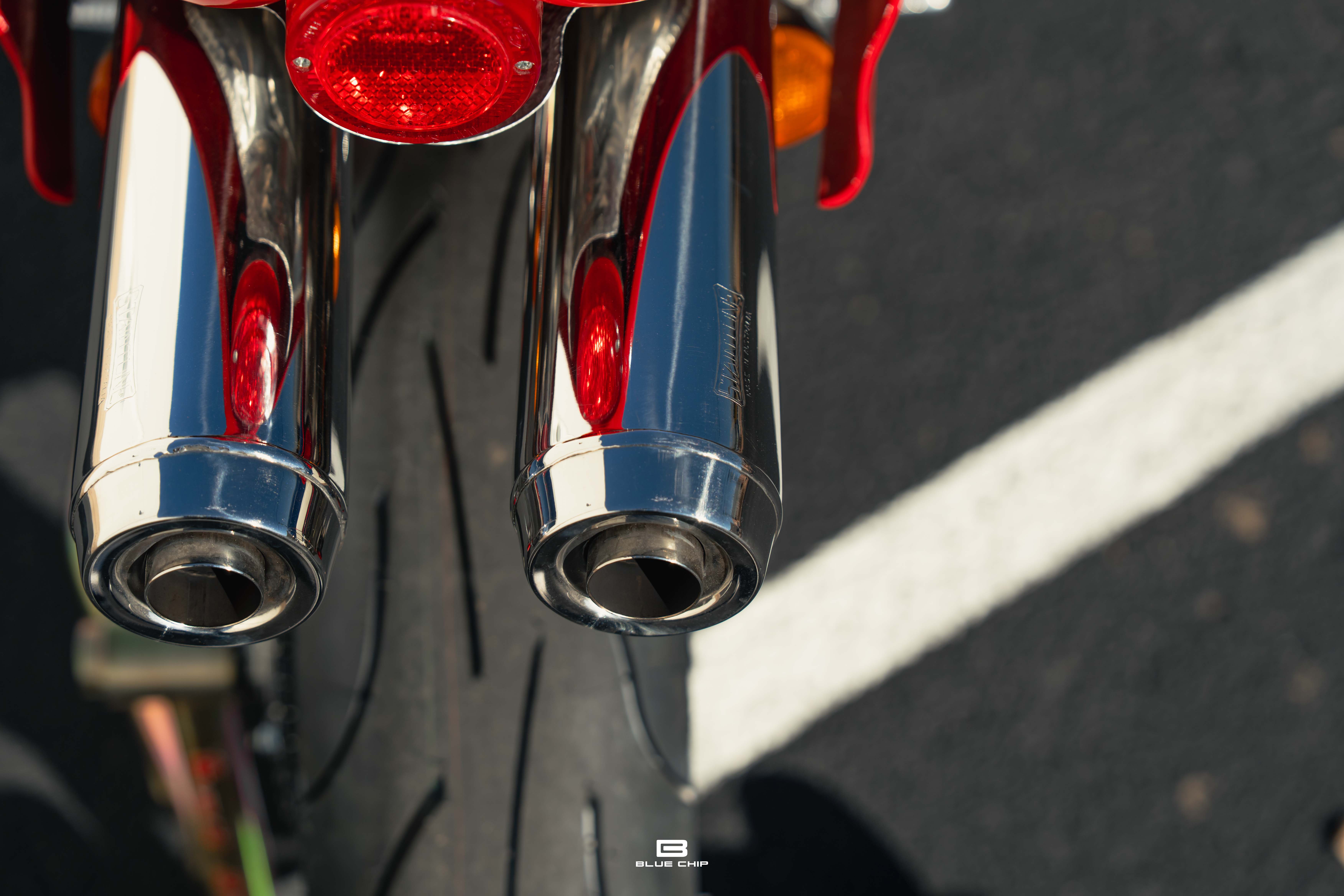 The braking system comprised two 320 mm semi-floating discs on the front, clamped by four-pot hydraulic calipers, and a 220 mm disc on the rear, clamped by a two-piston floating caliper.