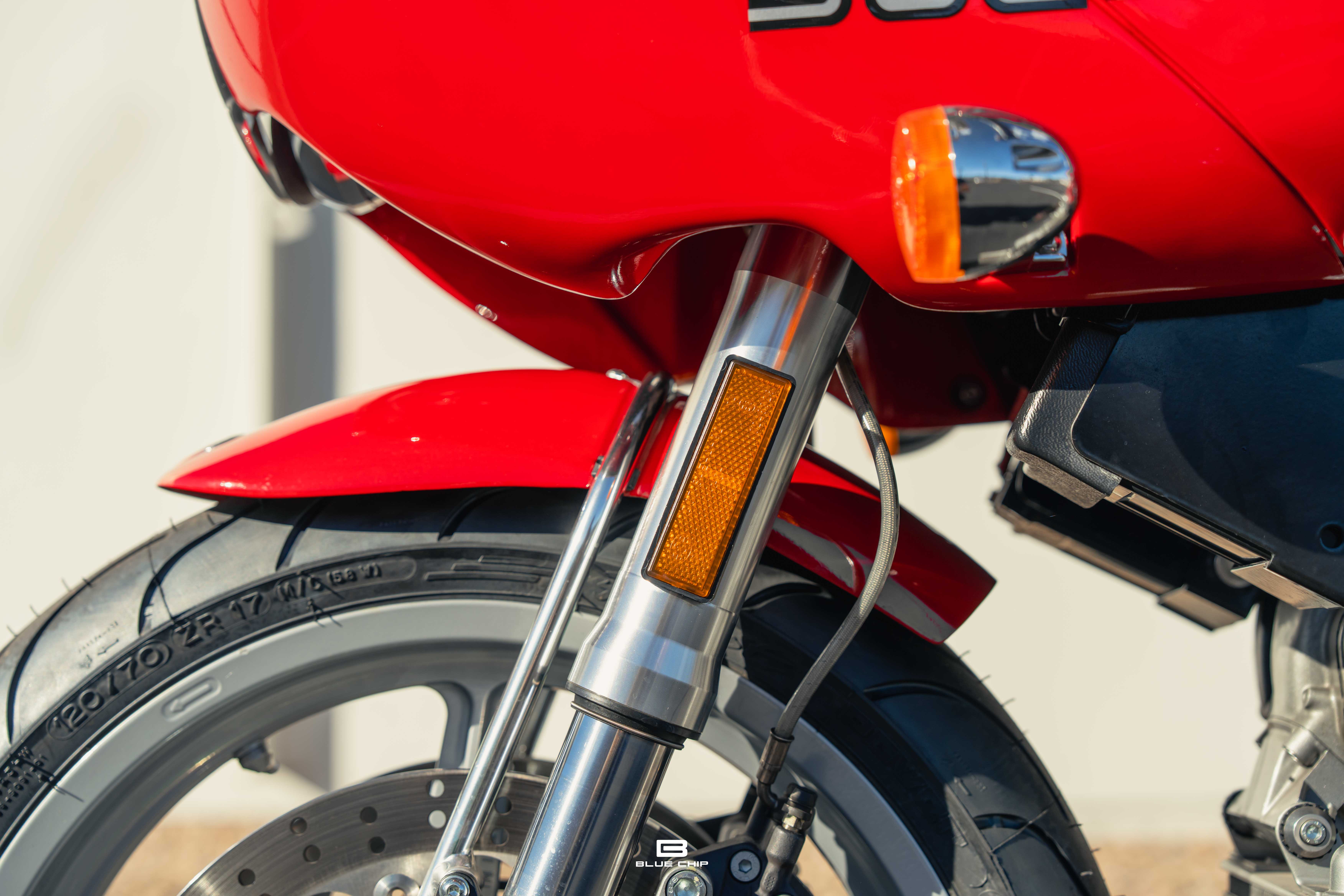 The motorcycle sat on a 43 mm inverted telescopic fork at the front and a fully adjustable Sachs shock at the rear coupled to an aluminum swingarm.