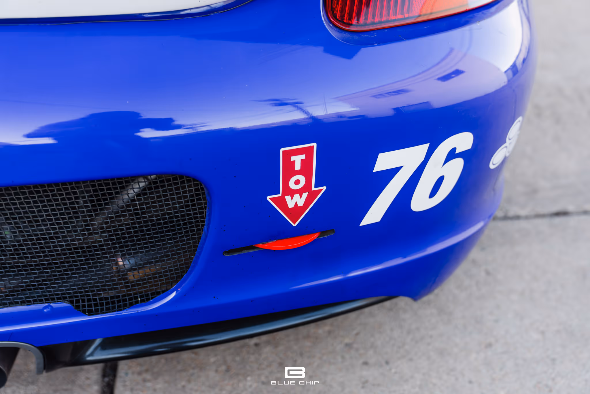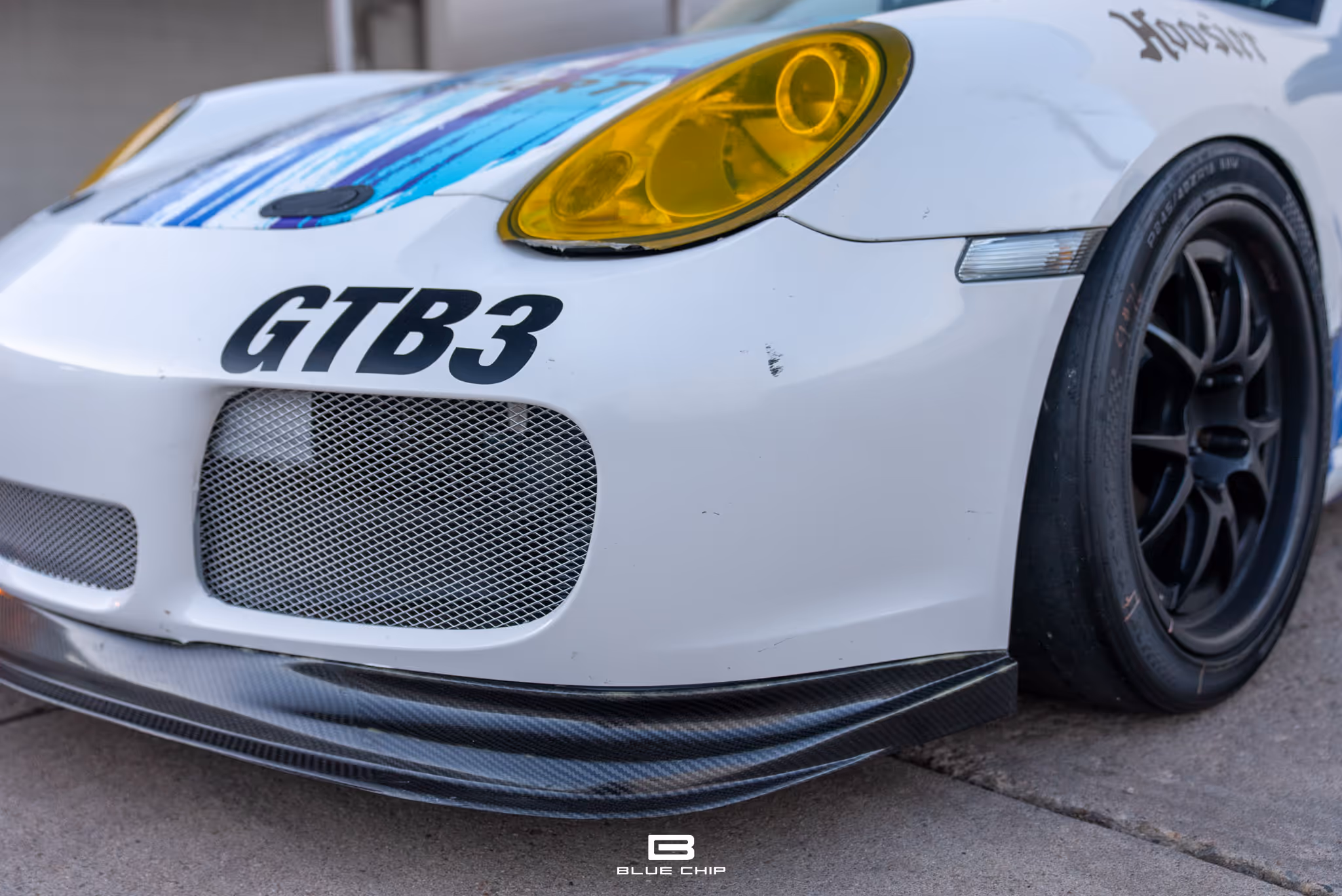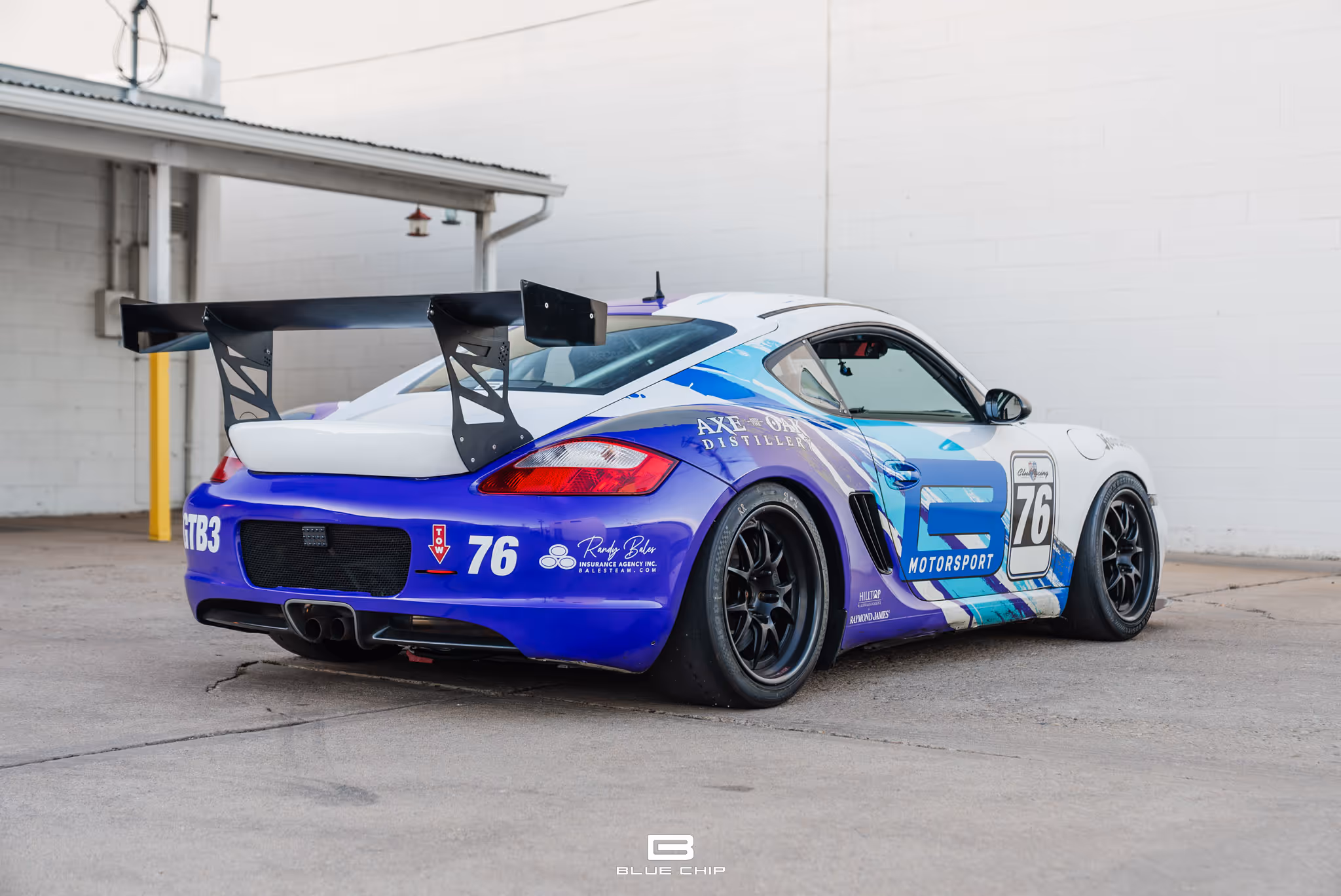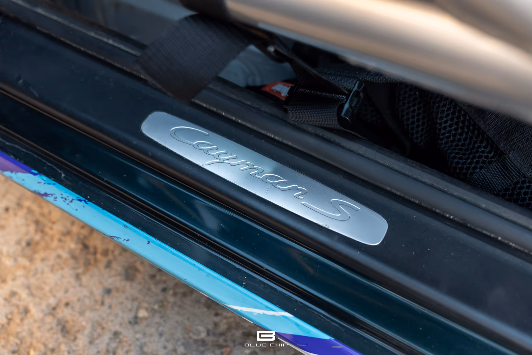 This 2007 Porsche Cayman S has been modified for competitive racing, reportedly configured for the GTB1 class of PCA Club Racing. It is powered by a replacement 3.4-liter flat-six engine, installed in August 2024, paired with a six-speed manual transaxle featuring a CAE short shifter.