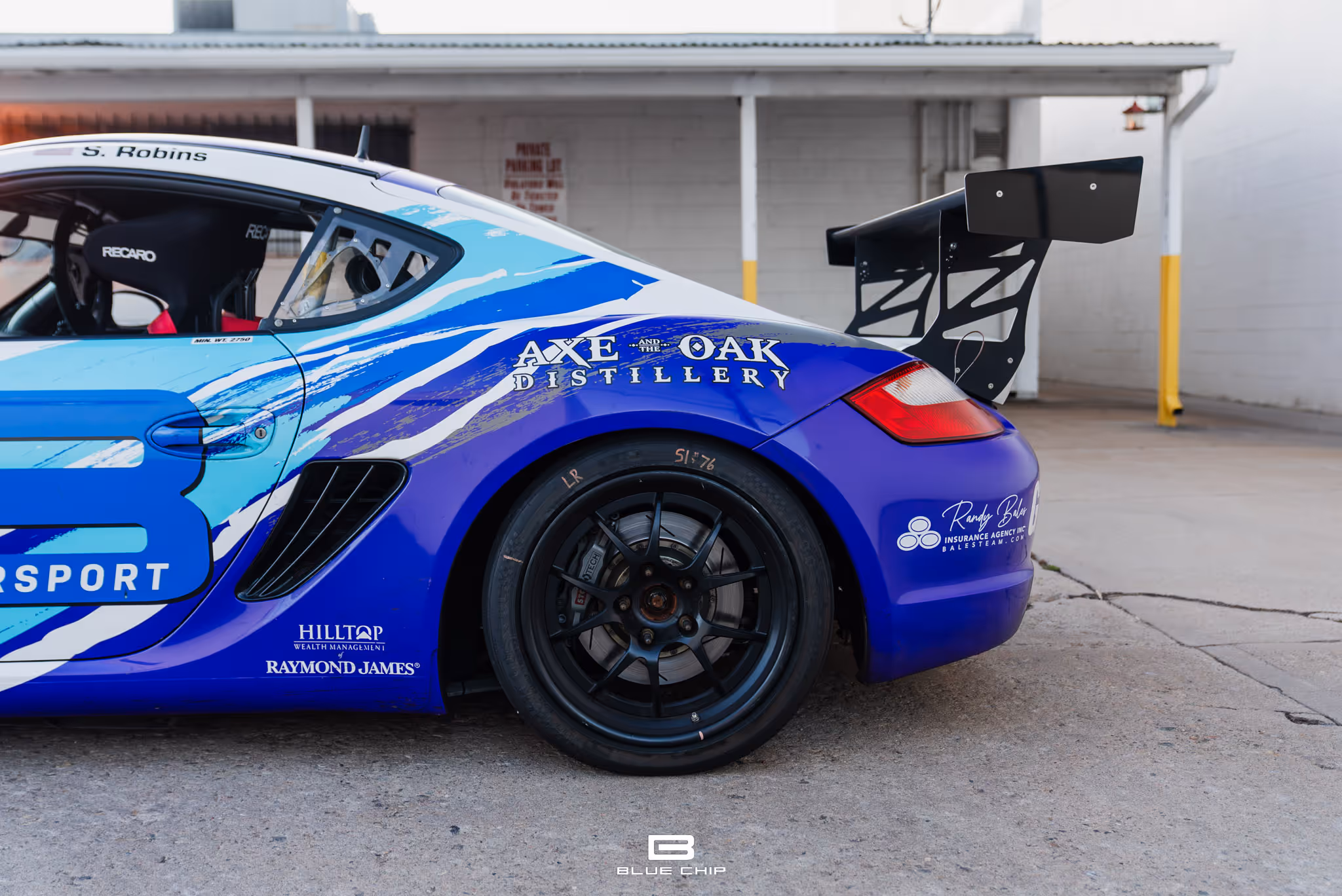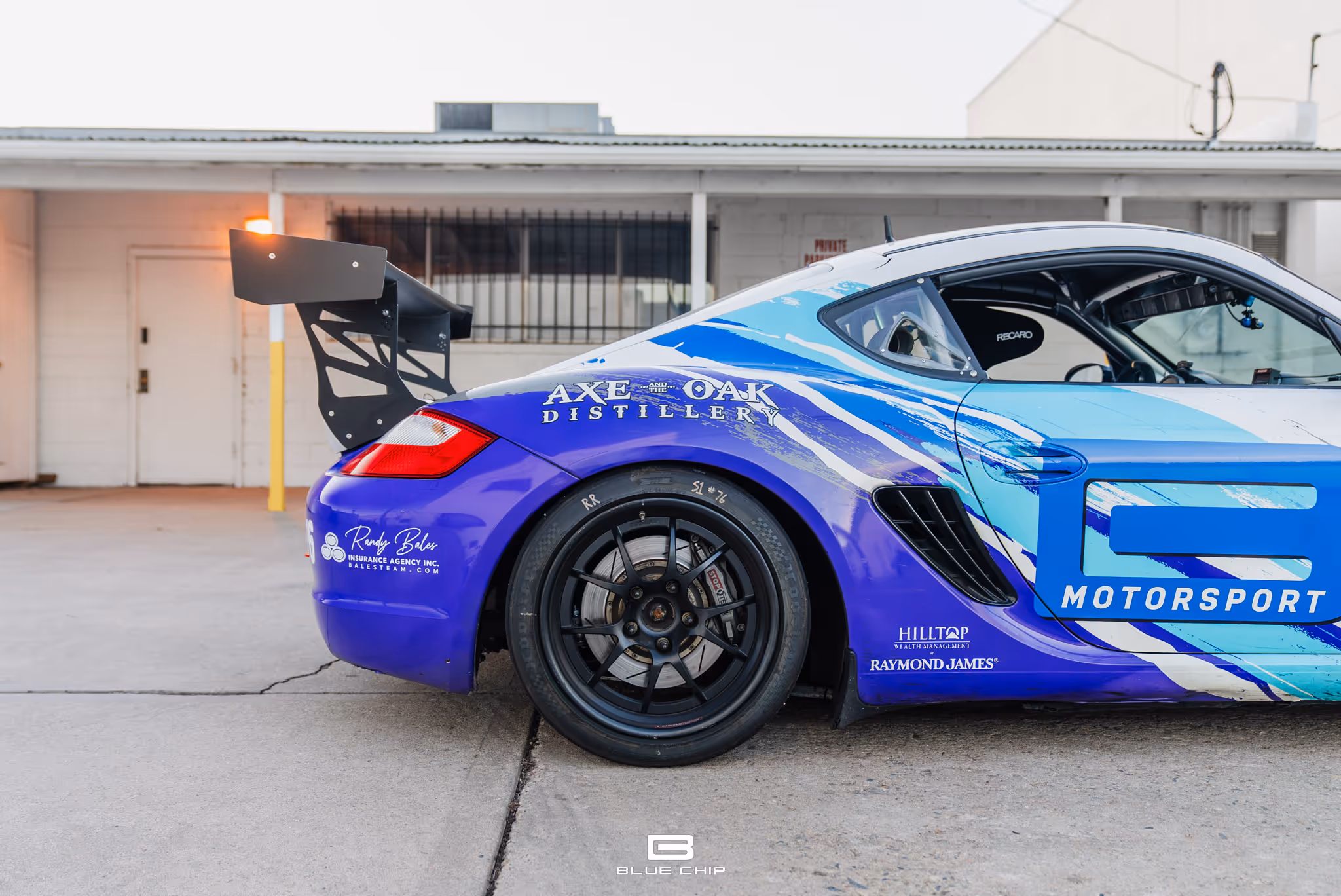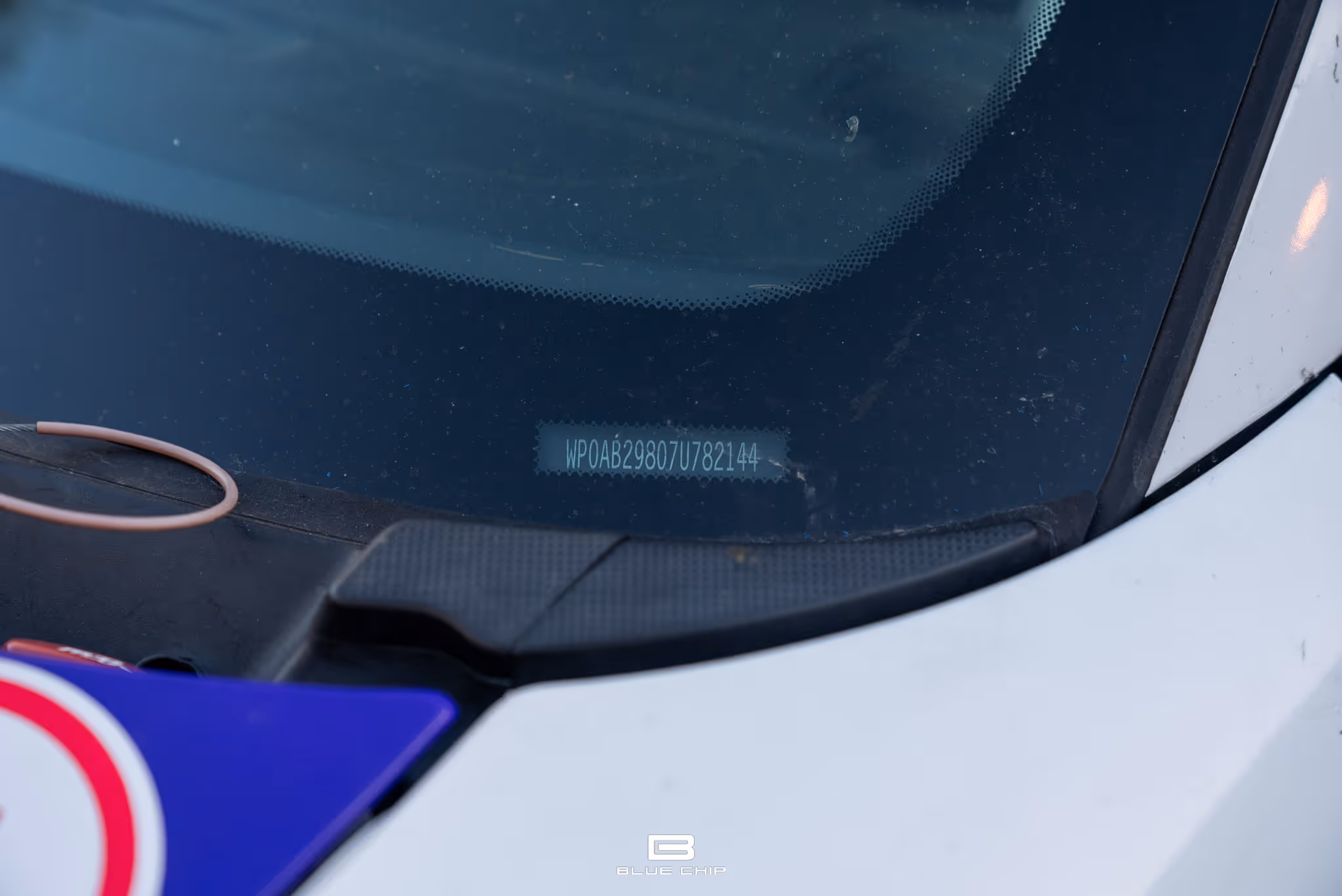 This 2007 Porsche Cayman S has been modified for competitive racing, reportedly configured for the GTB1 class of PCA Club Racing. It is powered by a replacement 3.4-liter flat-six engine, installed in August 2024, paired with a six-speed manual transaxle featuring a CAE short shifter.
