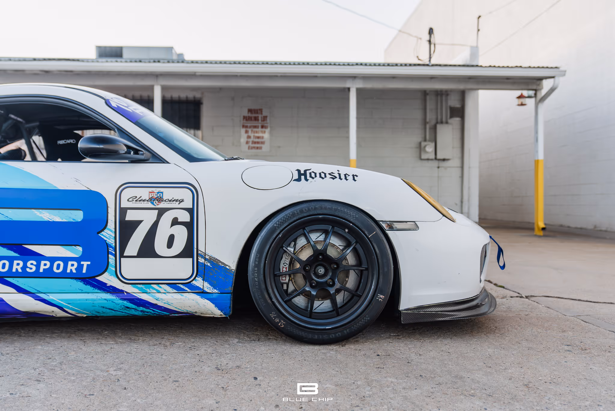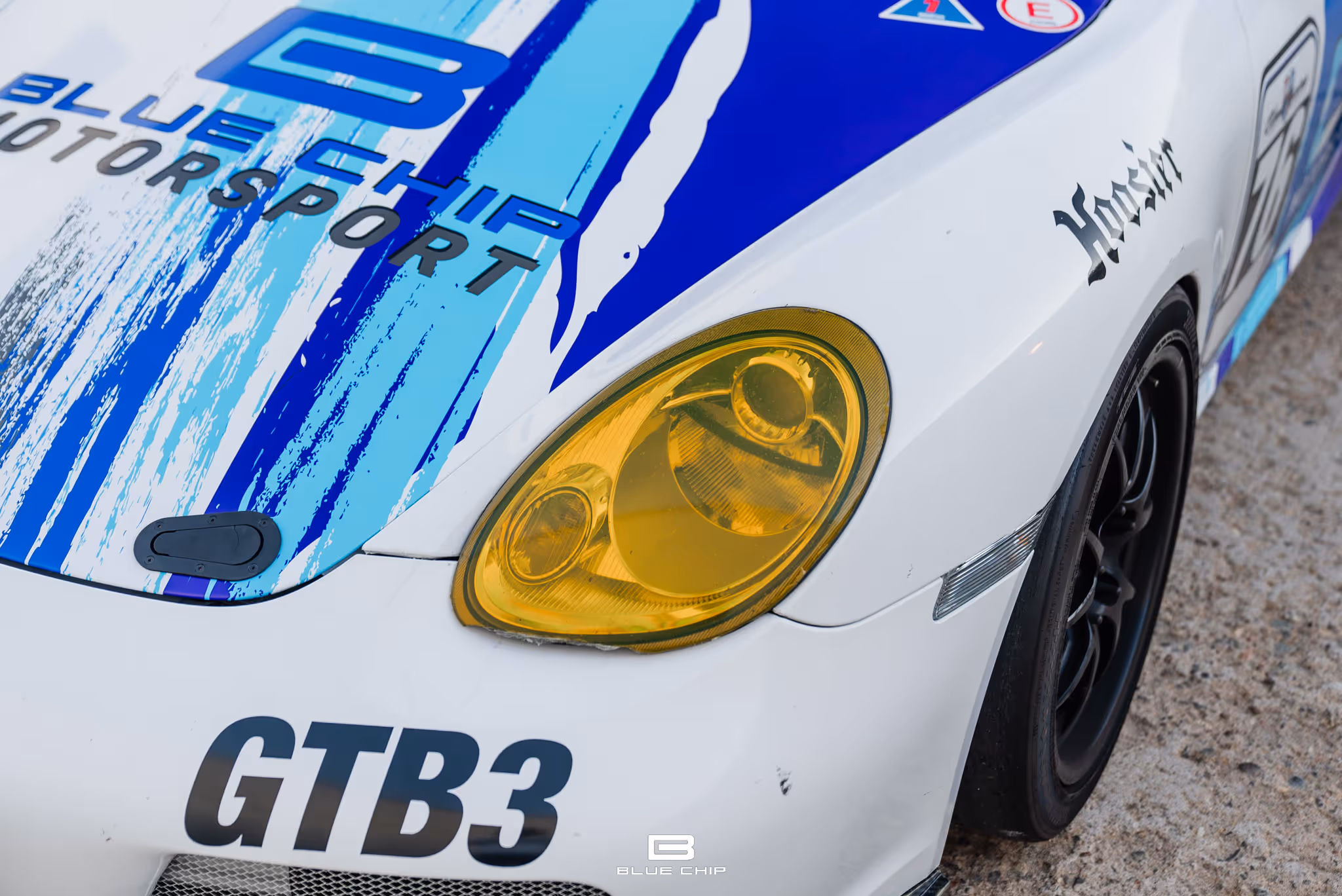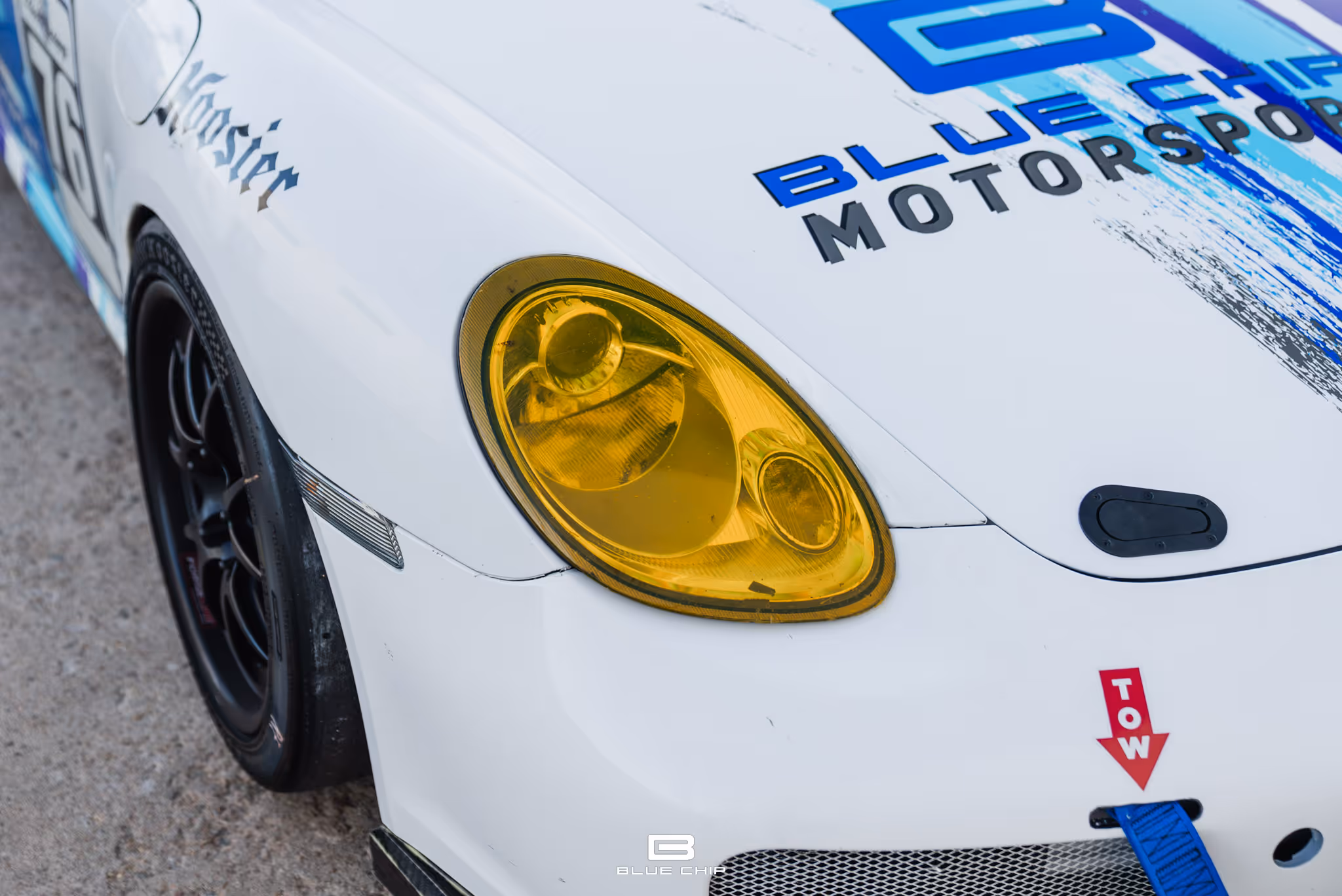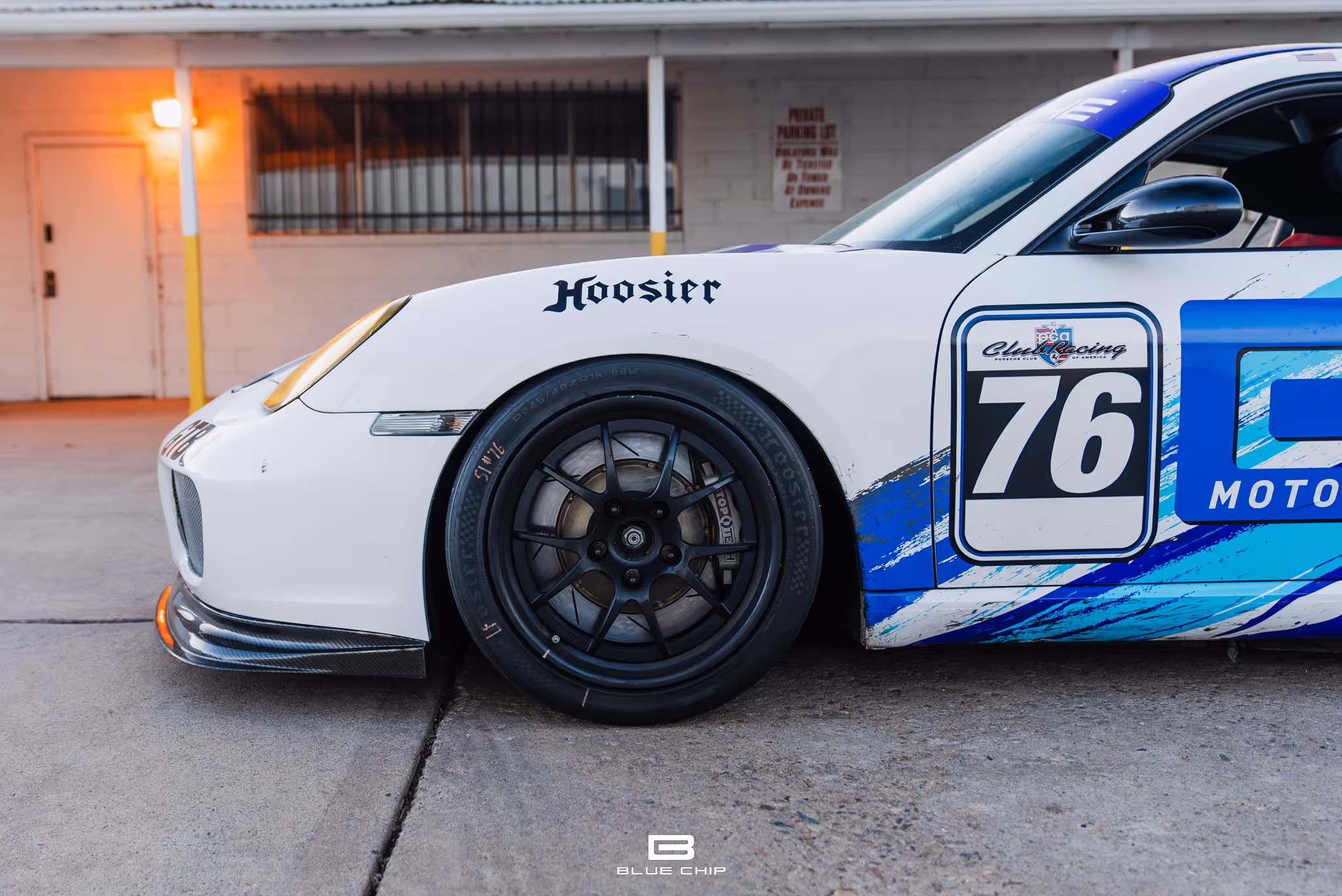 This 2007 Porsche Cayman S has been modified for competitive racing, reportedly configured for the GTB1 class of PCA Club Racing. It is powered by a replacement 3.4-liter flat-six engine, installed in August 2024, paired with a six-speed manual transaxle featuring a CAE short shifter.