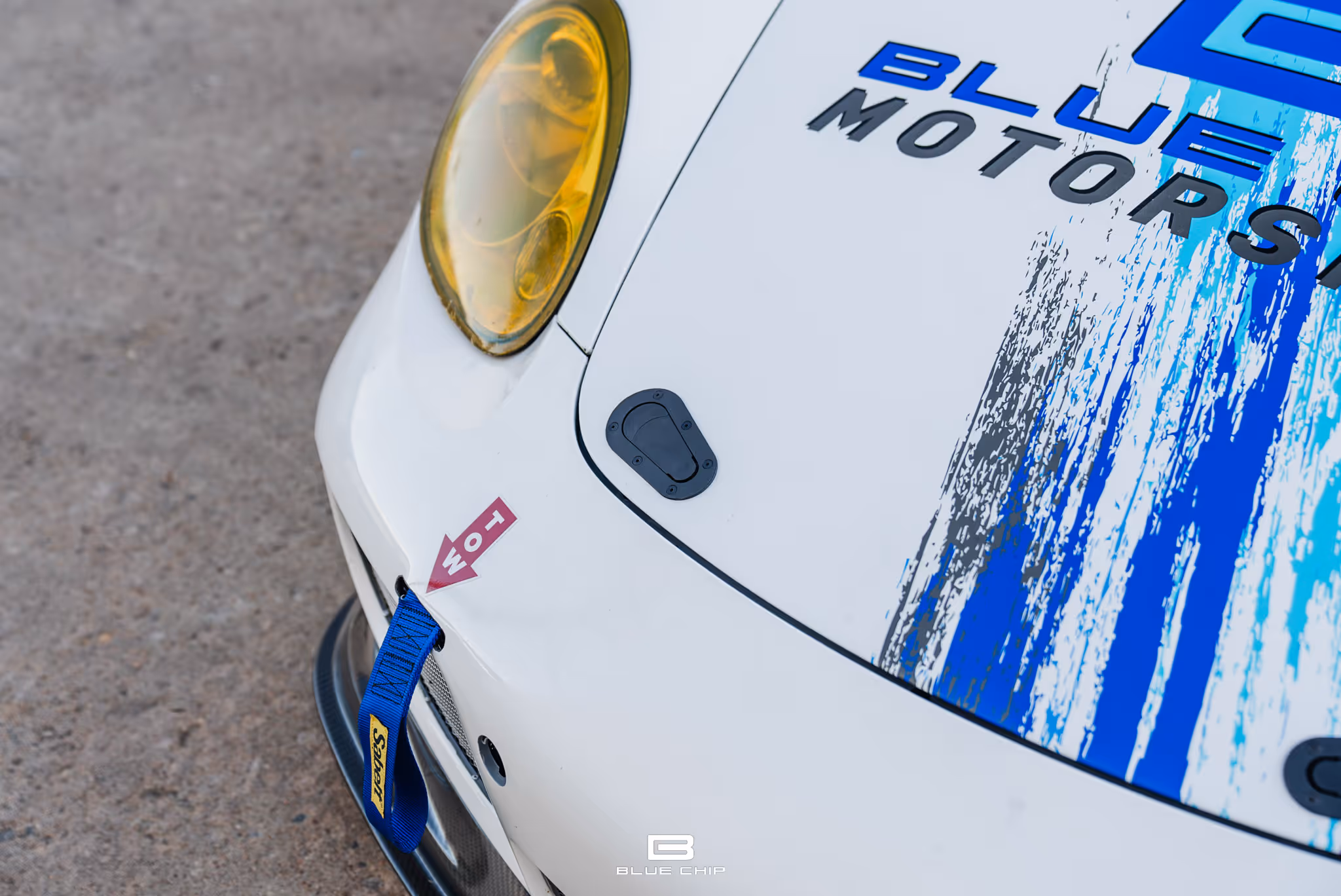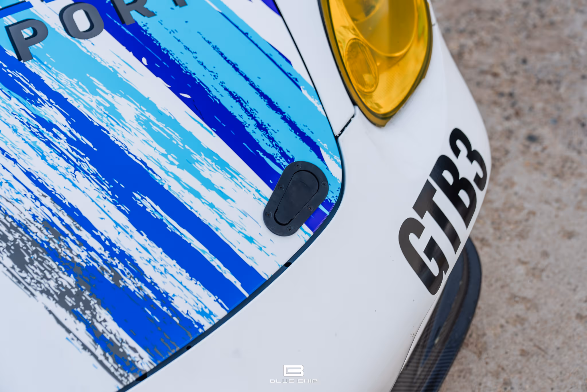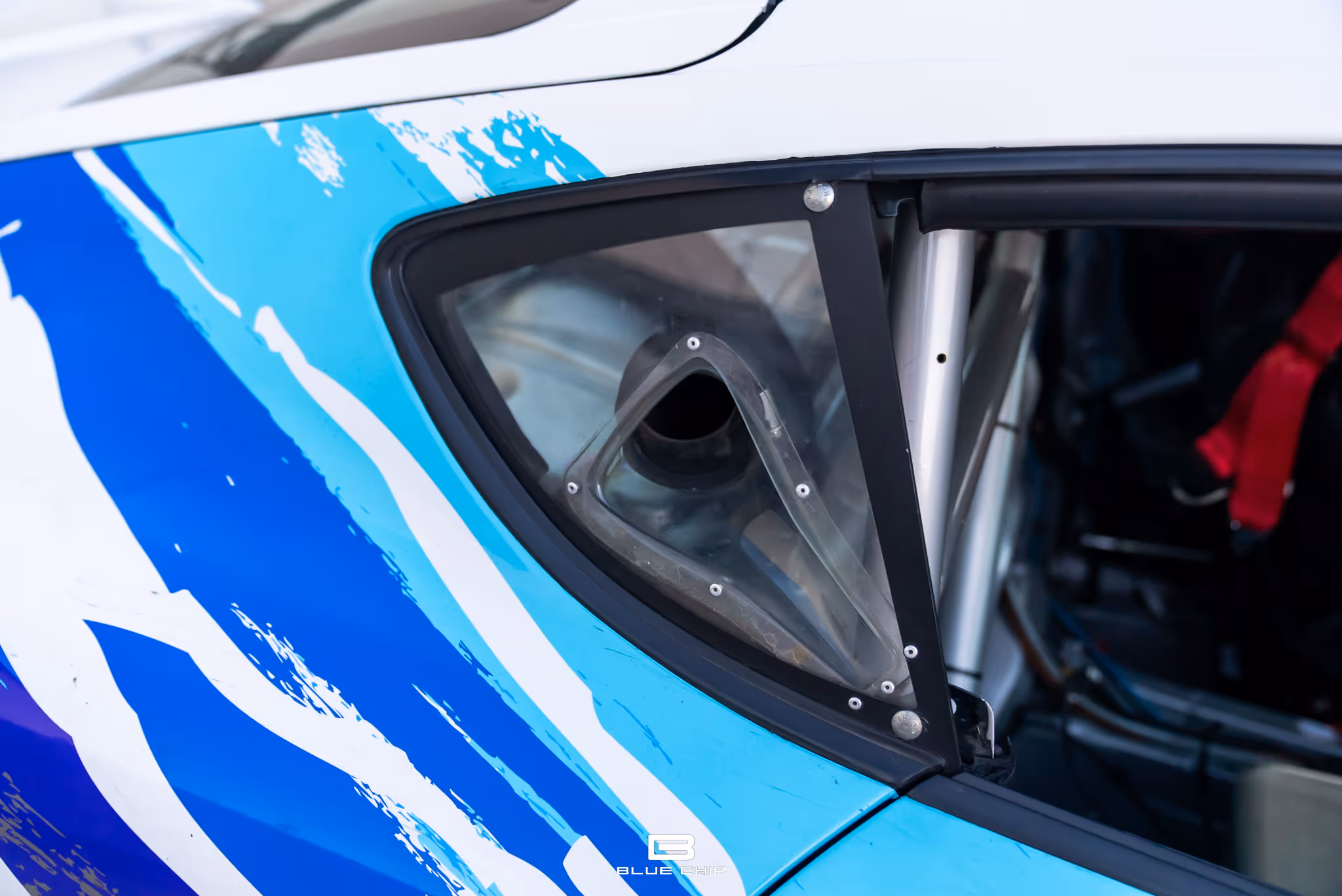 The exterior retains its factory Forest Green Metallic finish beneath a white and blue vinyl livery. Aerodynamic modifications include a rear wing, carbon fiber front splitter, ducktail rear spoiler, and rear quarter-window intake vents. Additional functional elements include tow hooks, an LED rain light, a low-profile antenna, and yellow-tinted headlights. The body shows wear from track use, and a replacement windshield was installed in 2021.