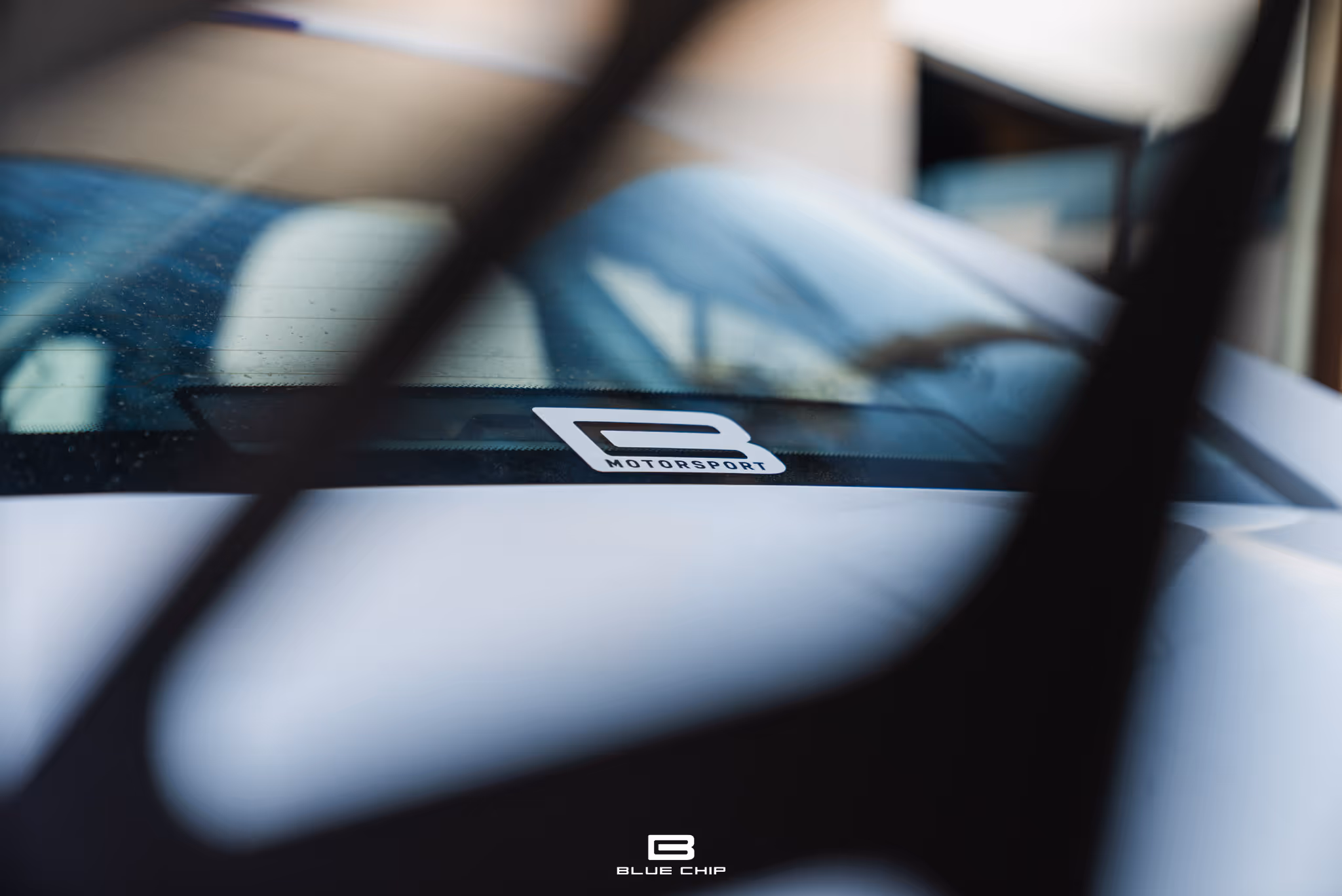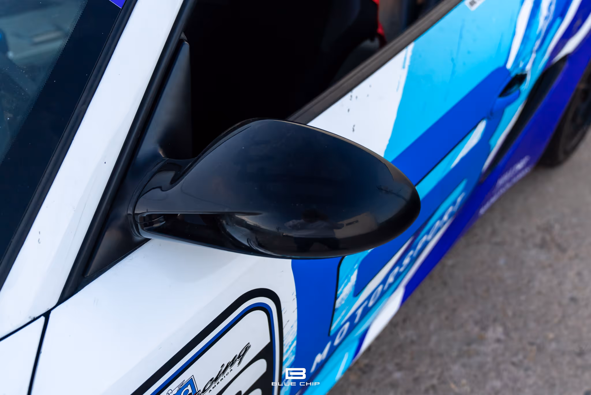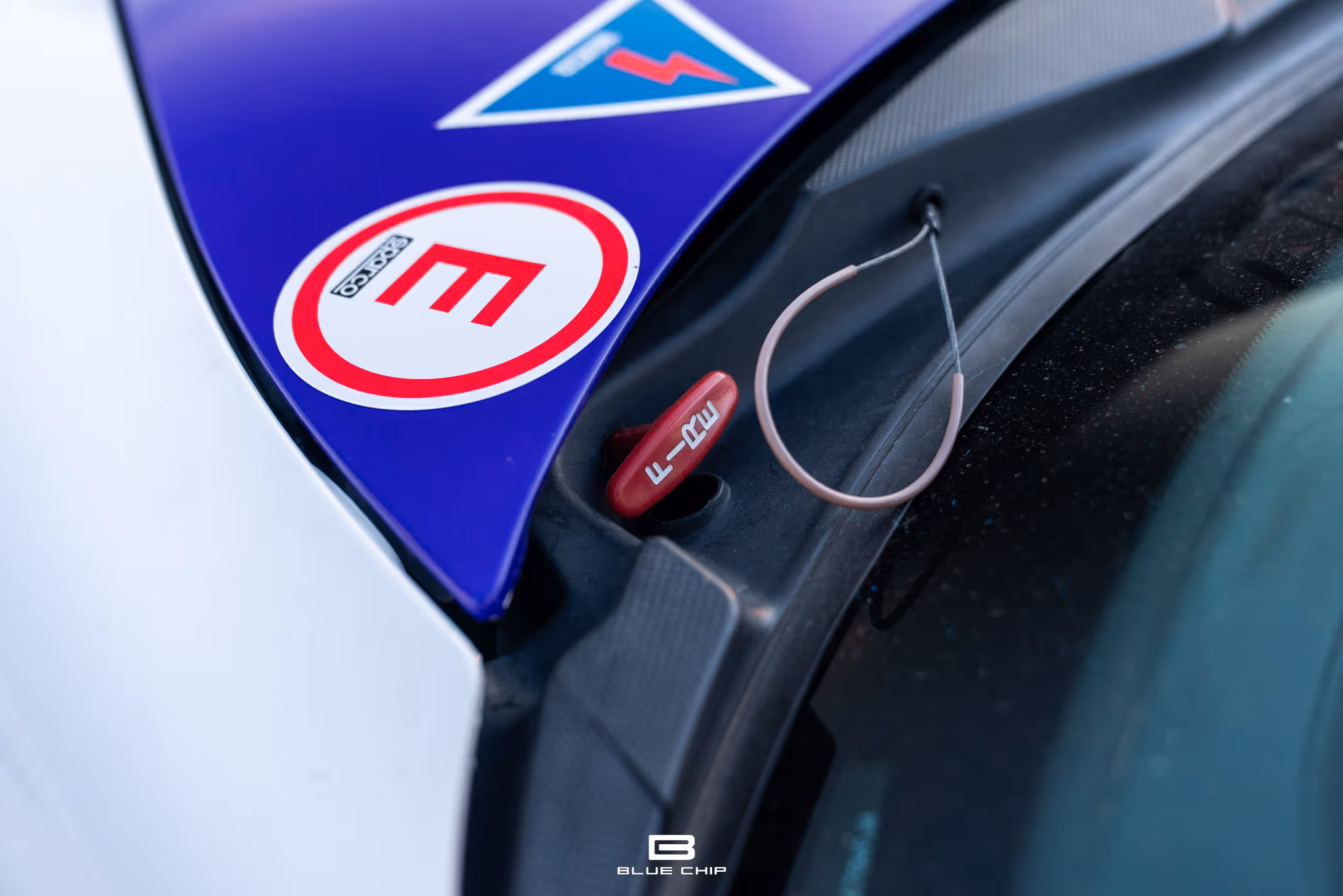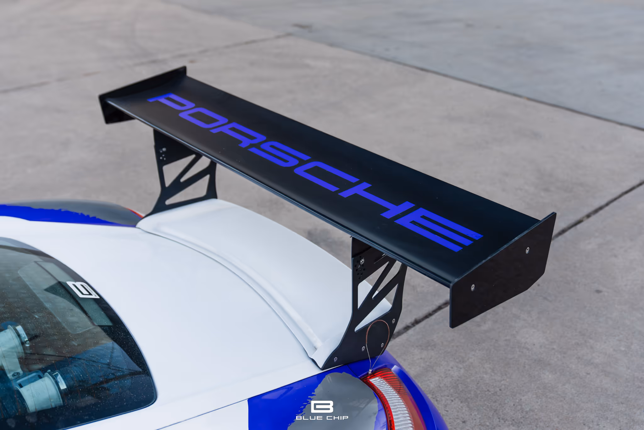 The exterior retains its factory Forest Green Metallic finish beneath a white and blue vinyl livery. Aerodynamic modifications include a rear wing, carbon fiber front splitter, ducktail rear spoiler, and rear quarter-window intake vents. Additional functional elements include tow hooks, an LED rain light, a low-profile antenna, and yellow-tinted headlights. The body shows wear from track use, and a replacement windshield was installed in 2021.