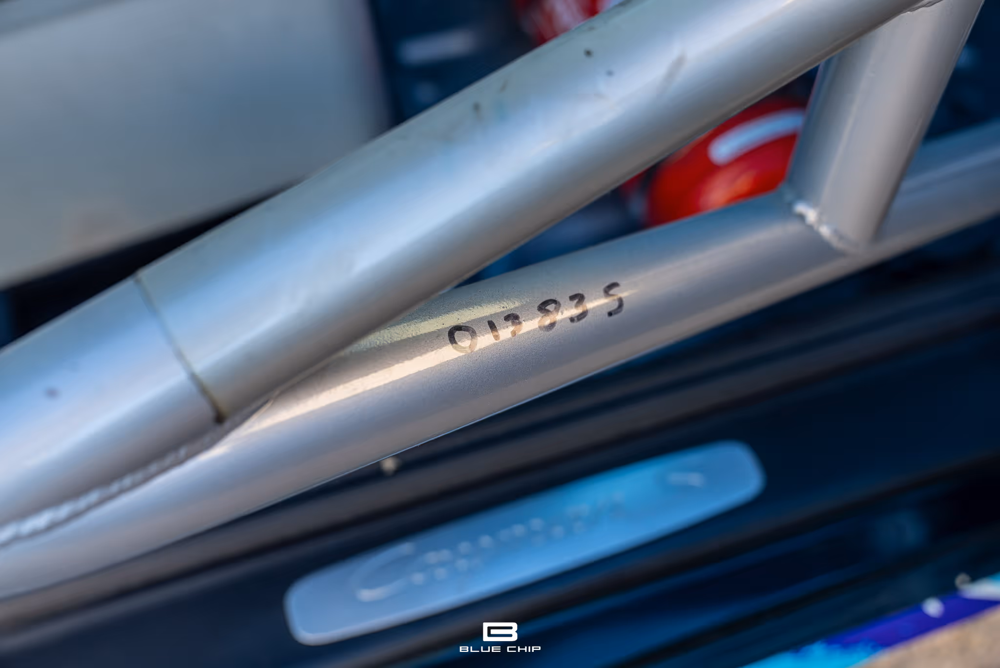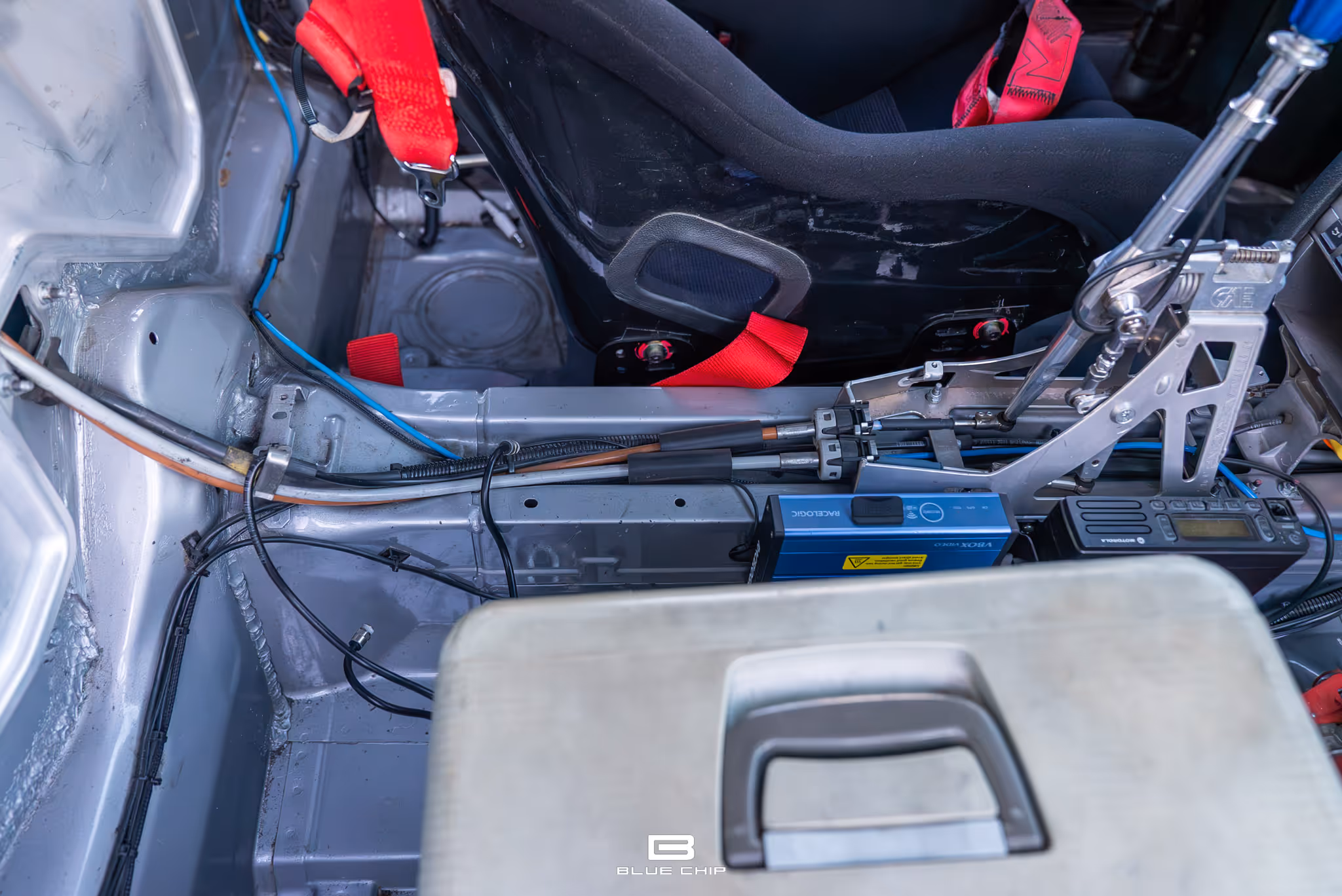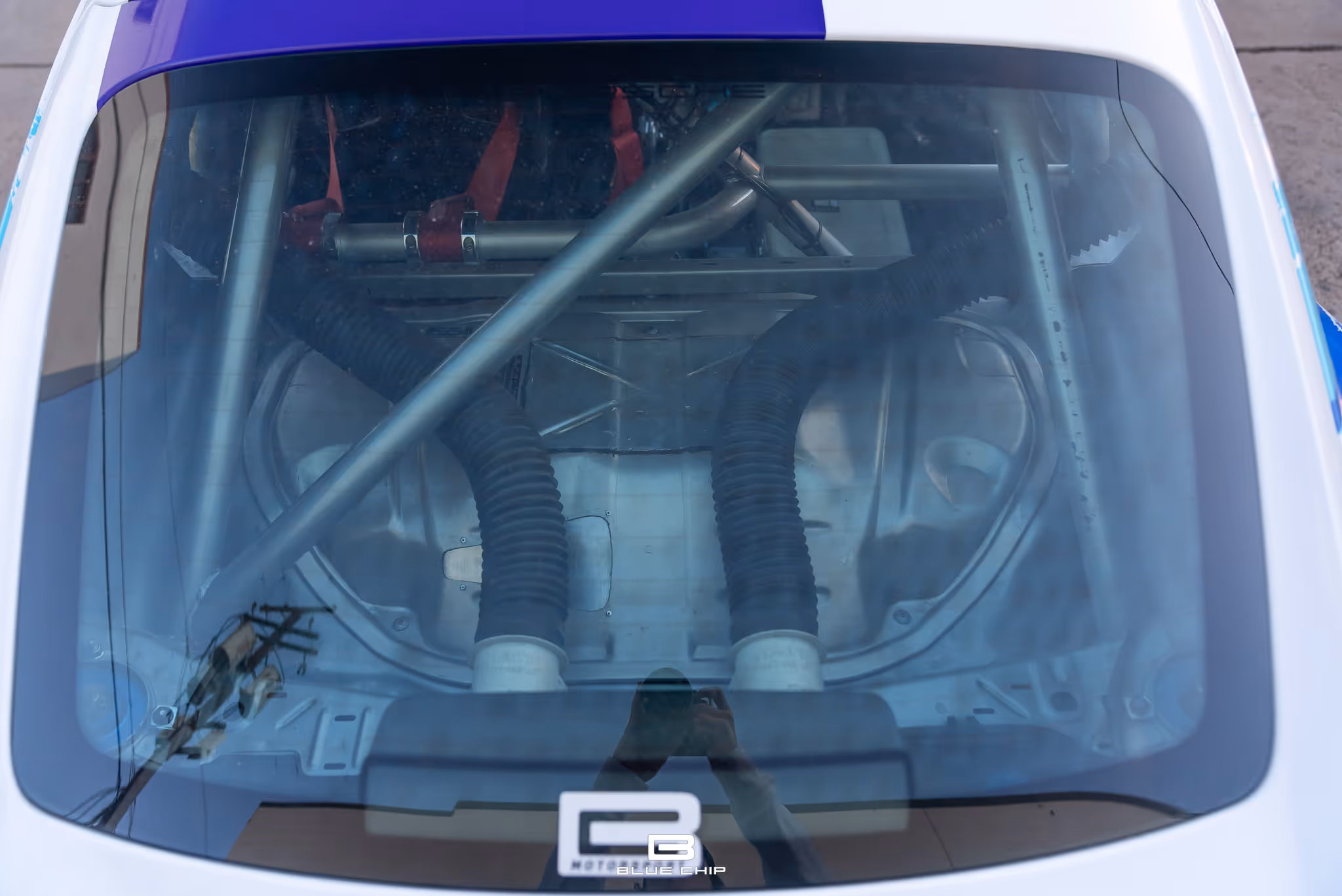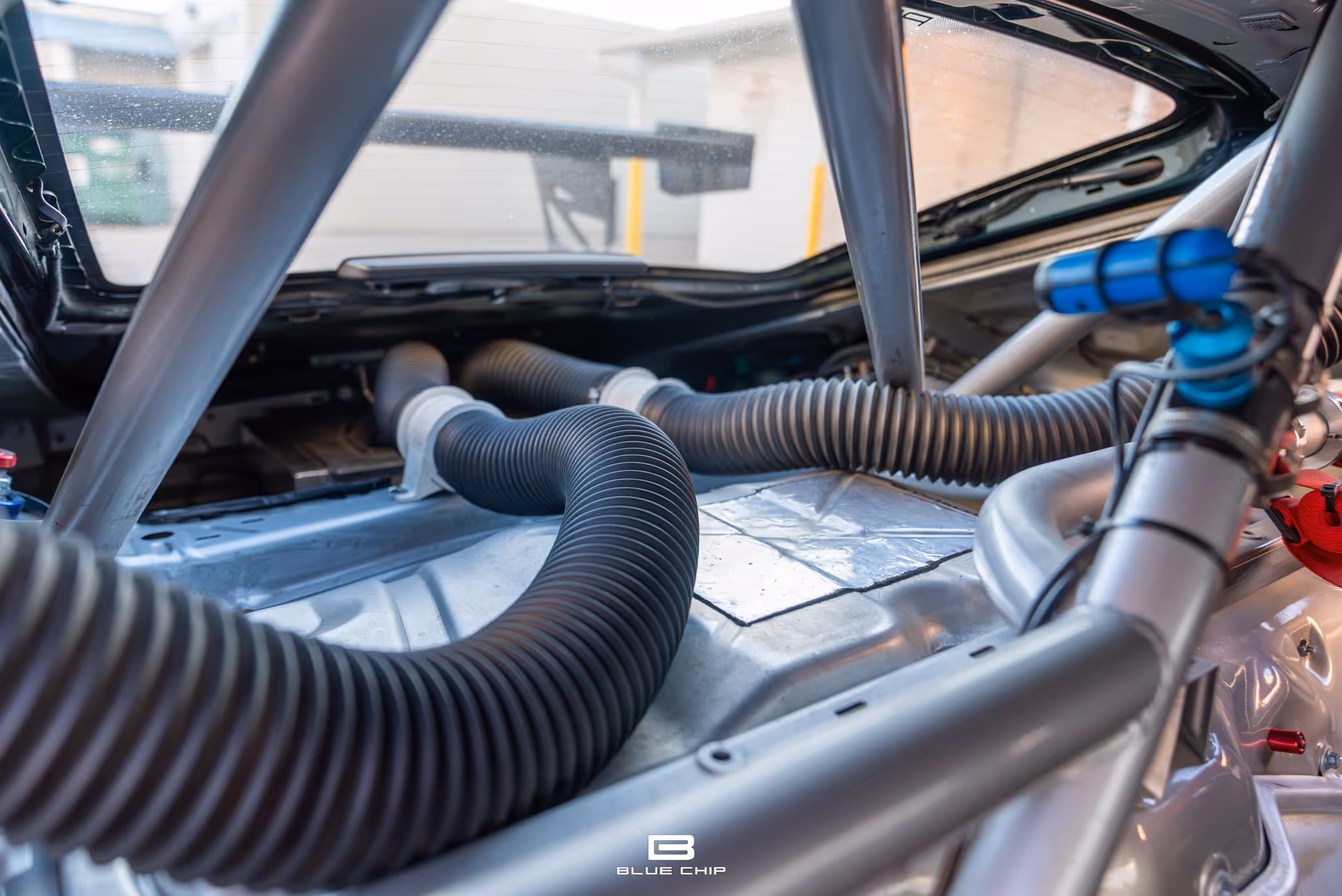 The drivetrain includes a six-speed manual transaxle with an auxiliary transmission cooler mounted in the trunk. The clutch was replaced in 2022, and the vehicle is equipped with an aftermarket fuel cell and exhaust system, while retaining the factory fuel tank.