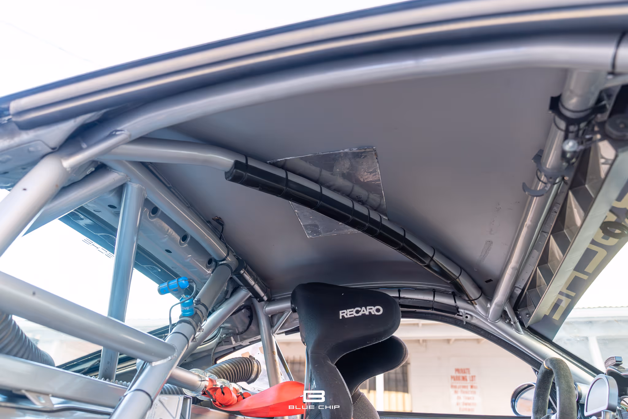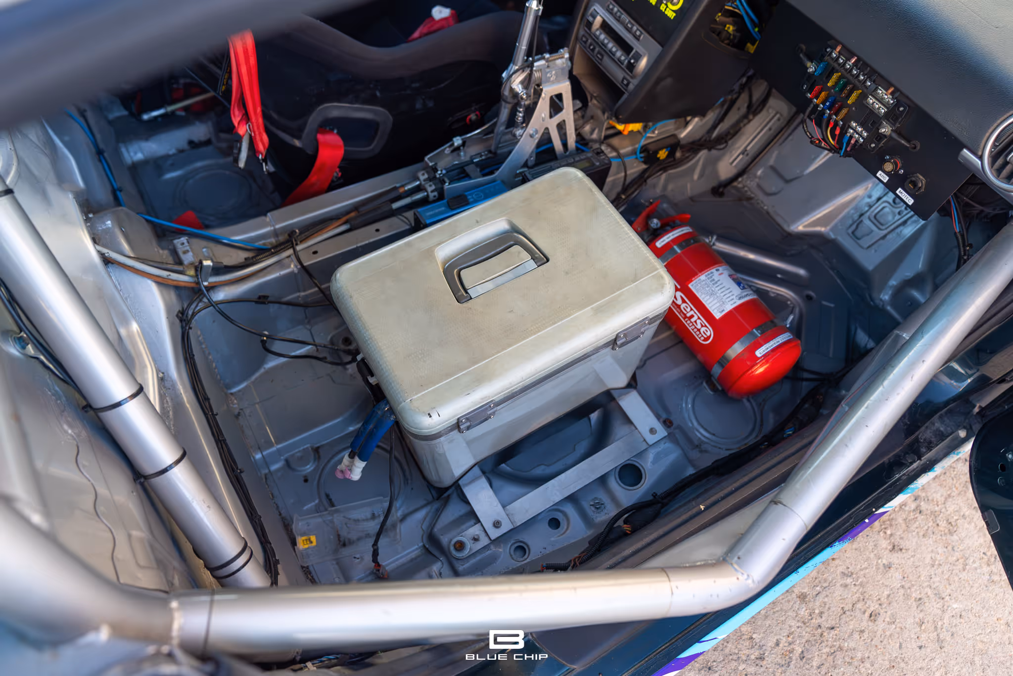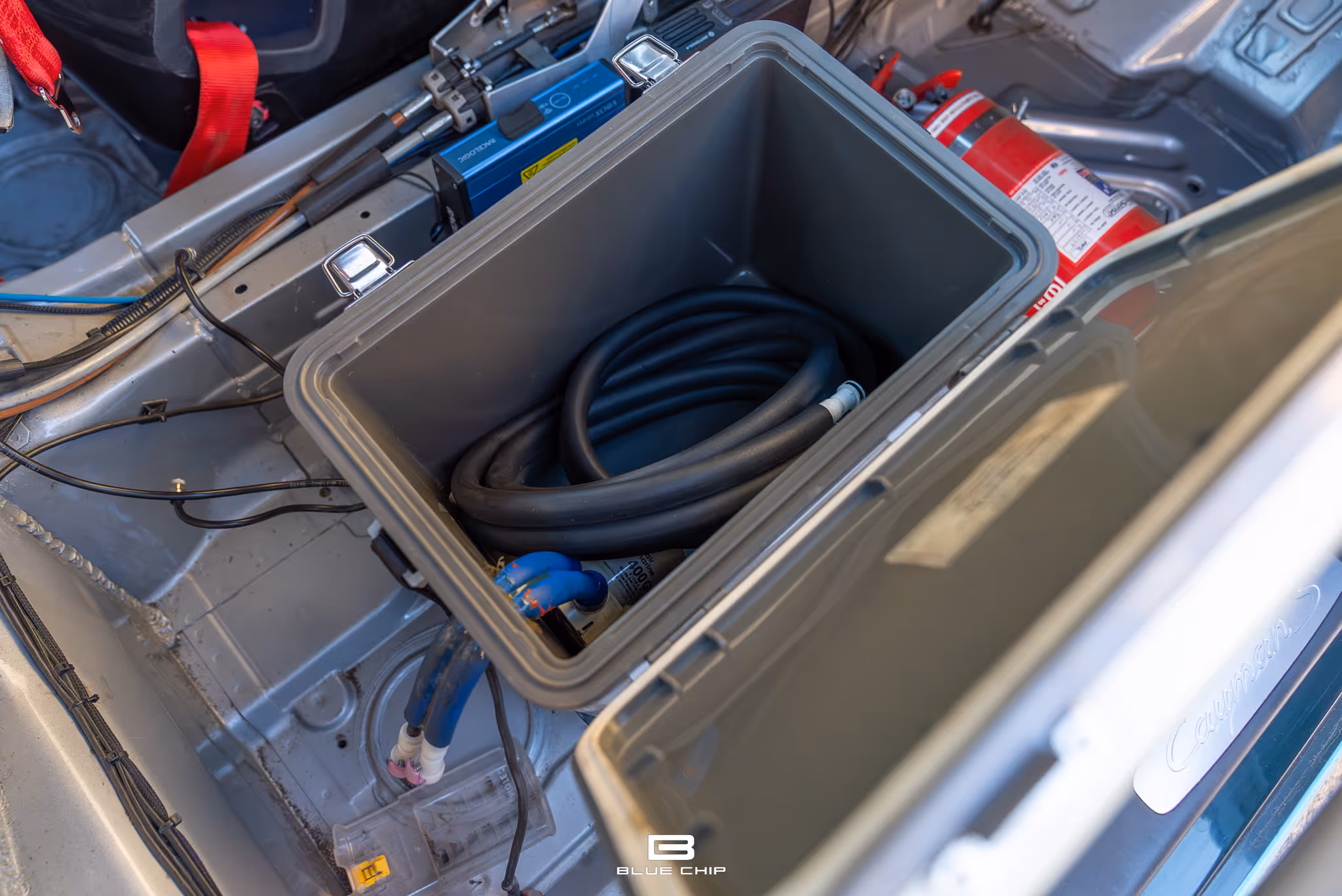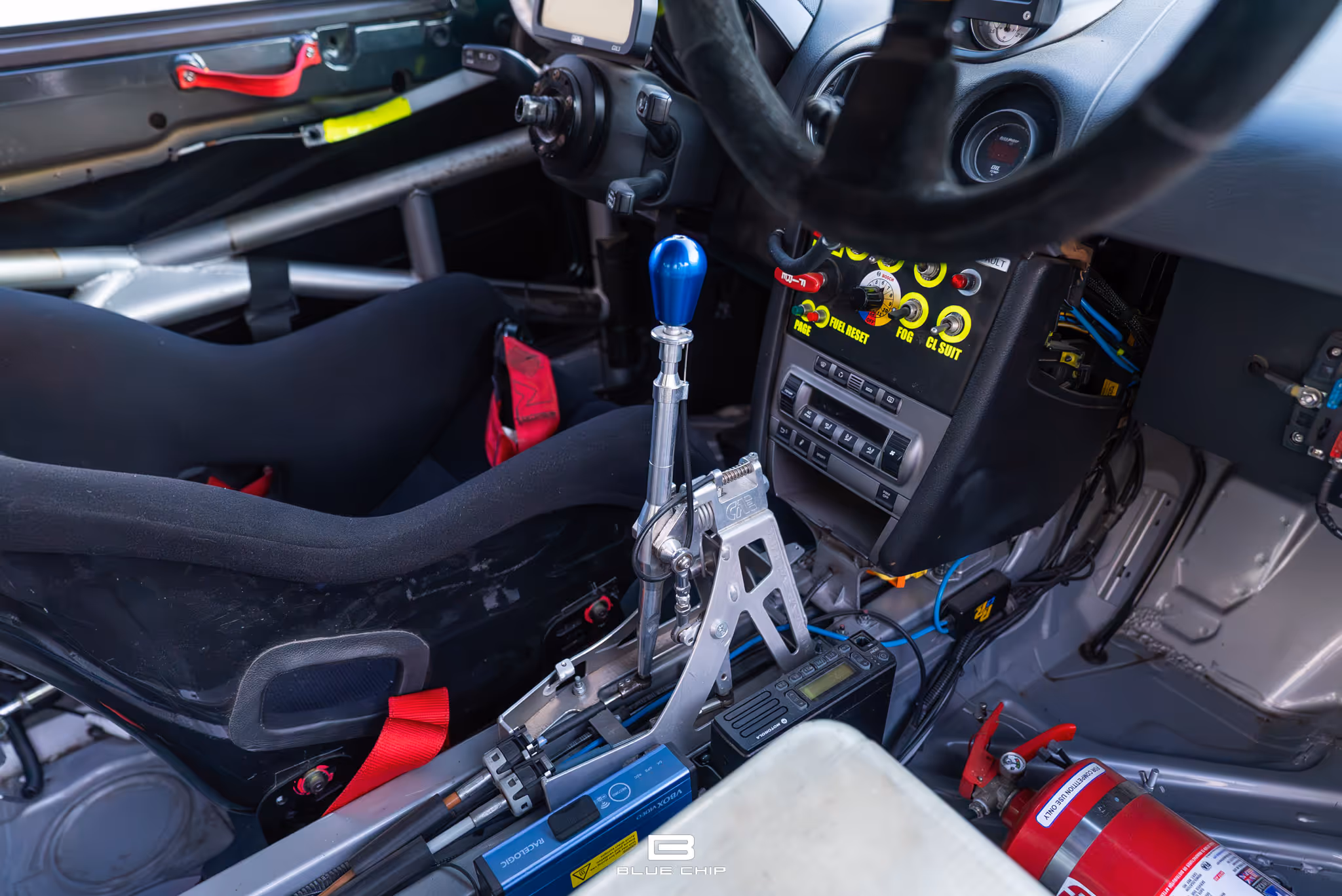 The drivetrain includes a six-speed manual transaxle with an auxiliary transmission cooler mounted in the trunk. The clutch was replaced in 2022, and the vehicle is equipped with an aftermarket fuel cell and exhaust system, while retaining the factory fuel tank.