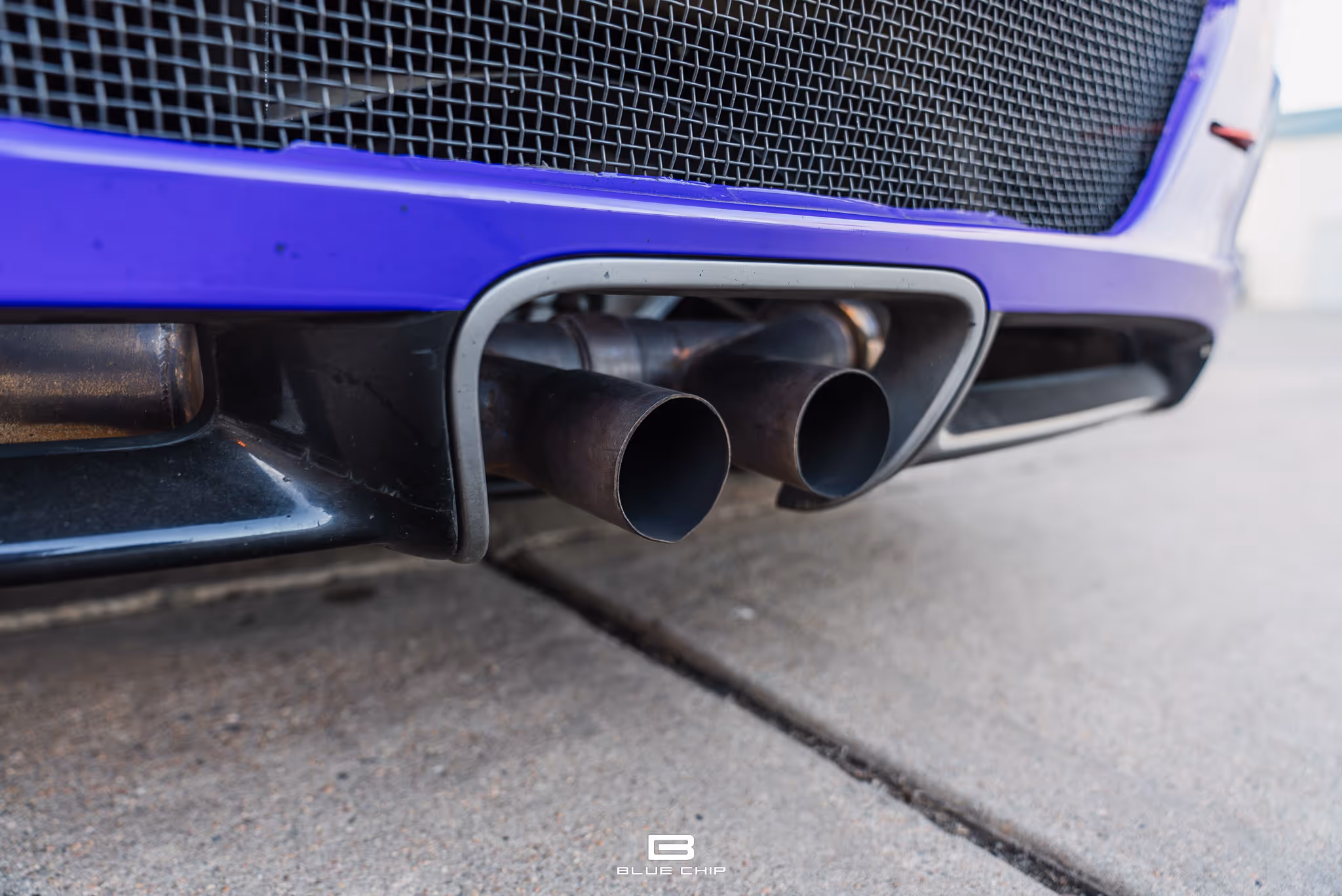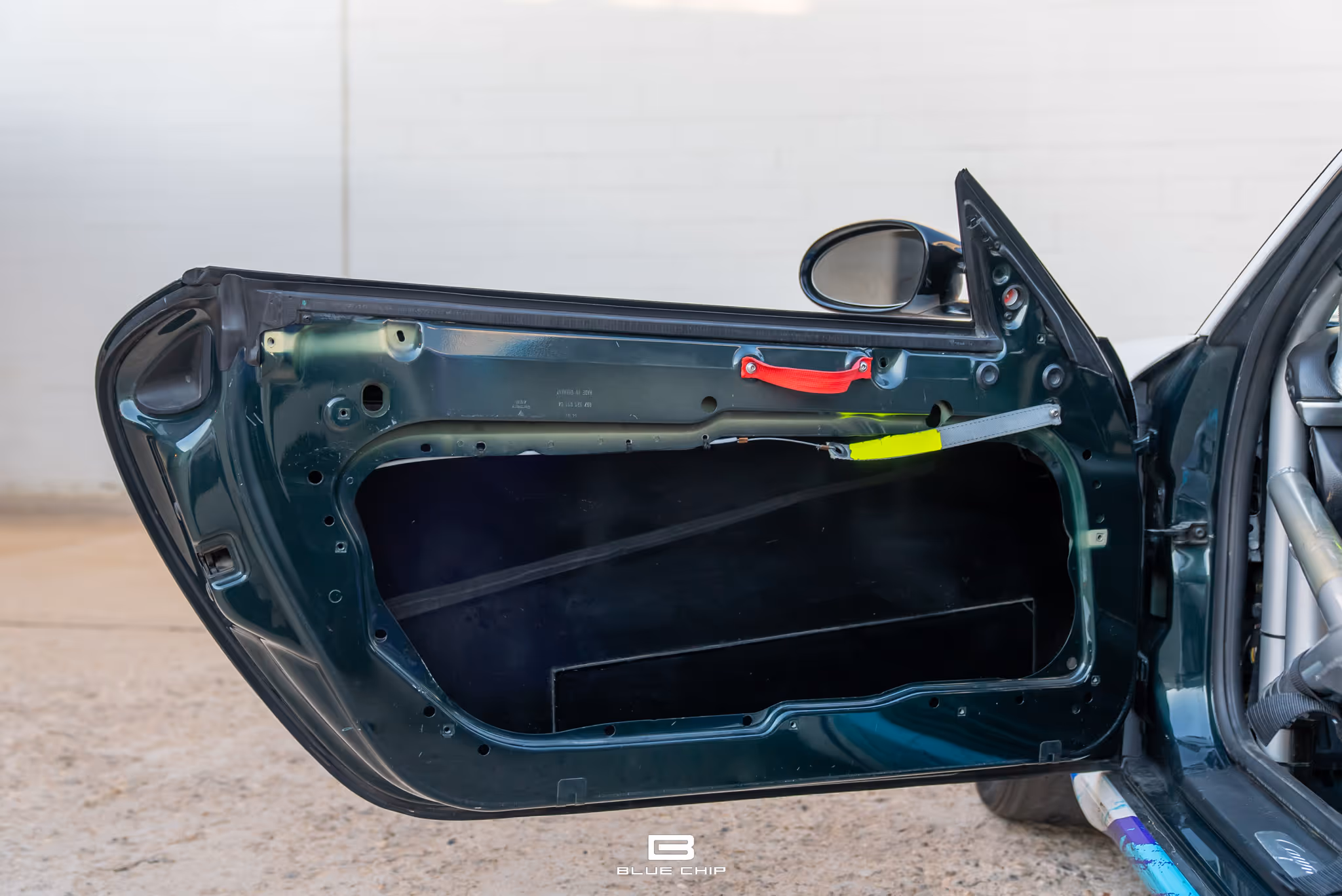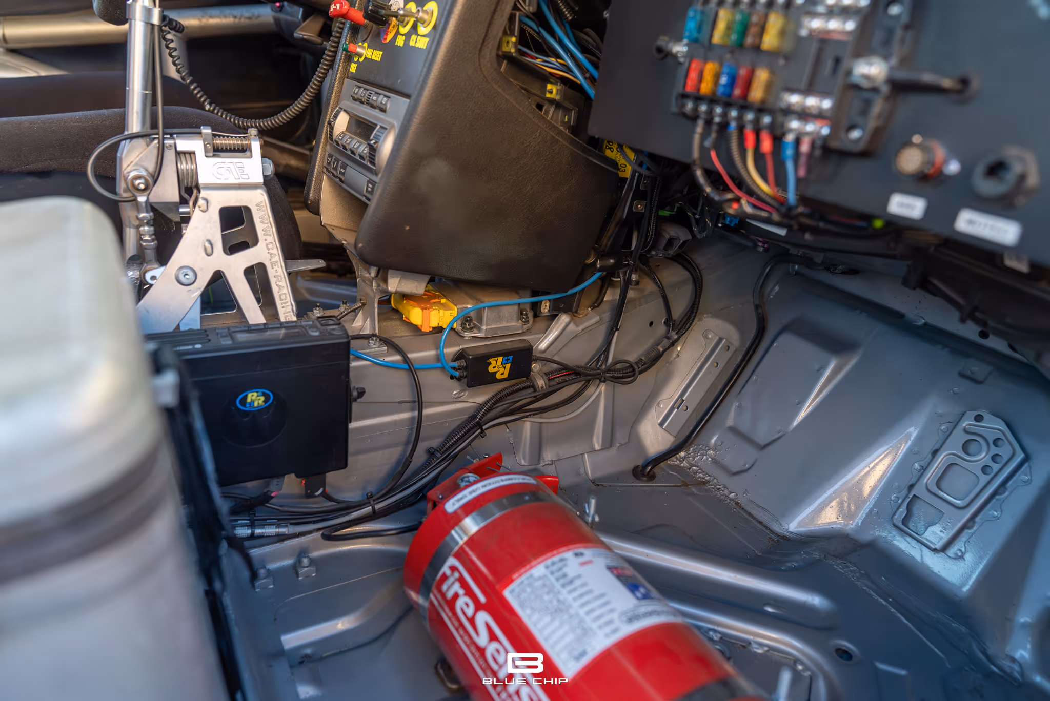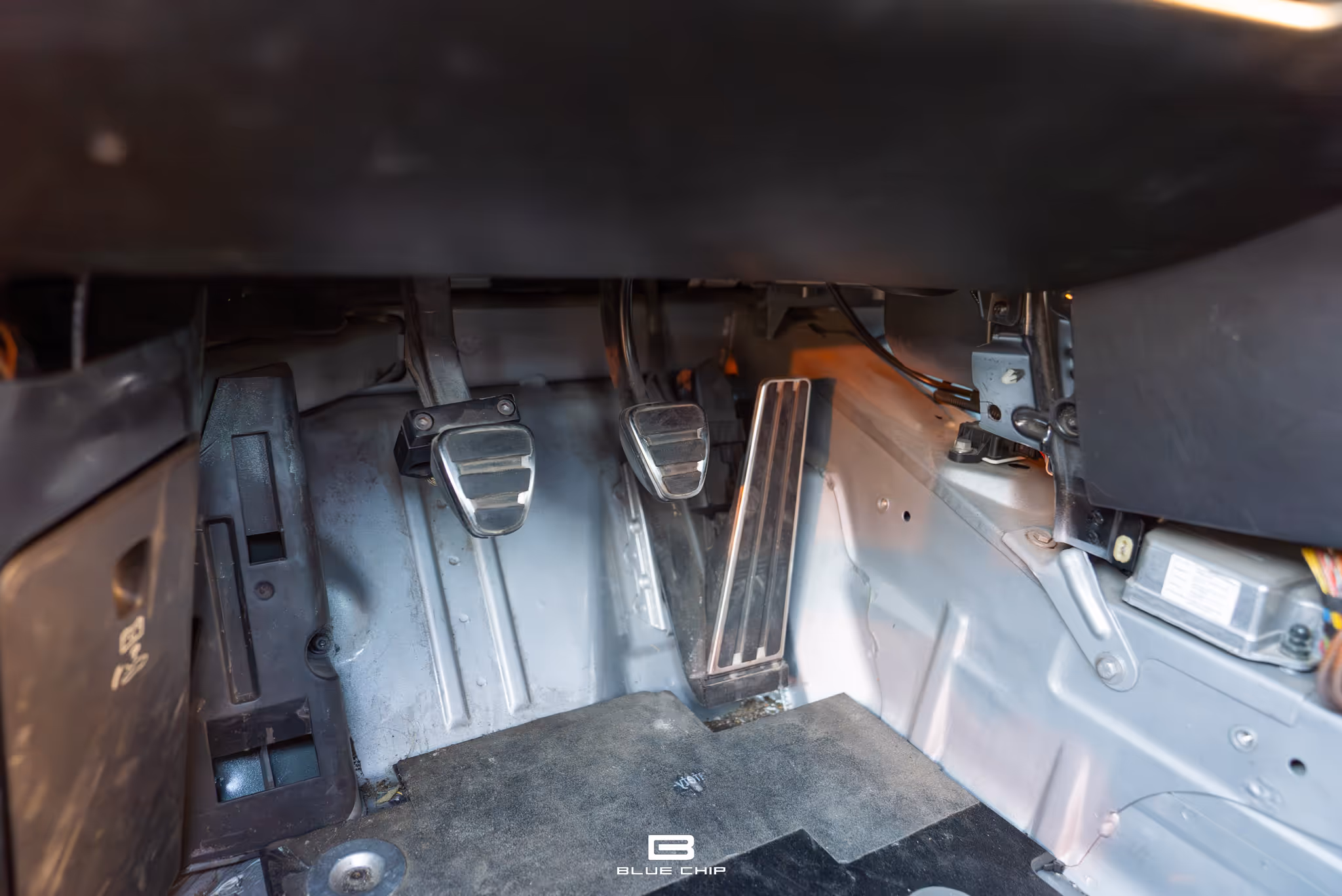 The drivetrain includes a six-speed manual transaxle with an auxiliary transmission cooler mounted in the trunk. The clutch was replaced in 2022, and the vehicle is equipped with an aftermarket fuel cell and exhaust system, while retaining the factory fuel tank.