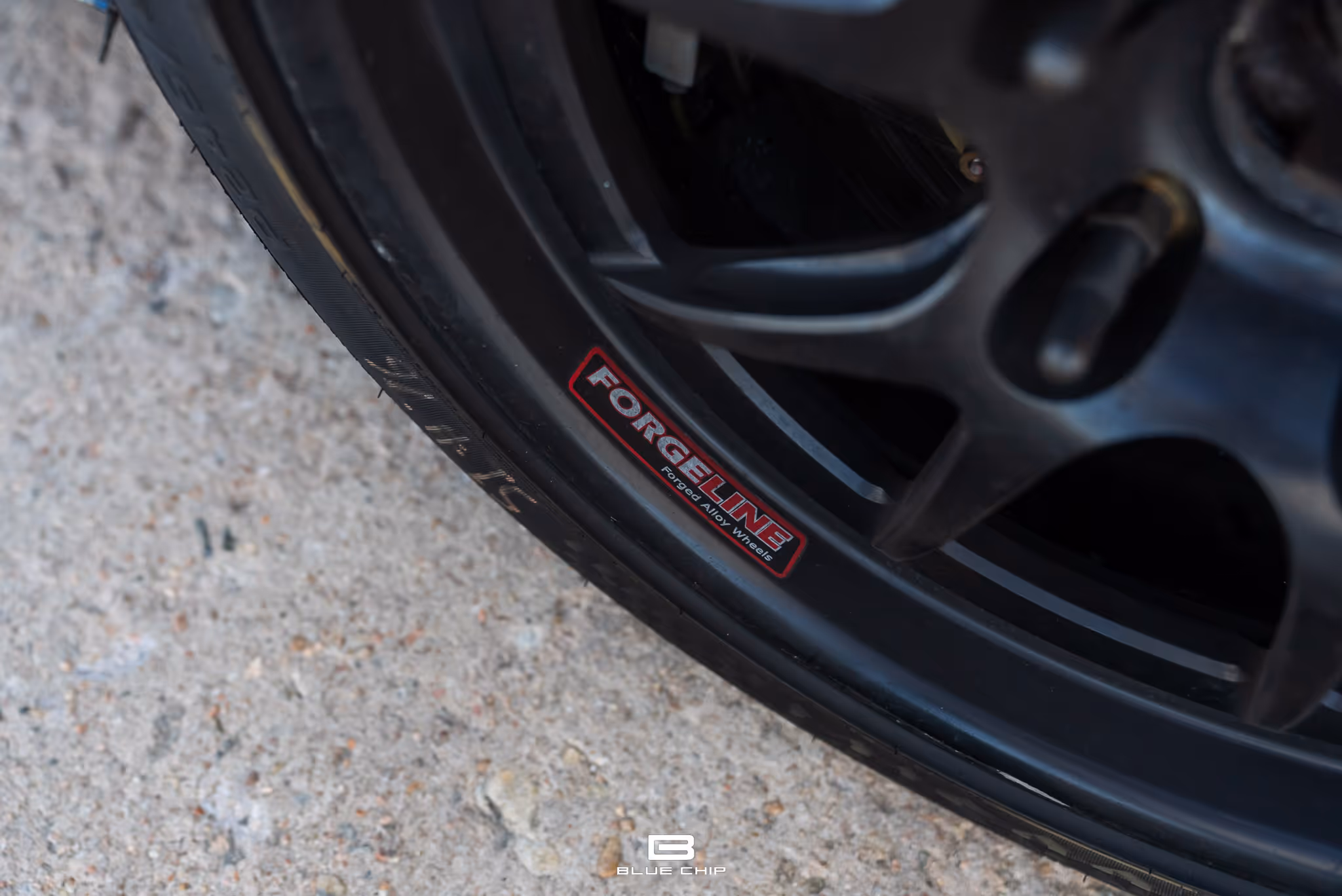 The chassis is equipped with black 18-inch Forgeline multi-spoke wheels fitted with Hoosier tires. The suspension system consists of a JRZ RS adjustable coilover setup and aftermarket inner tie rods. An electric power steering system has been installed, and the braking system has been upgraded with aftermarket components.