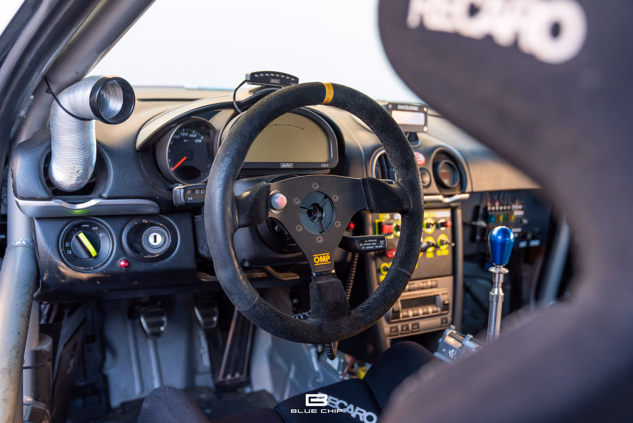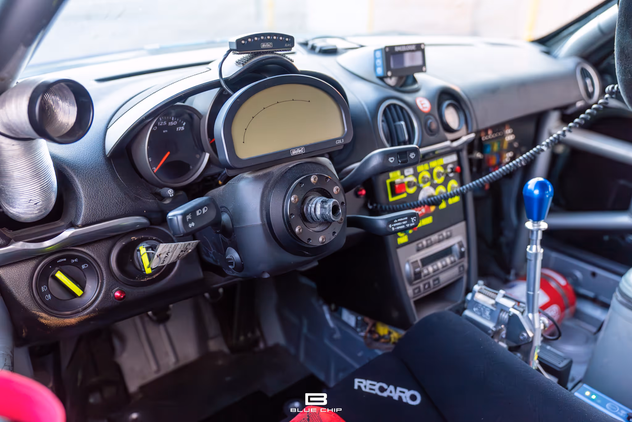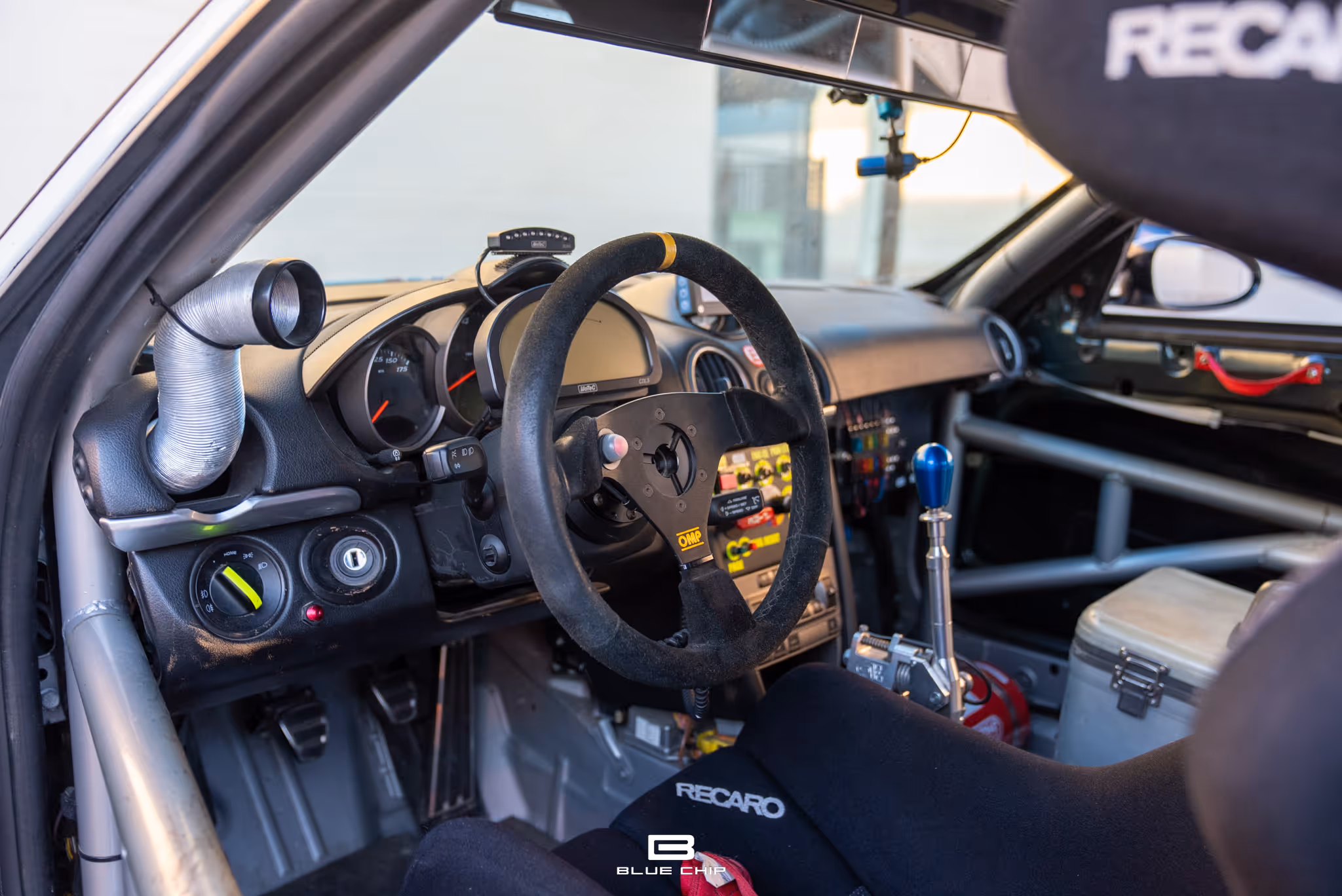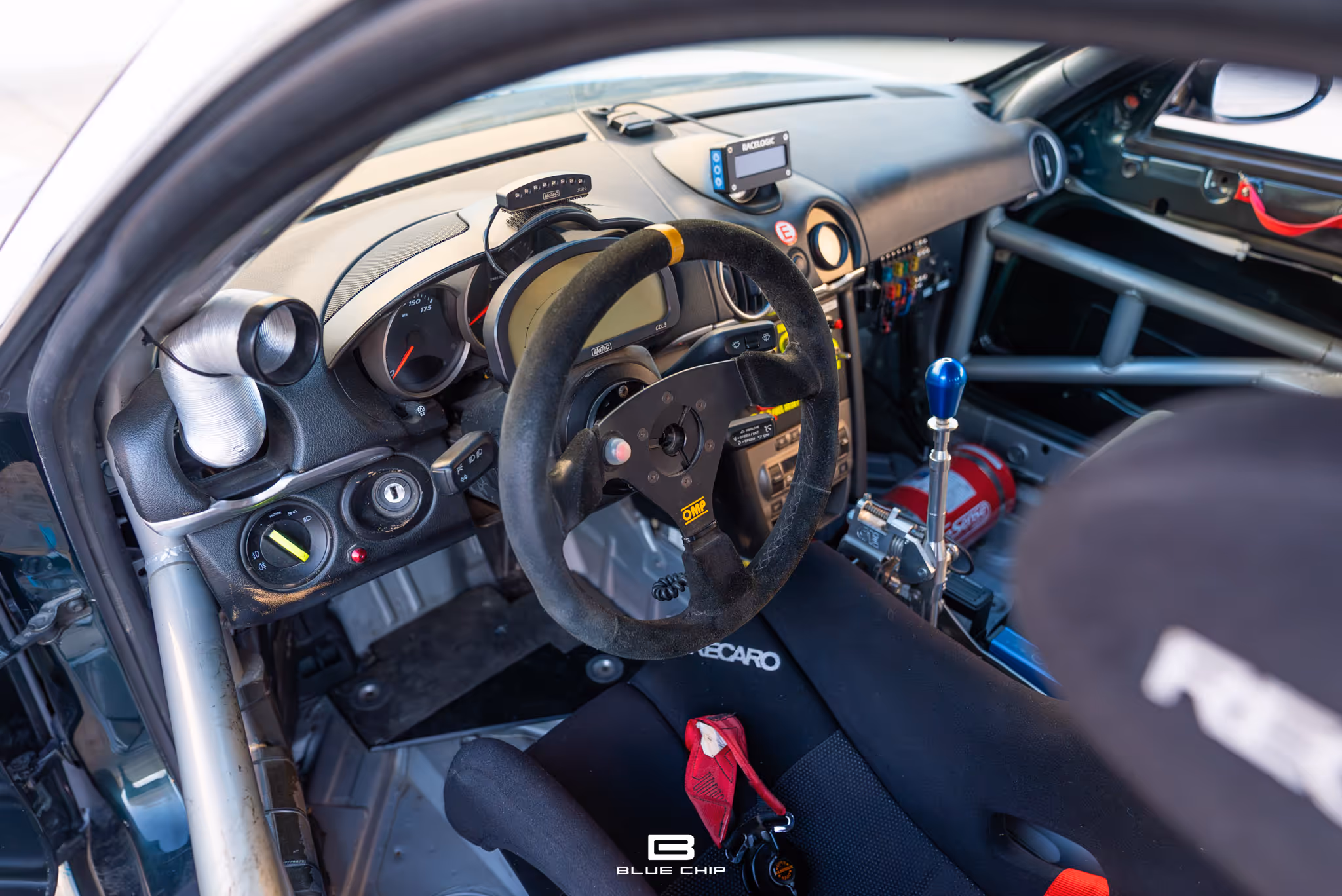 The interior has been stripped for weight reduction, leaving only a single Recaro racing seat with a Schroth Racing harness. Safety features include a full roll cage with door bars, a fire suppression system, and RaceQuip window netting. A CoolShirt system occupies the space of the removed passenger seat. Instrumentation includes a Racelogic OLED display, a GPS data logger with an integrated camera, and an AutoMeter oil temperature gauge in the center stack. The OMP microsuede-wrapped removable steering wheel features a yellow centering stripe.