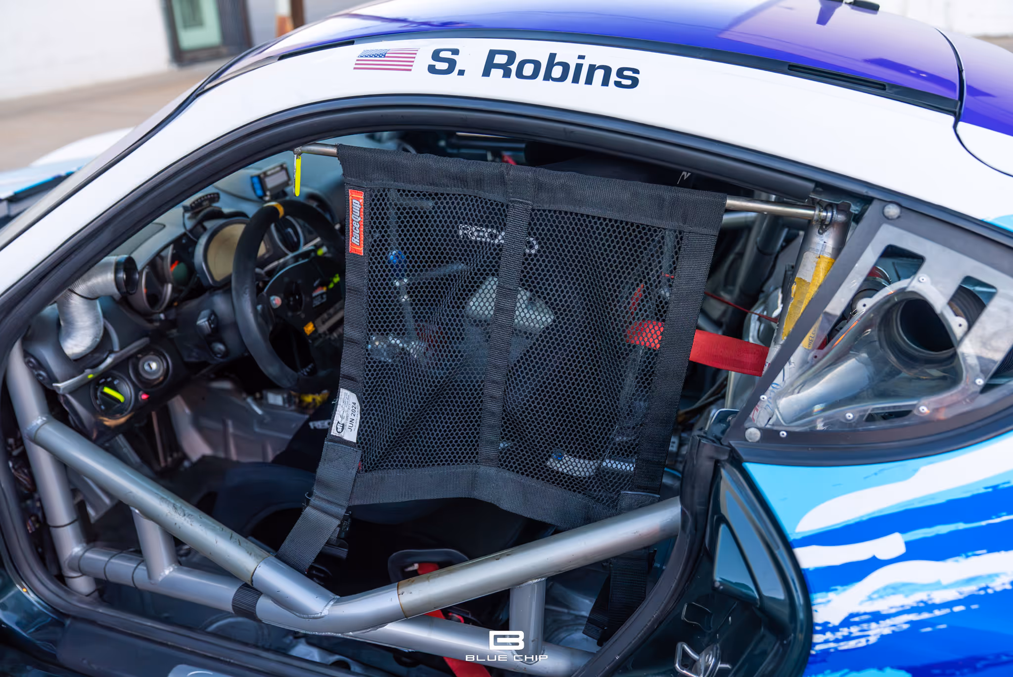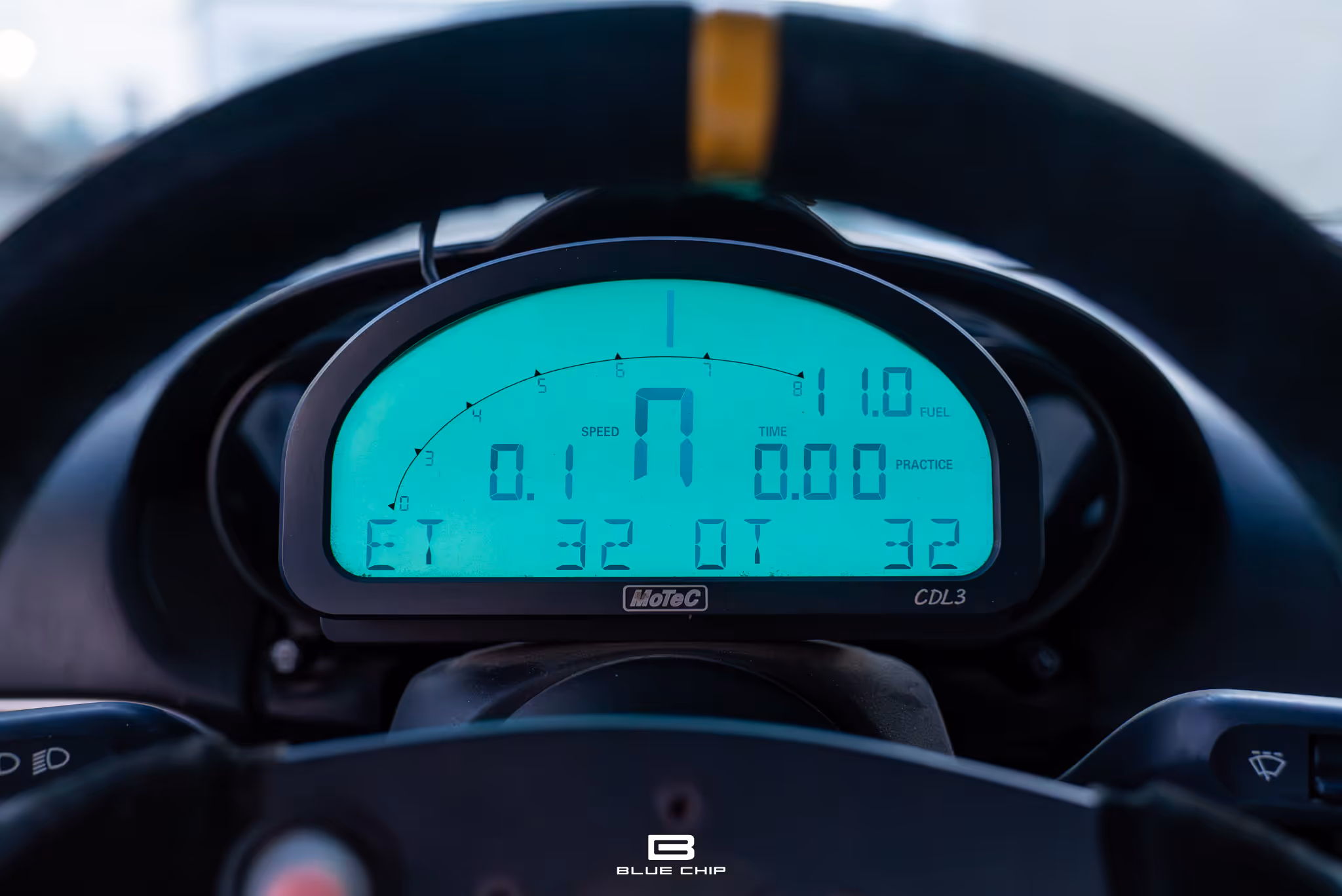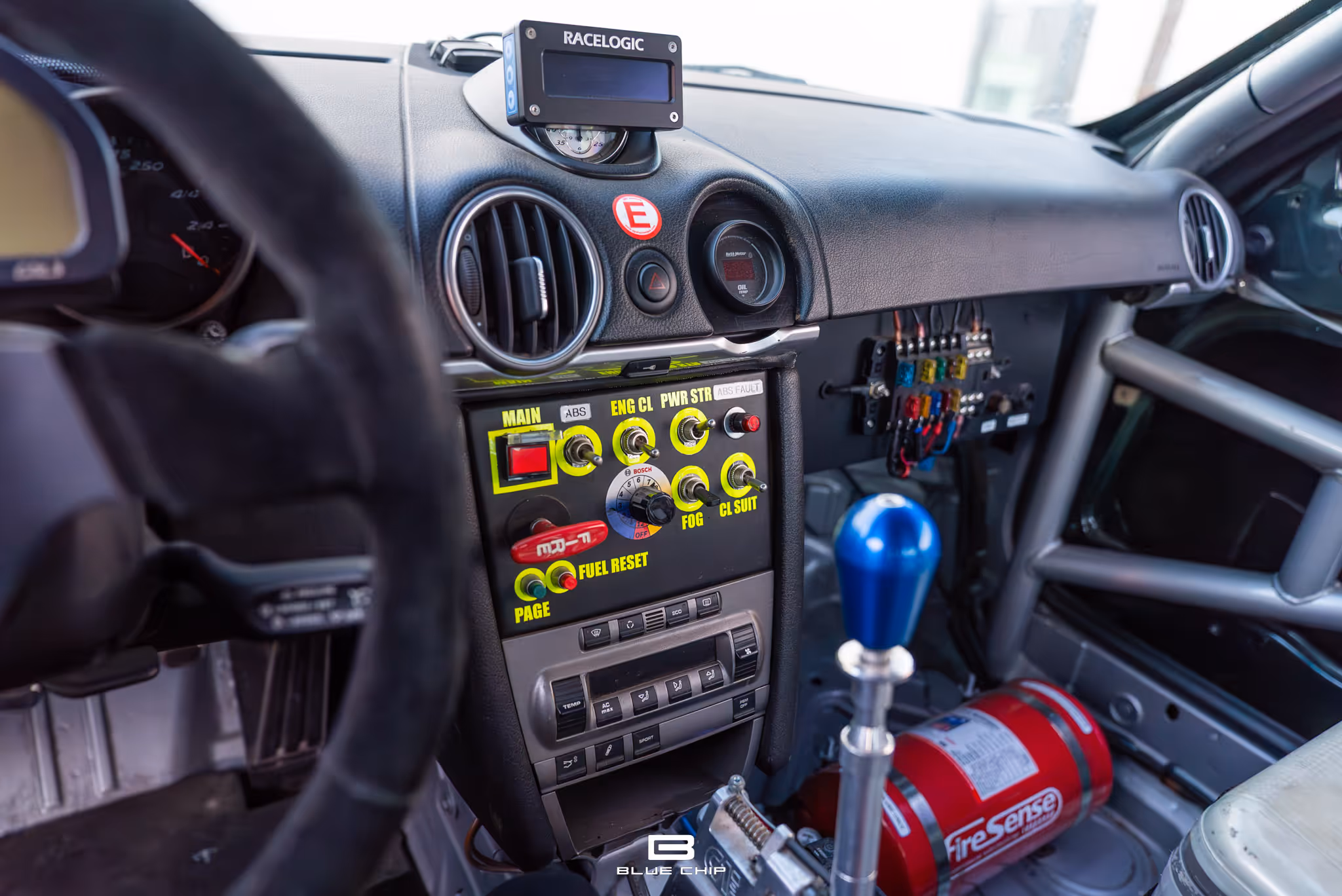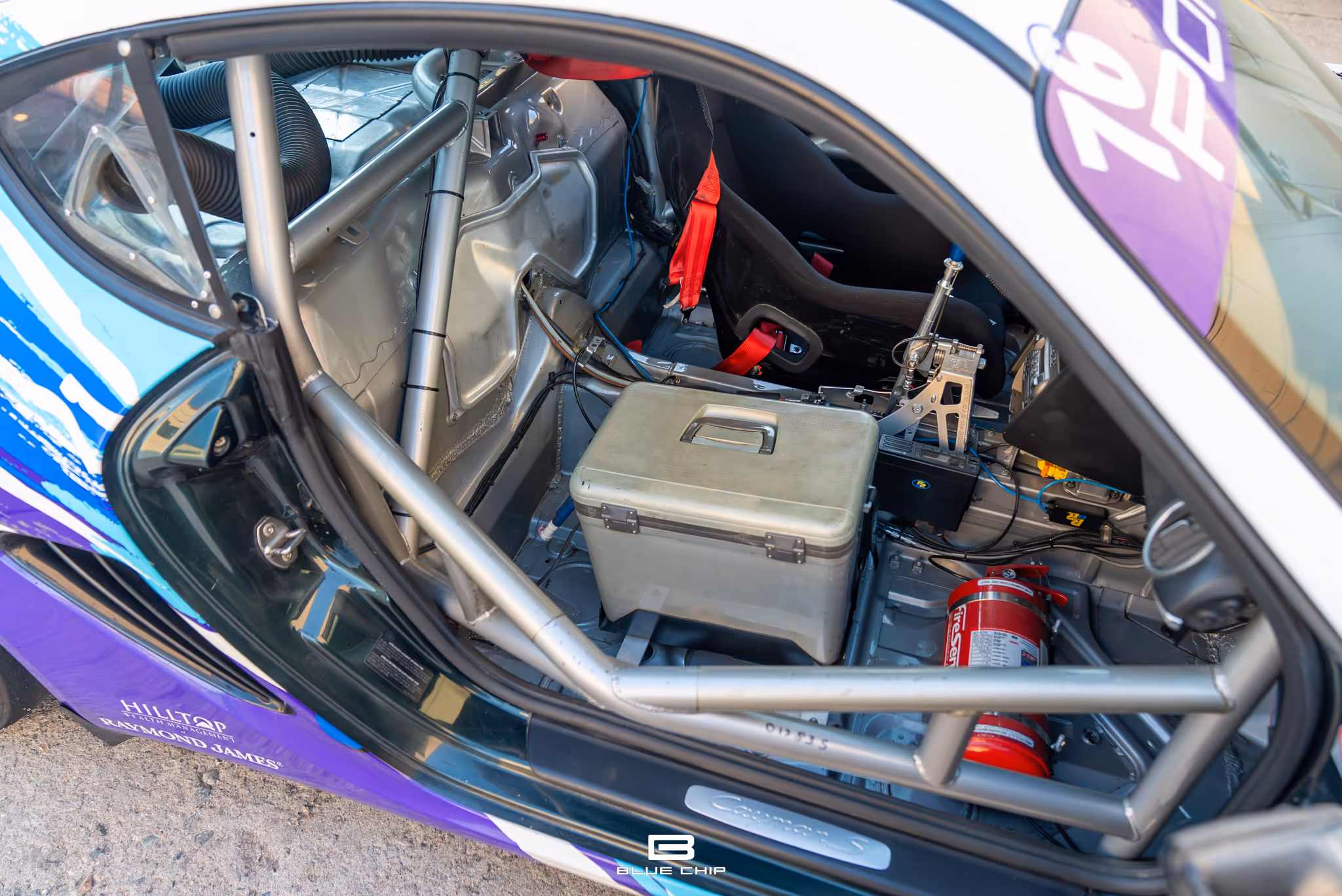 The interior has been stripped for weight reduction, leaving only a single Recaro racing seat with a Schroth Racing harness. Safety features include a full roll cage with door bars, a fire suppression system, and RaceQuip window netting. A CoolShirt system occupies the space of the removed passenger seat. Instrumentation includes a Racelogic OLED display, a GPS data logger with an integrated camera, and an AutoMeter oil temperature gauge in the center stack. The OMP microsuede-wrapped removable steering wheel features a yellow centering stripe.