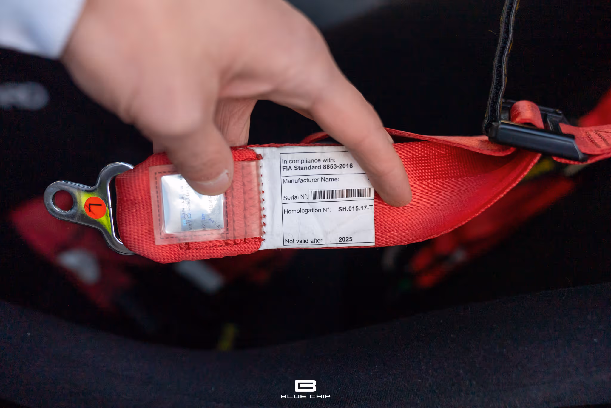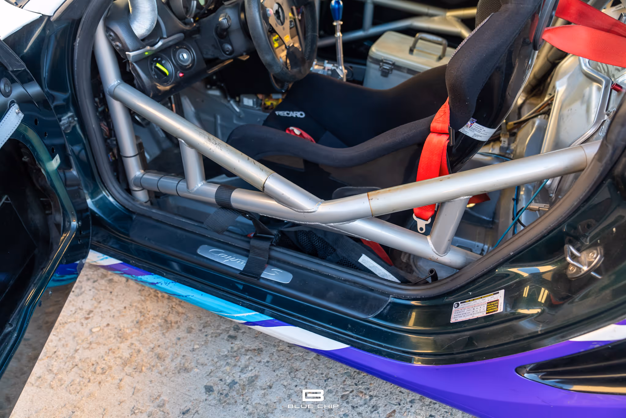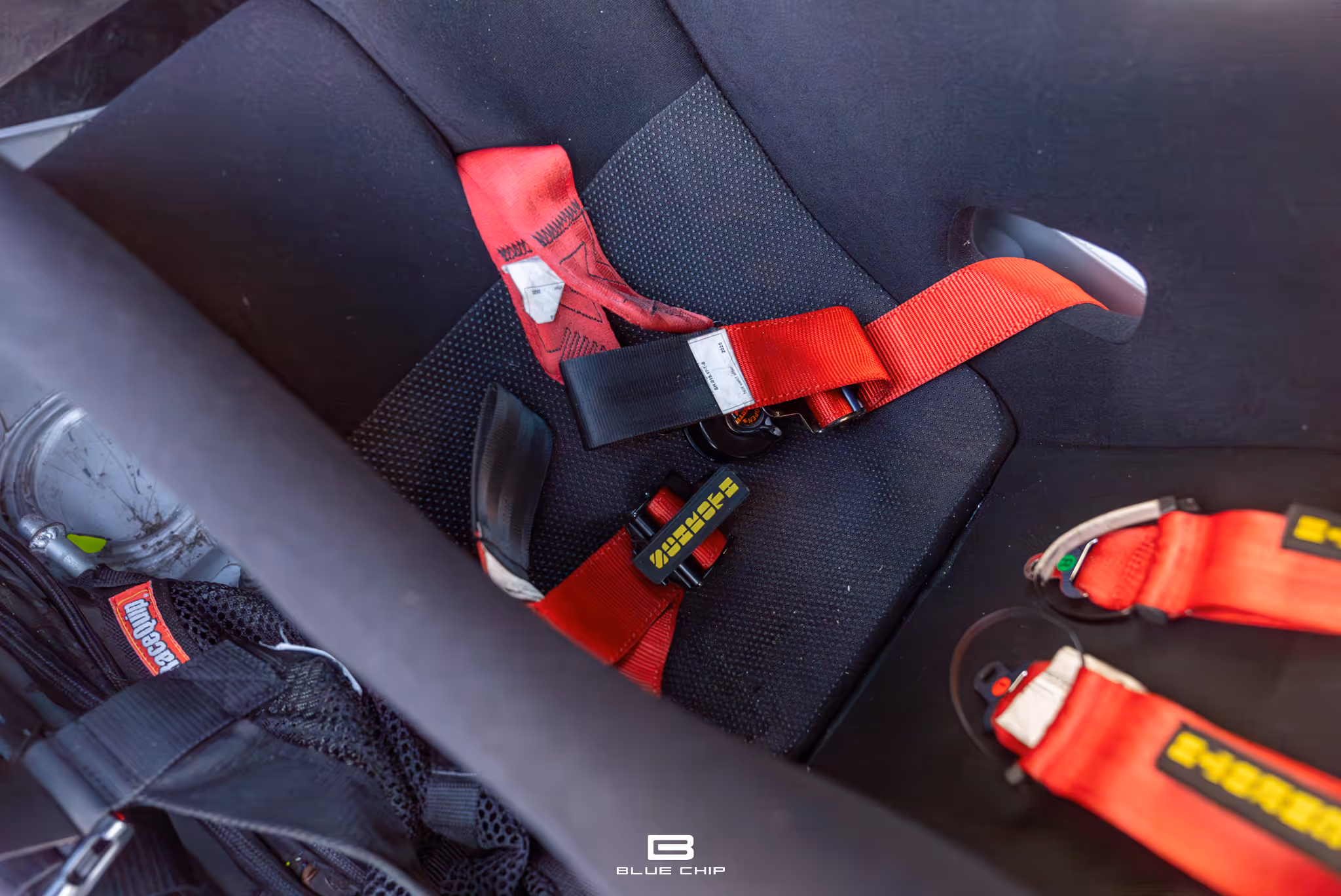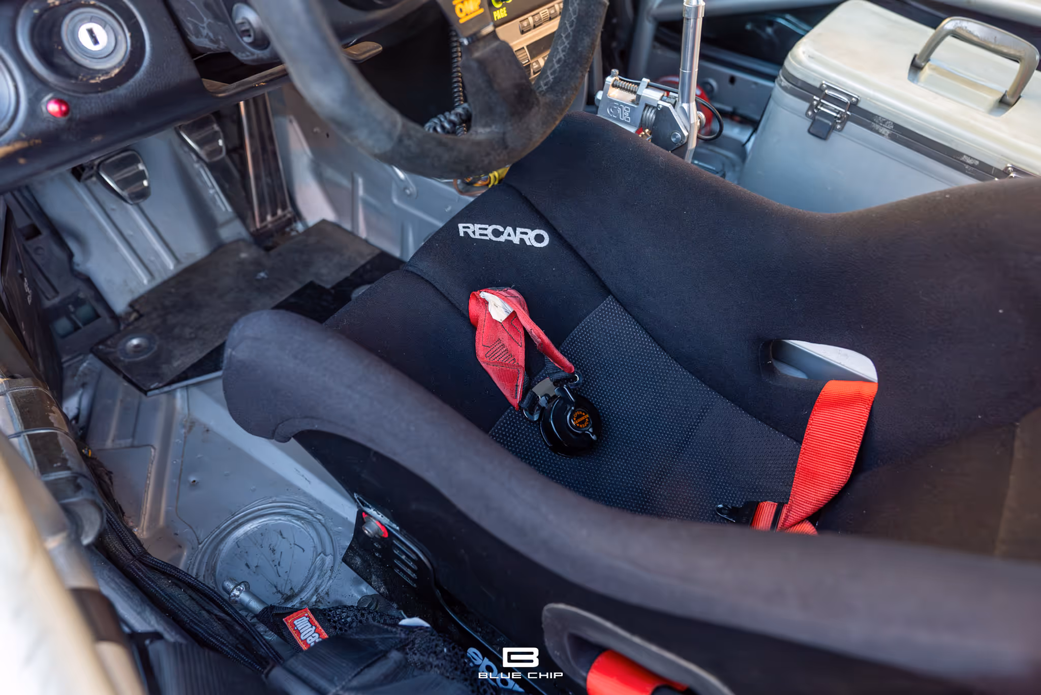 The interior has been stripped for weight reduction, leaving only a single Recaro racing seat with a Schroth Racing harness. Safety features include a full roll cage with door bars, a fire suppression system, and RaceQuip window netting. A CoolShirt system occupies the space of the removed passenger seat. Instrumentation includes a Racelogic OLED display, a GPS data logger with an integrated camera, and an AutoMeter oil temperature gauge in the center stack. The OMP microsuede-wrapped removable steering wheel features a yellow centering stripe.