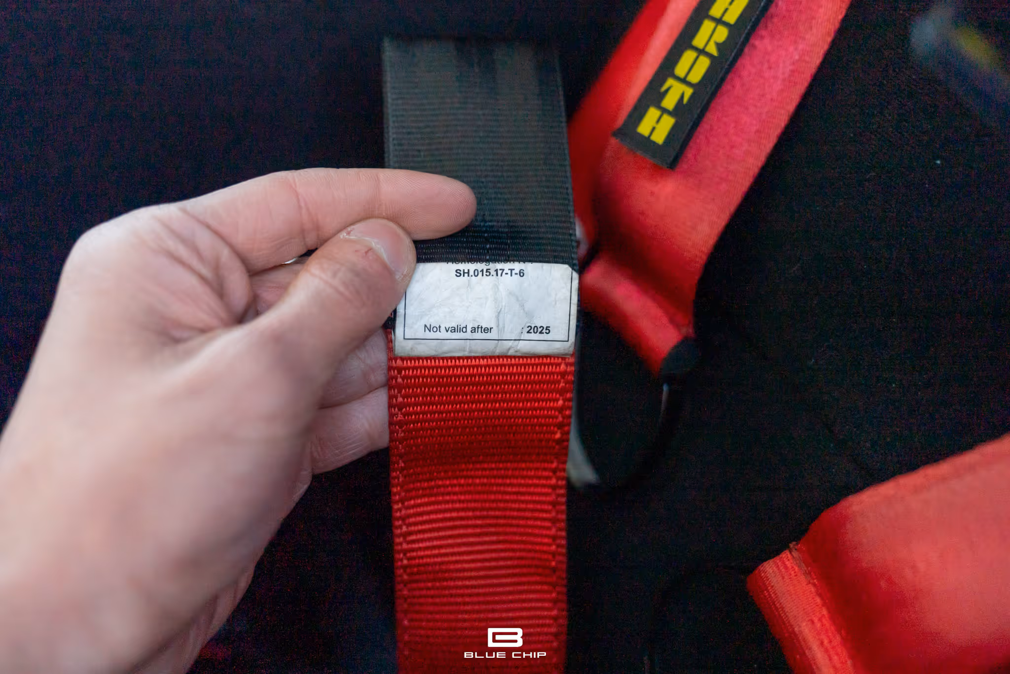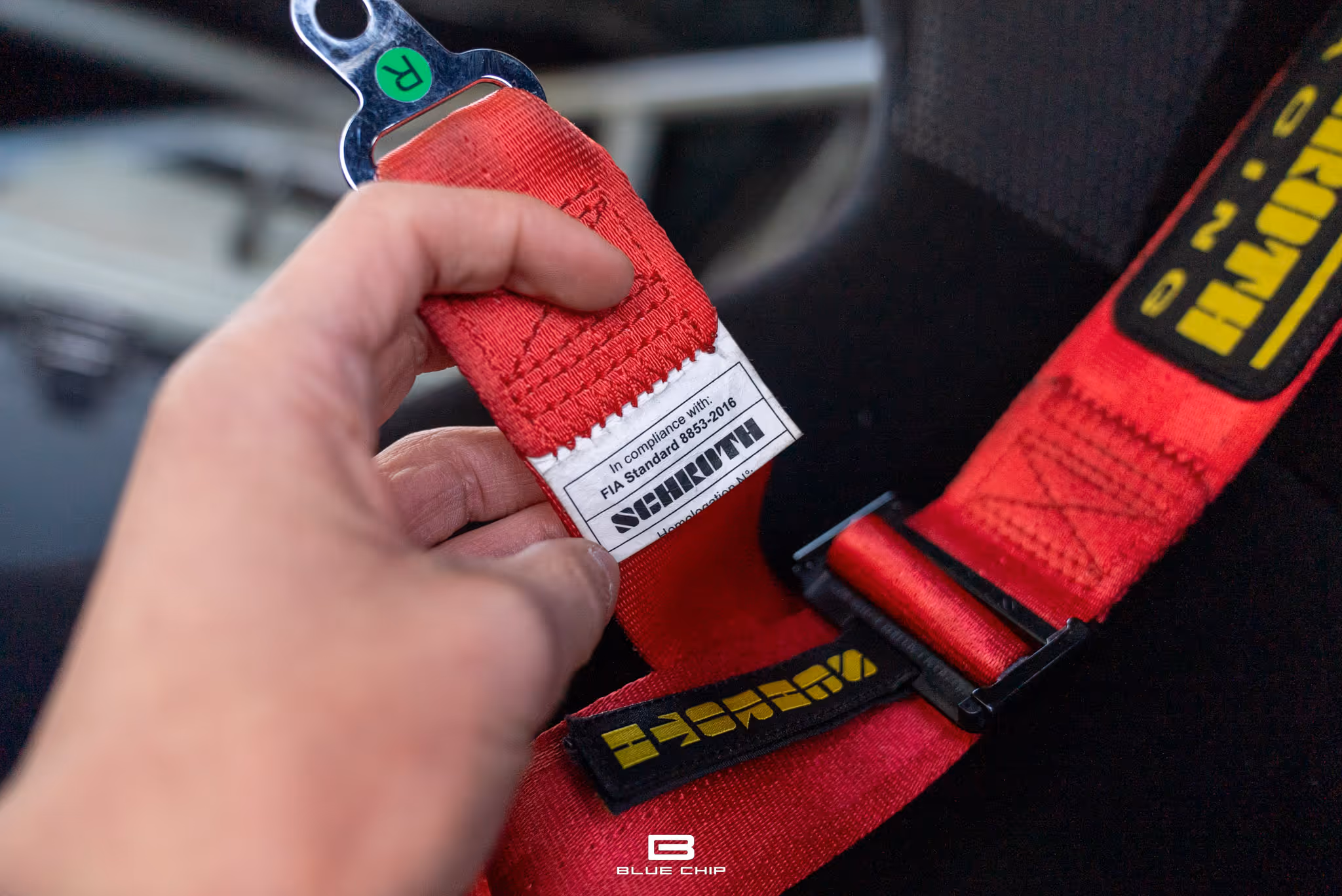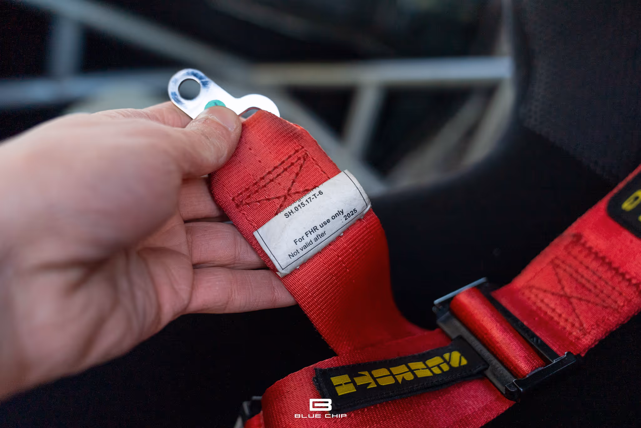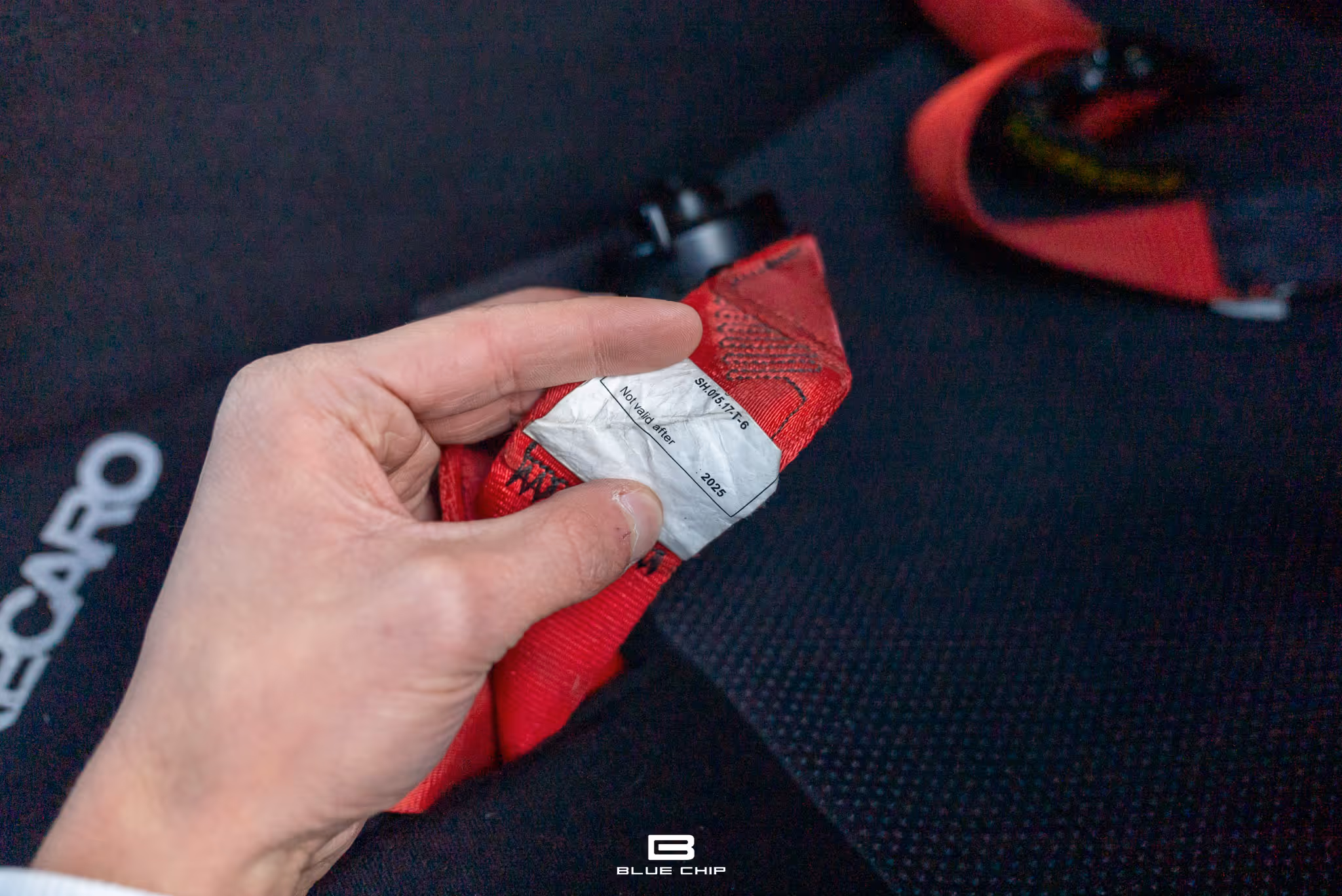 The interior has been stripped for weight reduction, leaving only a single Recaro racing seat with a Schroth Racing harness. Safety features include a full roll cage with door bars, a fire suppression system, and RaceQuip window netting. A CoolShirt system occupies the space of the removed passenger seat. Instrumentation includes a Racelogic OLED display, a GPS data logger with an integrated camera, and an AutoMeter oil temperature gauge in the center stack. The OMP microsuede-wrapped removable steering wheel features a yellow centering stripe.