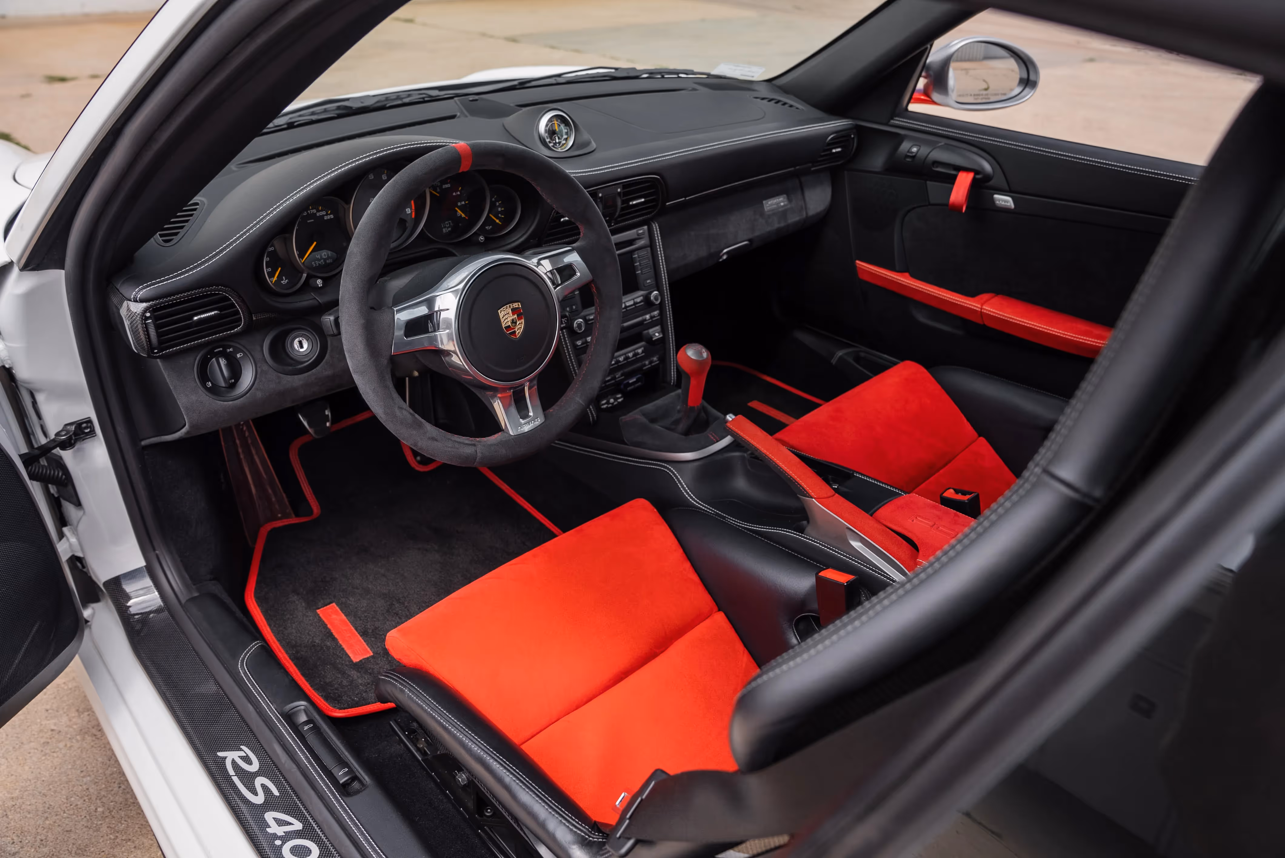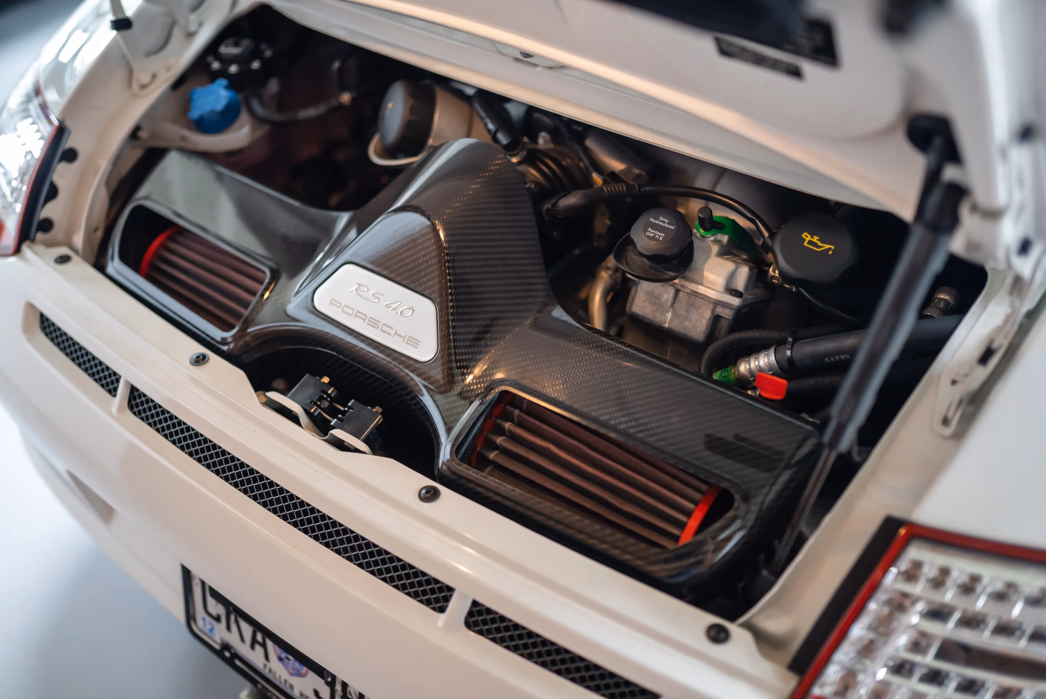 From the Porsche press release 2011: With the 911 GT3 RS 4.0, one of the most popular, coveted and successful production racing cars of the Dr. Ing. hc F. Porsche AG, Stuttgart, on the home straight. The 911 GT3 RS 4.0, limited to 600 vehicles, combines all the characteristics in a road vehicle that have made the Porsche 911 GT3 a serial winner on the racetrack. The new model brings thoroughbred motorsport technology to its core. The crankshaft of the boxer engine was taken unchanged from the six-cylinder engine of the 911 GT3 RSR, the connecting rods of the forged pistons are made of titanium. The four-litre sports engine, the largest 911 series engine of all time, is also the most powerful naturally aspirated engine with 125 hp/litre (92 kW). It reaches its maximum output of 368 kW (500 hp) at 8,250 rpm. The engine delivers its maximum torque of 460 Newton meters at 5,750 rpm. The 911 GT3 RS 4.0 offers truly impressive driving performance. The most meaningful number: It completes the circumnavigation of the Nürburgring-Nordschleife in 7:27 minutes. The 911 GT3 4.0, which is only available with a six-speed sports transmission, sprints from a standing start to 100 km/h in 3.9 seconds, while its transmission designed for the race track takes it to 200 km/h in under 12 seconds. The outstanding driving dynamics of the 911 GT3 RS 4.0 are the result of carefully coordinated details. In addition to the use of racing-typical chassis components, weight reduction is also of the utmost importance. Due to the standard equipment with lightweight components such as bucket seats, bonnet and front fenders made of carbon fiber, plastic rear windows and weight-optimized carpets, the ready-to-drive weight of the two-seater is only 1,360 kilograms with a full tank. At 2.72 kg/hp, the power-to-weight ratio of the 911 GT3 RS 4.0 falls below the magic limit of 3 kilograms per hp. The limited 911 is painted white as standard and its dynamic appearance underscores its closeness to racing. Characteristic are the wide track, the low vehicle position, the large rear wing with adapted side plates, the typical central double tailpipe and the aerodynamically optimized body. The lateral front air deflectors, so-called flics, which are being used for the first time in a production Porsche, are evidence of the aerodynamic precision work. They ensure increased downforce on the front axle and, together with the steeply angled rear wing, bring the vehicle into aerodynamic balance. The result: At top speed, the aerodynamic forces push the 911 GT3 RS 4.0 onto the road with an additional 190 kilograms.