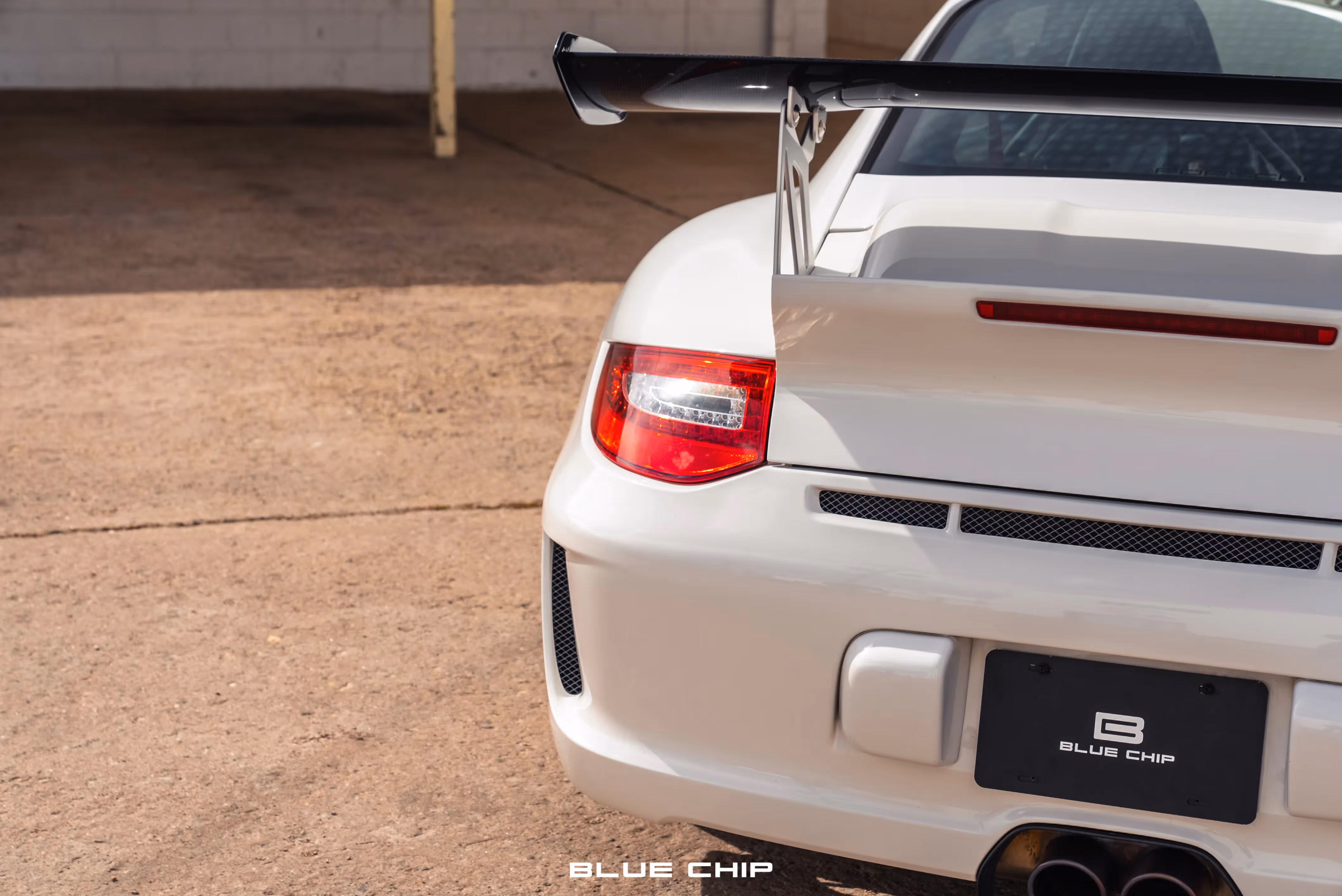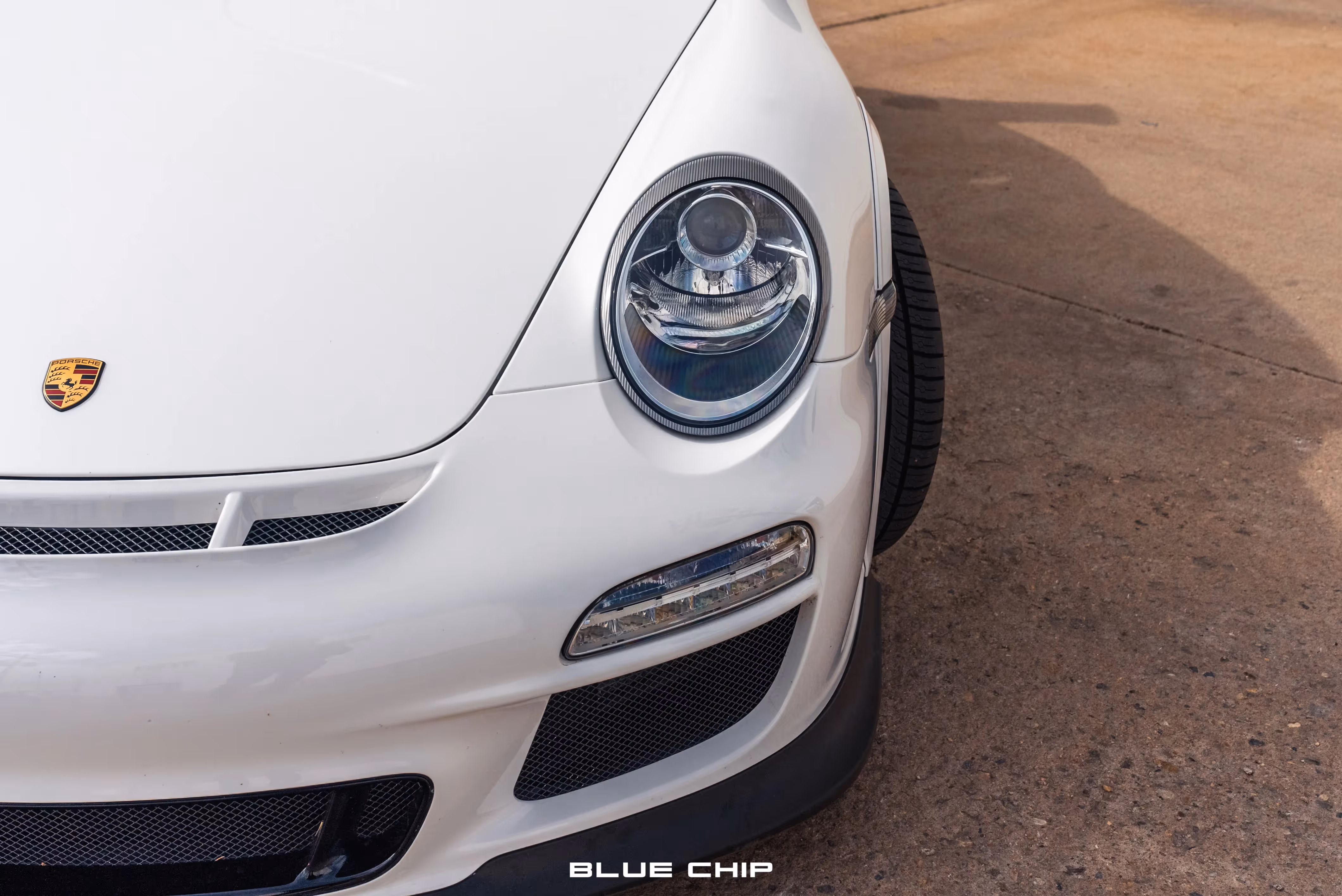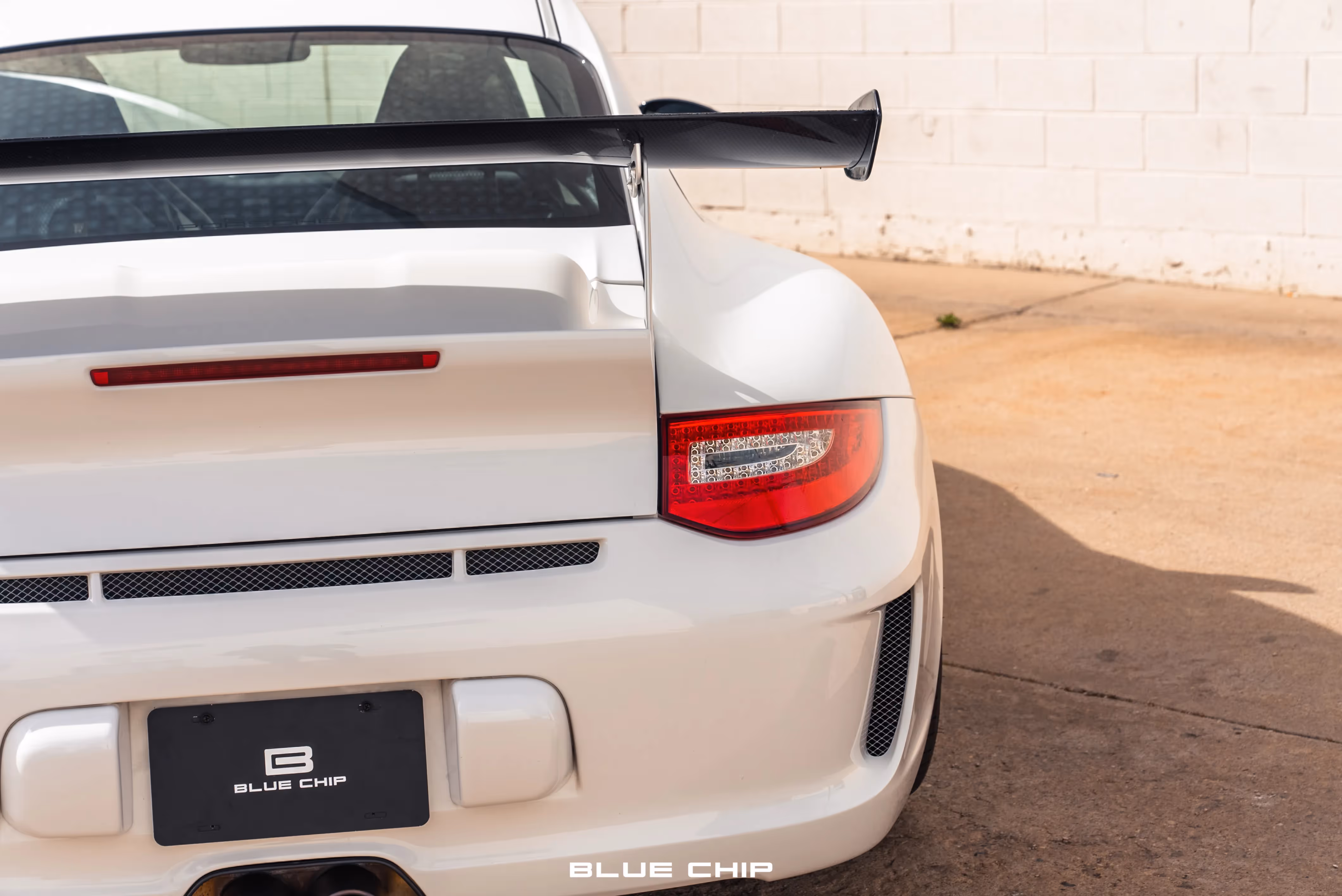 The track-focused RS model features revised lower bodywork when compared to the standard 997.2 GT3. This example was ordered in Carrara White (B4) and was optioned with lightweight headlights as well as deletion of the side graphics and rear model designation. Additional exterior features include front air inlets, clear side markers, a carbon-fiber rear wing, and central dual exhaust outlets.
