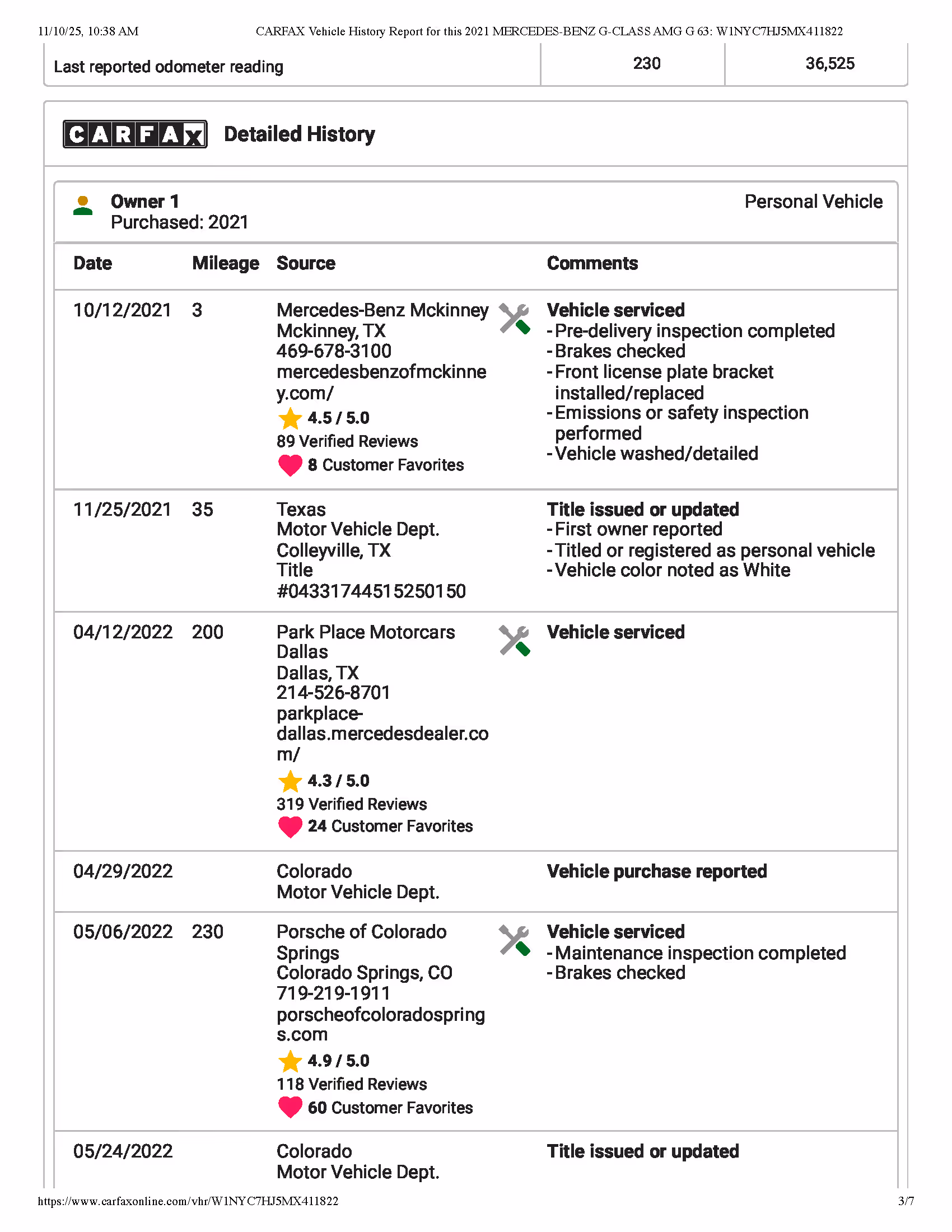 The vehicle's history is clean and well-documented through CARFAX: no accidents, no damage, regular oil changes, and a strong service pedigree with recent highlights including four new tires mounted in February 2025. Over its lifetime, this G63 has benefited from comprehensive care—brake fluid flushes, alignments, emissions system service, battery maintenance, and computer diagnostics—all meticulously recorded.