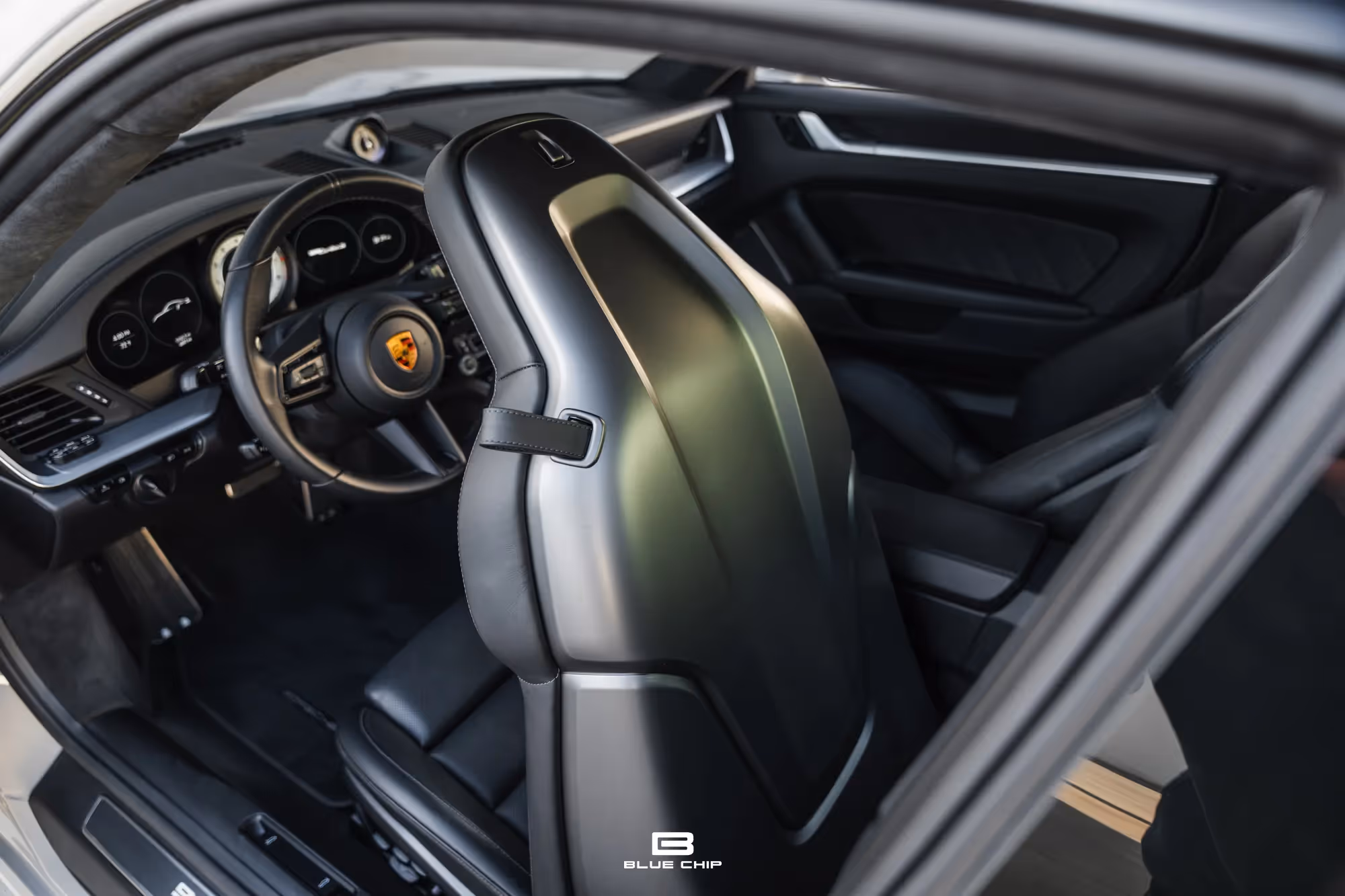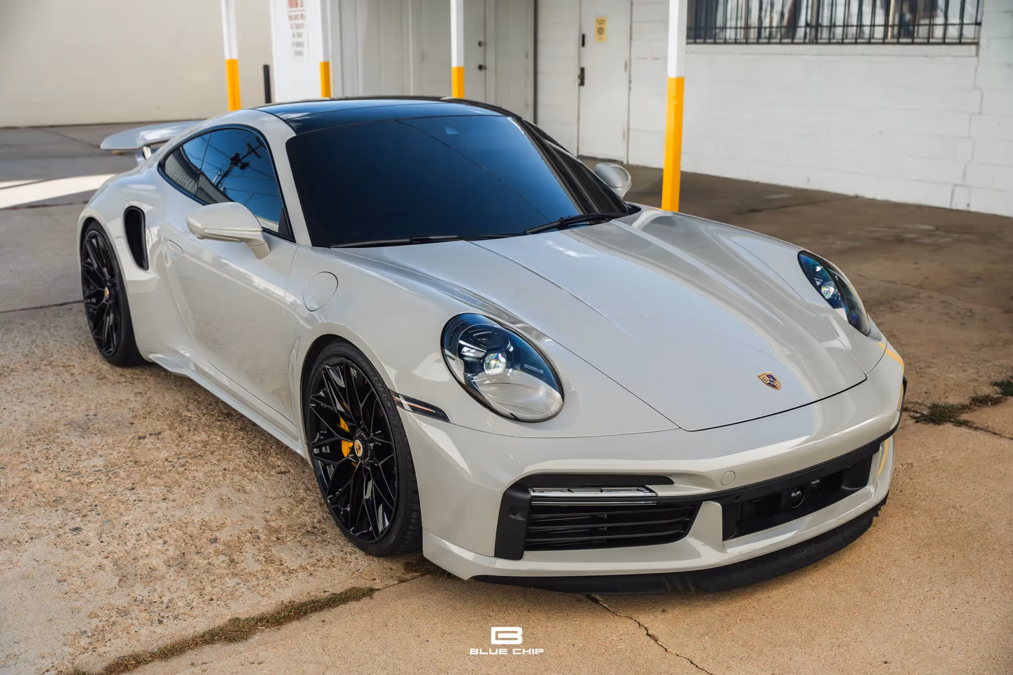 This 992 Turbo S has been modified from stock by the current owner. Modifications include a Kline Exhaust System and a ByDesign custom tune, as well as HRE wheels measuring 21 inches in the front and 22 inches in the rear. Pirelli P Zero tires are fitted in all four corners and wear 2019 date codes. A full body Paint Protection Film has also been installed.