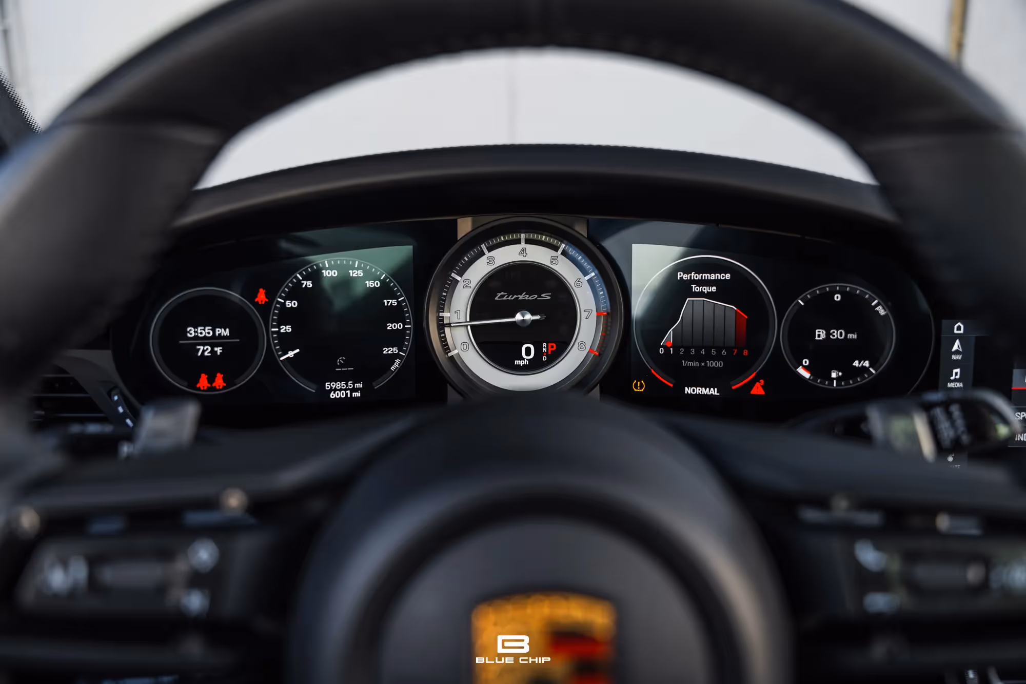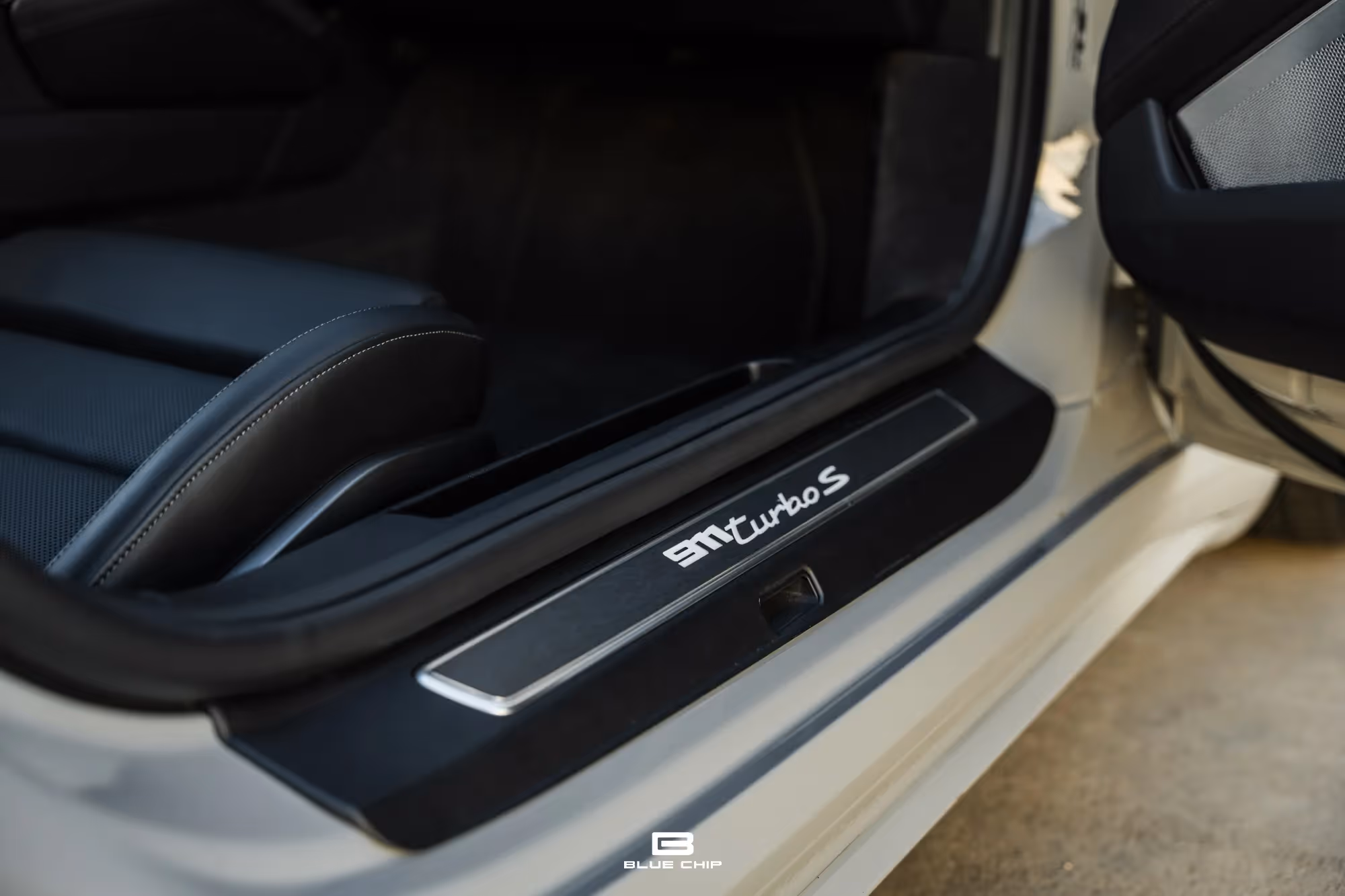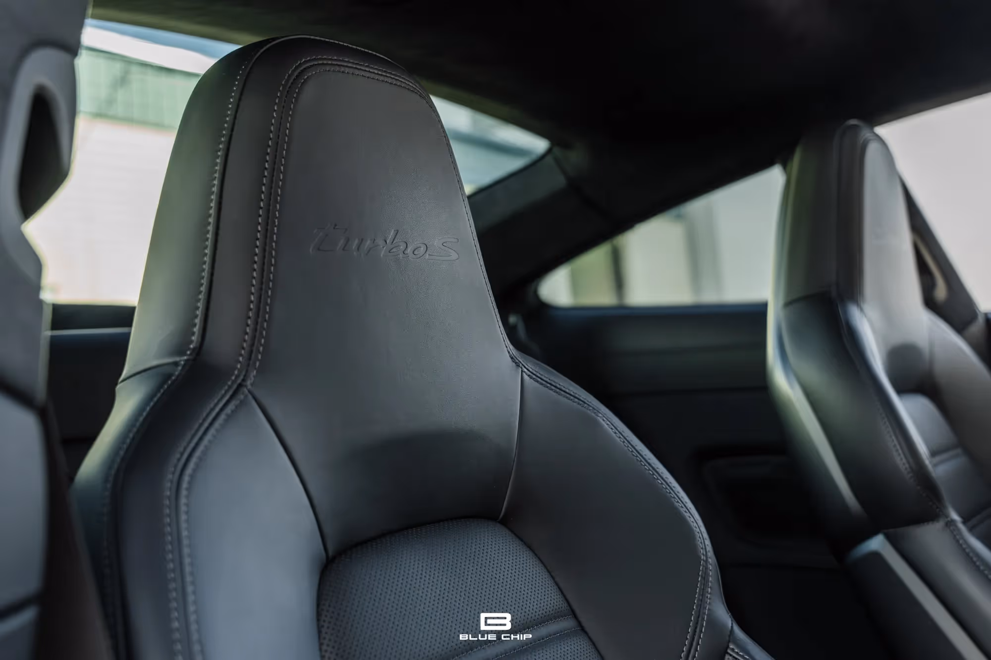 Now offered for sale, Blue Chip is proud to present this 2021 911 Turbo S, finished in Chalk over a Black Leather interior. A very well specified example with an original MSRP of $235,330.00, this 992 has been optioned with the Porsche Active Suspension Management System (PASM), a Sport Exhaust System, a front axle lift system, LED-Matrix Design Headlights in Black including the Porsche Dynamic Light System Plus (PDLS+), Lane Change Assist, Adaptive Cruise Control, and Surround View parking cameras. Inside the cabin, Ventilated 18-way Adjustable Sport Seats are upholstered in Black Leather, which extends to the optional Heated Steering Wheel, the dashboard, the center console, the steering column casing, and the door panels. Brushed aluminum trim accents the cabin, and can be seen on the PDK gear selector, as well as the door sill guards. The center console lid has been adorned with the Porsche Crest, and the central tachometer is finished in White. An optional Burmester High End Surround Sound System has also been fitted, and speakers can be seen throughout the cabin.
