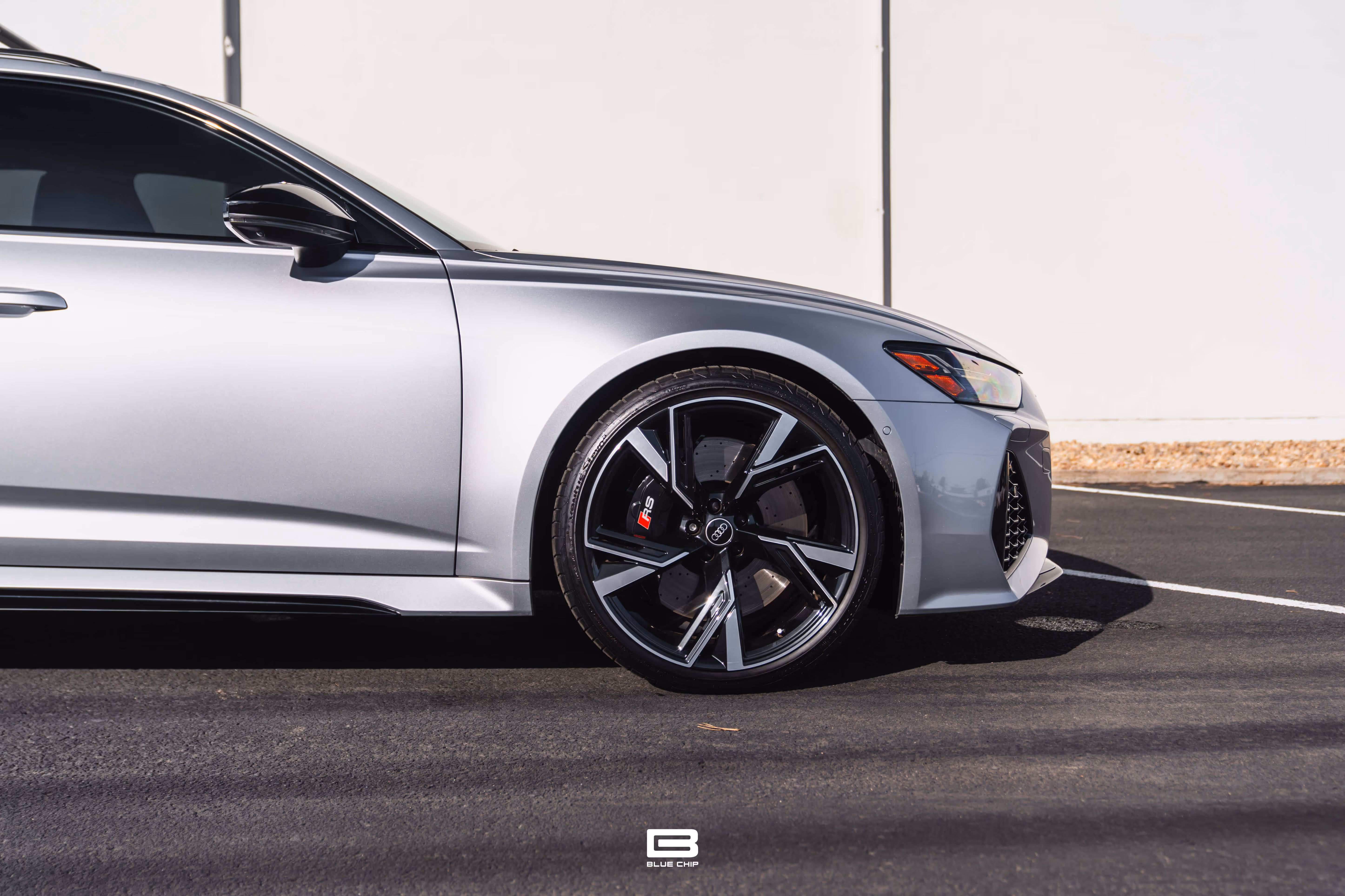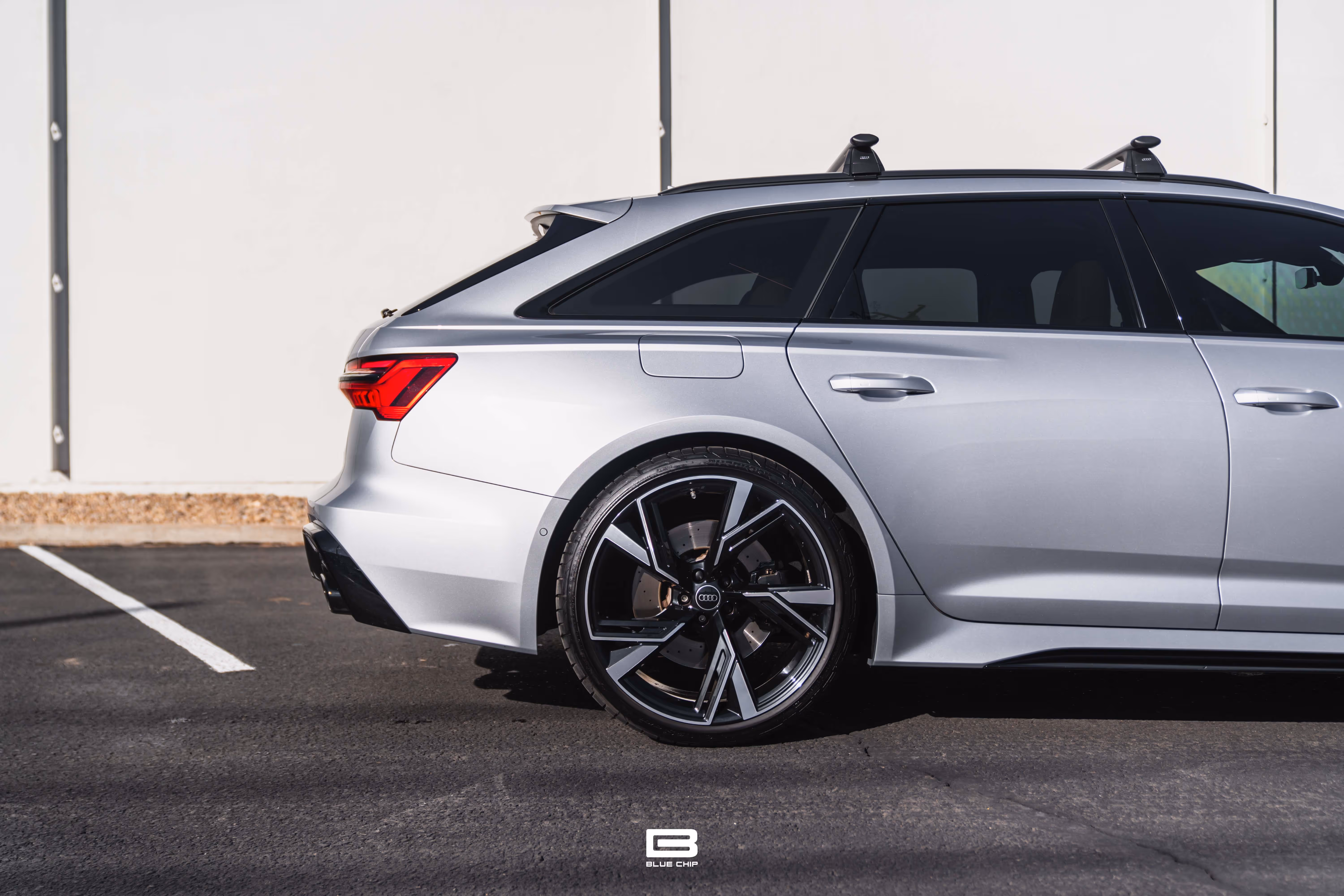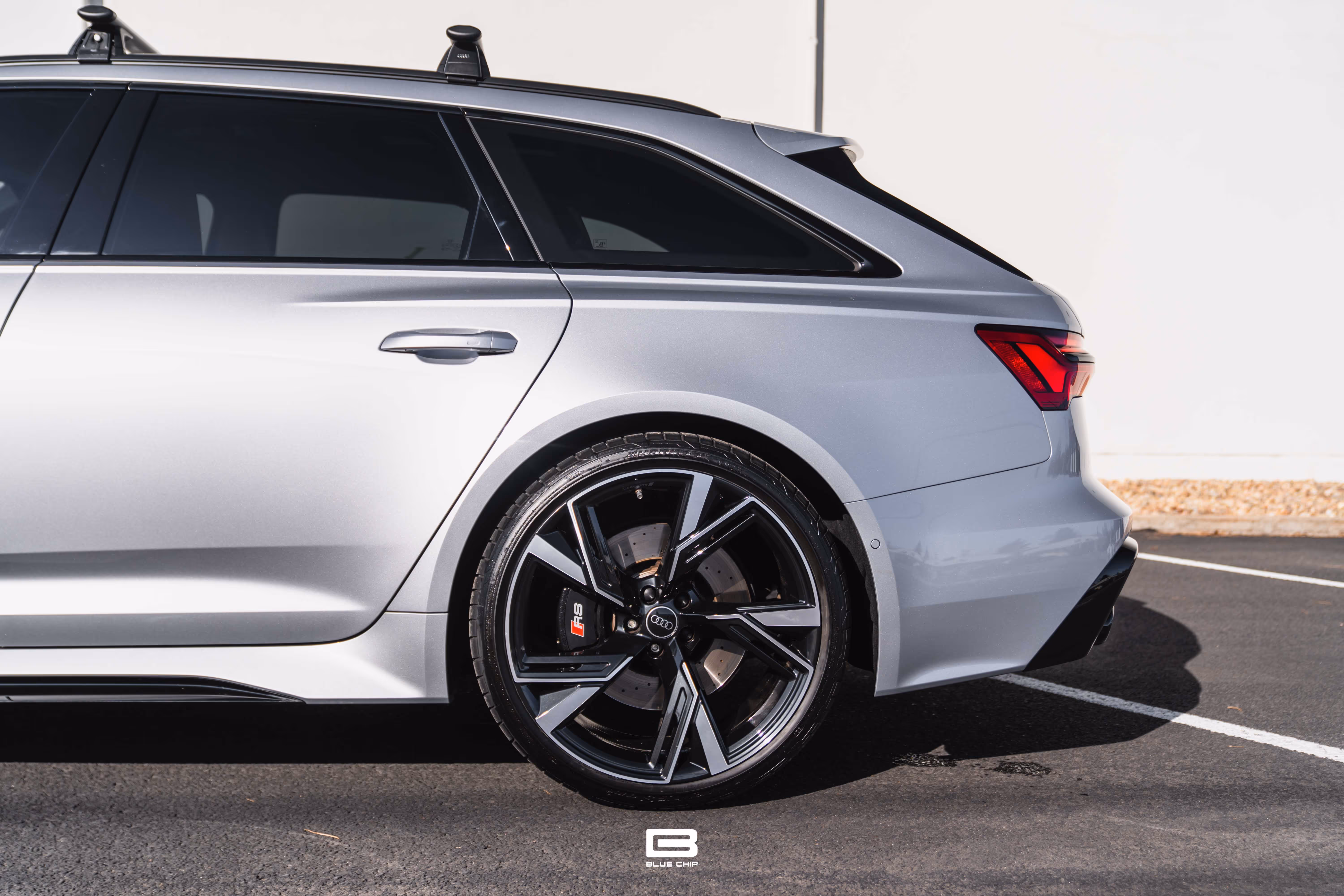 This RS6 Avant is equipped with the Black Optics Package, which adds gloss black exterior trim, giving the car a more aggressive stance. It rides on 22-inch V-Spoke trapezoid design cast aluminum wheels in gloss black, complementing the vehicle’s wide track and aerodynamic design.