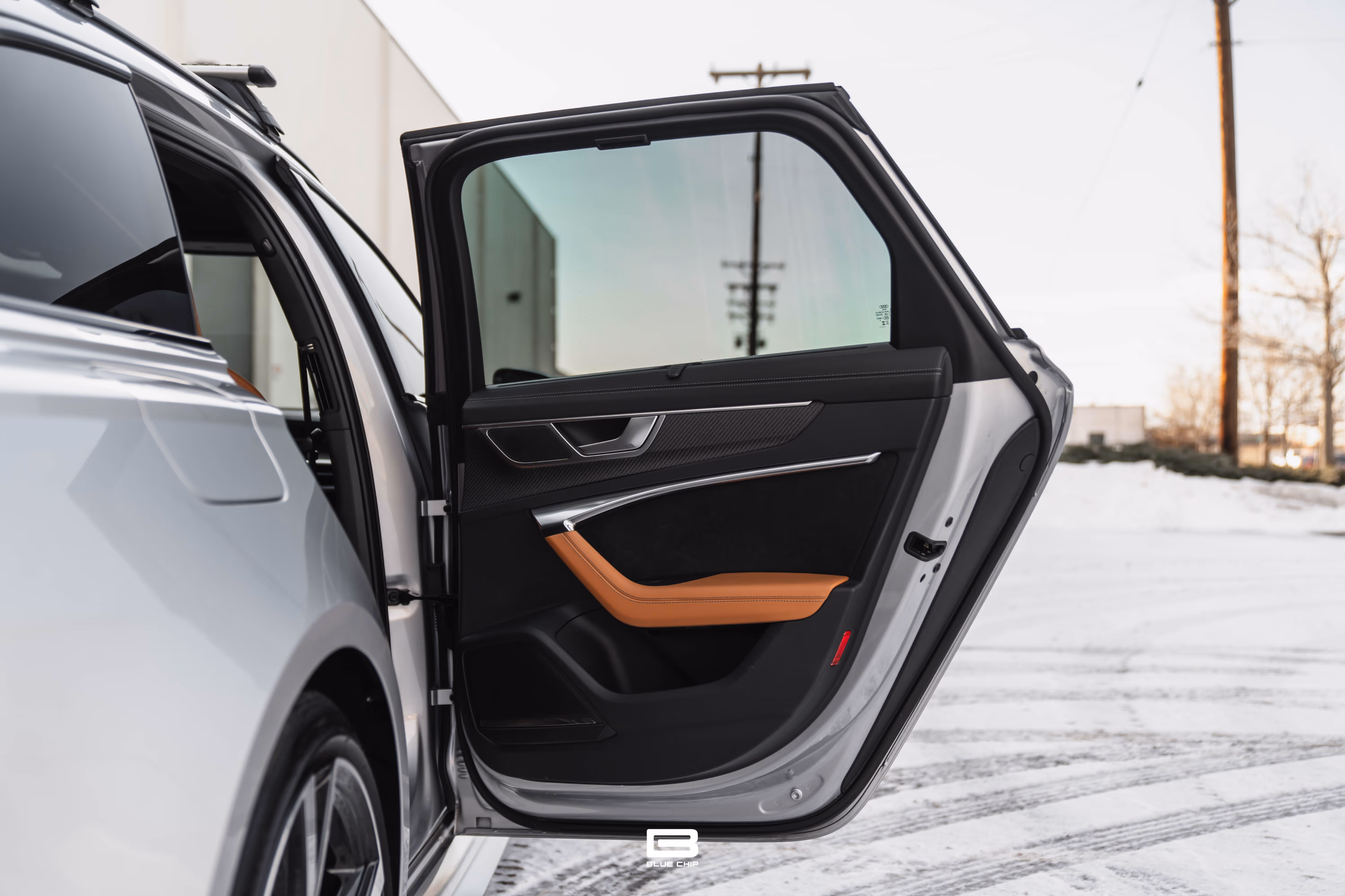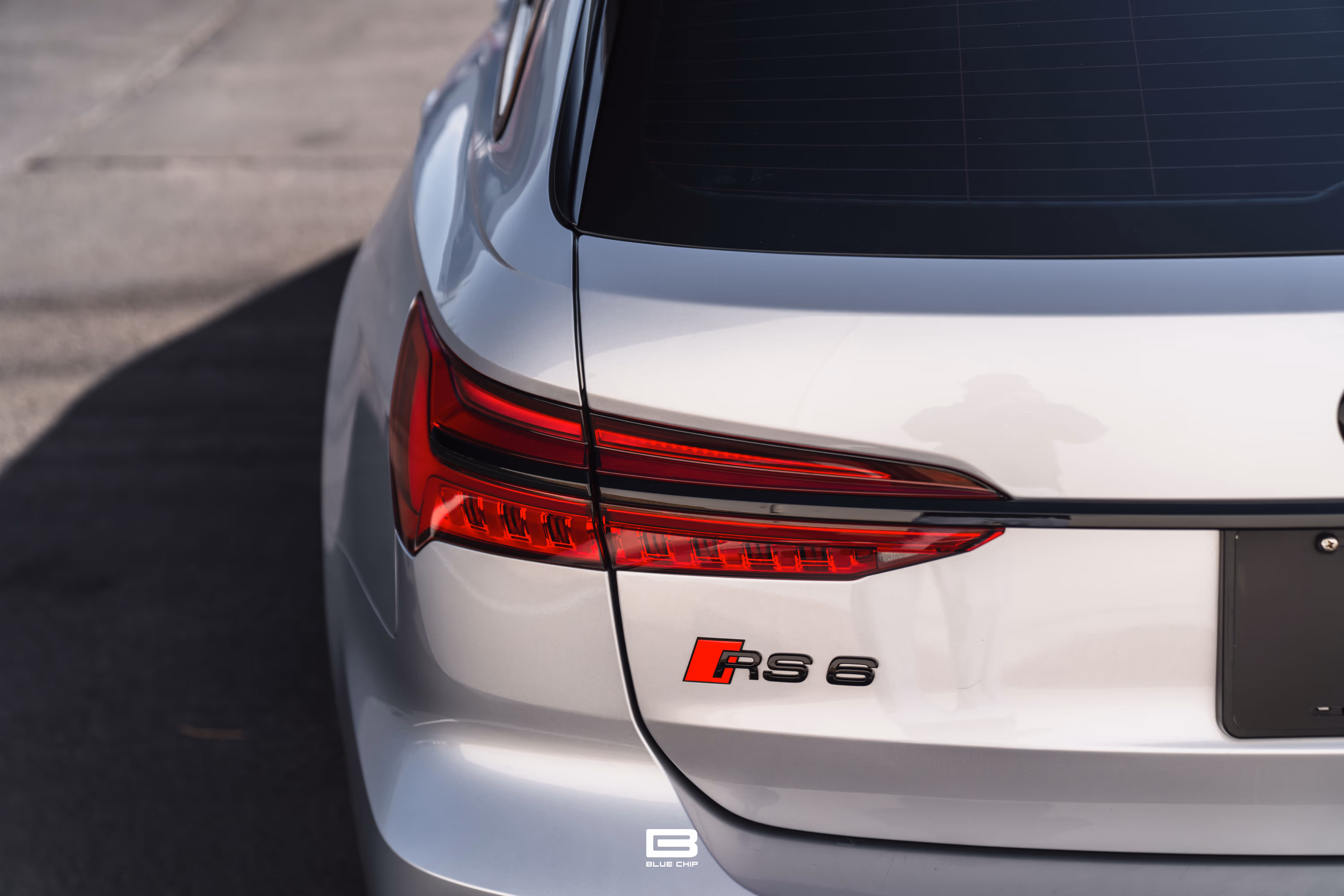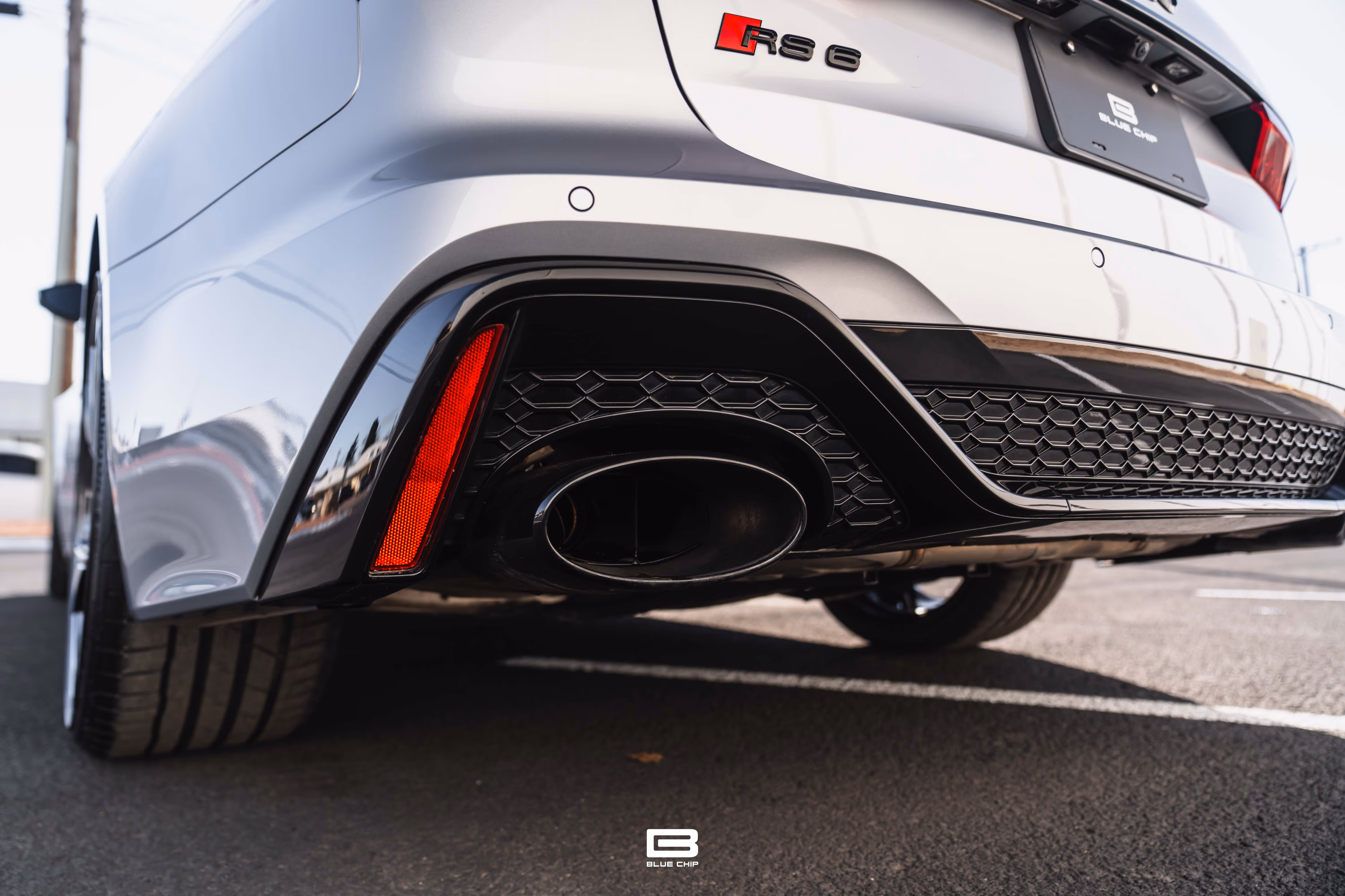 This RS6 Avant is equipped with the Black Optics Package, which adds gloss black exterior trim, giving the car a more aggressive stance. It rides on 22-inch V-Spoke trapezoid design cast aluminum wheels in gloss black, complementing the vehicle’s wide track and aerodynamic design.