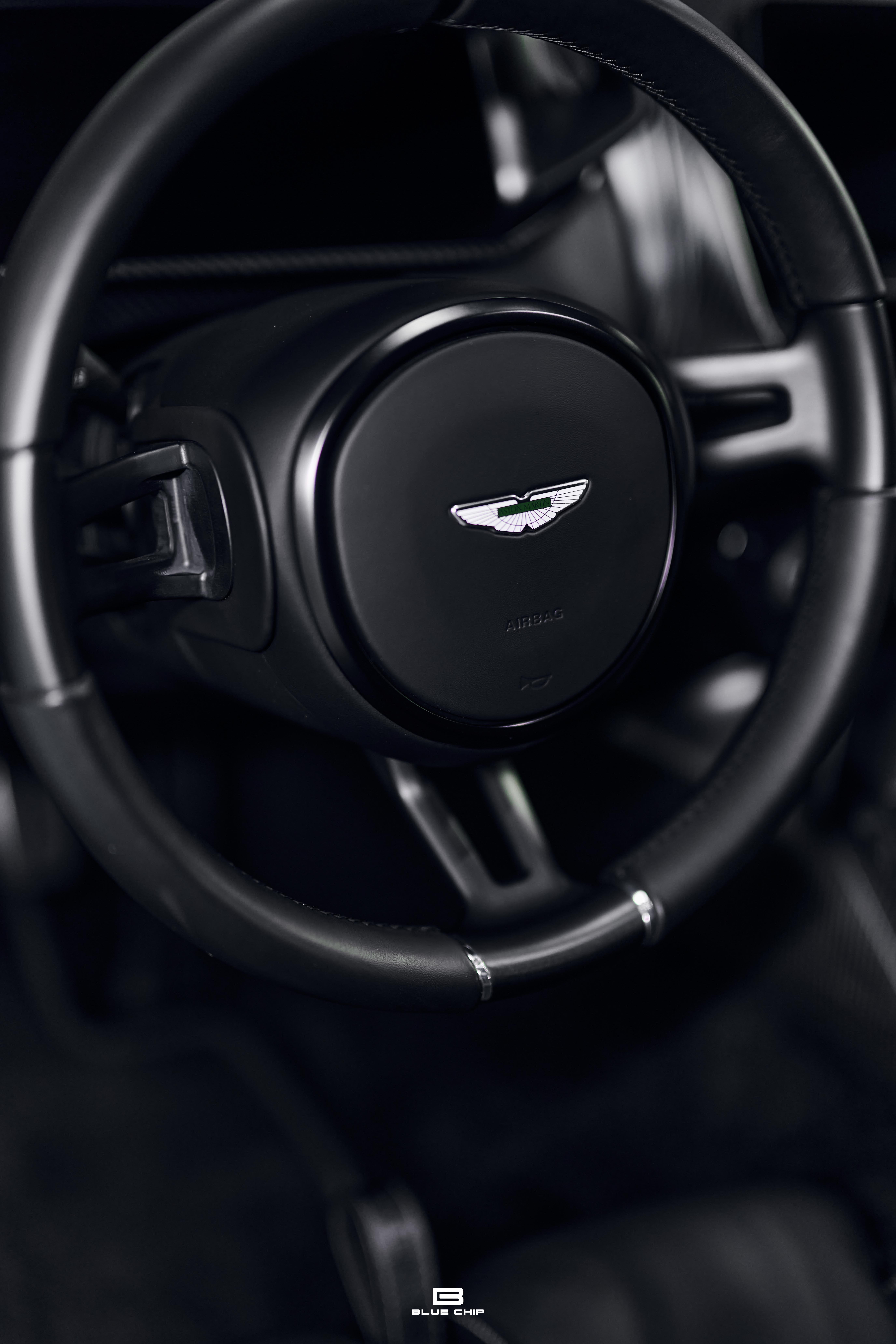 The interior strips away all pretense. The first road-legal Aston Martin to feature a half cage formed from high-tensile steel, bolstering torsional rigidity and available with optional four-point racing harnesses. The steering wheel carries no buttons or controls—only Alcantara wrapping over machined aluminum spokes, with a metal marker at twelve o'clock. Alcantara lines all surfaces above the driver's waist, whilst carbon fiber cases the doors, center console, and performance seat shells. Brushed steel pedals feature a drilled design that references 1970s race cars.