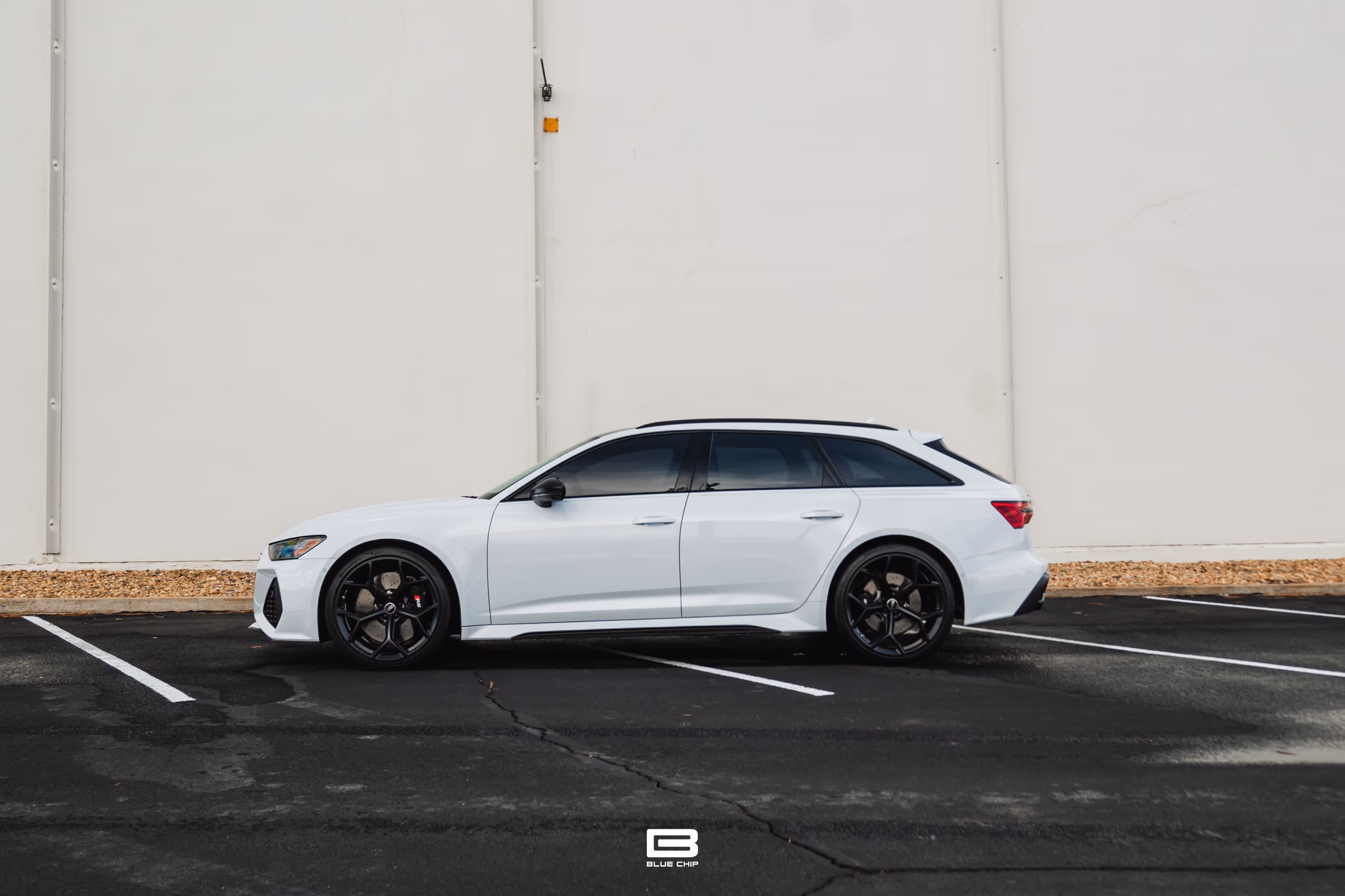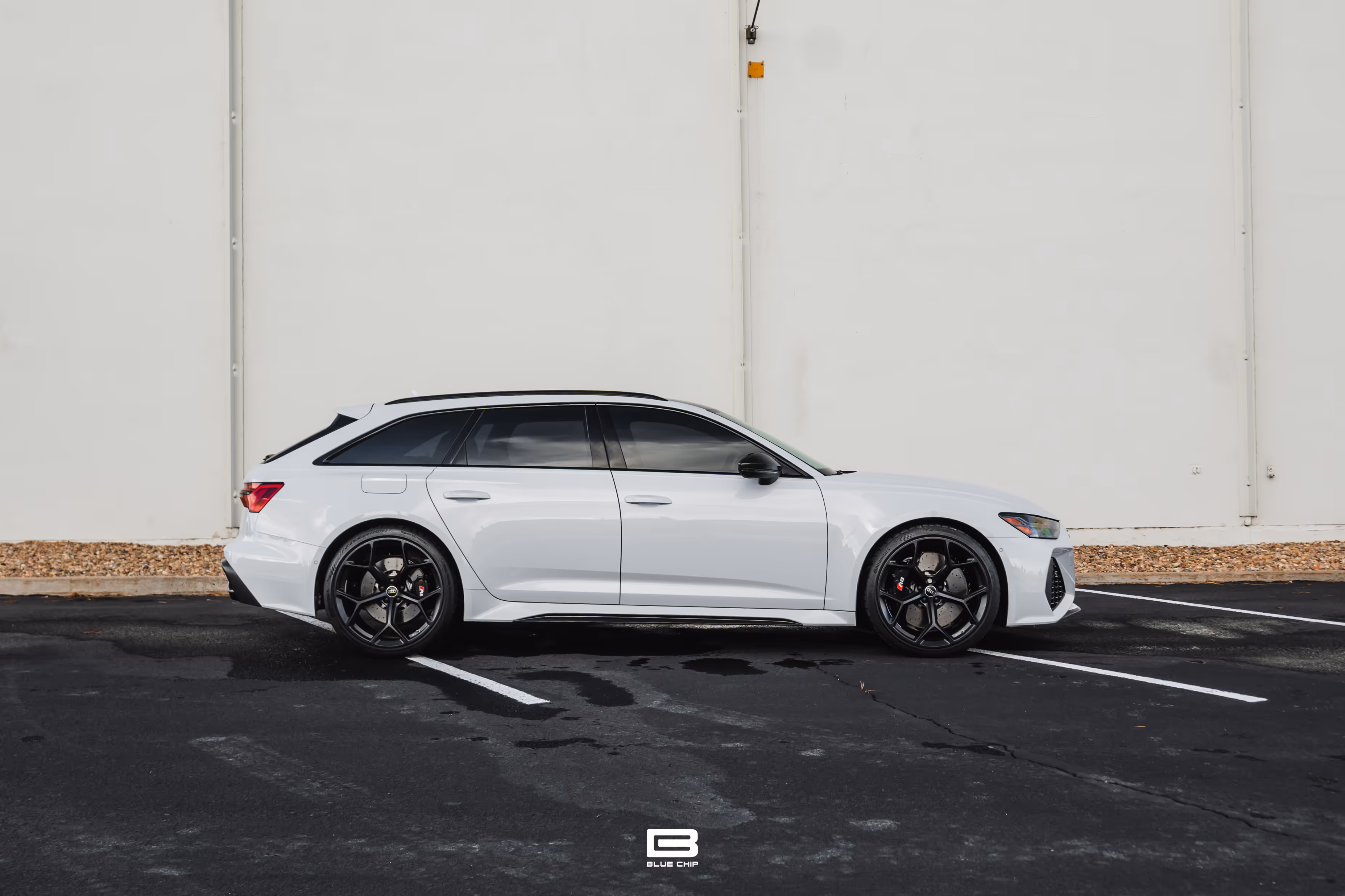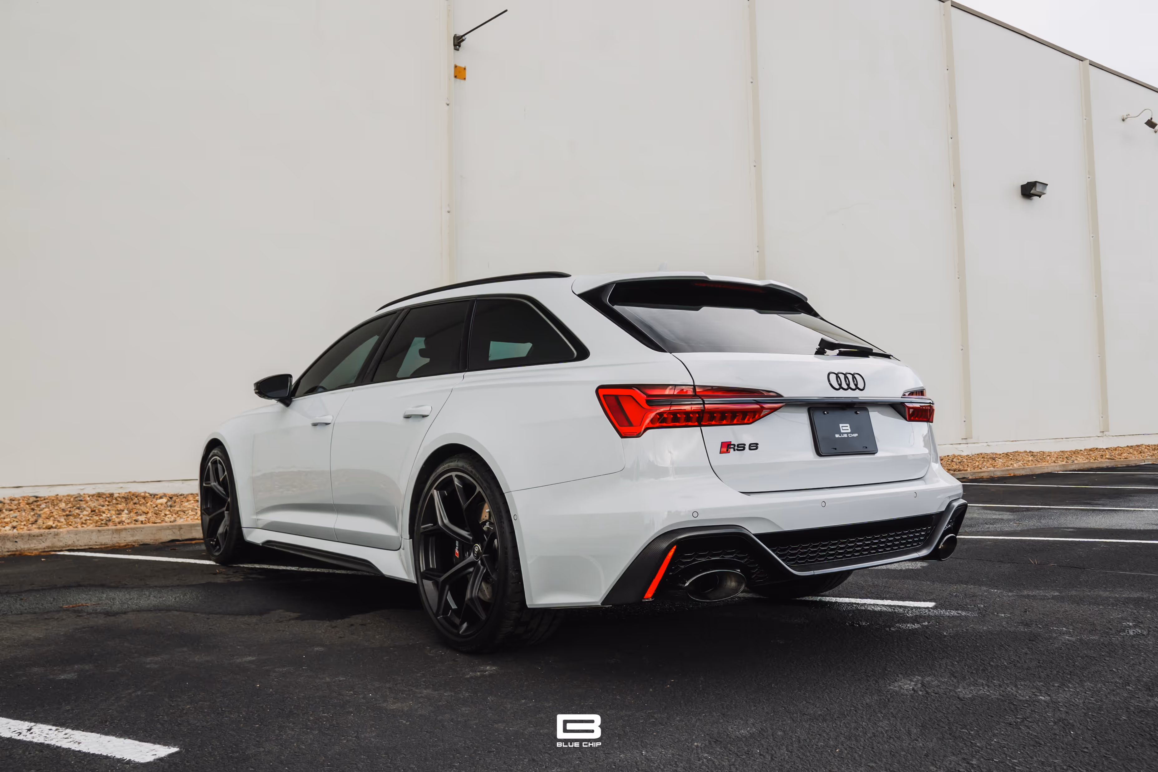 The RS6 Performance rides on 22-inch lightweight wheels, contributing to a 20-kilogram reduction in unsprung mass. Larger turbochargers and increased boost pressure improve throttle response, while an optional carbon-ceramic braking system provides increased stopping power and reduces overall weight by an additional 34 kilograms.