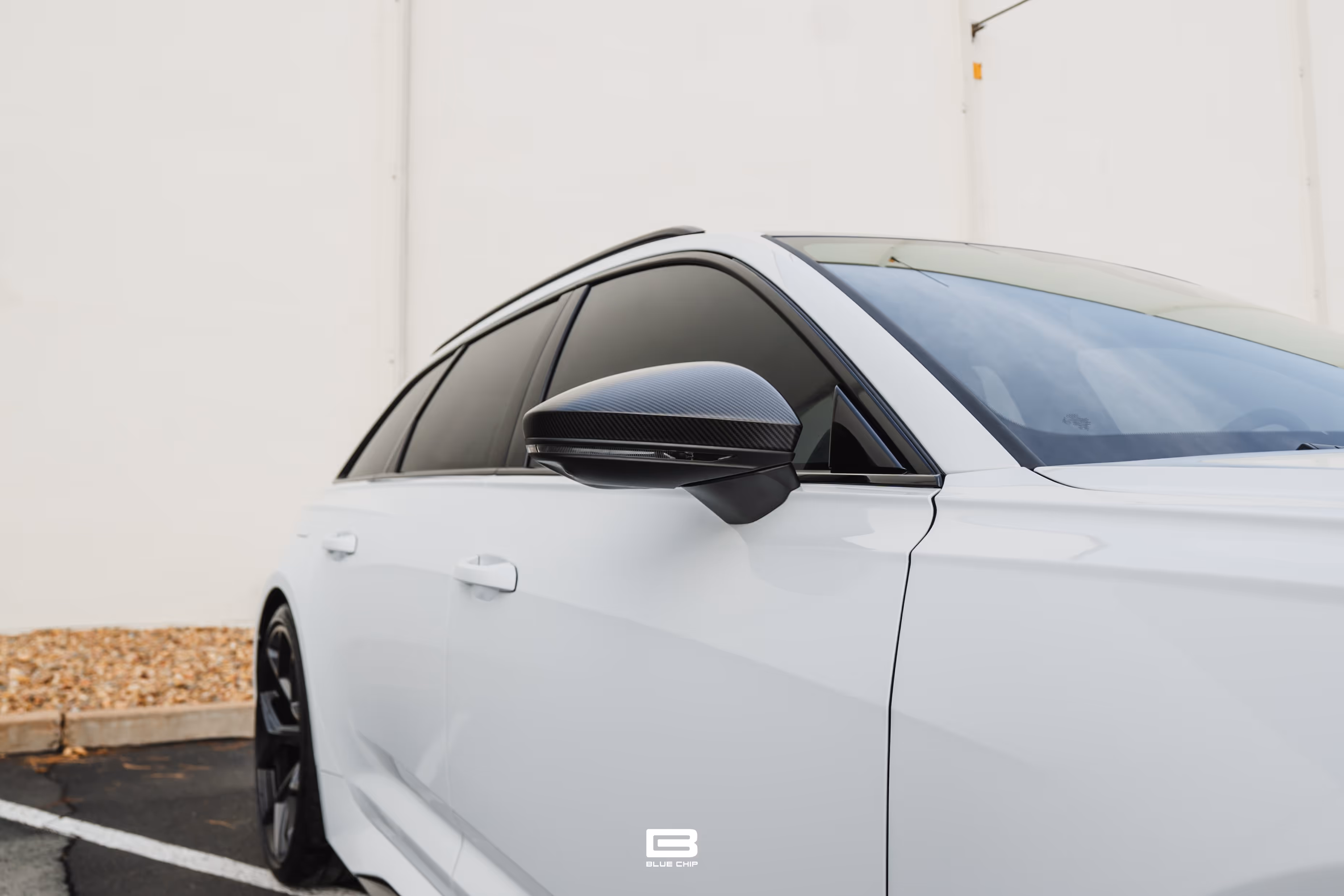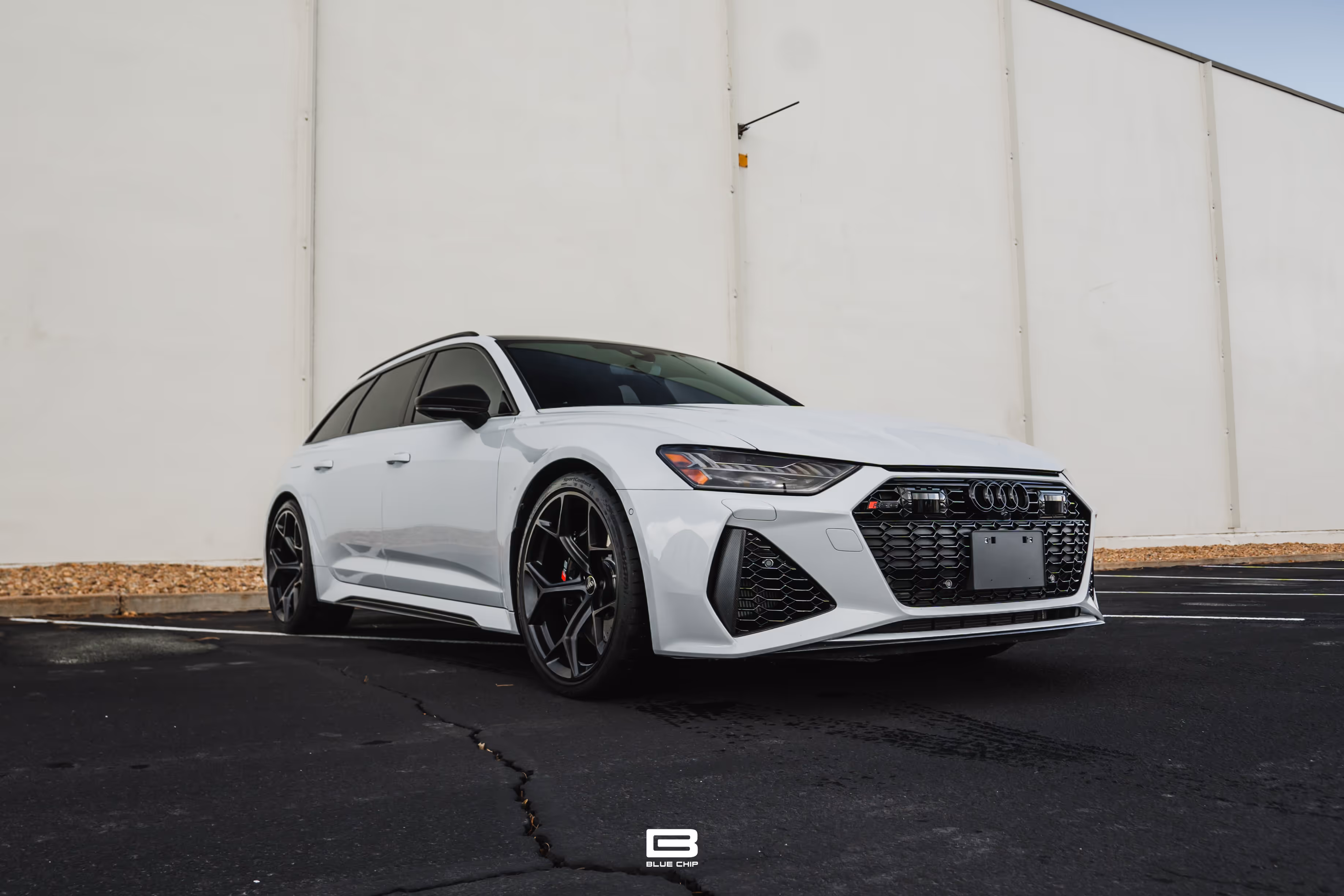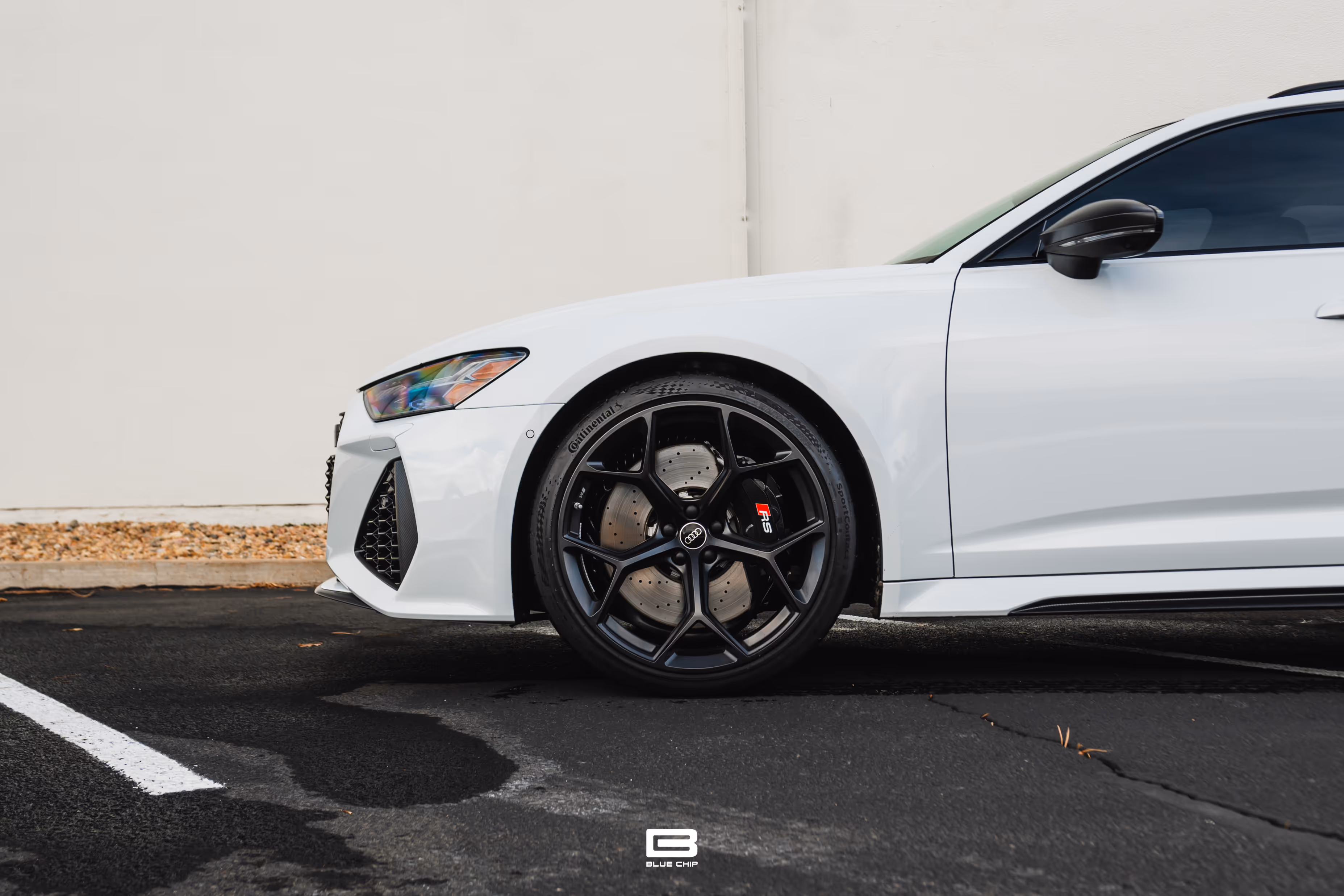 The RS6 Performance rides on 22-inch lightweight wheels, contributing to a 20-kilogram reduction in unsprung mass. Larger turbochargers and increased boost pressure improve throttle response, while an optional carbon-ceramic braking system provides increased stopping power and reduces overall weight by an additional 34 kilograms.