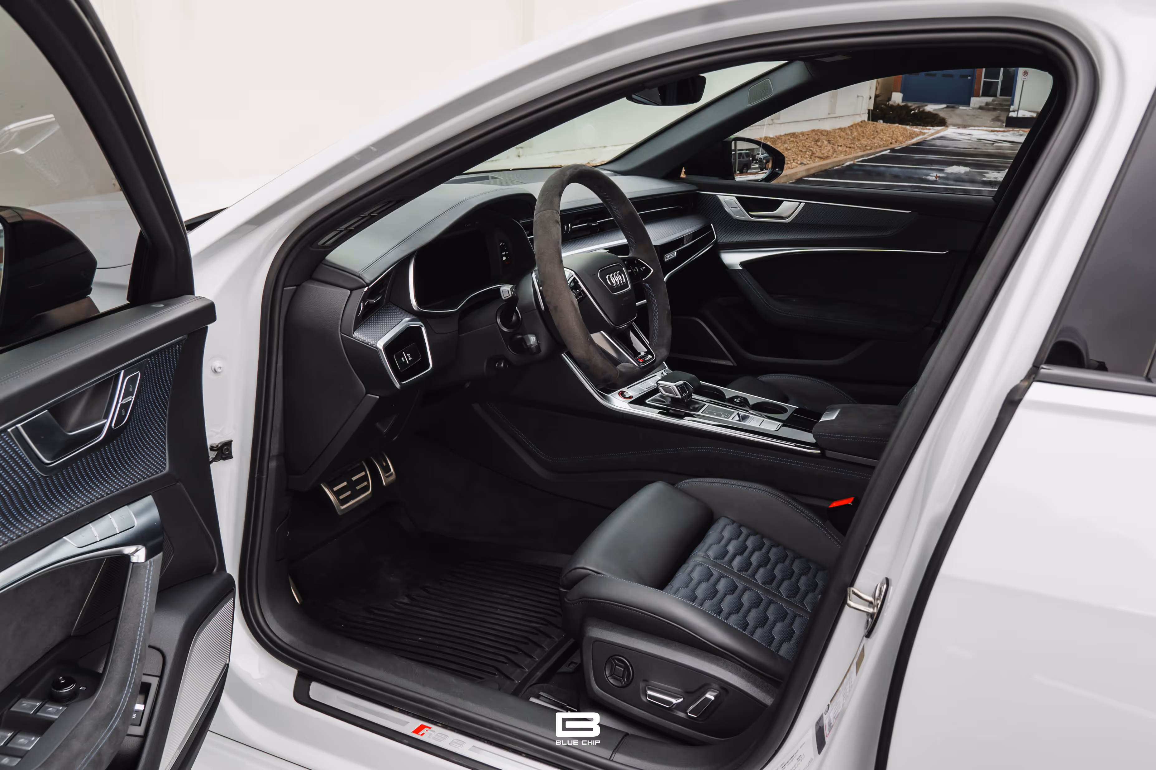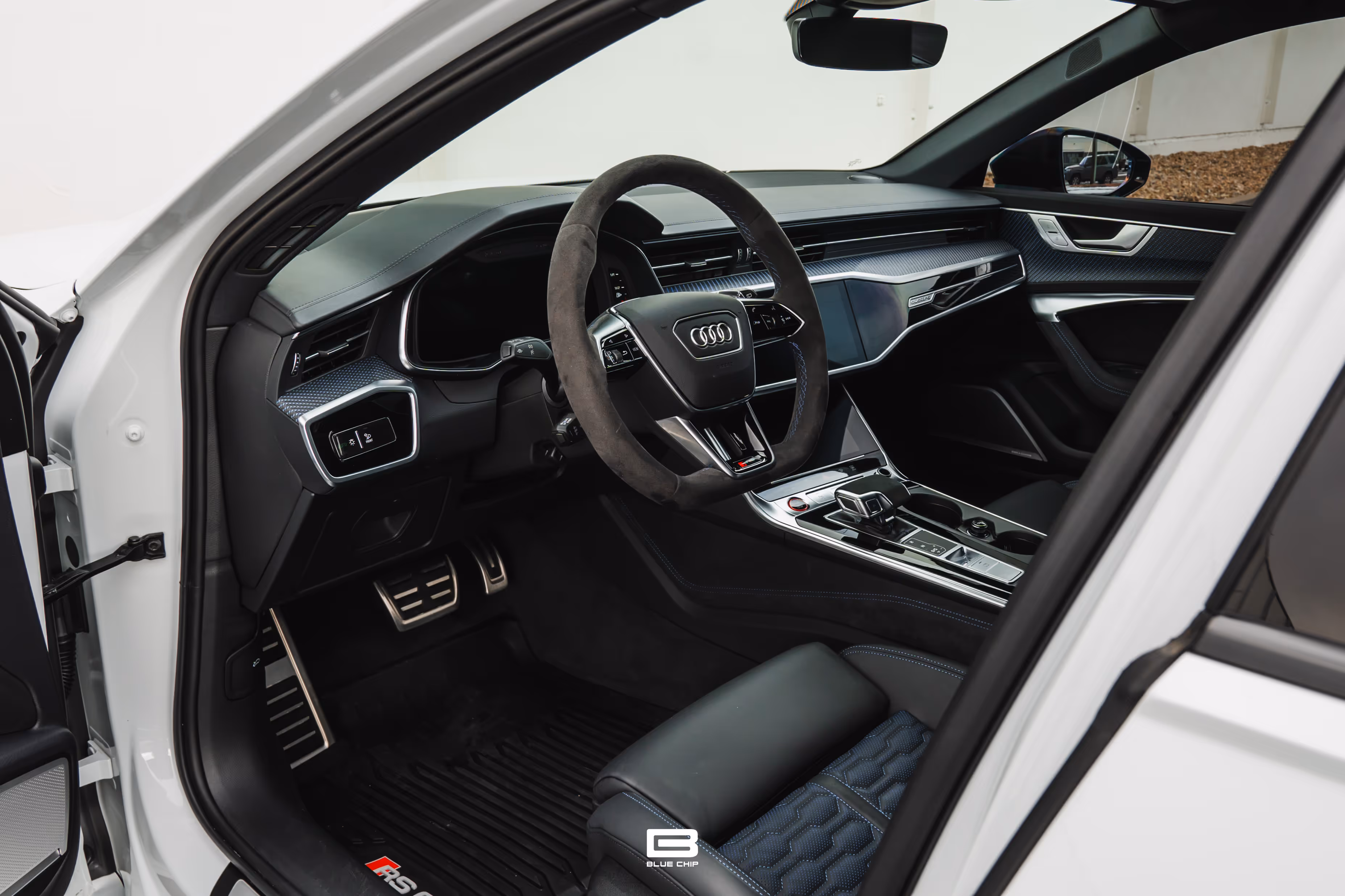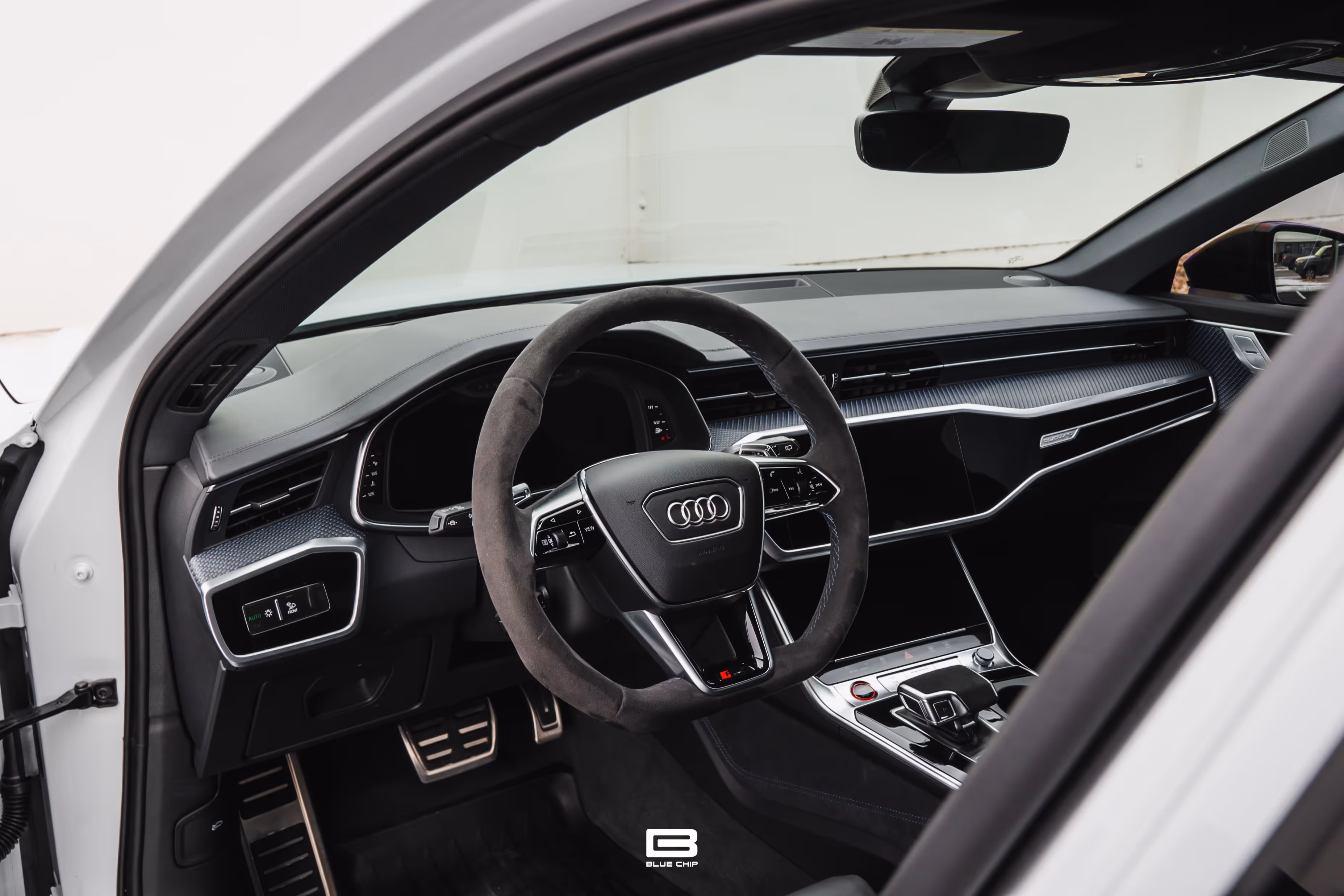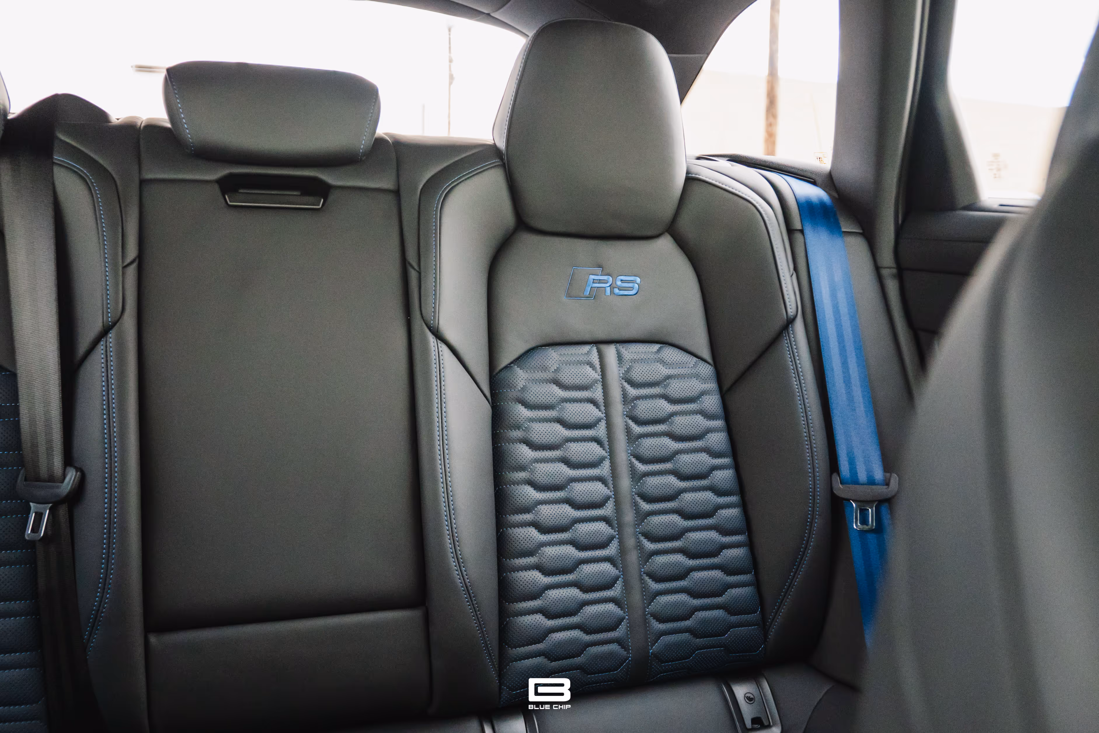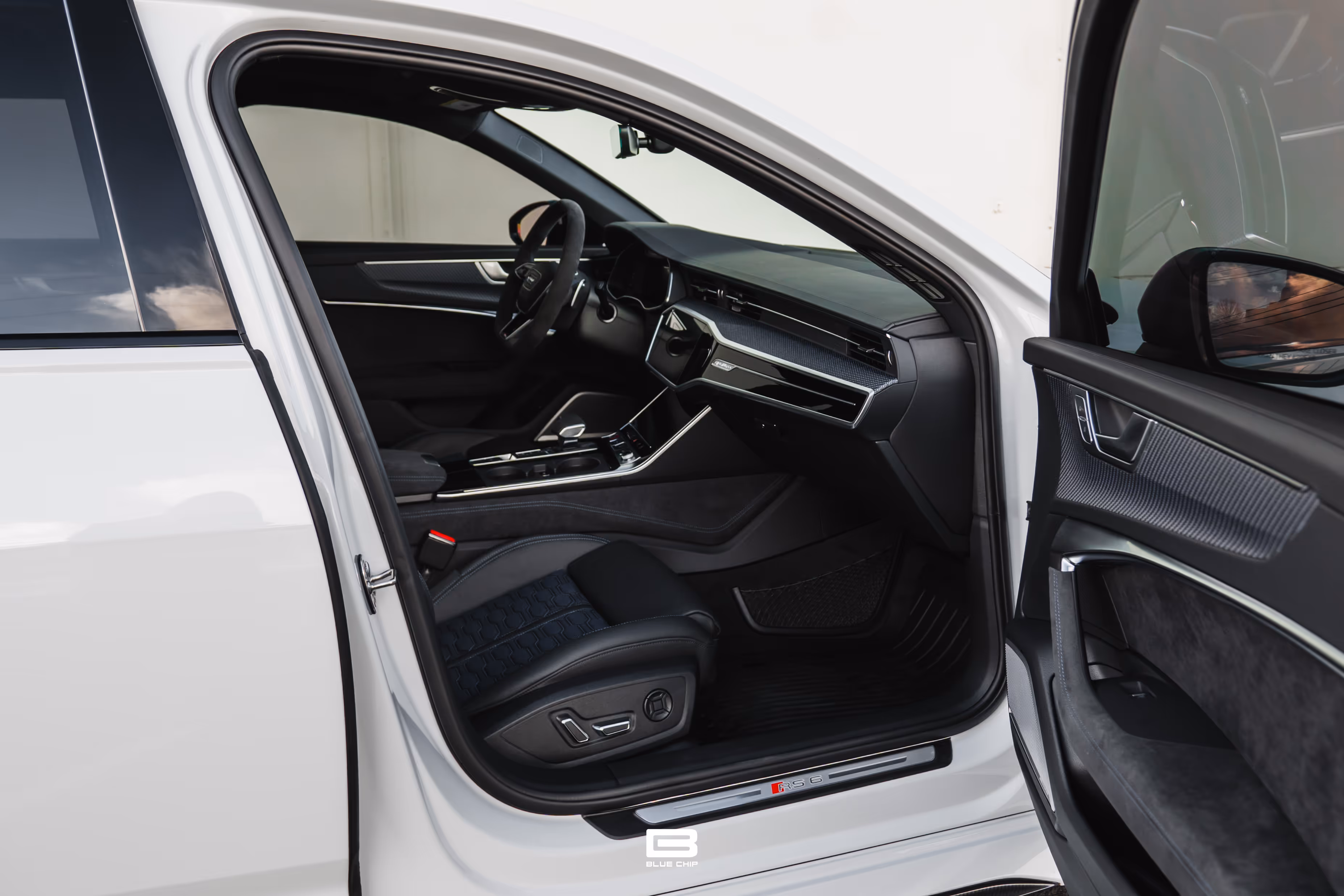 The interior combines functionality with a driver-focused layout. Audi’s Virtual Cockpit displays RS-specific performance metrics, while the dual-screen MMI Touch Response system integrates navigation, media, and climate controls. The Black Leather upholstery is accented with Mercato Blue stitching, and the RS Design Package introduces additional Alcantara and carbon-fiber elements throughout the cabin. A Bang & Olufsen 3D sound system and an array of driver assistance features, including adaptive cruise control and a 360-degree camera system, provide additional refinement and convenience.