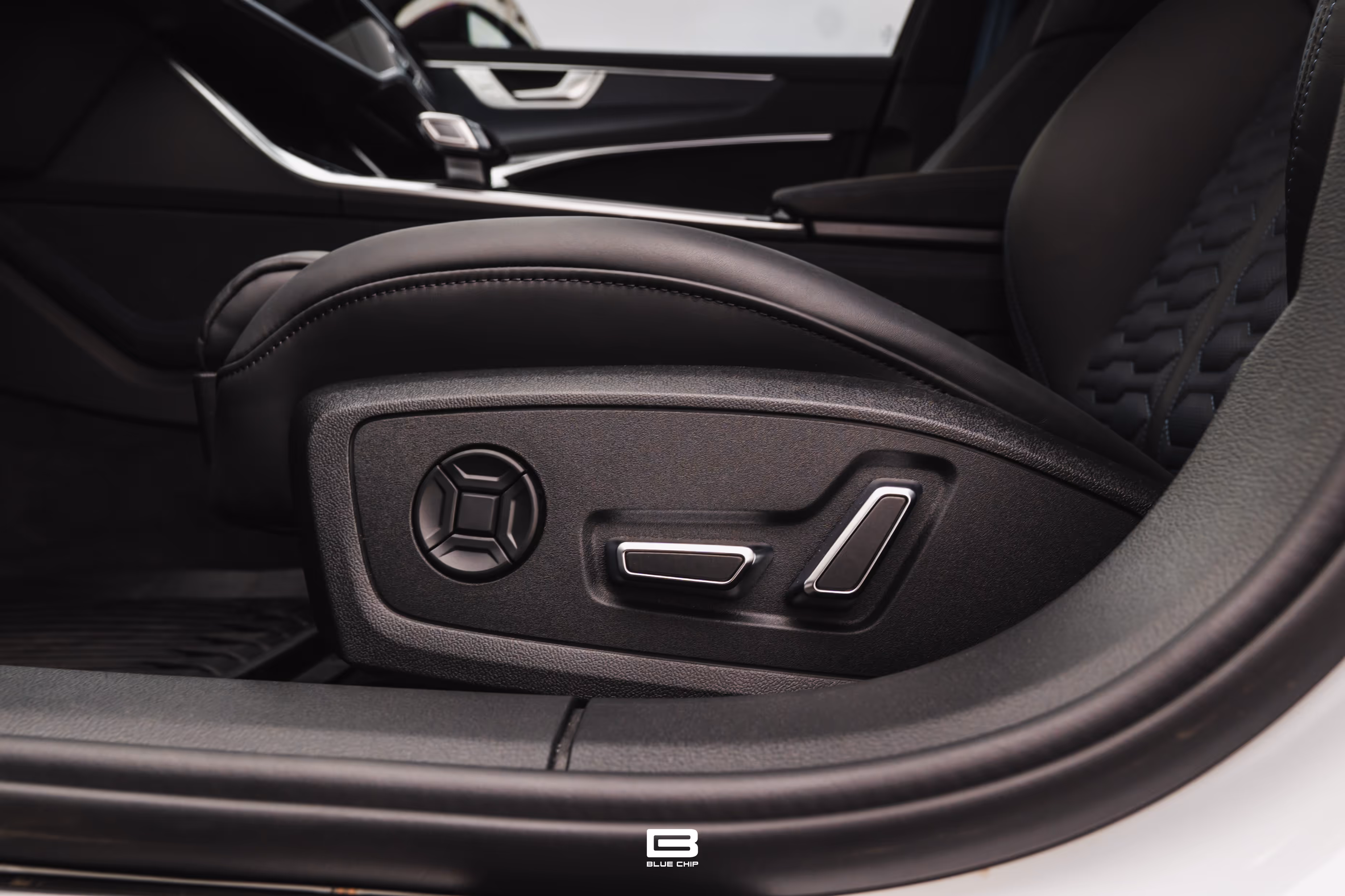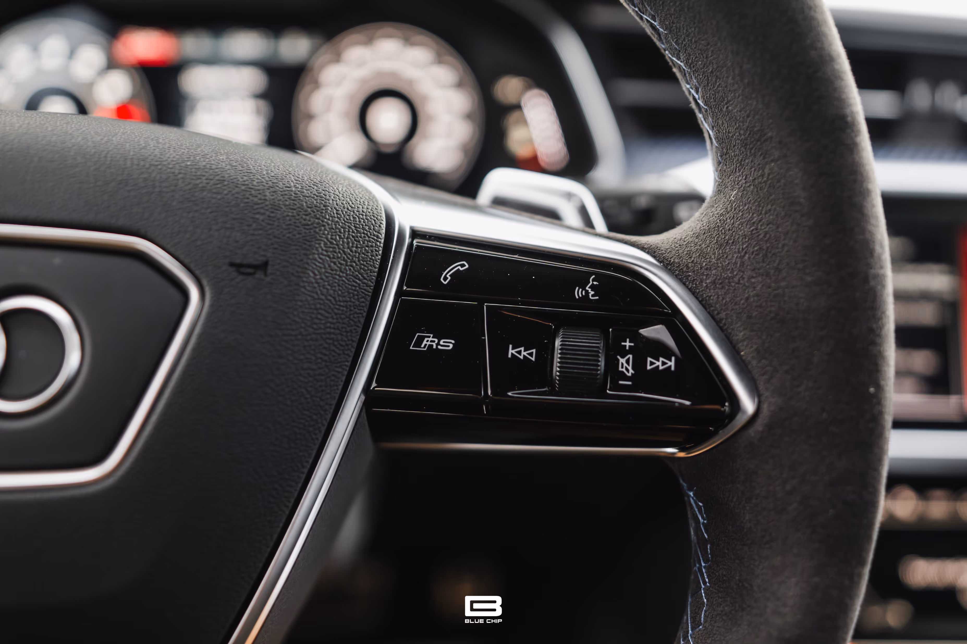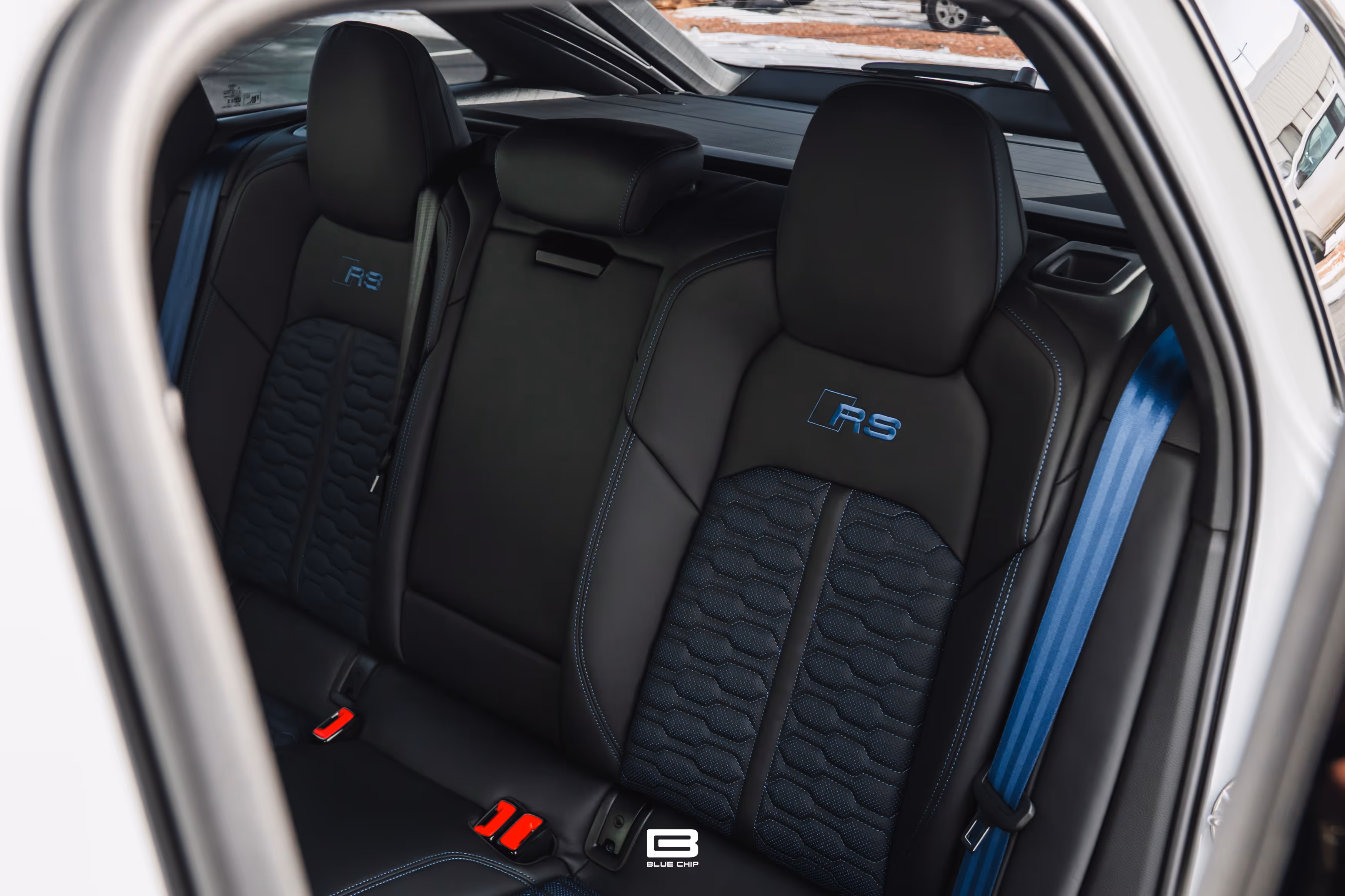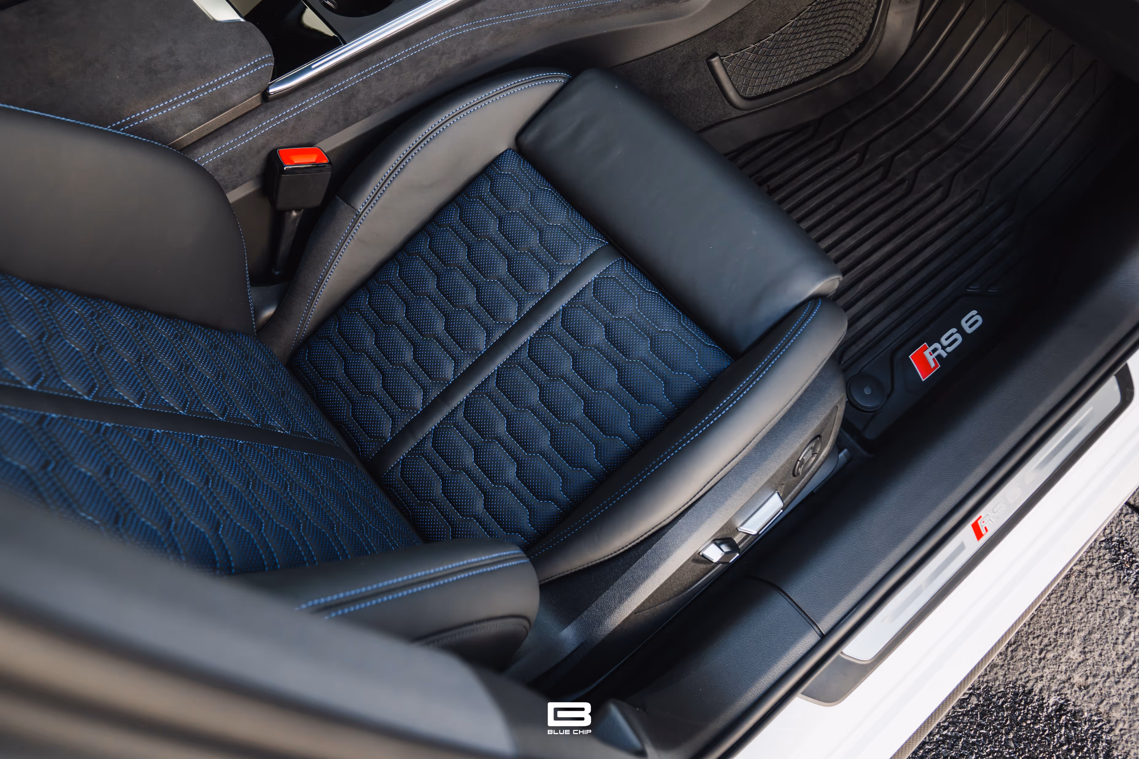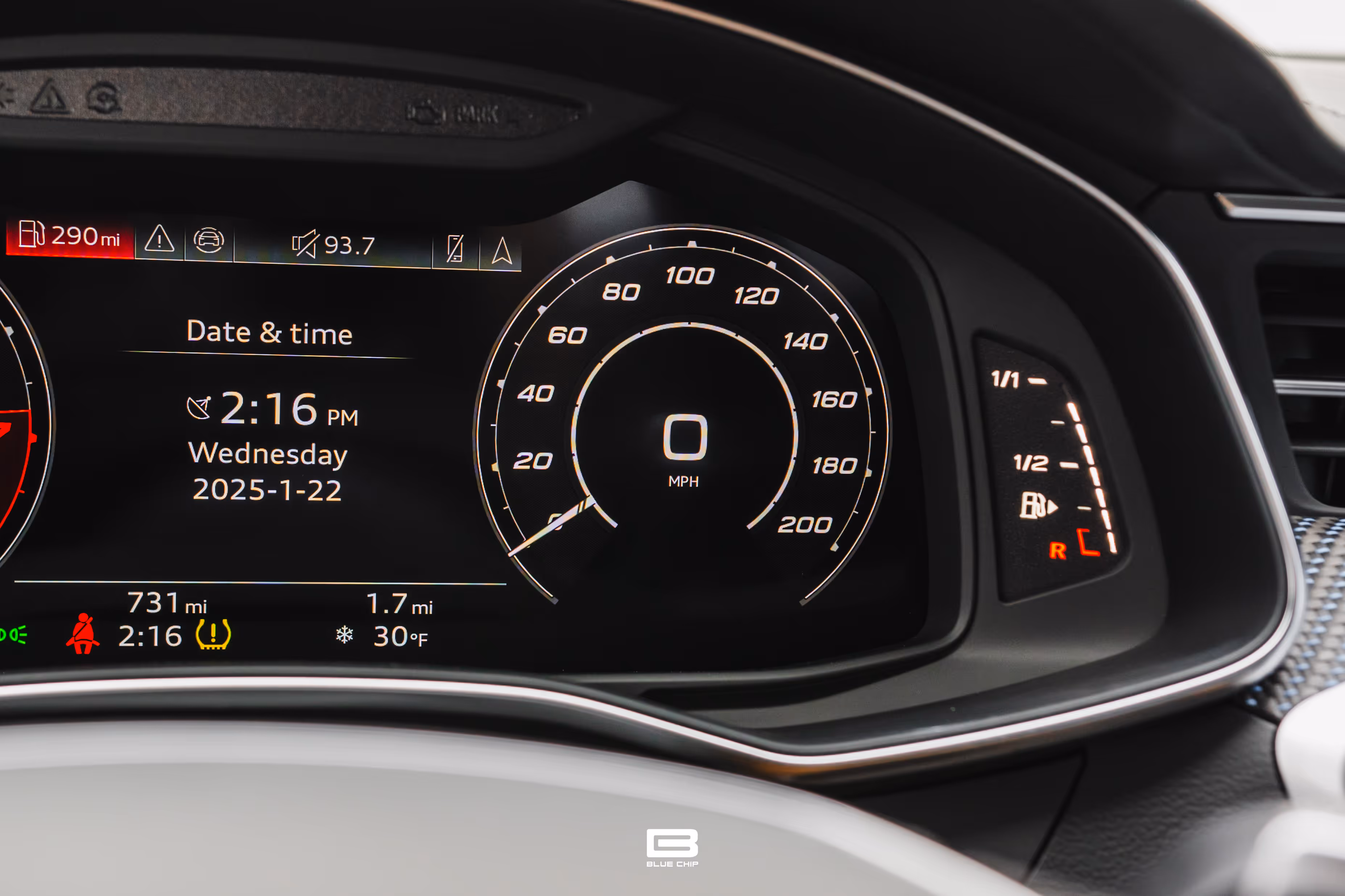 The interior combines functionality with a driver-focused layout. Audi’s Virtual Cockpit displays RS-specific performance metrics, while the dual-screen MMI Touch Response system integrates navigation, media, and climate controls. The Black Leather upholstery is accented with Mercato Blue stitching, and the RS Design Package introduces additional Alcantara and carbon-fiber elements throughout the cabin. A Bang & Olufsen 3D sound system and an array of driver assistance features, including adaptive cruise control and a 360-degree camera system, provide additional refinement and convenience.