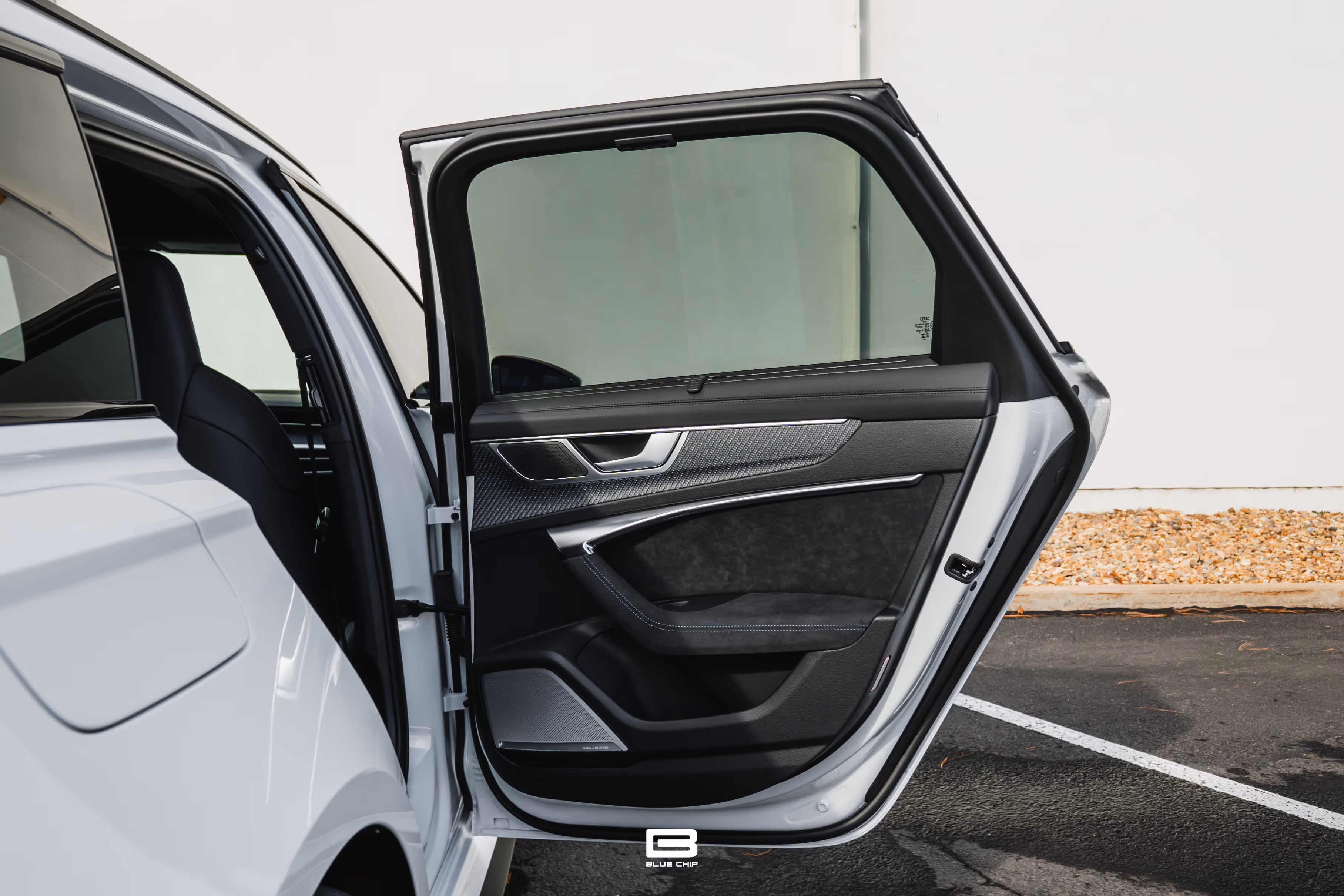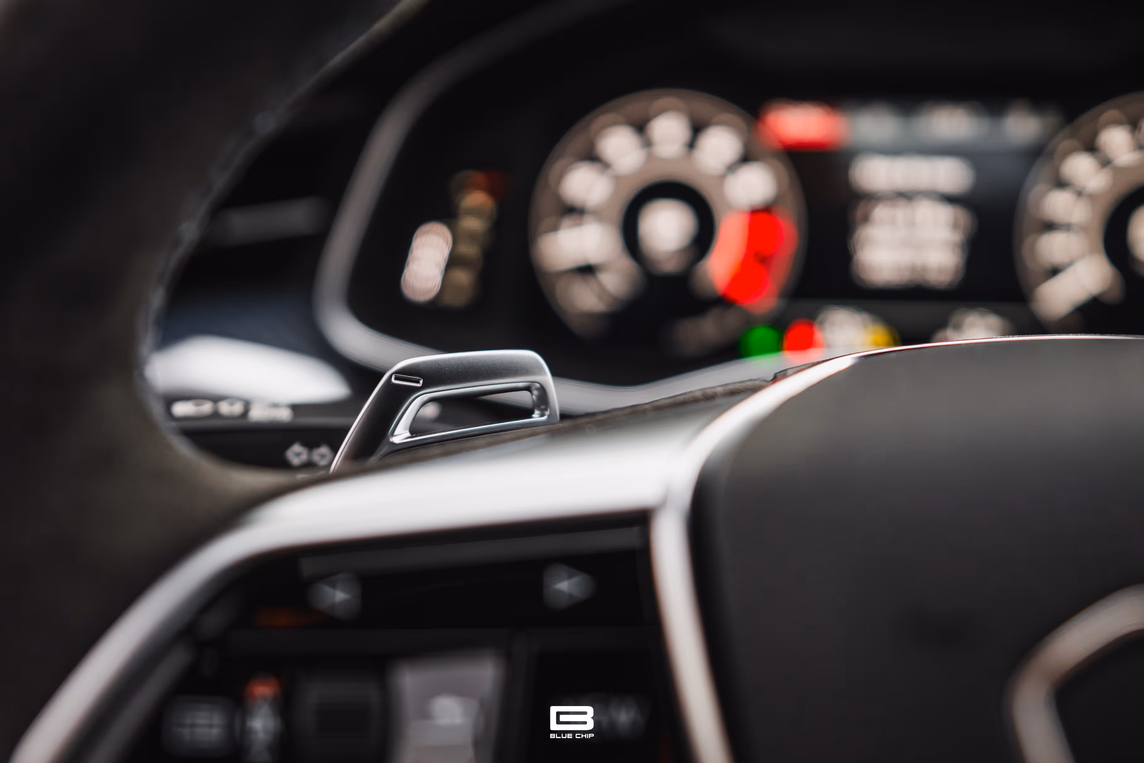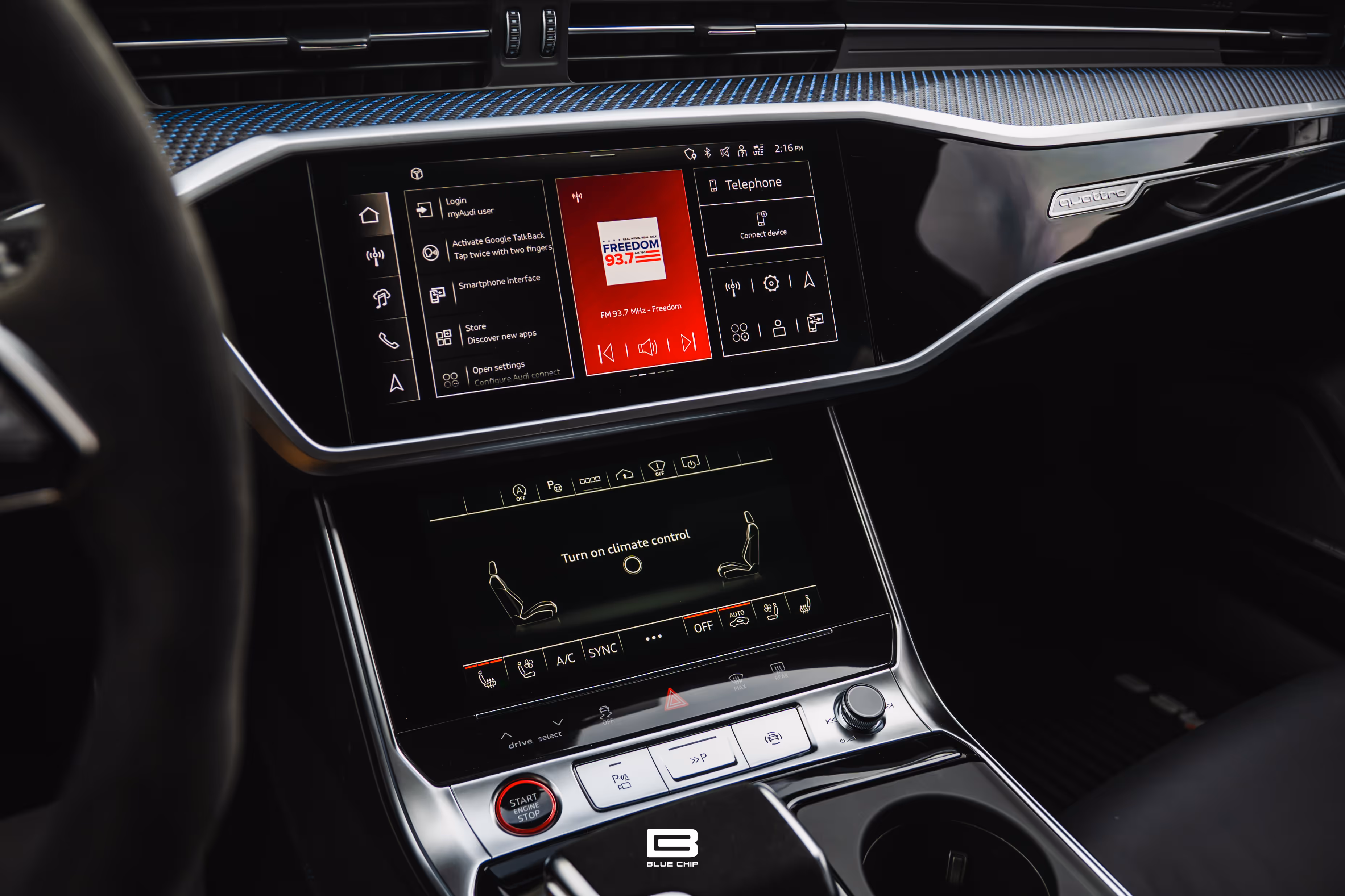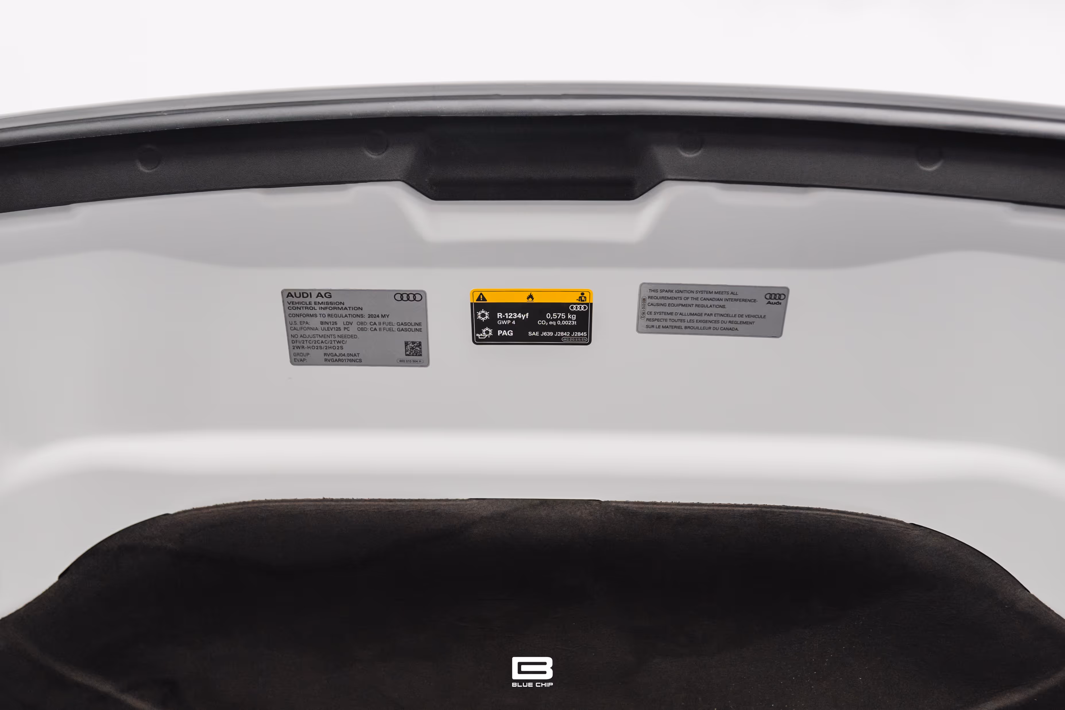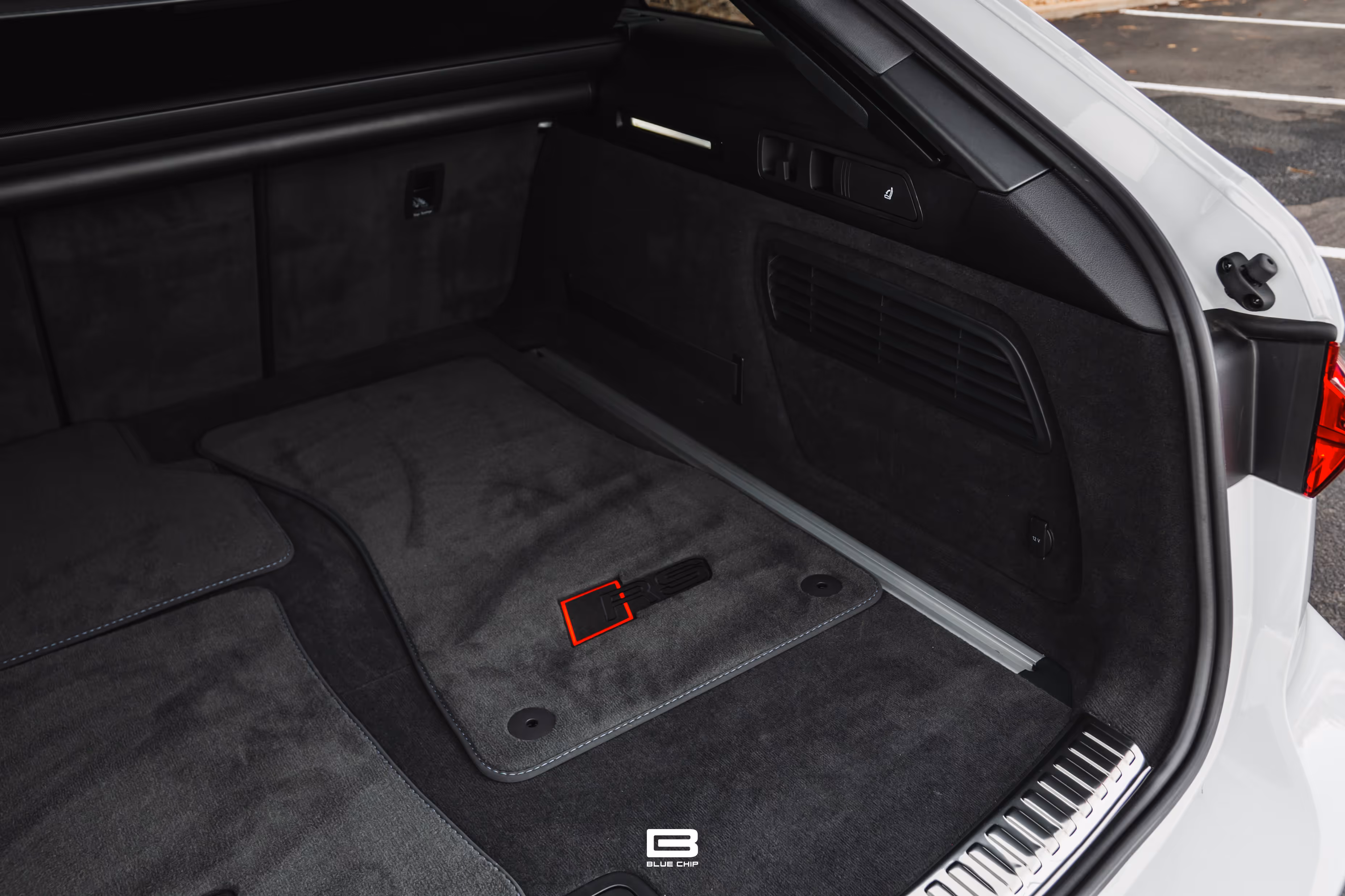 The interior combines functionality with a driver-focused layout. Audi’s Virtual Cockpit displays RS-specific performance metrics, while the dual-screen MMI Touch Response system integrates navigation, media, and climate controls. The Black Leather upholstery is accented with Mercato Blue stitching, and the RS Design Package introduces additional Alcantara and carbon-fiber elements throughout the cabin. A Bang & Olufsen 3D sound system and an array of driver assistance features, including adaptive cruise control and a 360-degree camera system, provide additional refinement and convenience.
