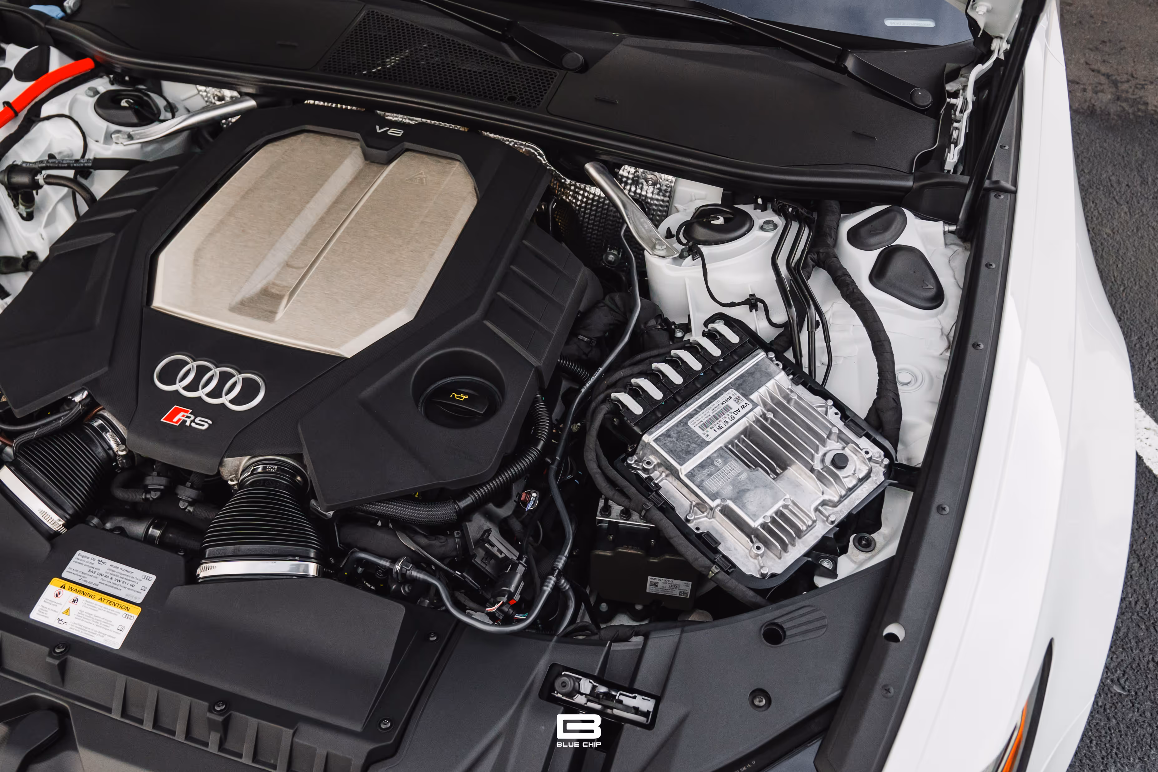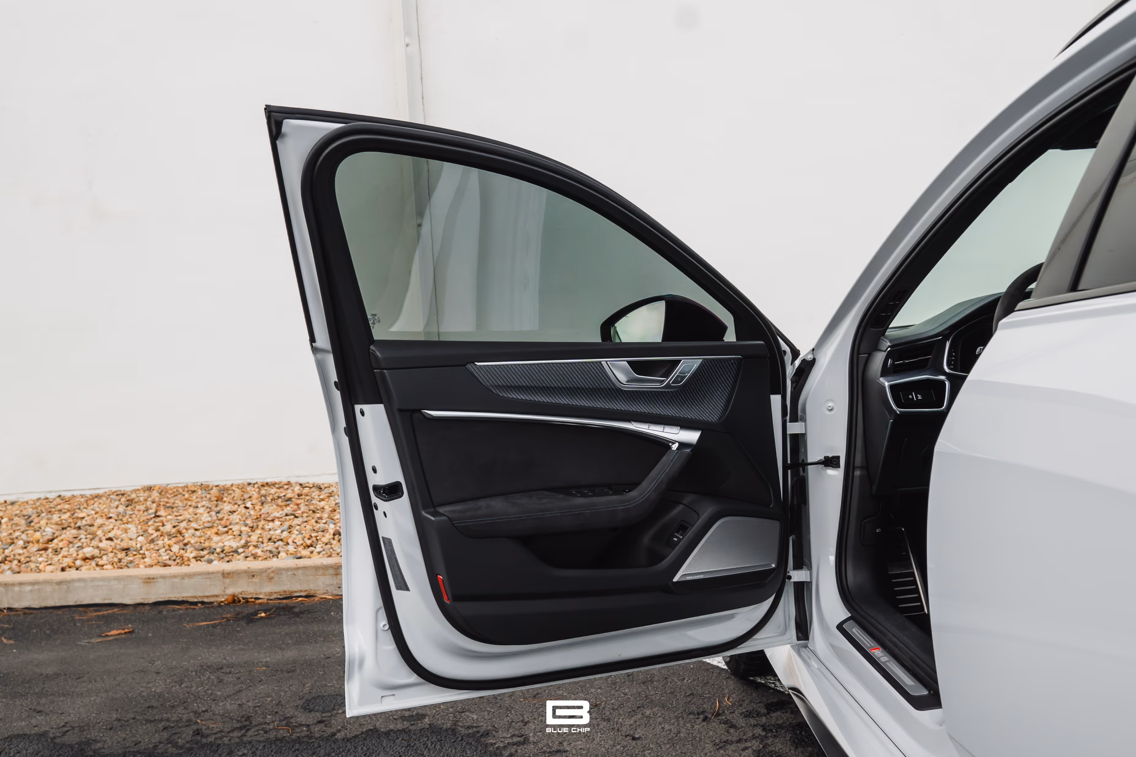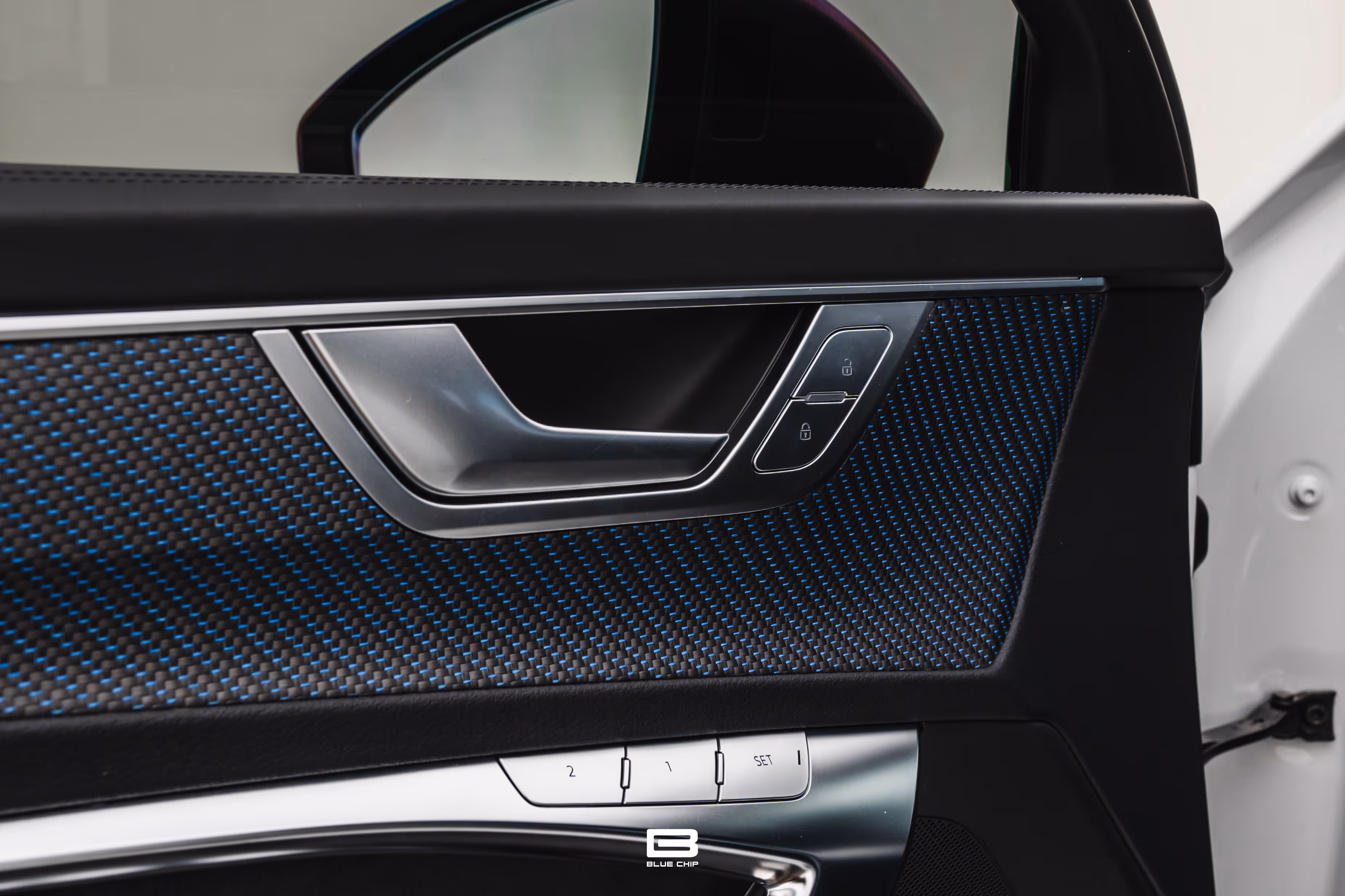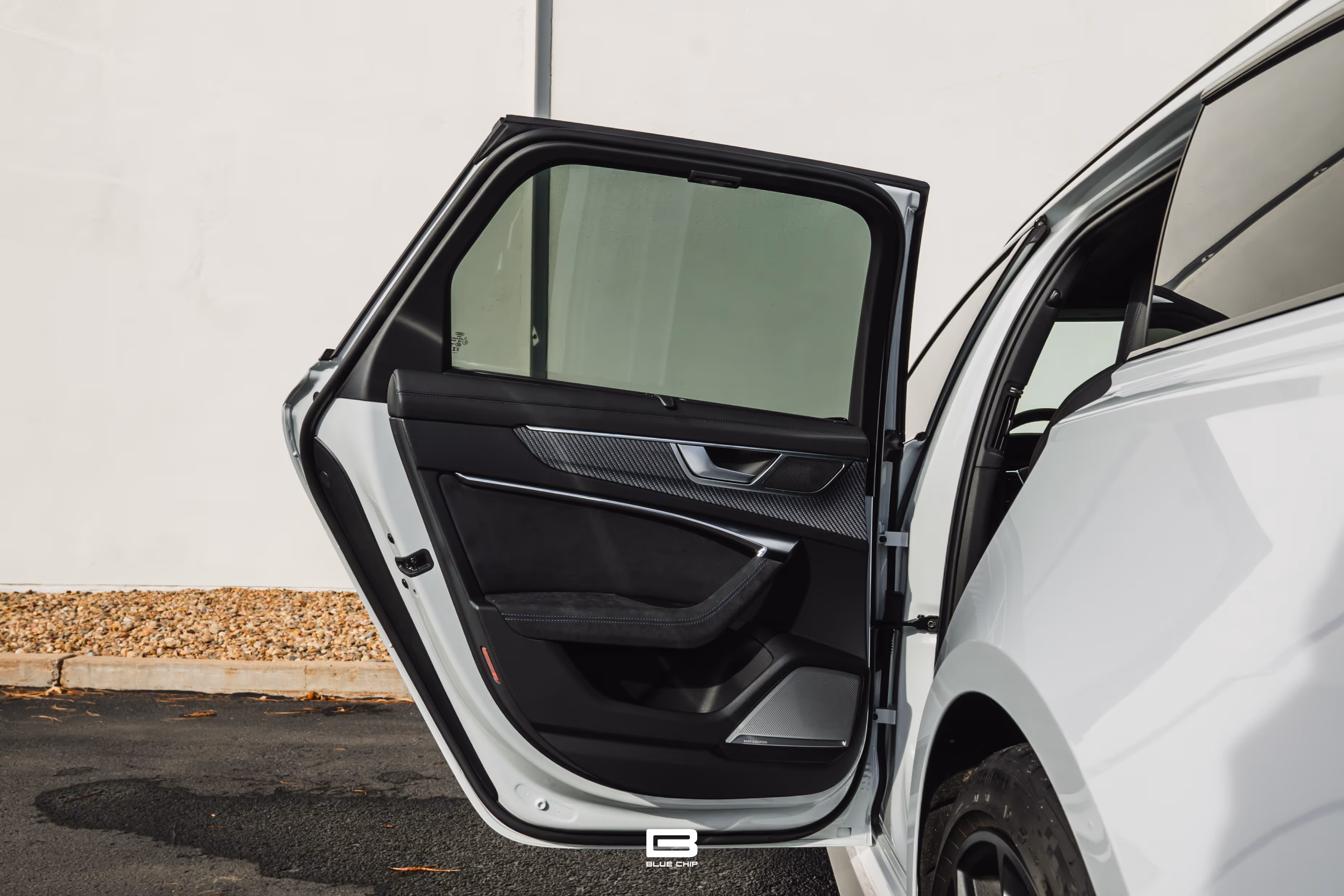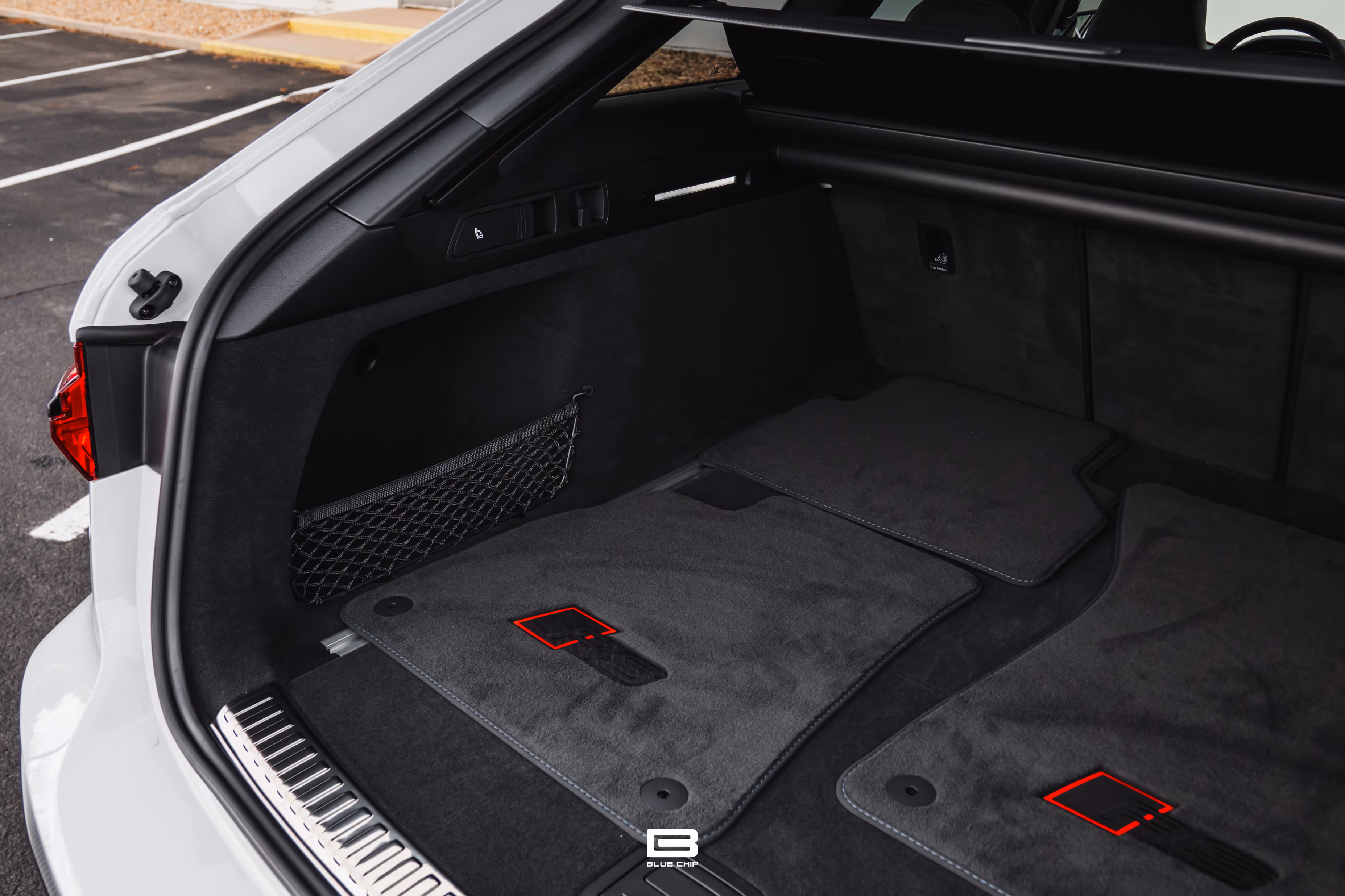 The interior combines functionality with a driver-focused layout. Audi’s Virtual Cockpit displays RS-specific performance metrics, while the dual-screen MMI Touch Response system integrates navigation, media, and climate controls. The Black Leather upholstery is accented with Mercato Blue stitching, and the RS Design Package introduces additional Alcantara and carbon-fiber elements throughout the cabin. A Bang & Olufsen 3D sound system and an array of driver assistance features, including adaptive cruise control and a 360-degree camera system, provide additional refinement and convenience.