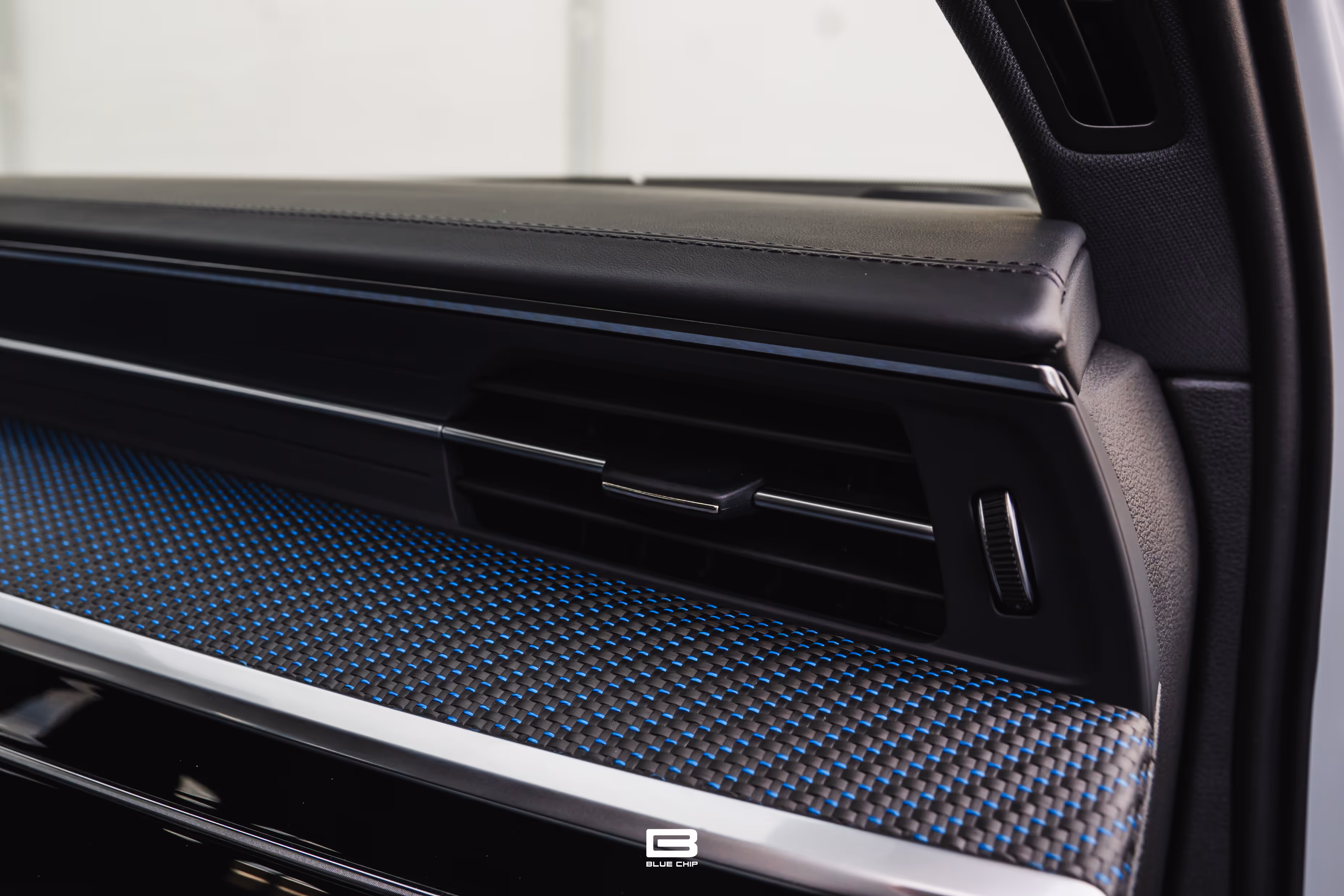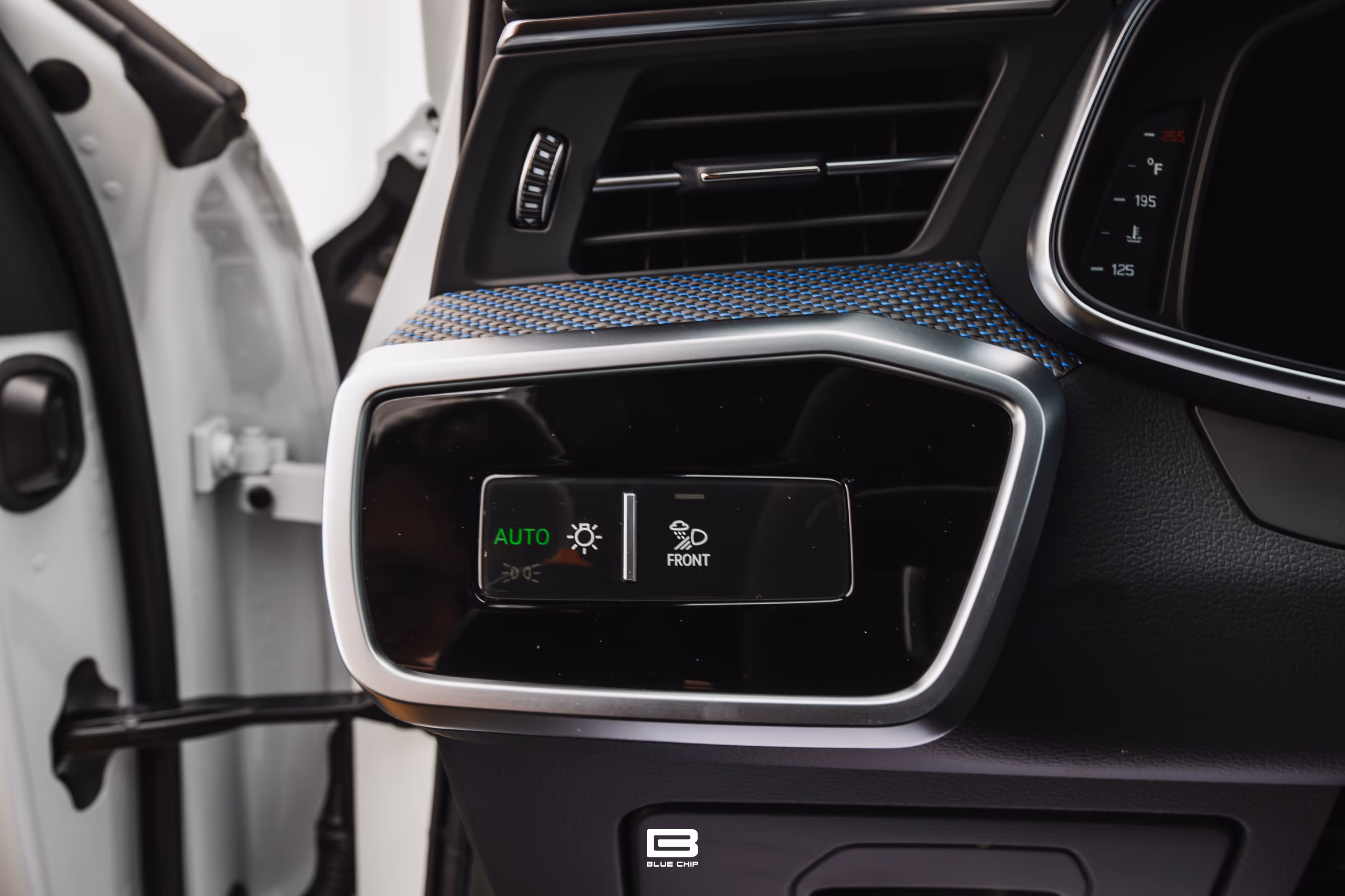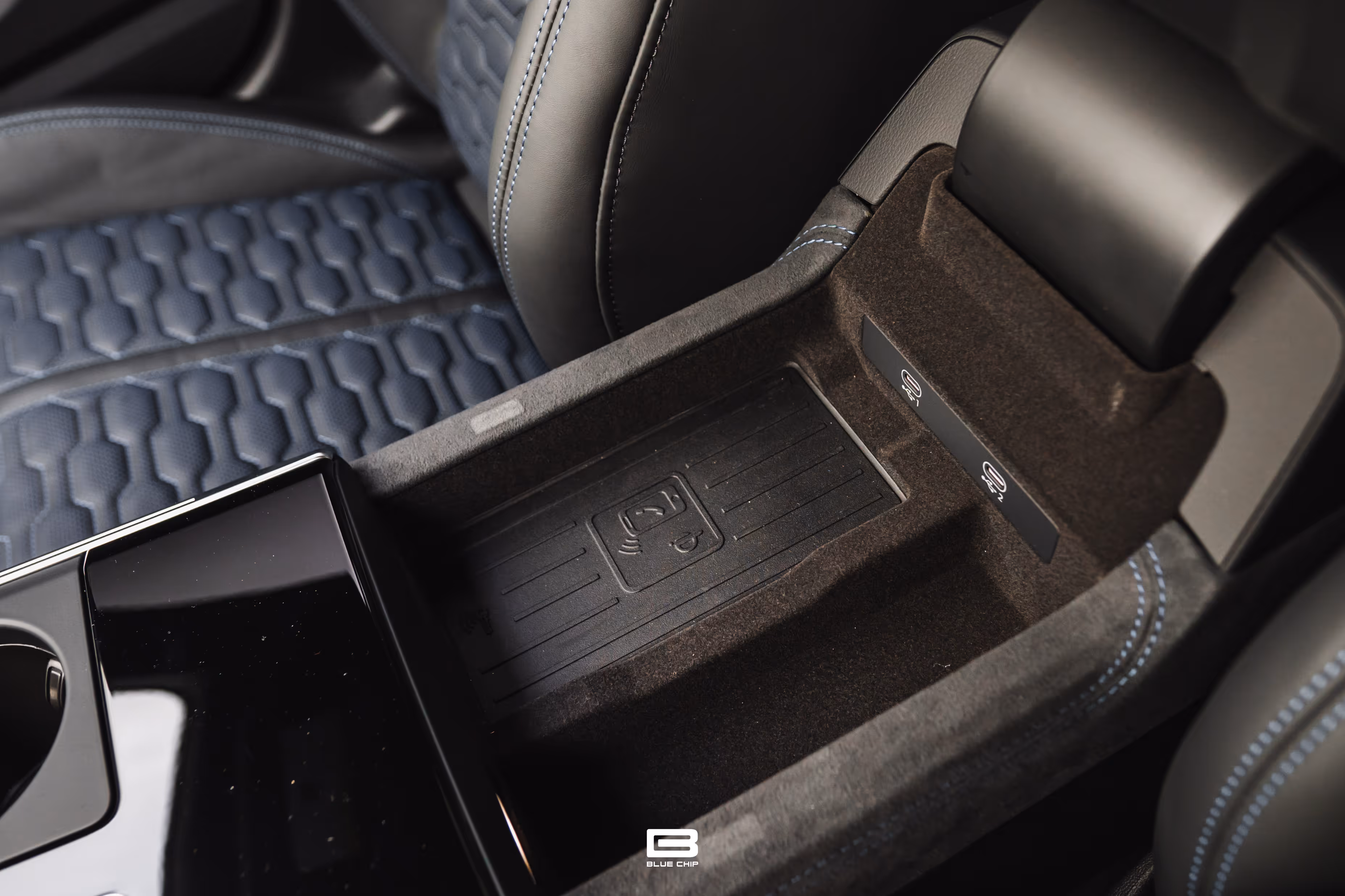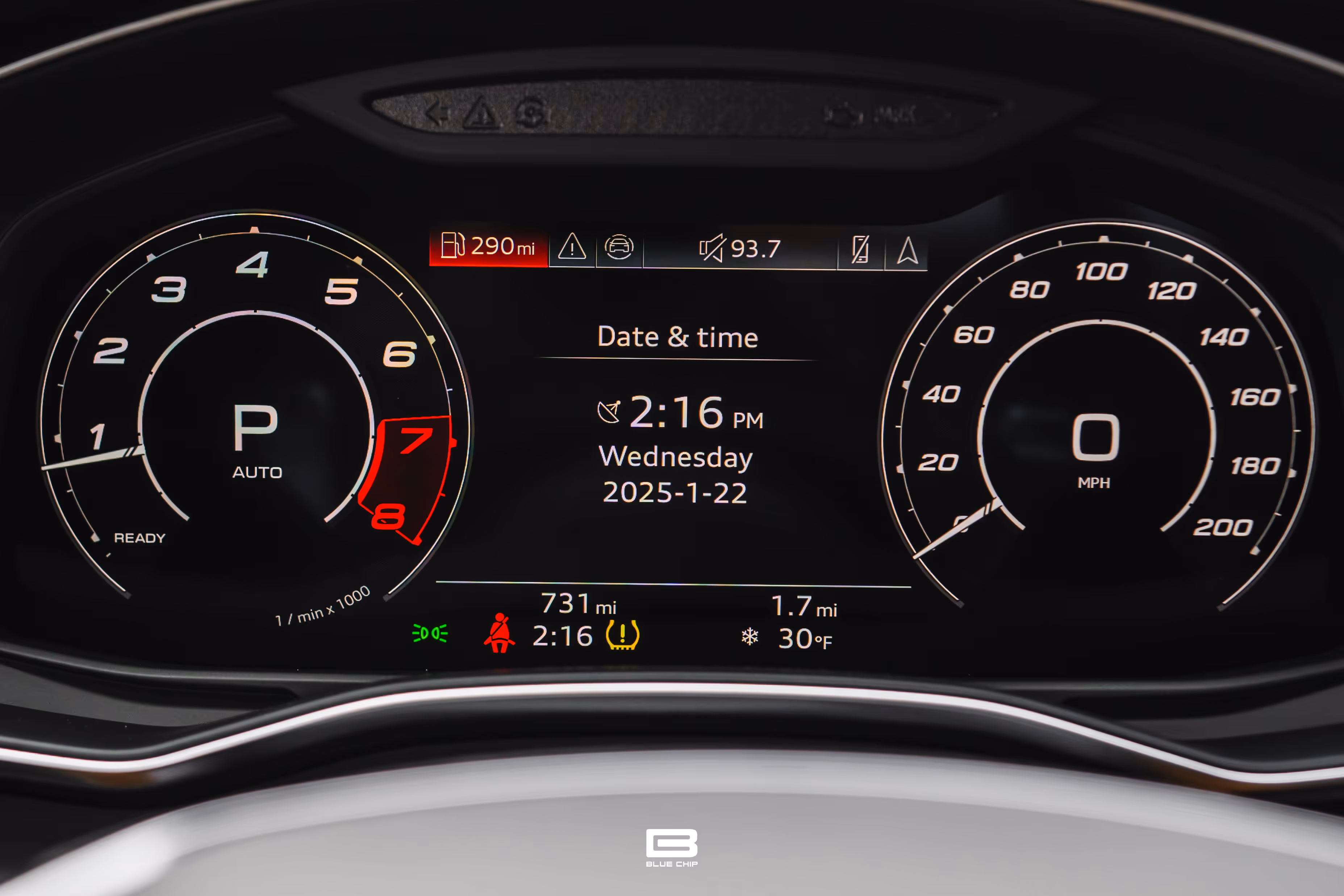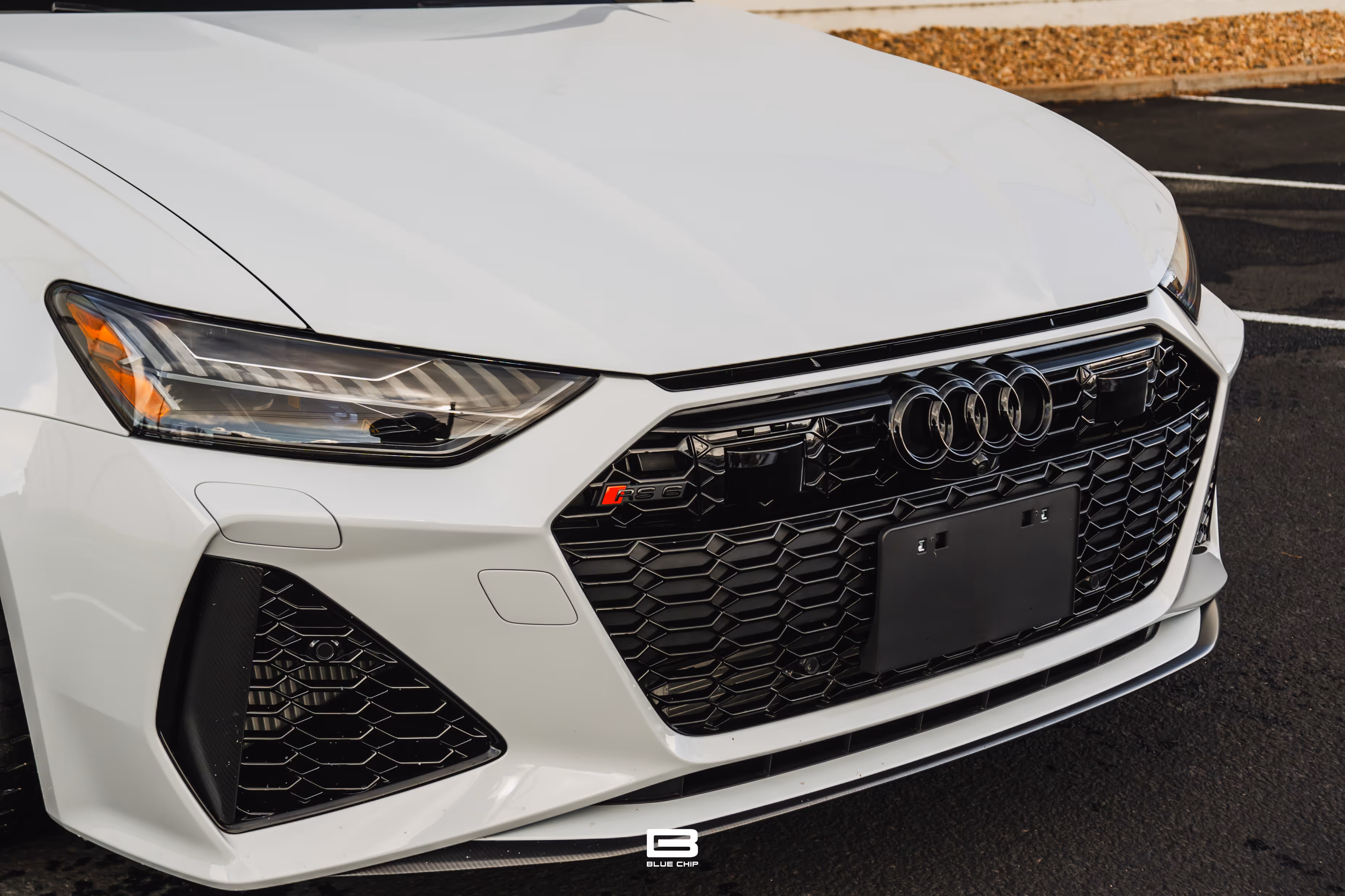 The interior combines functionality with a driver-focused layout. Audi’s Virtual Cockpit displays RS-specific performance metrics, while the dual-screen MMI Touch Response system integrates navigation, media, and climate controls. The Black Leather upholstery is accented with Mercato Blue stitching, and the RS Design Package introduces additional Alcantara and carbon-fiber elements throughout the cabin. A Bang & Olufsen 3D sound system and an array of driver assistance features, including adaptive cruise control and a 360-degree camera system, provide additional refinement and convenience.