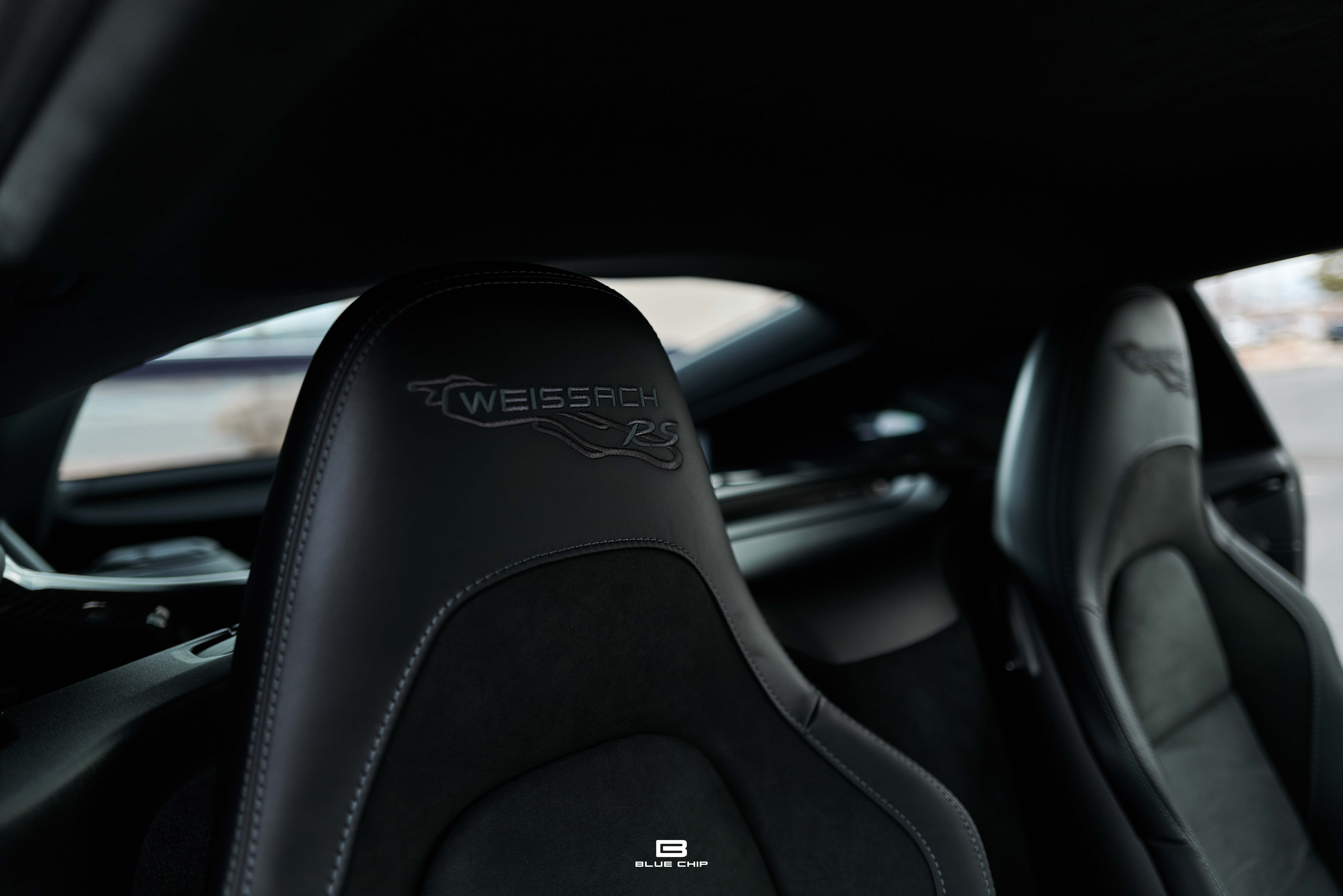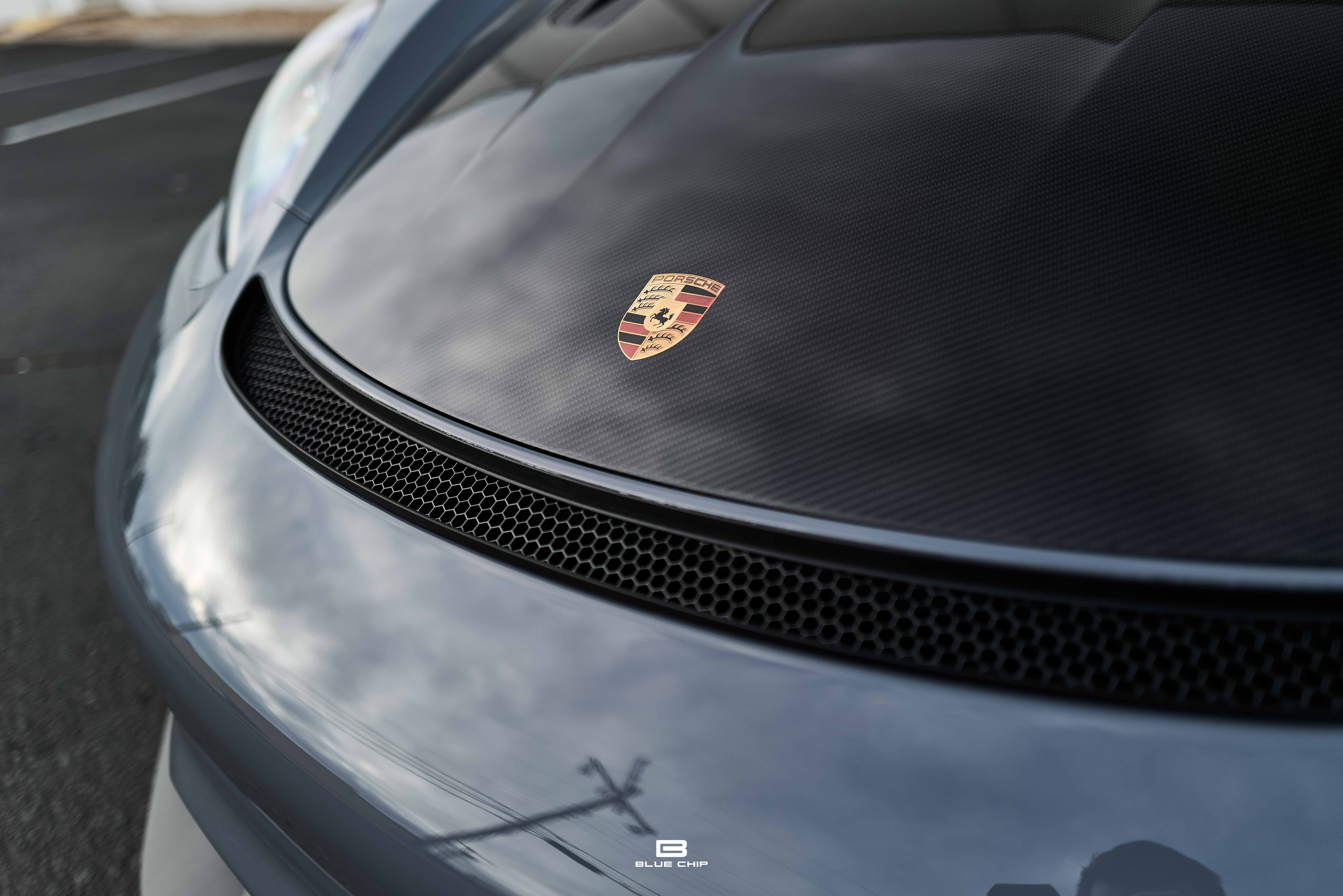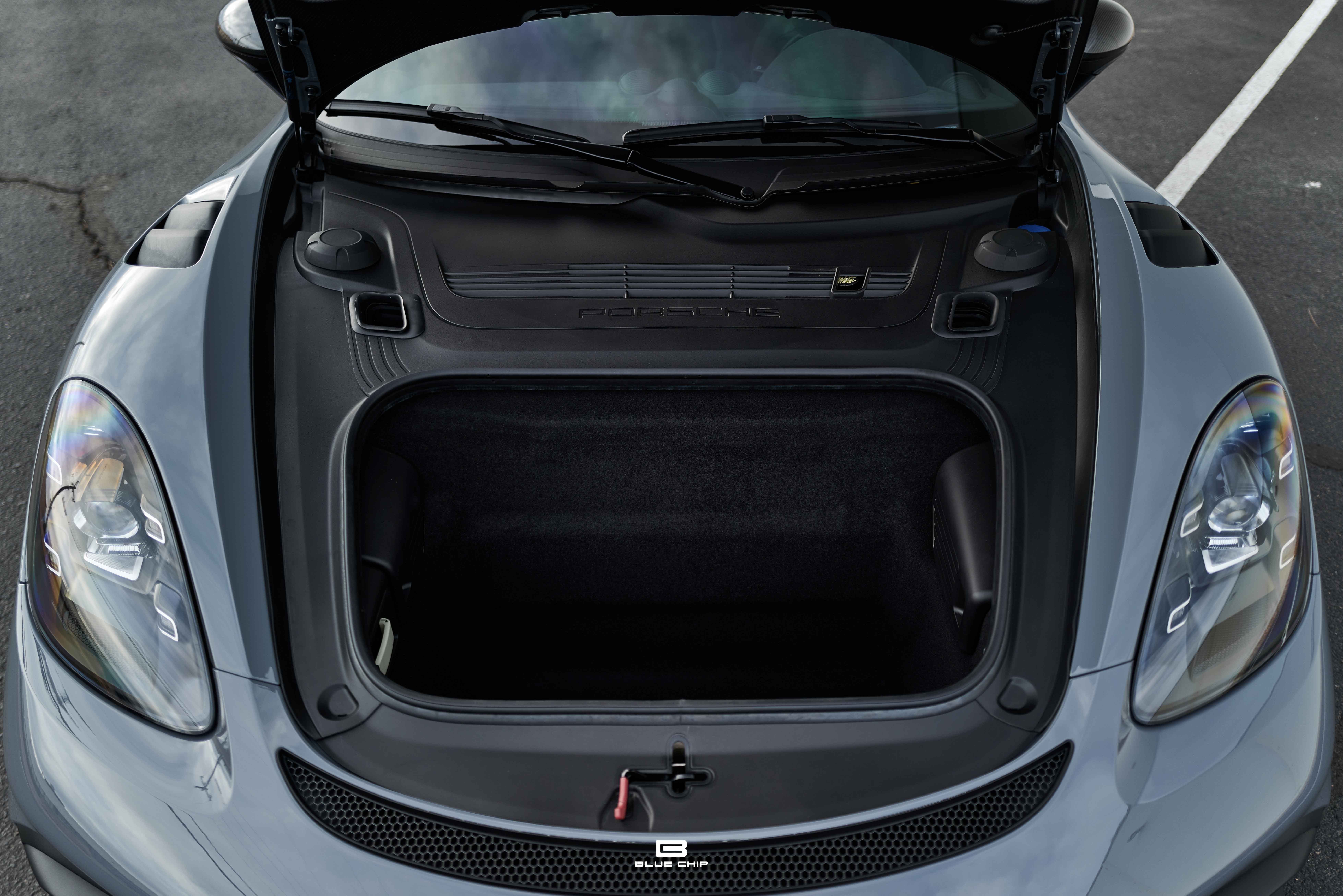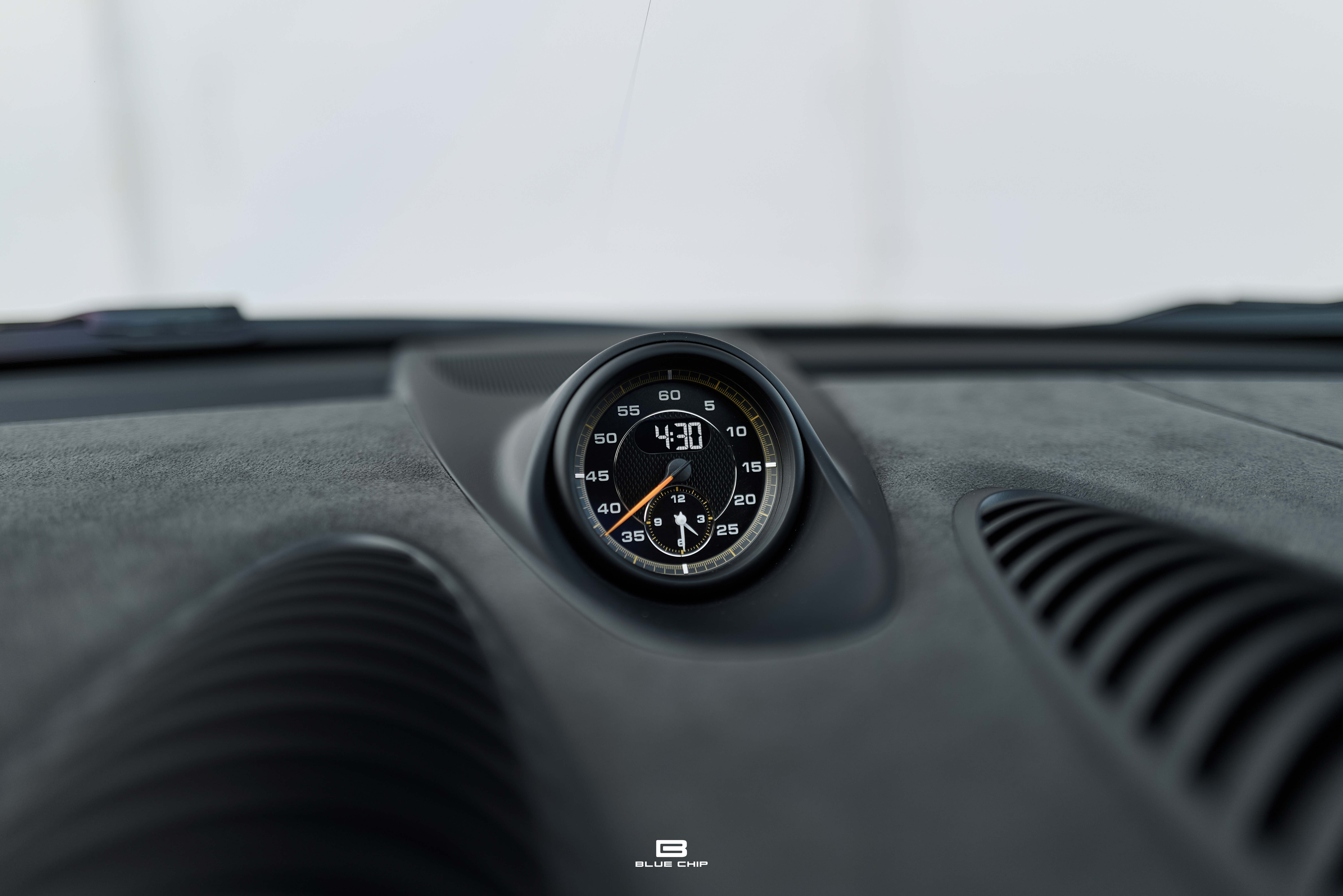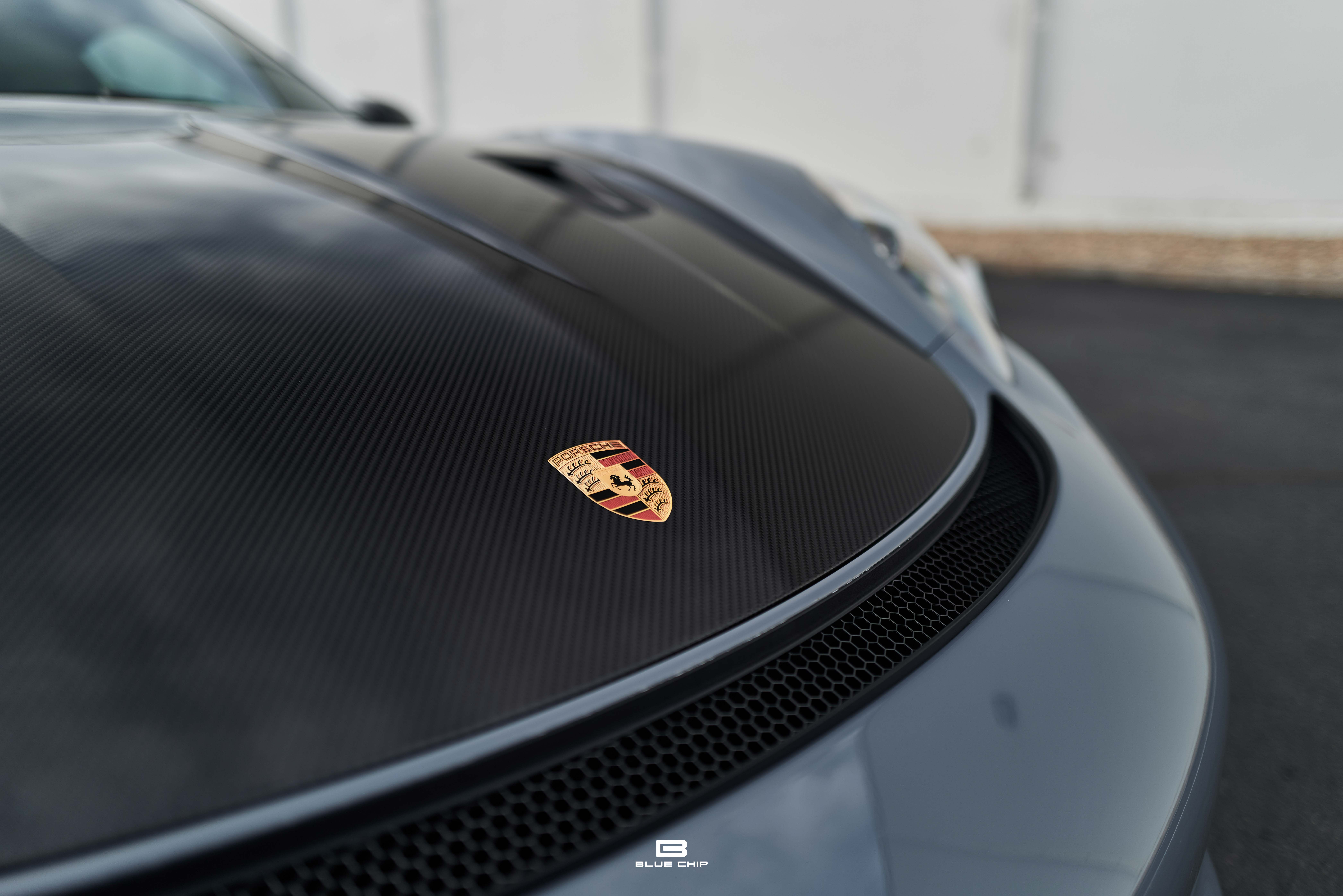 This example is finished in Arctic Grey over a black Leather and Race-Tex interior with matching Arctic Grey stitching. It carries the Weissach Package, Porsche Ceramic Composite Brakes, front axle lift system, Chrono Package, Carbon Fiber Window Triangles, Adaptive Sport Seats Plus with 18-way adjustment, heated seats, Bose Surround Sound, and the Light Design Package — a specification that covers both track-day utility and daily usability without compromise. At 2,467 miles, it has been lightly used and is presented in excellent condition.