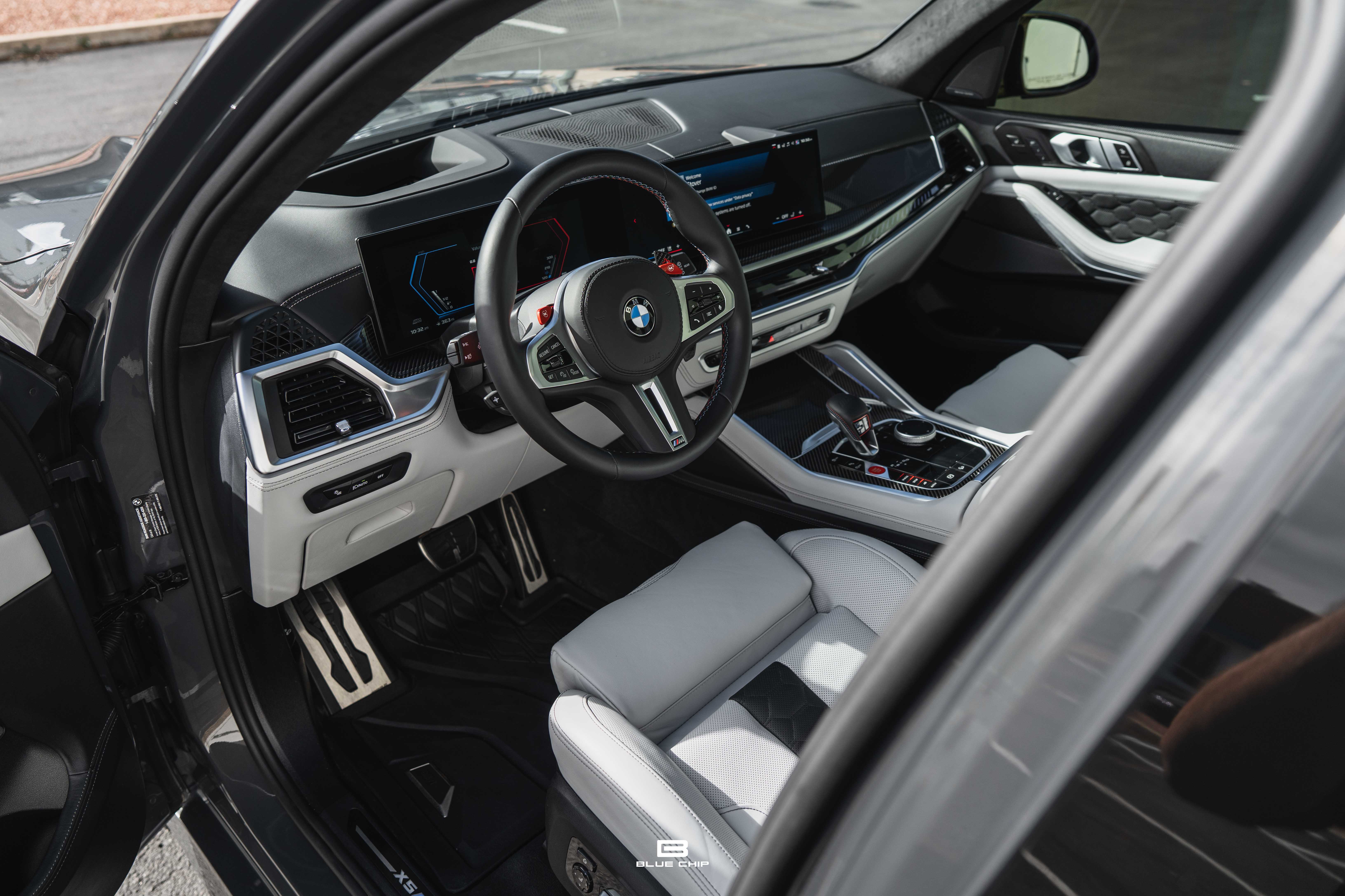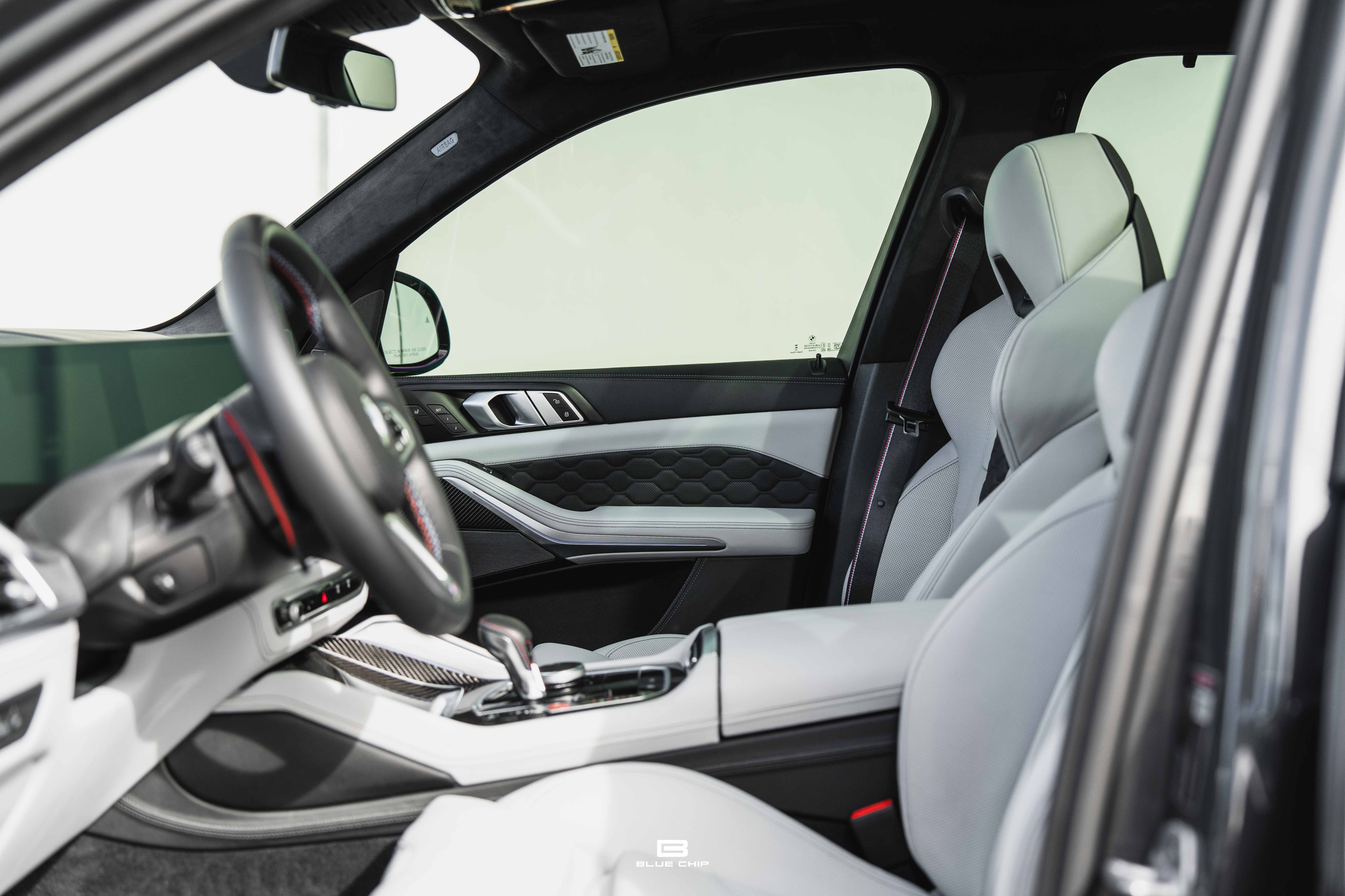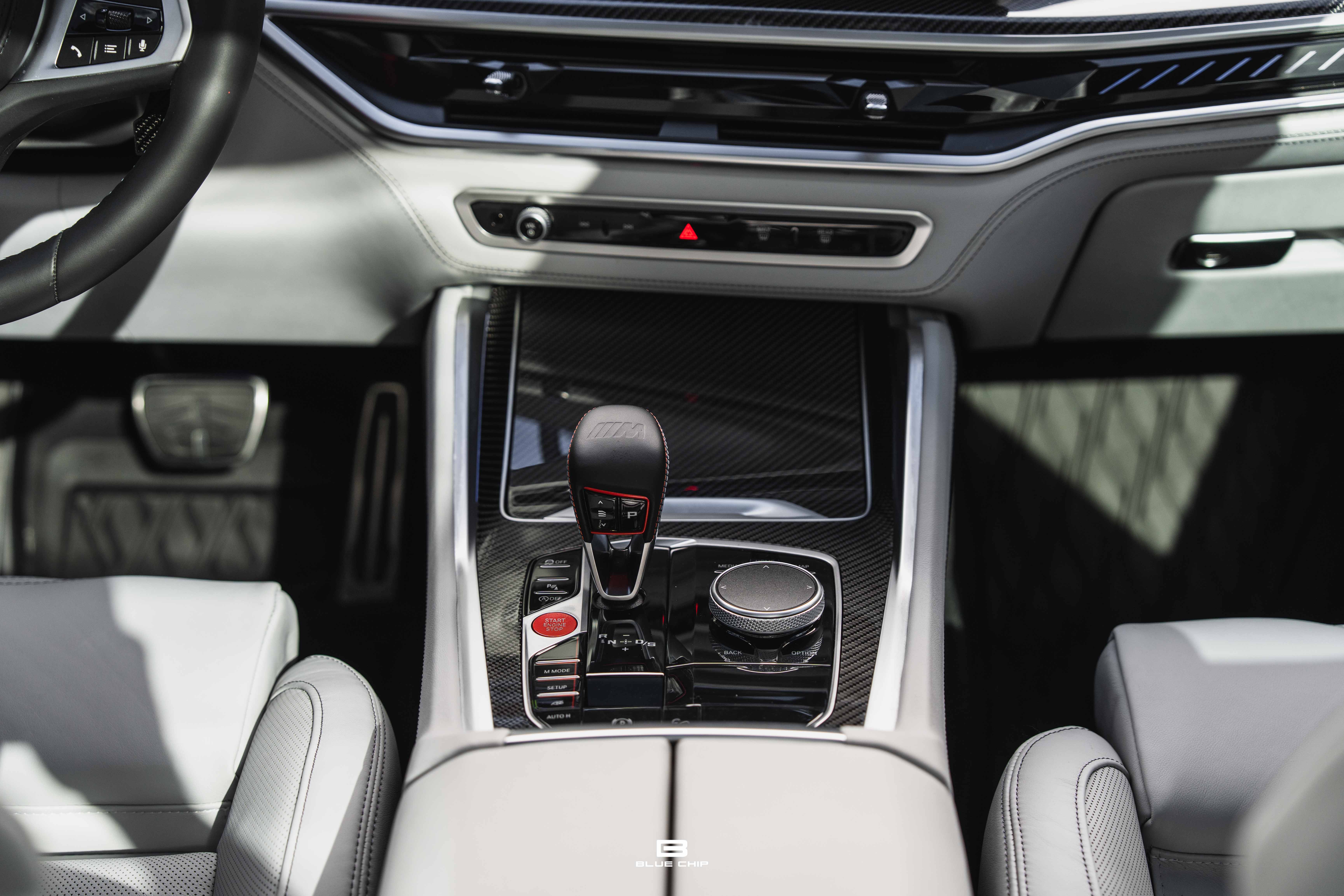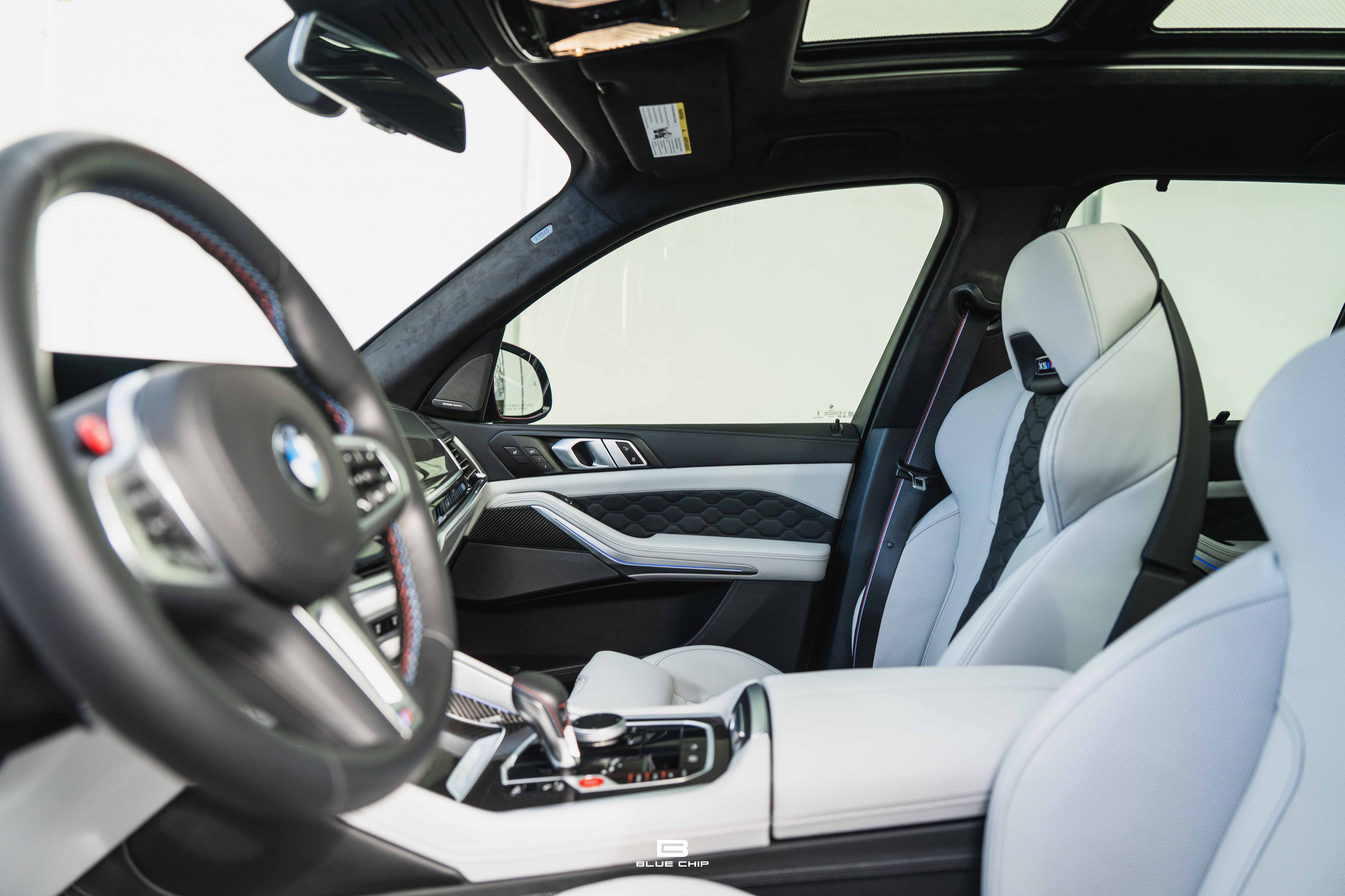 Inside, the cabin combines performance instrumentation with contemporary BMW technology, including a curved digital display interface, advanced driver-assistance systems, multi-zone climate control, heated and ventilated seating, and a premium surround audio system. Carbon fiber and extended leather surfaces reinforce the vehicle’s dual character as both high-performance machine and executive transport.
