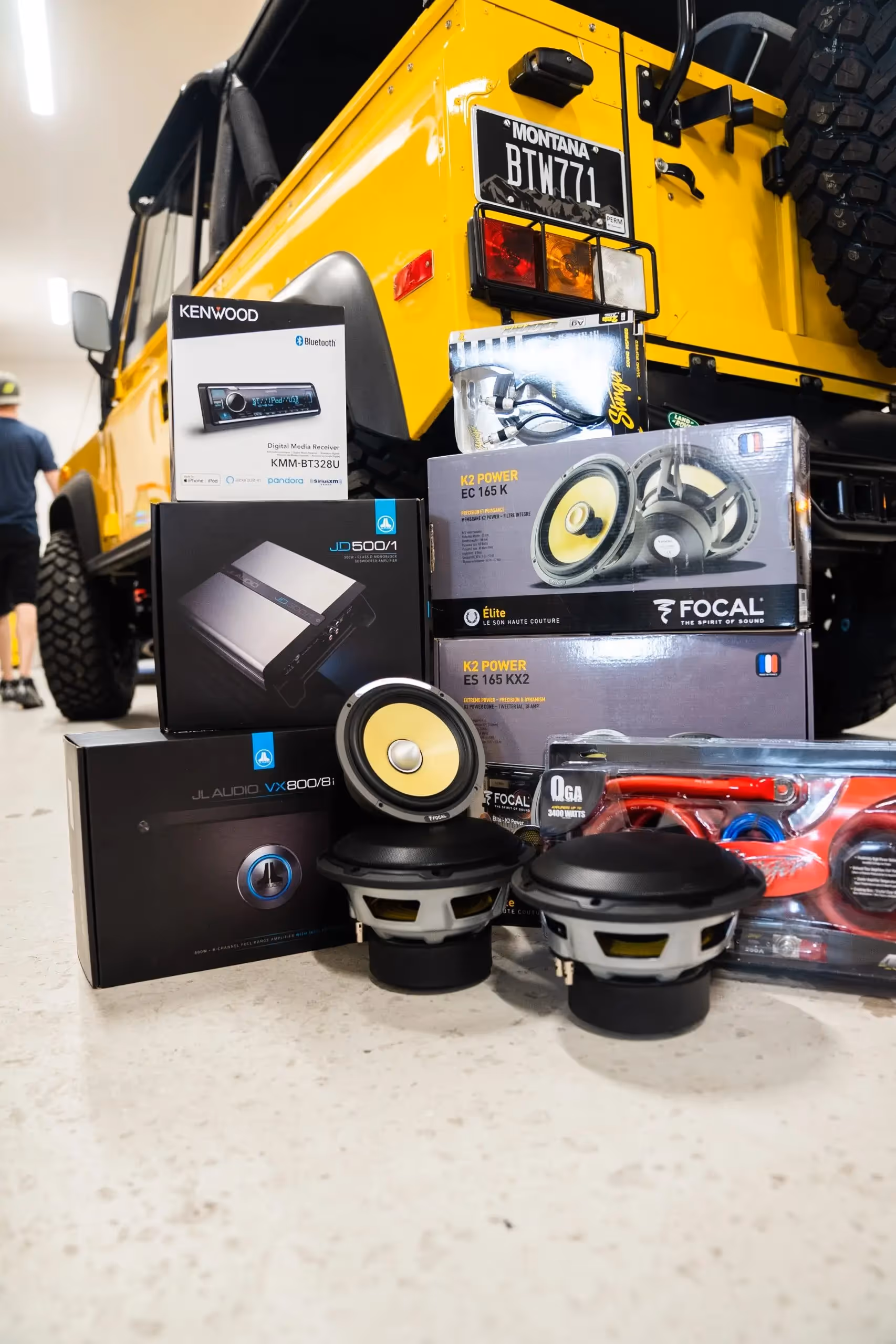 If you have ever experienced an old Land Rover Defender then you probably know how lousy and unimpressive the original sound system is. To add on, the open cabin creates an incredibly harsh environment for sound to travel through clearly. For this project we knew straight out of the gate that we were going to need powerful speakers and amplifiers that could withstand the slight amount of weather that was going to get thrown at them. The project first started off with installing a Pioneer head-unit in the center console where it could be concealed and hidden. The best feature of this upgrade was the Bluetooth connectivity, which is a must to us in this day and age. Continuing on, we then installed both the 8-channel and subwoofer amplifiers beneath the passenger seat, where they sat out of harms way especially when wading in water. The most impressive part of this build can be found within the custom tweeter enclosures on the dashboard and the rear mounted boxes that contained the JL 8″ subwoofers and Focal coaxial speakers. The tweeters were specifically placed to allow us to create the soundstage effect as best as we can in this specific environment. The final touches to this project were adding back lighting the the door and rear speakers to create an ambience while driving at night. In addition, we custom engraved “Defender 90” into the rear speaker enclosures with the specific vehicle number to give it a one of a kind touch.